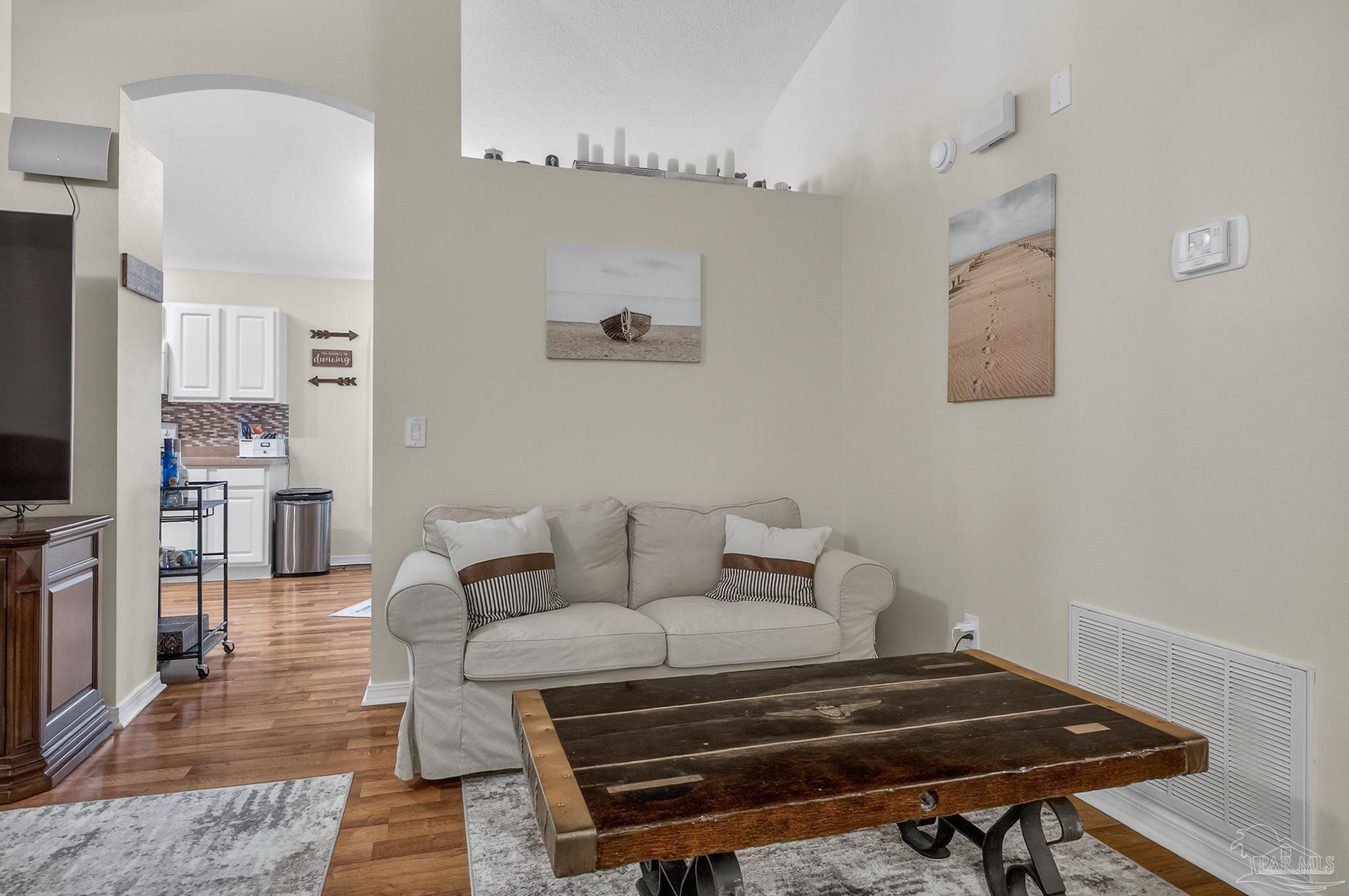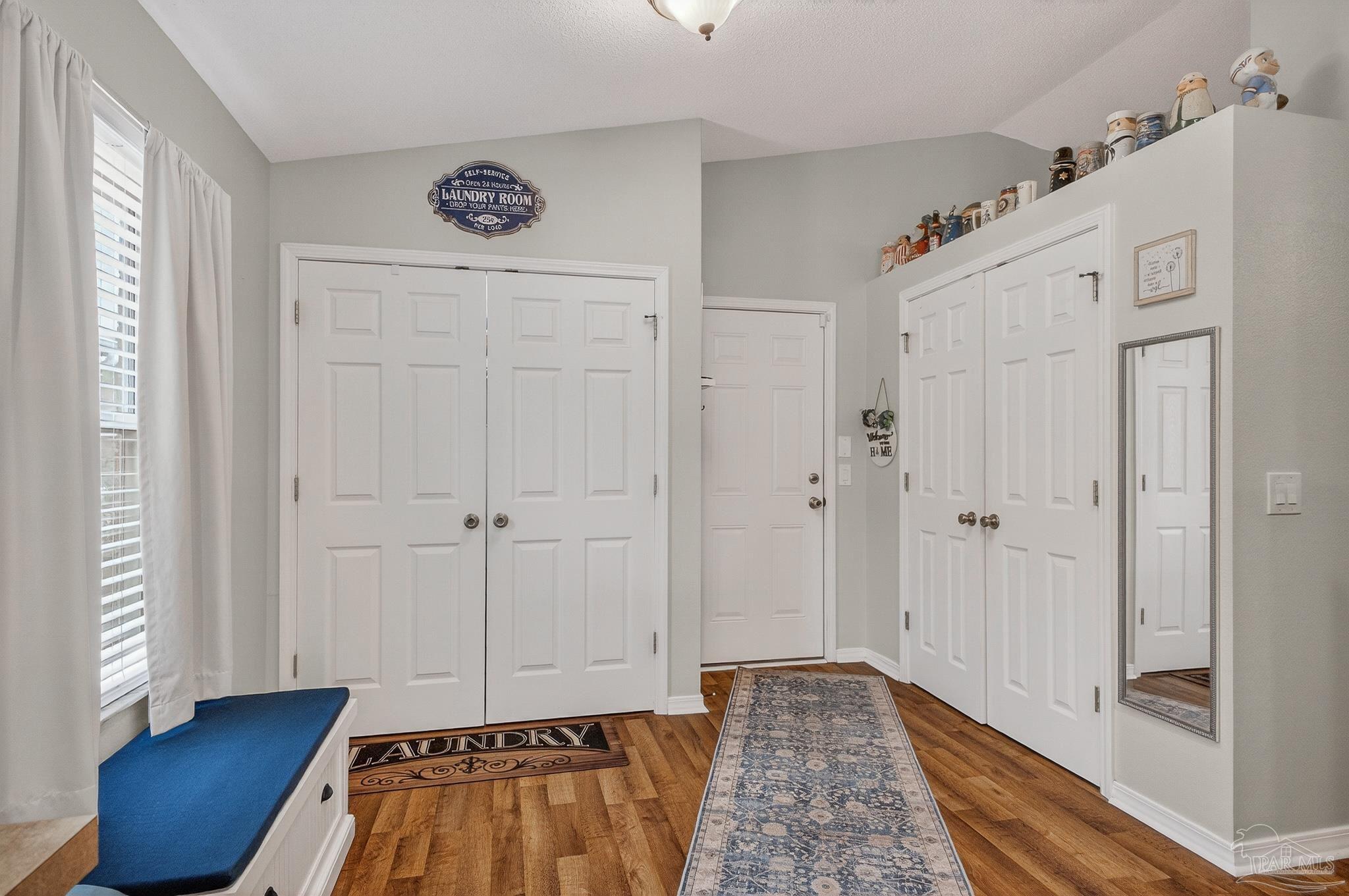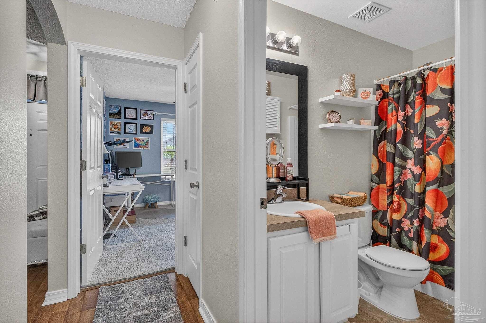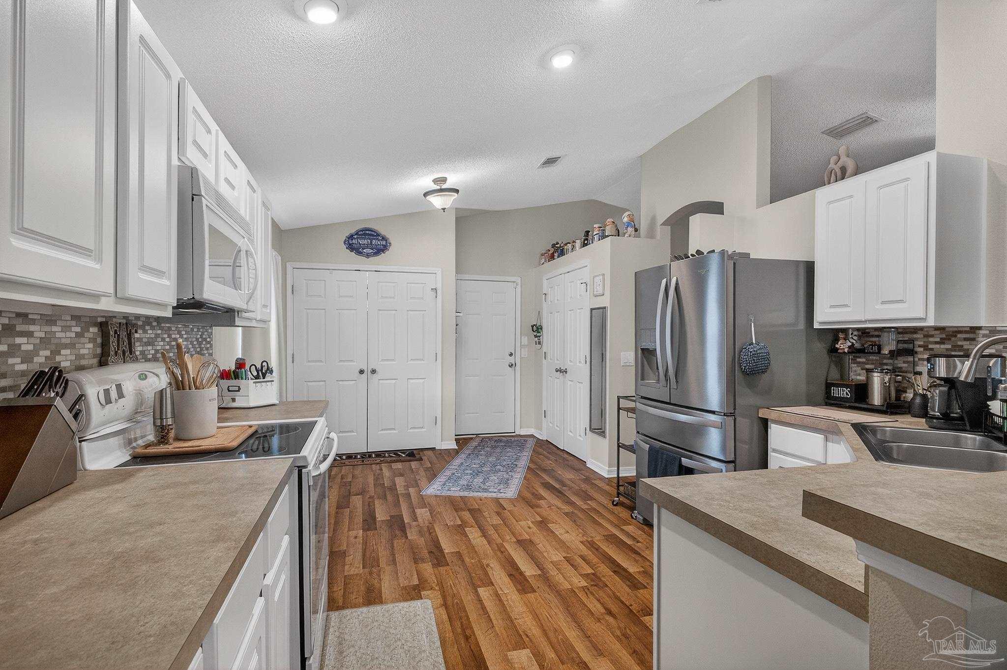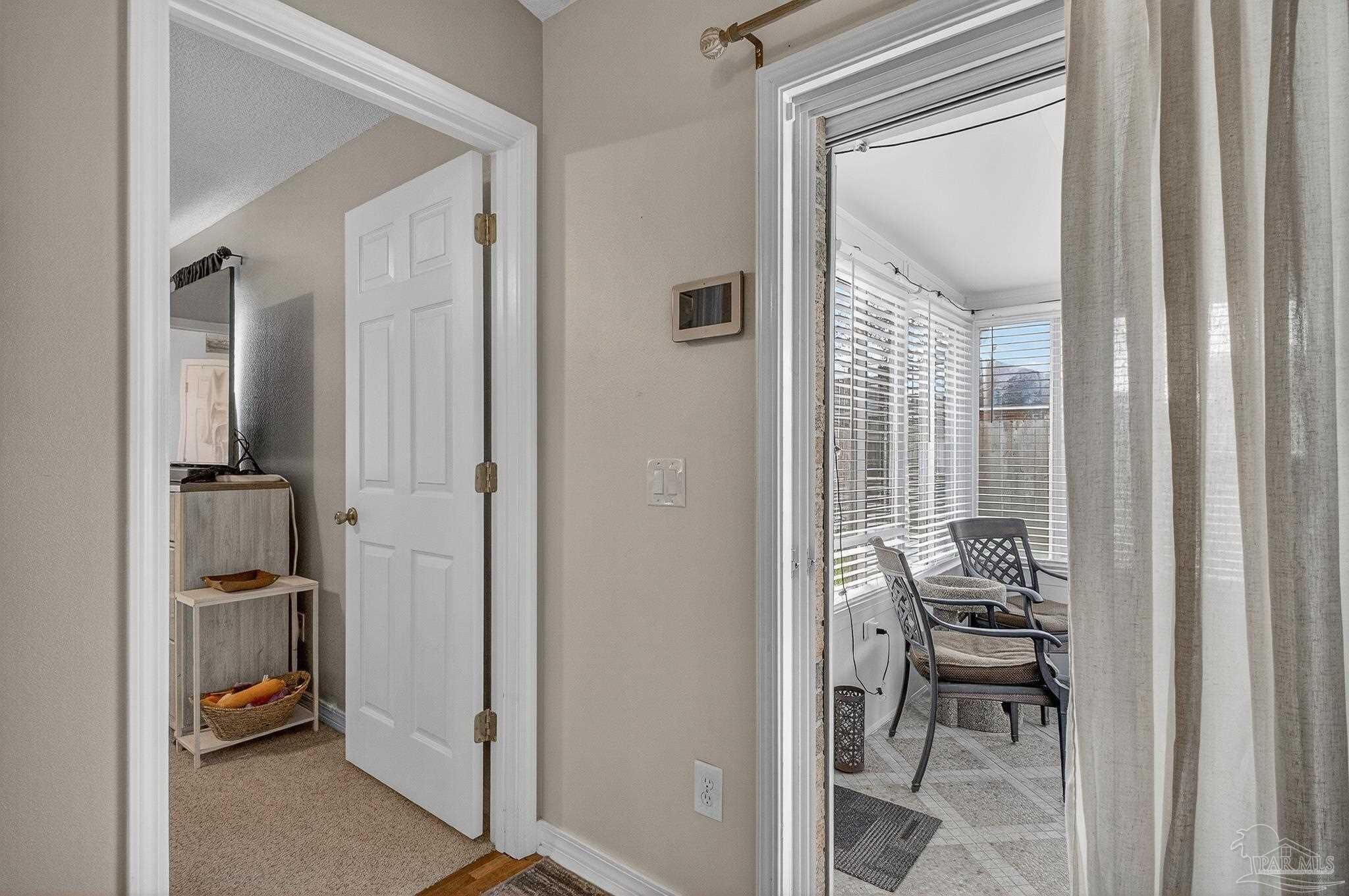 Come experience the charm of Tiburon West, conveniently located off Pace Patriot Boulevard in Pace, Florida, between Jernigan Road and Chumuckla Highway. This home is close to the Pace Fire District, Library, Pace High School, and S.S. Dixon Elementary School. As you step onto the slate-tiled covered porch, you’ll be greeted by the wood flooring of the foyer, which flows throughout the main areas of the home. This three-bedroom, two-bathroom patio-style home with low-maintenance brick siding features an open concept and a split floor plan that offers privacy for everyone. The primary suite, with a private bathroom, walk-in closet, garden tub, and separate shower, is tucked away in the back. The additional bedrooms are off the living room, providing easy access to the guest bathroom. The living room features high ceilings, plant ledges, and cathedral ceilings, while the kitchen boasts a divided-sink with a pull-down faucet, breakfast bar, stainless steel appliances, and plenty of space to store all your kitchen gadgets in the abundant cabinets and large pantry. The formal dining room overlooks the sunroom and the kitchen. The sunroom offers an extended living area perfect for entertaining, reading, or simply relaxing. Other features include 2” white blinds, a sprinkler system, security system, a transfer switch for a portable generator, new windows in 2016, a fenced-in backyard, a low-maintenance yard, gutters, and hurricane shutters. Schedule your private tour today and discover what this home has to offer!