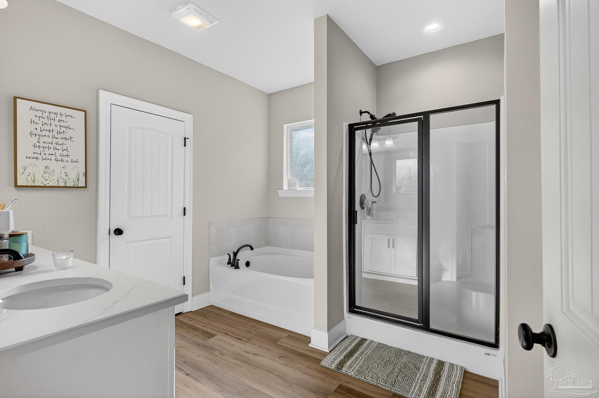 WELCOME to your Dream Home!!! Built in 2022 and located in the gated Iron Rock community, this beautifully upgraded home pairs modern finishes with resort-style amenities, including a large community pool, covered clubhouse with bathhouse facilities, grilling and cooking areas, nature trails, two dog parks, an event lawn, community garden, half basketball court with pickleball, and a cozy firepit area. Inside, enjoy luxury vinyl plank flooring, quartz countertops, under-cabinet lighting, recessed lighting, a kitchen island with walk-in pantry, undermount sinks, bronze plumbing fixtures, and framed mirrors, plus thoughtful touches like blinds, LED coach lighting at the garage, a covered front porch, and a covered rear patio. The private primary suite features a double vanity, garden tub, separate custom-tiled shower, and a spacious walk-in closet, while energy-efficient upgrades include a tankless gas water heater, gas range, and vinyl low-E windows.