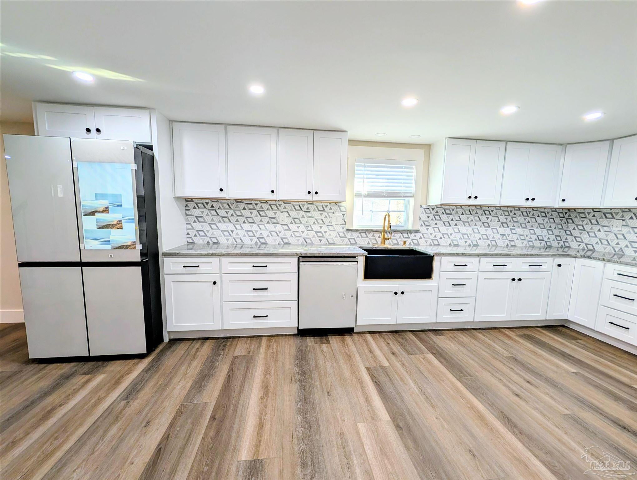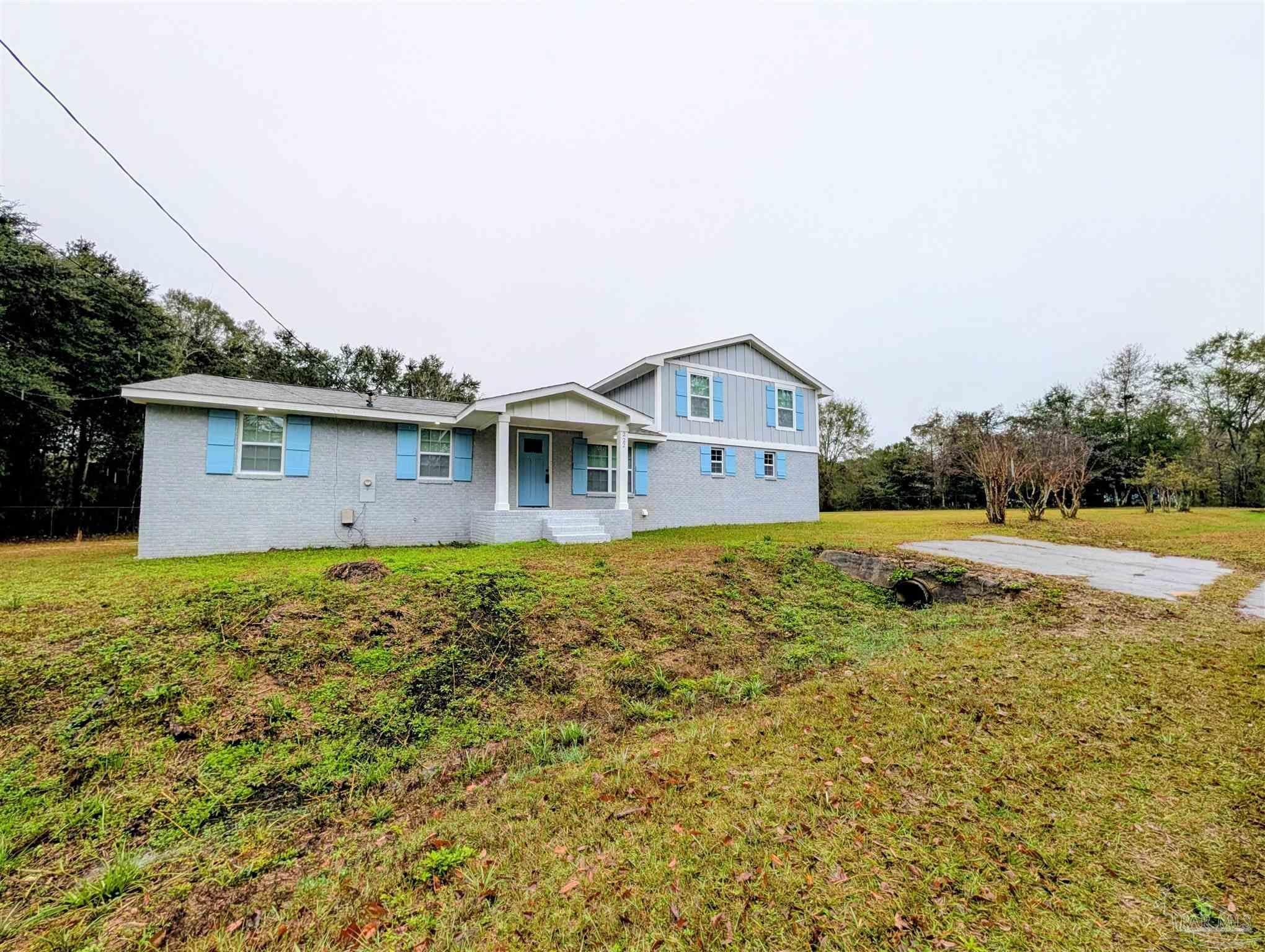 COMPLETELY remodeled - just finished Nov 2025. Brand new everything inside the home: kitchen, bathrooms, bedrooms. A complete overhaul. Brand new roof on the outside as well with fresh coat of paint on the brick and redone wood on second floor portion. Kitchen absolutely elevated with new everything from the floor to the ceiling. Brightly lit with all new LED lighting through the home. Appliances are top notch including an Induction stove top with oven. ALL brand-new impact resistant windows (all included with new blinds) with the kitchen window overlooking the sizeable property/yard as you wash dished in the farmhouse type black ceramic sink. Living/Dining Room combo area as you come through front door greets you with a chic electric fireplace. Bathrooms all remodeled. Master bathroom with approx 4x6 tiled shower. Same for the other two bathrooms with one having a tub/shower combination. All of them with all new lighting, tile, quality vanity, light fixtures. New contemporary doors all around and fixtures as well as vent registers and smooth finish ceilings. New LVT floors throughout, except the bathrooms (elegant tiles), framed by the modern 5" baseboards. Garage is super long and is a step down from the kitchen - new garage door opener, water heater and washer and dryer. Floor is treated and painted flakes for easy cleaning and grip. Outside enjoy the blank canvas where you can do what you like with 1.3 acres that has been cleared and relatively flat. Or enjoy from the covered back area with 6 LED recessed lights for major lighting. If you want a piece of land and a move-in ready home, this is it! Don't hesitate - come and check it out and be impressed with the transformation.