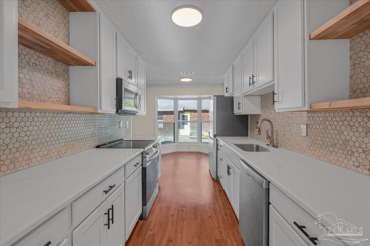 Welcome to this fabulous, and Remodeled 4-bedroom, 2-bath Brick home that offers great location—minutes from I-110, Sacred Heart Hospital, Baptist Hospital, top-rated restaurants, shopping, and all that Pensacola has to offer. A custom flagstone walkway takes you to 19' x 6' COVERED FRONT PORCH, perfect for enjoying morning coffee or greeting guests. Step inside to find wood laminate and tile flooring throughout—NO CARPET—making it stylish and low maintenance. To the right of the foyer, the spacious living room flows seamlessly into the dining room. The dining room connects directly to the kitchen, making it easy to serve meals and entertain. The adjoining family room features a cozy wood-burning FIREPLACE, setting the tone for warm evenings at home. The Brand New kitchen is equipped with Quartz Countertops, STAINLESS STEEL appliances, crisp white cabinetry and Breakfast Nook. The massive 24x12 PRIMARY bedroom features a dedicated sitting area—ideal for a reading nook or home office setup. The primary bath features a WALK-IN CLOSET, GRANITE counters, and an oversized WALK IN shower with Custom Tiles. All additional bedrooms are impressively large, each with EXTRA-SIZED CLOSETS, and they share a REMODELED full bath in the hallway. A true highlight of the home is the expansive 20' x 20' BONUS ROOM, ideal for a playroom, media room, home office, gym, or anything your lifestyle requires and has a direct access to a 19' x 9' WALK IN PANTRY and Laundry room—that provides exceptional storage and functionality. This home also comes equipped with NEW DOUBLE-PANE energy-efficient WINDOWS and a NEW HEAT PUMP with a variable-speed handler (13.5 SEER) for year-round comfort and utility savings. Step outside to enjoy the 23' x 9' COVERED BACK PATIO , perfect for outdoor dining, relaxing, or hosting gatherings. The backyard includes a 20' x 20' detached garage with Storage. Also featuring Privacy Fence, New Paint through out and Huge back yard. Call today for your private showing.