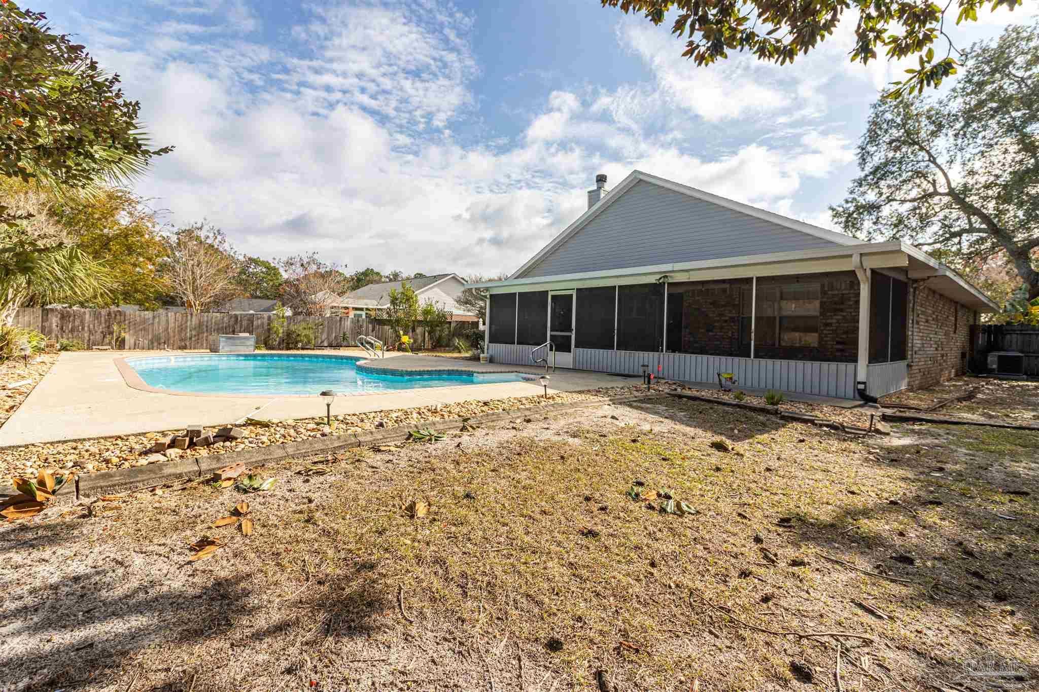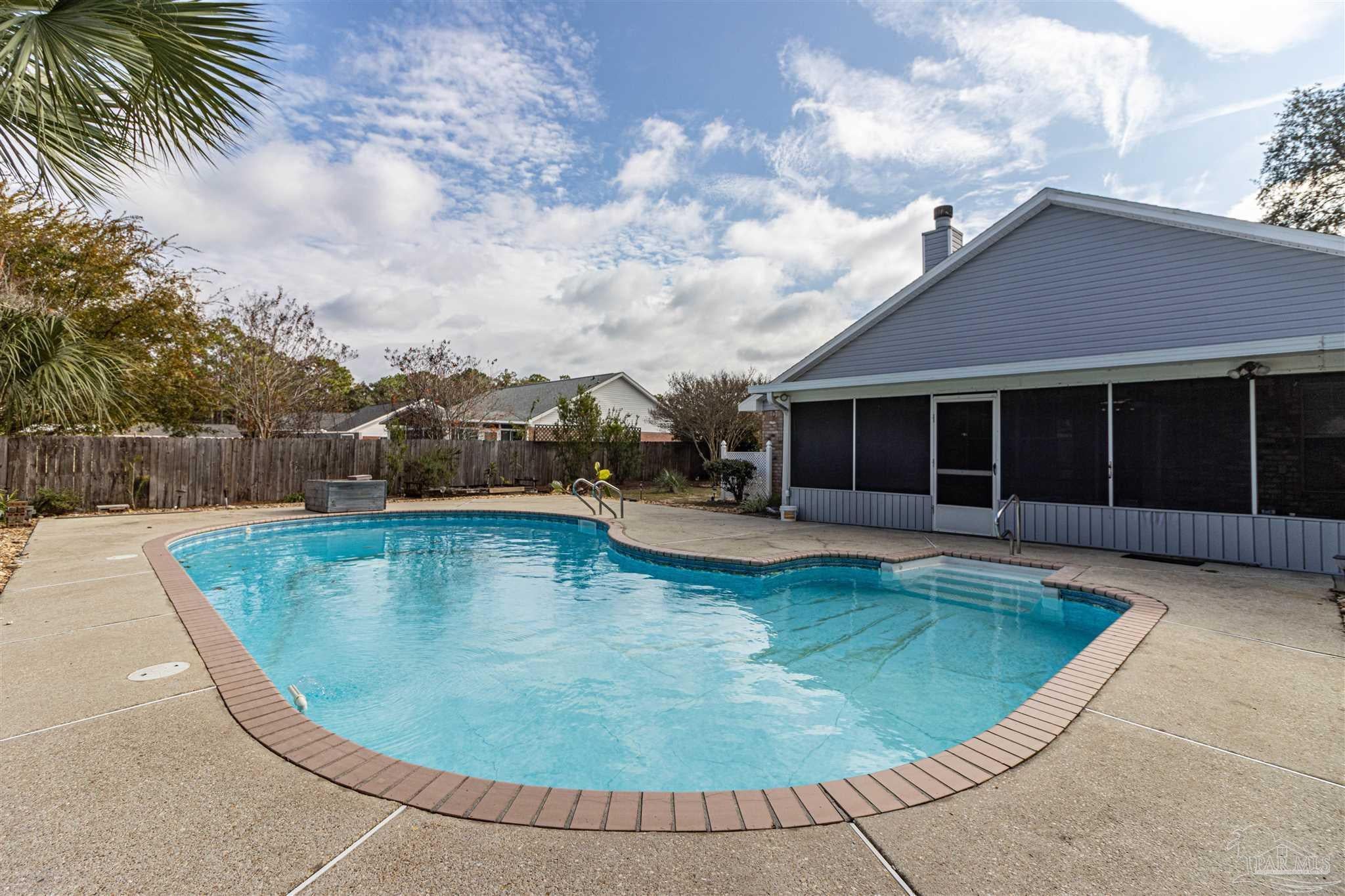 Brick Pool Home in Navarre centrally located near shopping, schools and beautiful Navarre Beach, this well-maintained 3 Bedroom/2 Bath home offers 1,796 sf of living space. The home features a formal living room, a separate family room with a cozy fireplace and a dining area conveniently located off the kitchen. Kitchen area is equipped with granite countertops and breakfast bar, perfect for everyday living. A split floor plan with a spacious master suite with bath that allows double vanity, garden tub with shower. Step outside to enjoy your private backyard oasis, complete with a 19 x 36 kidney-shaped vinyl pool and a 10 x 20 screened porch-ideal for relaxing. 3 storage buildings with electricity. Located near Hidden Creek Golf Course, this subdivision has NO HOA!