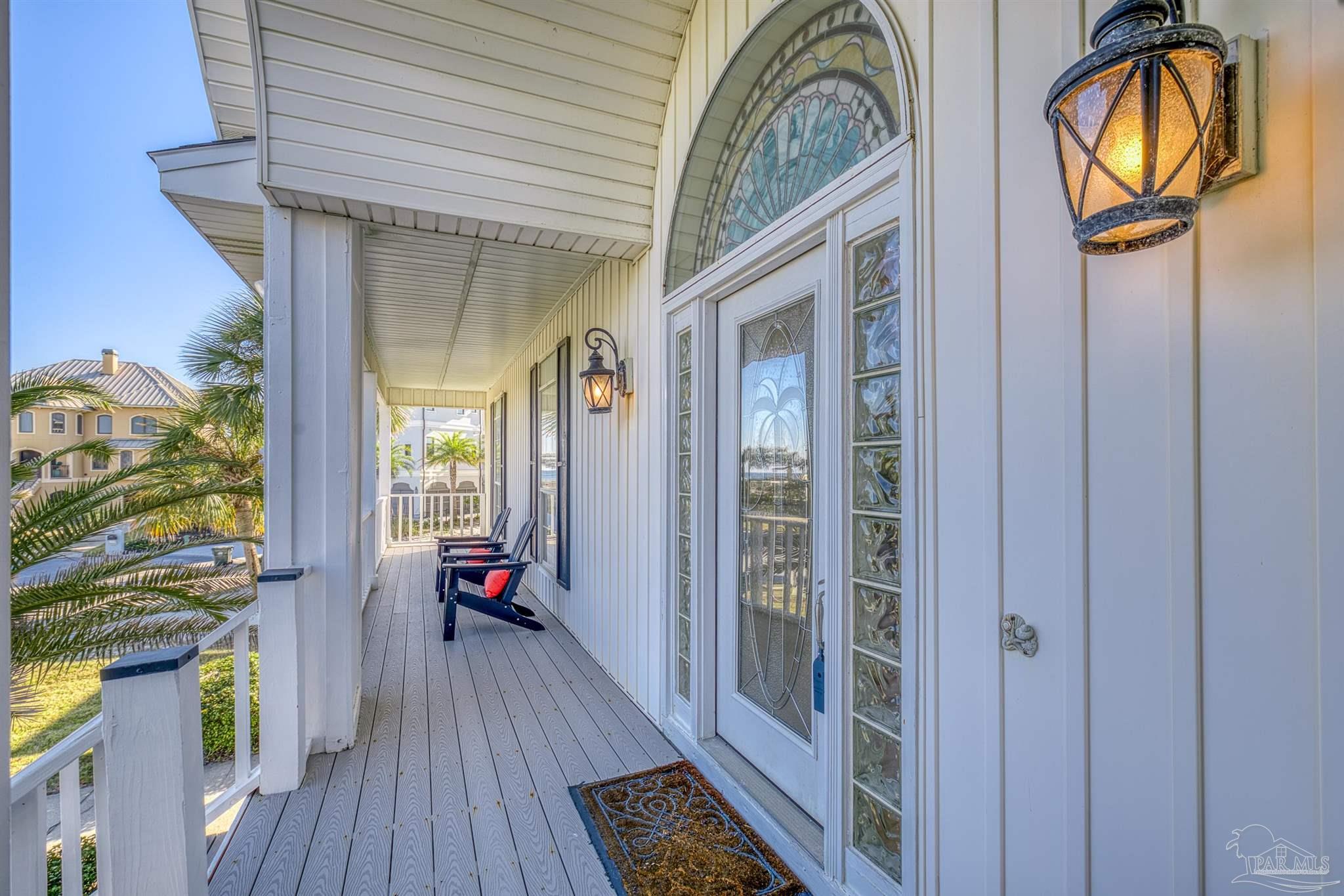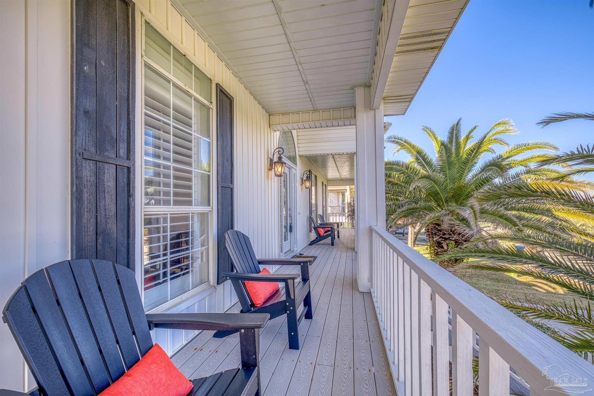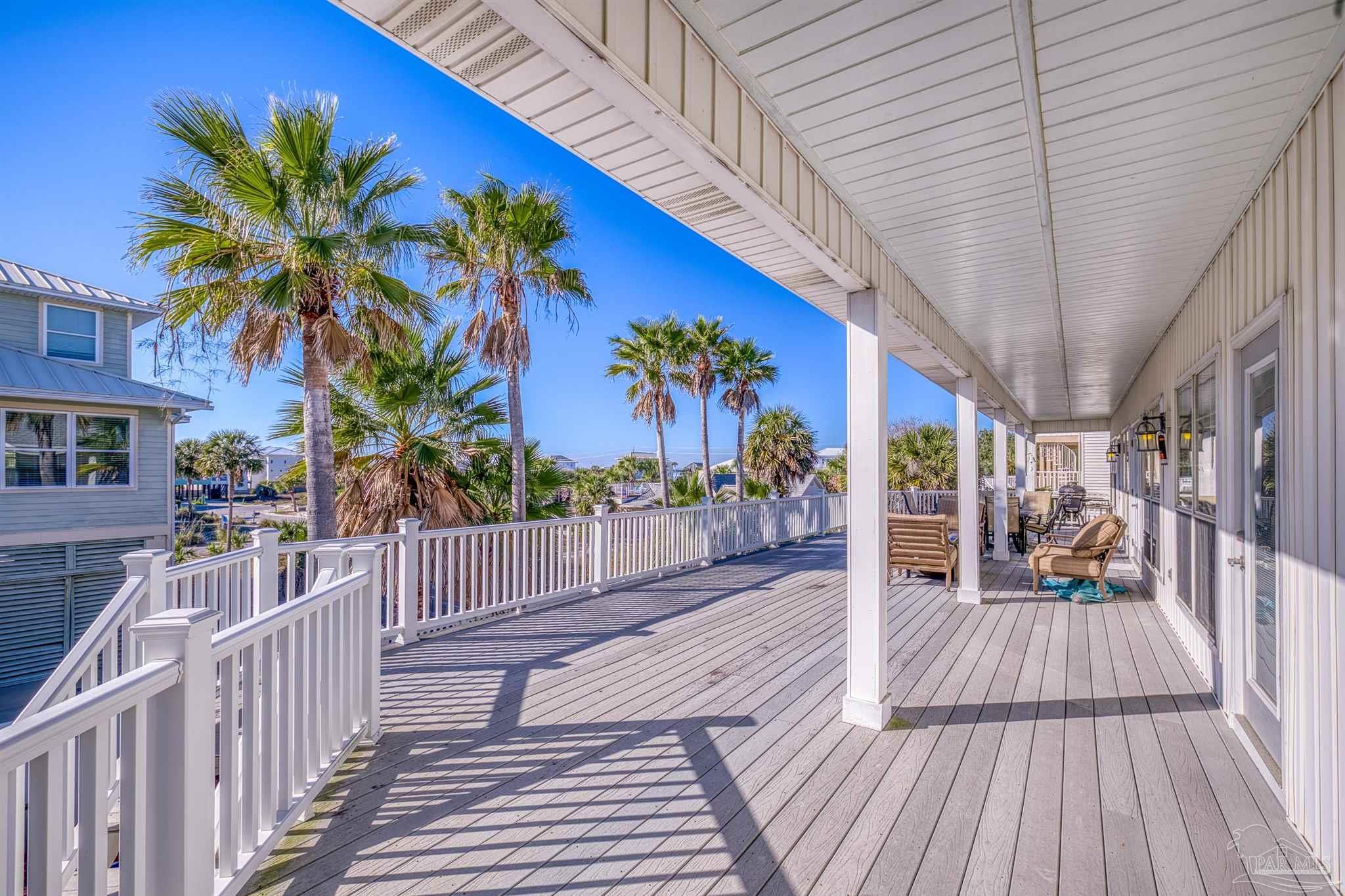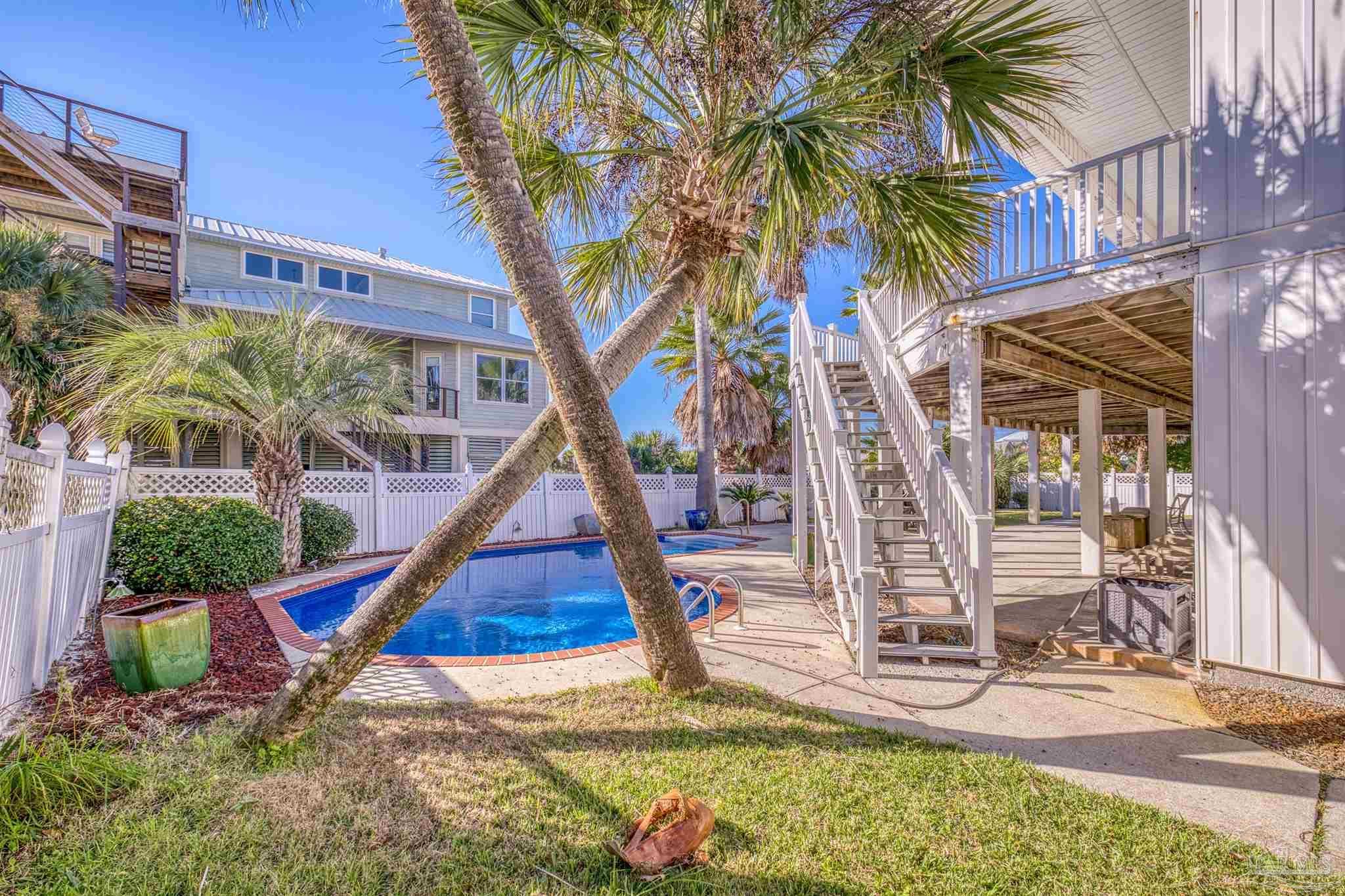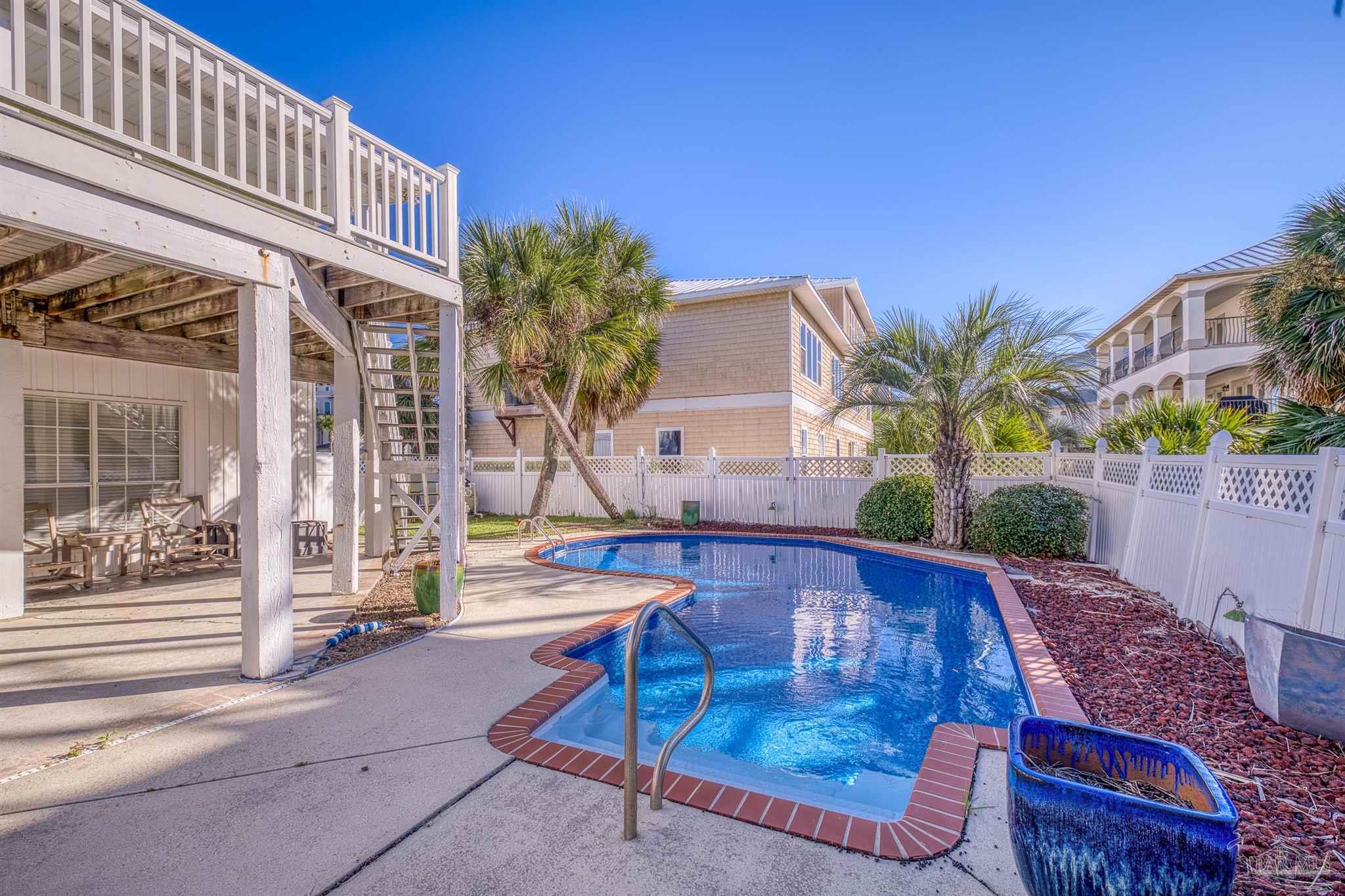 Exceptional Opportunity in Prestigious Calle Hermosa Discover your ultimate coastal retreat in the exclusive Calle Hermosa community, a hidden gem of Pensacola Beach where just 26 homes ensure privacy and tranquility. Free from short-term rentals, this coveted Gulf-side enclave offers a peaceful lifestyle only steps from the sugar-white sands and turquoise waters of the Gulf of Mexico. This beautifully maintained pool home showcases stunning water views and a design that seamlessly blends comfort and style. Expansive windows bathe the interiors in natural light, highlighting travertine floors, soaring ceilings, crown molding, arched doorways, and recessed lighting. The open-concept living area, anchored by a fireplace with custom built-ins, flows effortlessly to a covered deck overlooking the sparkling pool and the Gulf beyond—perfect for entertaining or relaxing. The chef’s kitchen features stainless steel appliances, an island cooktop, maple shaker cabinetry, generous prep space, and a walk-in pantry. A charming breakfast nook invites casual dining with a view. The master suite is a private sanctuary with tray ceilings, plantation shutters, and refined trim details. Its spa-inspired bath offers dual vanities, a jetted tub, and a frameless glass shower with mosaic accents. Two additional bedrooms with a Jack-and-Jill bath, plus an extra full bath, provide flexibility for guests, a home office, or fitness space. With deeded beach access just 60 yards away and a location minutes from shopping, dining, Gulf Breeze, and Downtown Pensacola, this home embodies the perfect Gulf Coast escape.