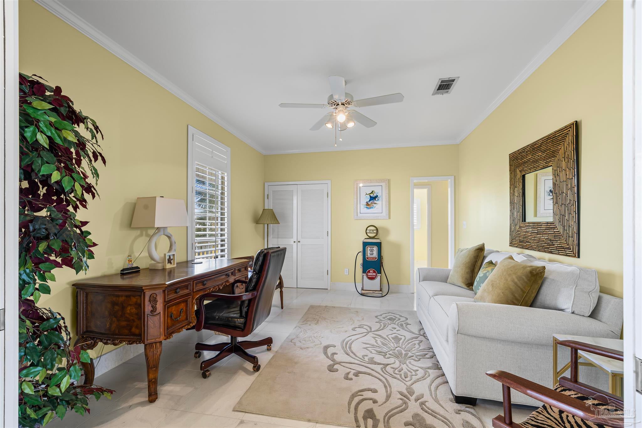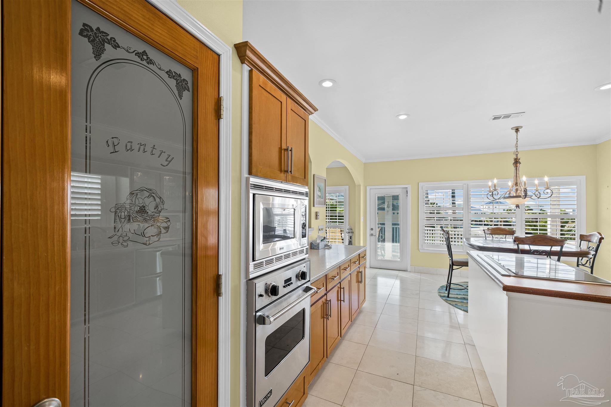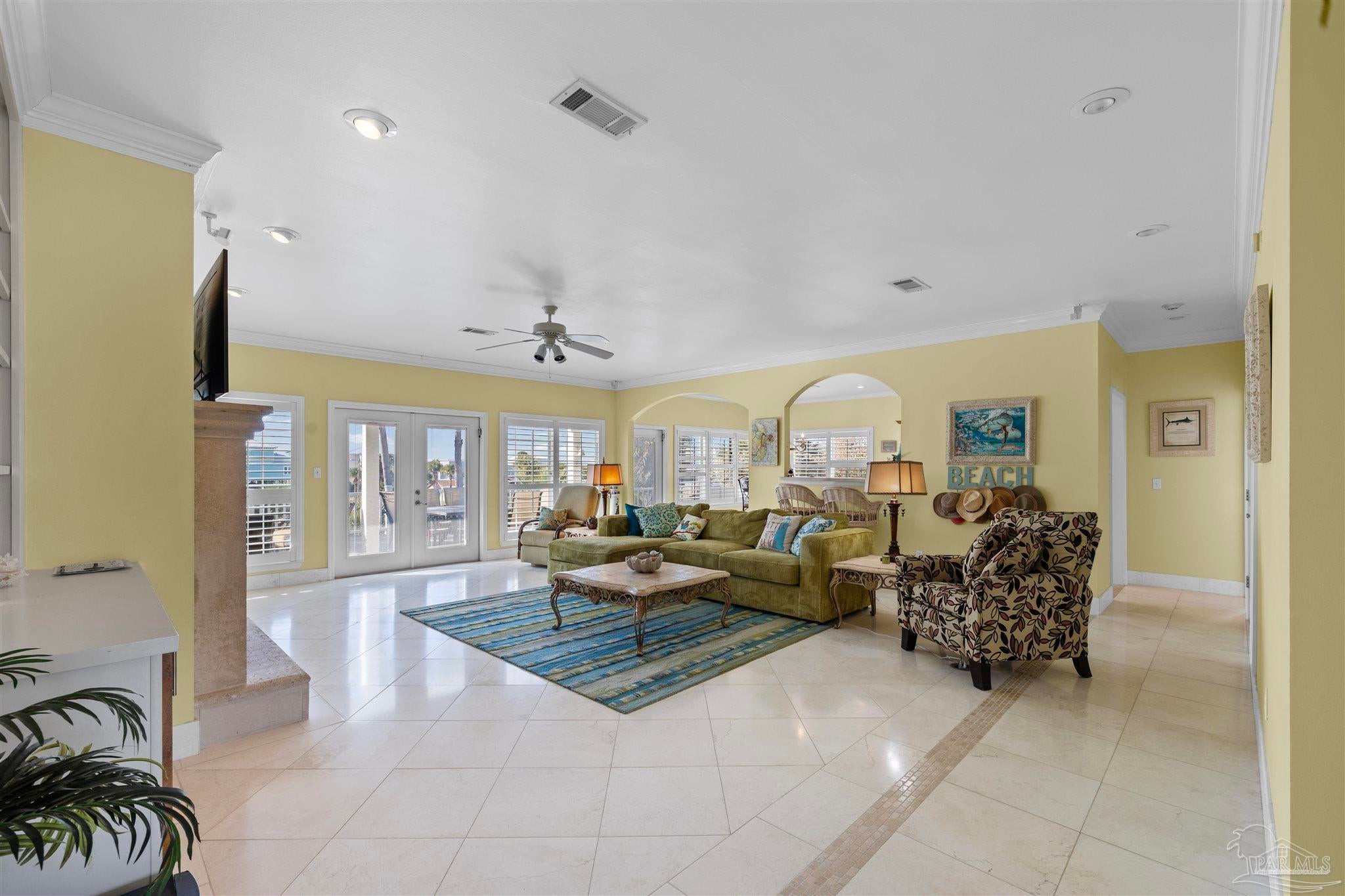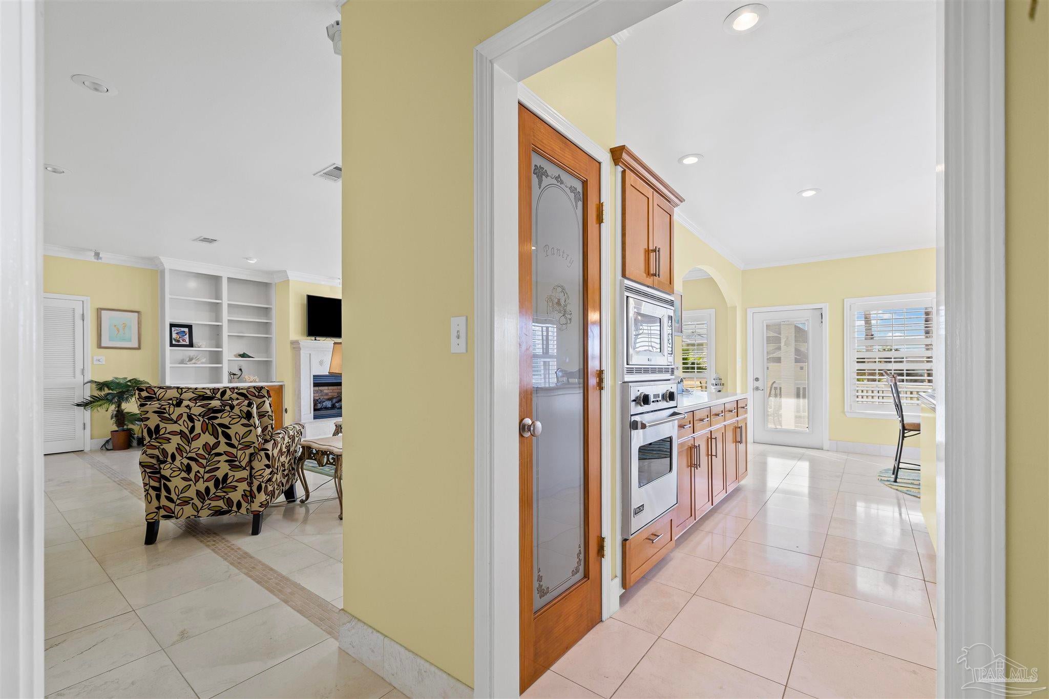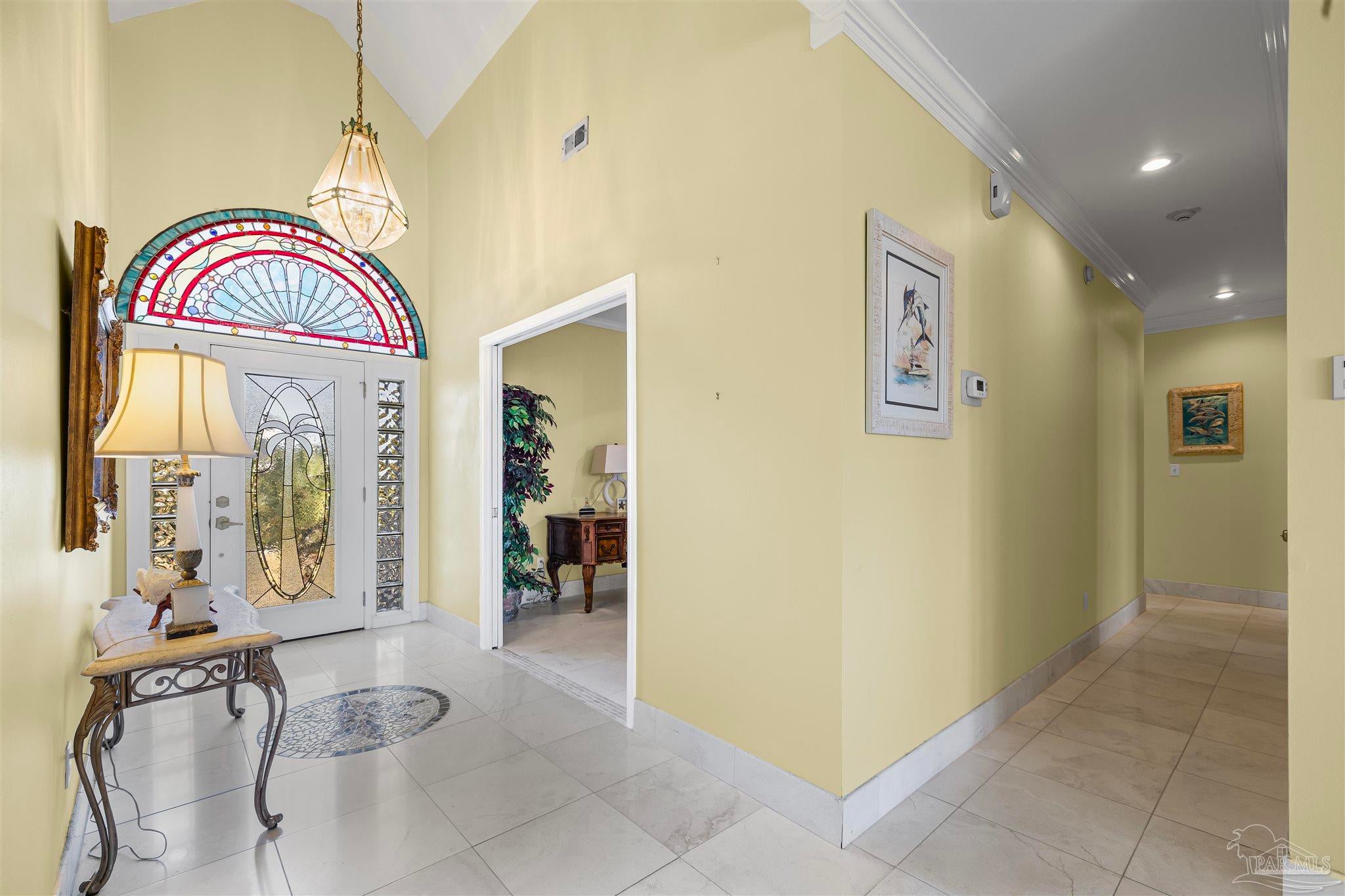 Exceptional Opportunity in Prestigious Calle Hermosa Discover your ultimate coastal retreat in the exclusive Calle Hermosa community, a hidden gem of Pensacola Beach where just 26 homes ensure privacy and tranquility. Free from short-term rentals, this coveted Gulf-side enclave offers a peaceful lifestyle only steps from the sugar-white sands and turquoise waters of the Gulf of Mexico. This beautifully maintained pool home showcases stunning water views and a design that seamlessly blends comfort and style. Expansive windows bathe the interiors in natural light, highlighting travertine floors, soaring ceilings, crown molding, arched doorways, and recessed lighting. The open-concept living area, anchored by a fireplace with custom built-ins, flows effortlessly to a covered deck overlooking the sparkling pool and the Gulf beyond—perfect for entertaining or relaxing. The chef’s kitchen features stainless steel appliances, an island cooktop, maple shaker cabinetry, generous prep space, and a walk-in pantry. A charming breakfast nook invites casual dining with a view. The master suite is a private sanctuary with tray ceilings, plantation shutters, and refined trim details. Its spa-inspired bath offers dual vanities, a jetted tub, and a frameless glass shower with mosaic accents. Two additional bedrooms with a Jack-and-Jill bath, plus an extra full bath, provide flexibility for guests, a home office, or fitness space. With deeded beach access just 60 yards away and a location minutes from shopping, dining, Gulf Breeze, and Downtown Pensacola, this home embodies the perfect Gulf Coast escape.