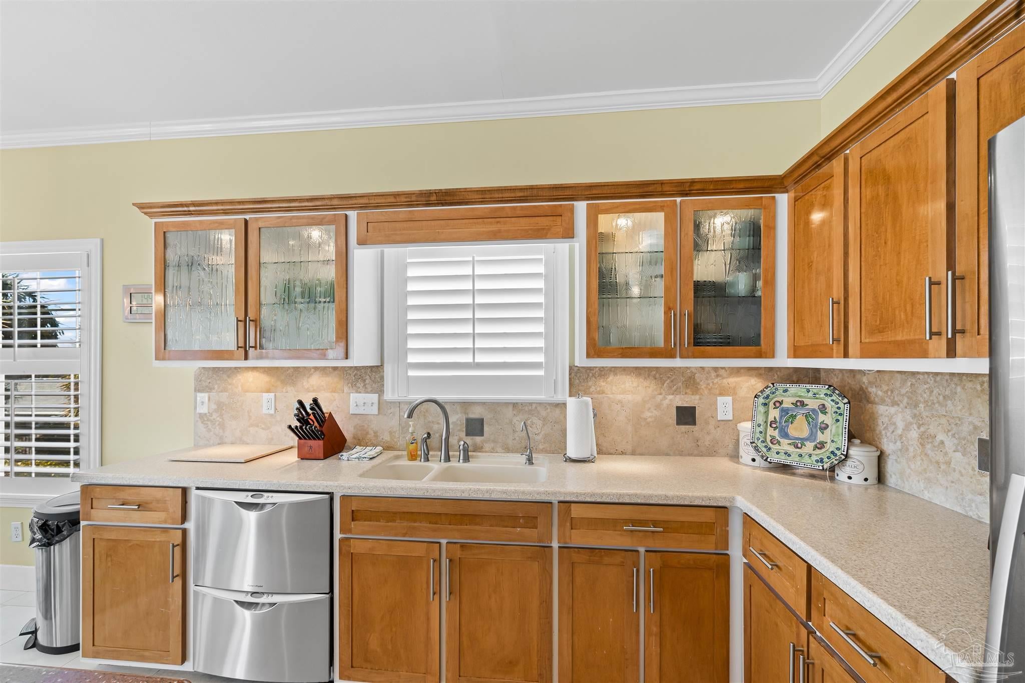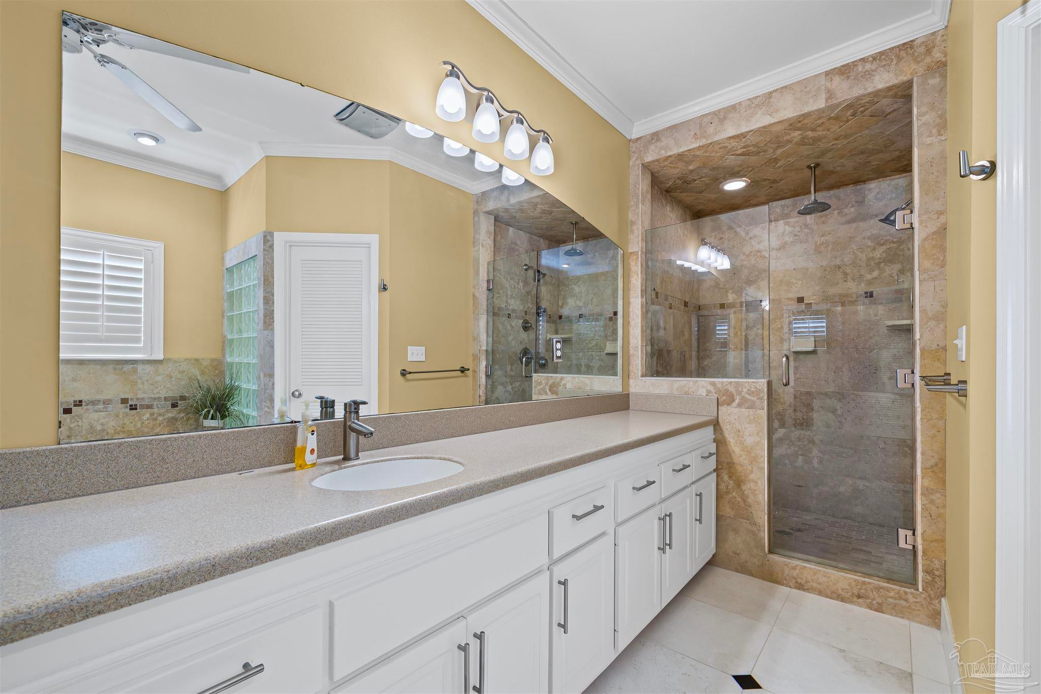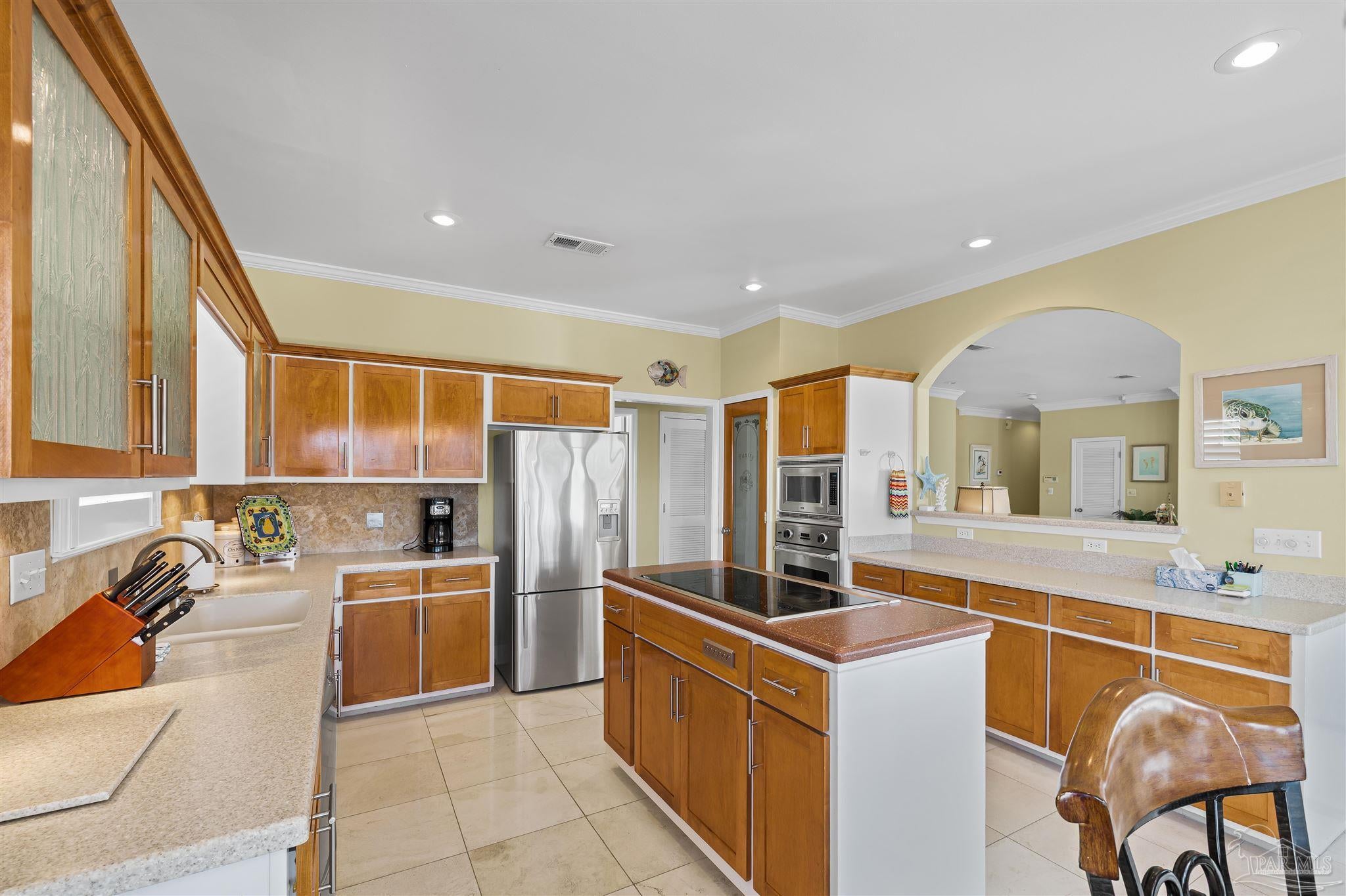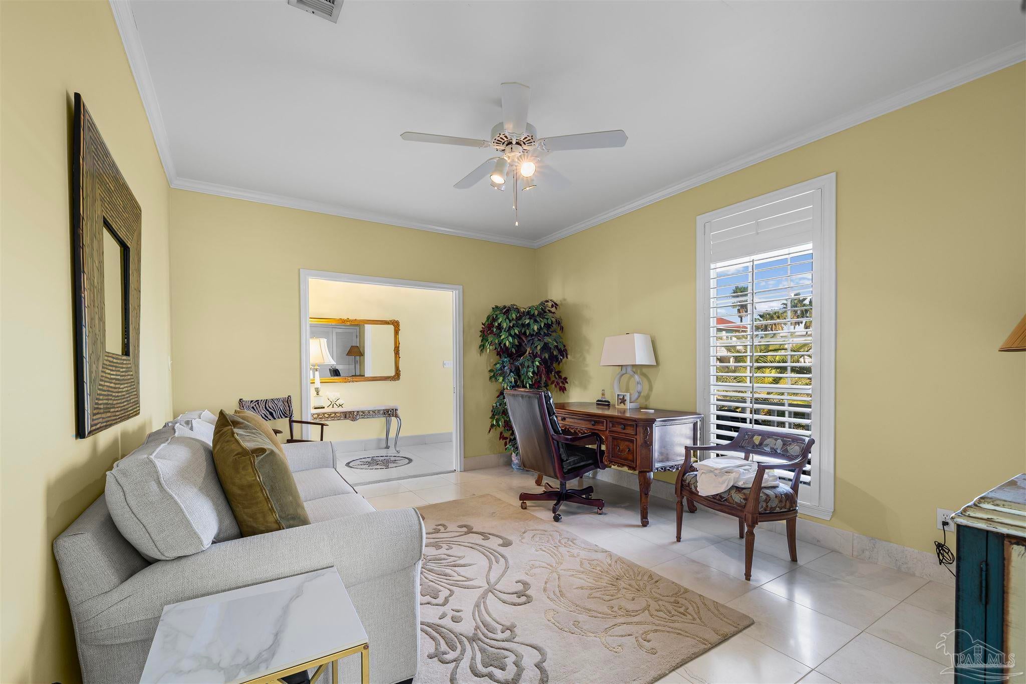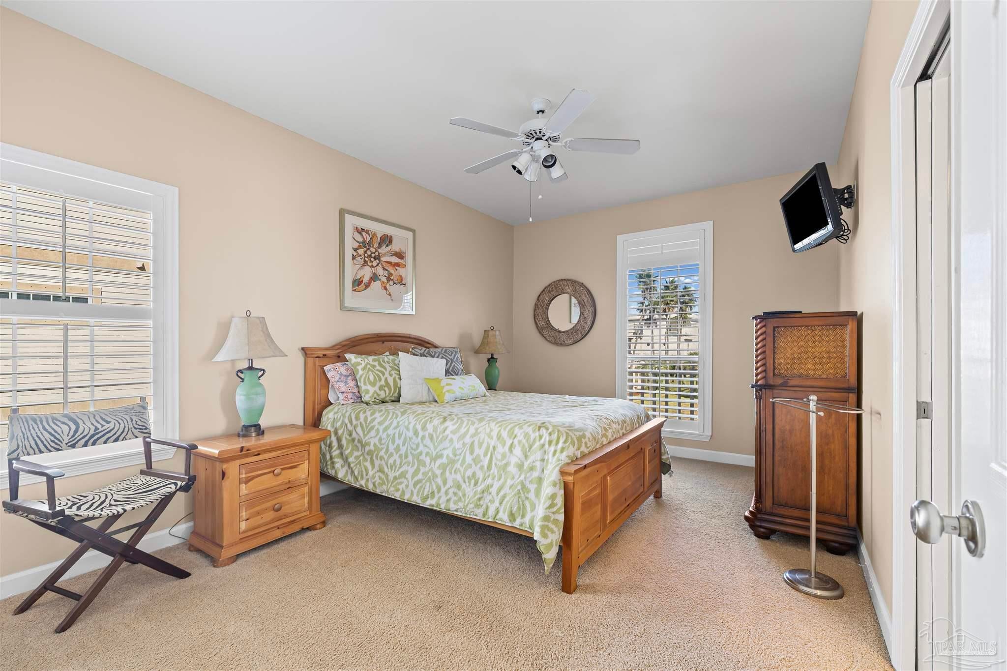 Exceptional Opportunity in Prestigious Calle Hermosa Discover your ultimate coastal retreat in the exclusive Calle Hermosa community, a hidden gem of Pensacola Beach where just 26 homes ensure privacy and tranquility. Free from short-term rentals, this coveted Gulf-side enclave offers a peaceful lifestyle only steps from the sugar-white sands and turquoise waters of the Gulf of Mexico. This beautifully maintained pool home showcases stunning water views and a design that seamlessly blends comfort and style. Expansive windows bathe the interiors in natural light, highlighting travertine floors, soaring ceilings, crown molding, arched doorways, and recessed lighting. The open-concept living area, anchored by a fireplace with custom built-ins, flows effortlessly to a covered deck overlooking the sparkling pool and the Gulf beyond—perfect for entertaining or relaxing. The chef’s kitchen features stainless steel appliances, an island cooktop, maple shaker cabinetry, generous prep space, and a walk-in pantry. A charming breakfast nook invites casual dining with a view. The master suite is a private sanctuary with tray ceilings, plantation shutters, and refined trim details. Its spa-inspired bath offers dual vanities, a jetted tub, and a frameless glass shower with mosaic accents. Two additional bedrooms with a Jack-and-Jill bath, plus an extra full bath, provide flexibility for guests, a home office, or fitness space. With deeded beach access just 60 yards away and a location minutes from shopping, dining, Gulf Breeze, and Downtown Pensacola, this home embodies the perfect Gulf Coast escape.