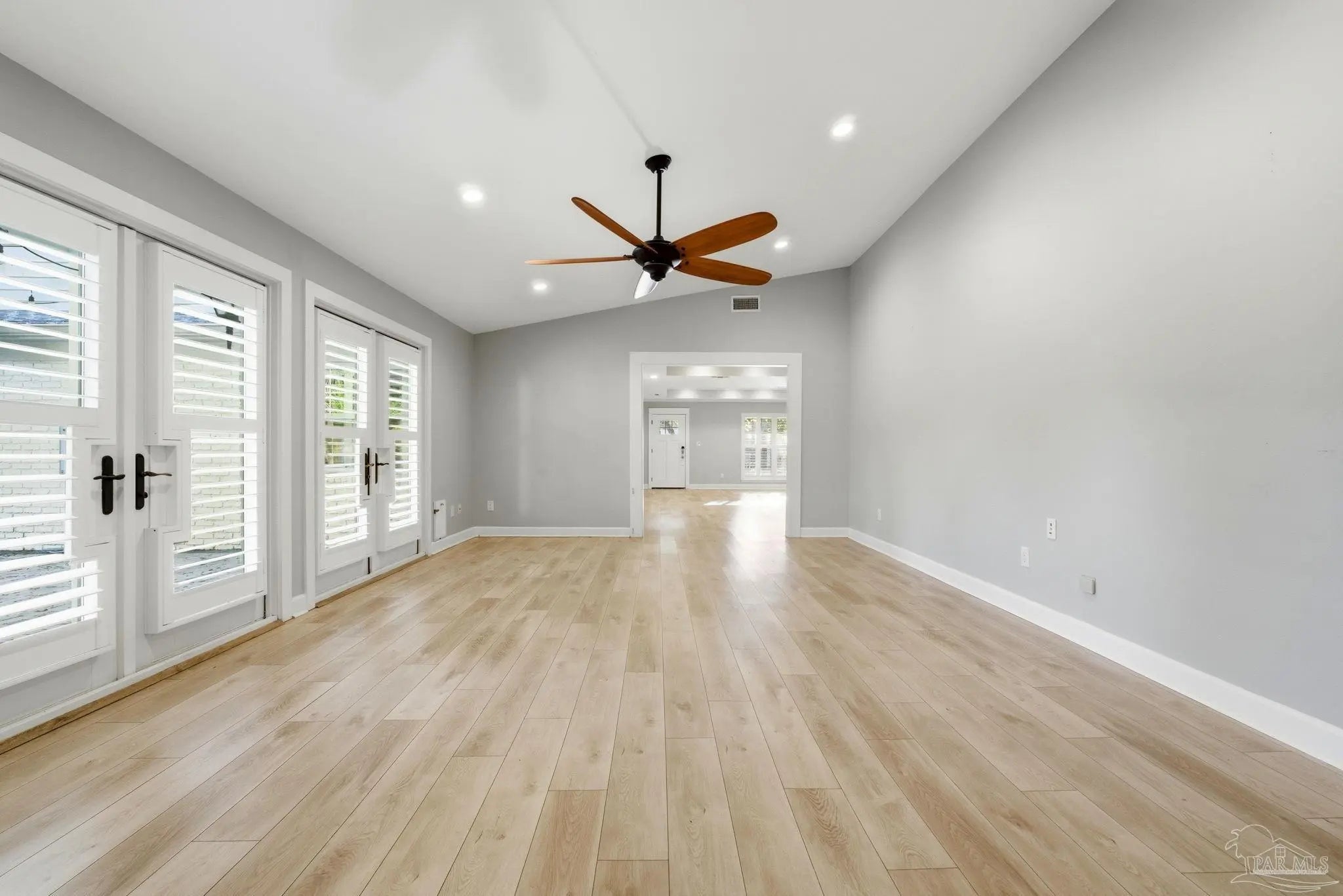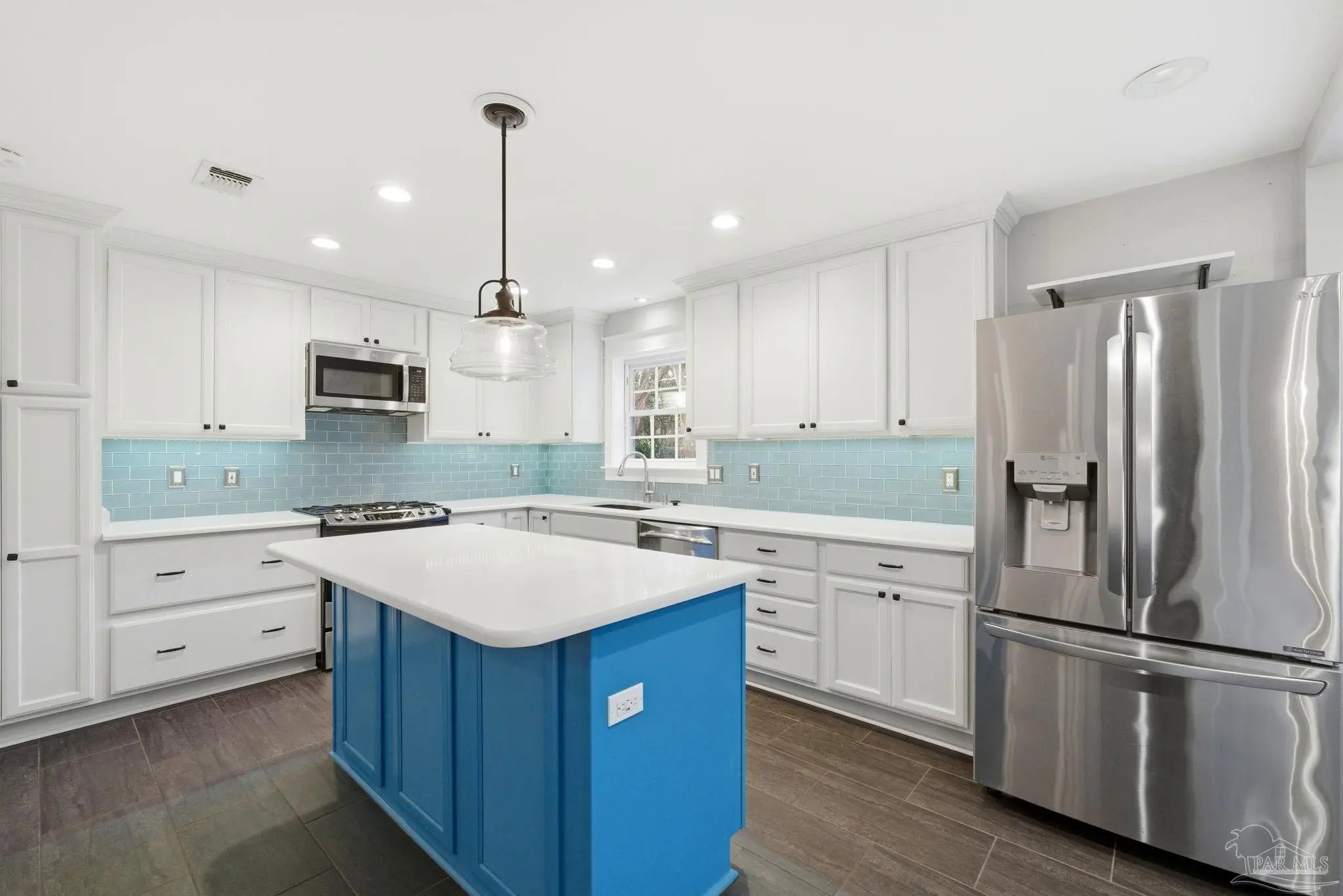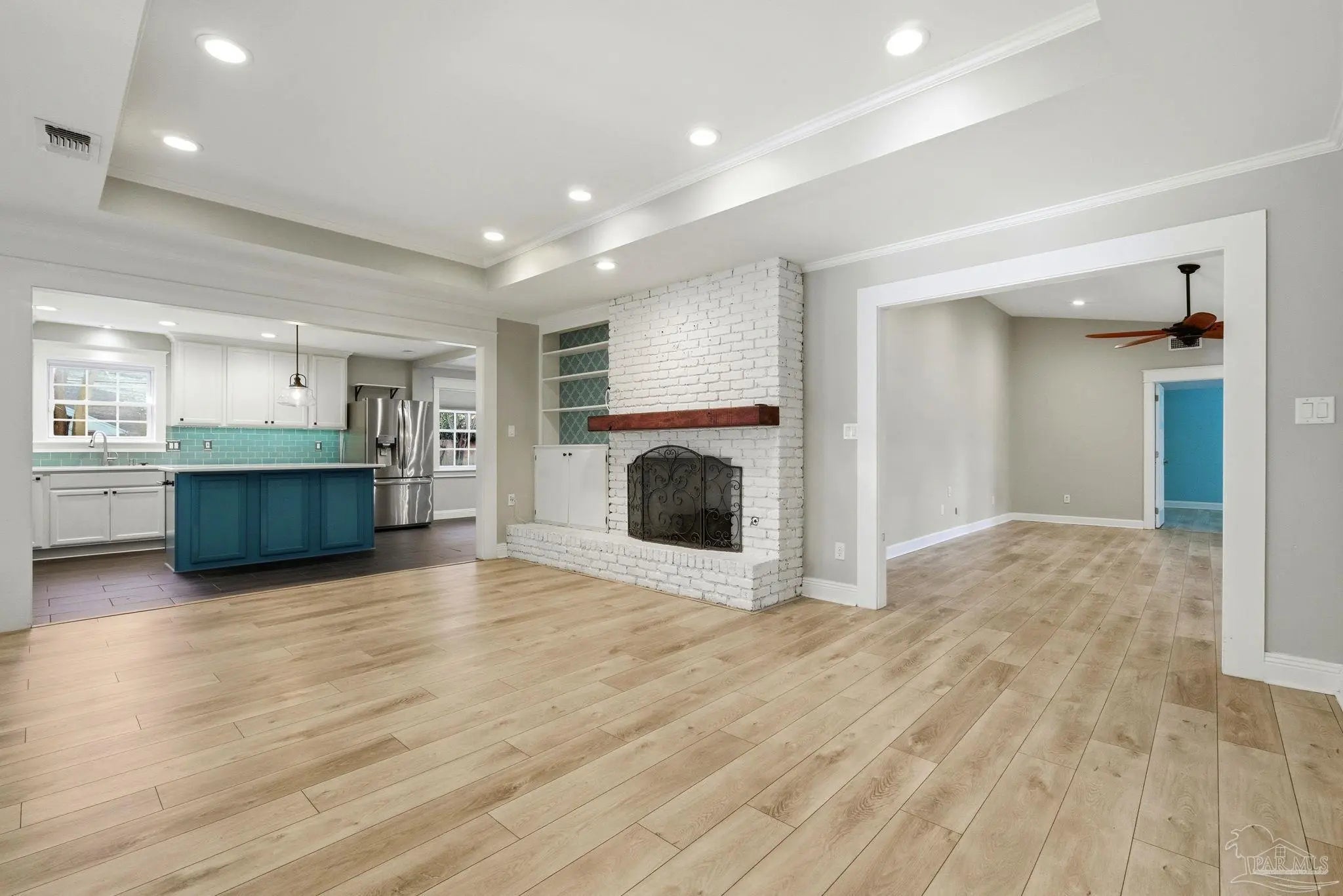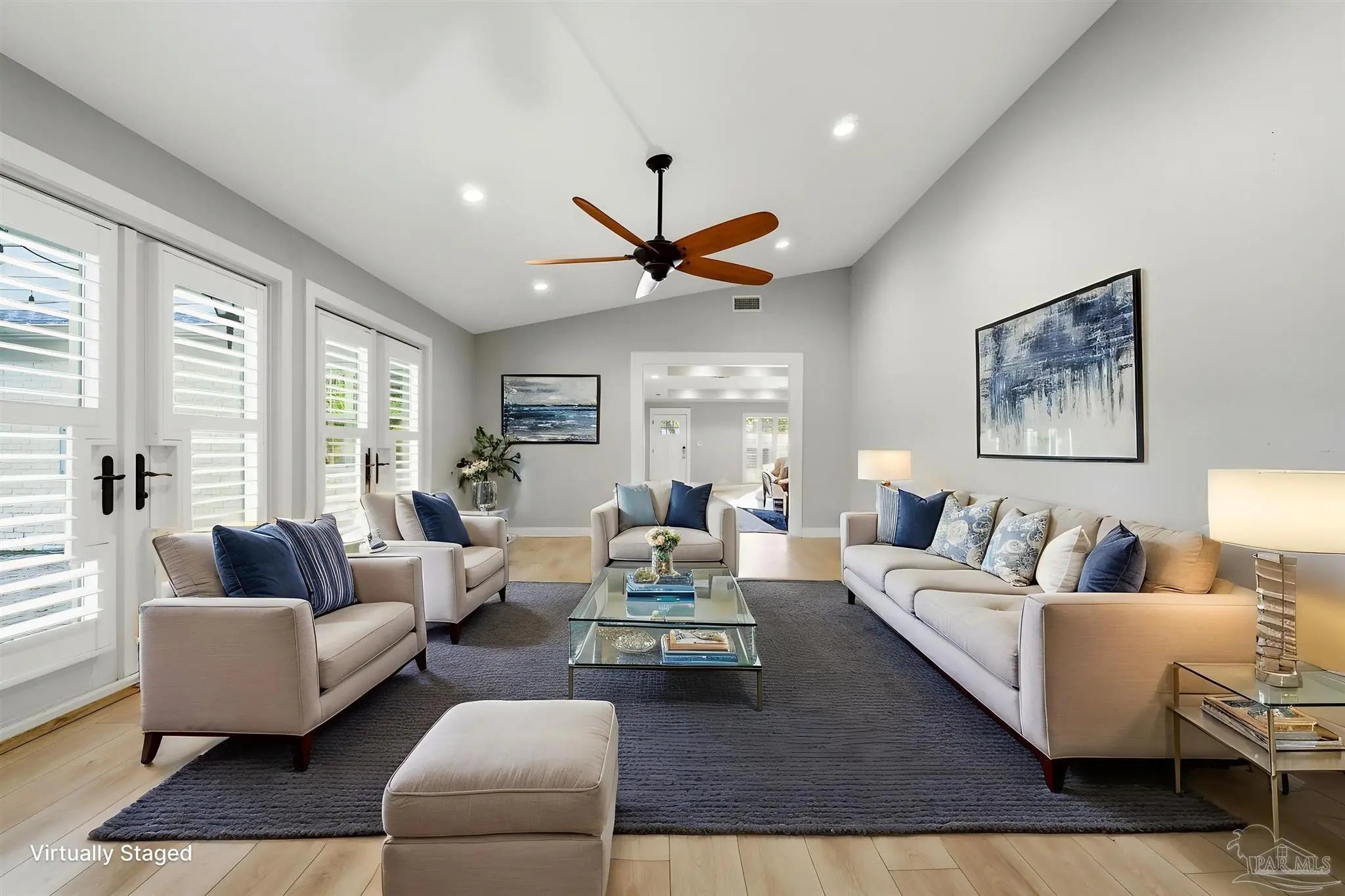 Located in the heart of Gulf Breeze Proper and within easy walking distance of top-rated schools, parks, and local shops, this beautifully updated one-story brick pool home delivers spacious, light-filled living with timeless coastal appeal. Set on a generous half-acre lot, the five-bedroom, three-and-a-half-bath residence balances relaxed daily life with effortless entertaining. An open-concept layout flows naturally between two expansive living areas, both bright with natural light and finished with durable luxury vinyl plank and tile flooring. The main living space centers around a welcoming gas fireplace that brings warmth and character year-round. The well-appointed kitchen features a large island, gas cooktop, and quartz countertops, while an adjacent breakfast area offers casual dining and the separate formal dining room is perfect for special gatherings. The primary suite provides a peaceful retreat with a generous walk-in closet, and a tastefully updated bathroom complete with dual vanities and a beautifully tiled shower. Four additional bedrooms offer flexibility for family, guests, or home offices, including one ideally suited as a private guest suite. Step outside to a secluded backyard oasis anchored by a sparkling saltwater pool with new liner and a spacious lanai designed for year-round enjoyment. Additional highlights include a 1.5-car garage with dedicated golf-cart parking, a fully fenced yard, tankless water heater, and sprinkler system. With its unbeatable location and thoughtful design, this home embodies the very best of the Gulf Breeze lifestyle.