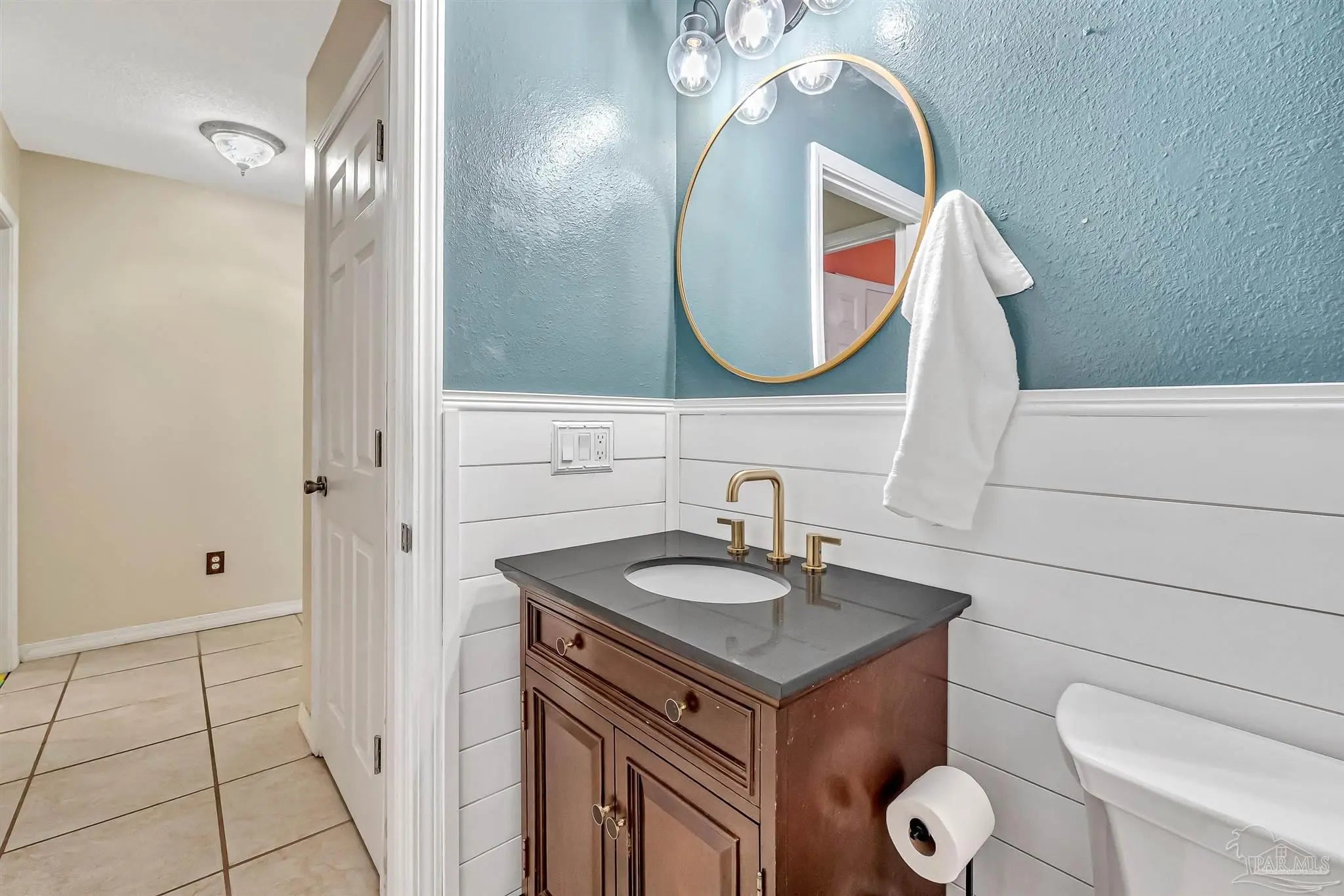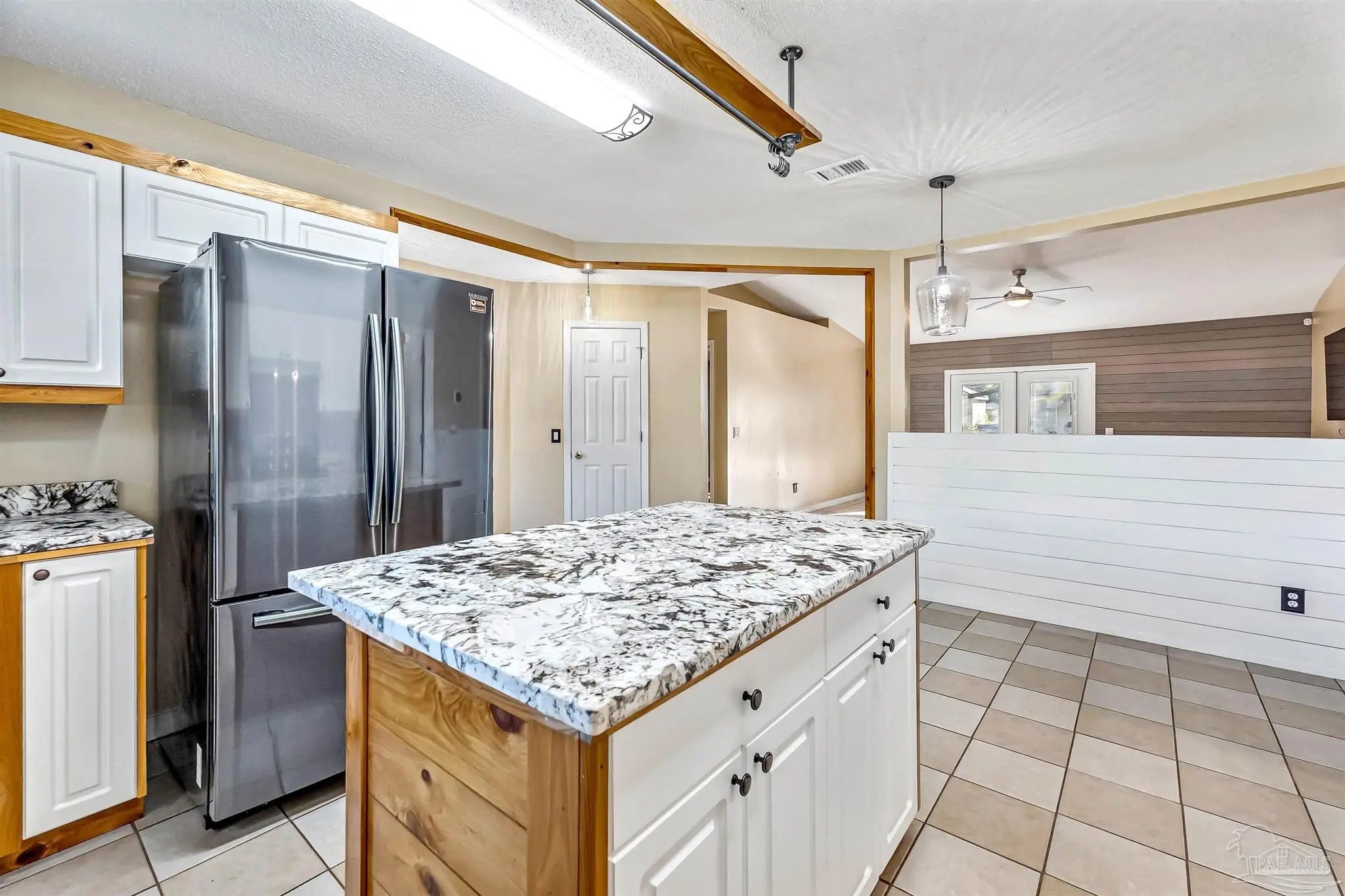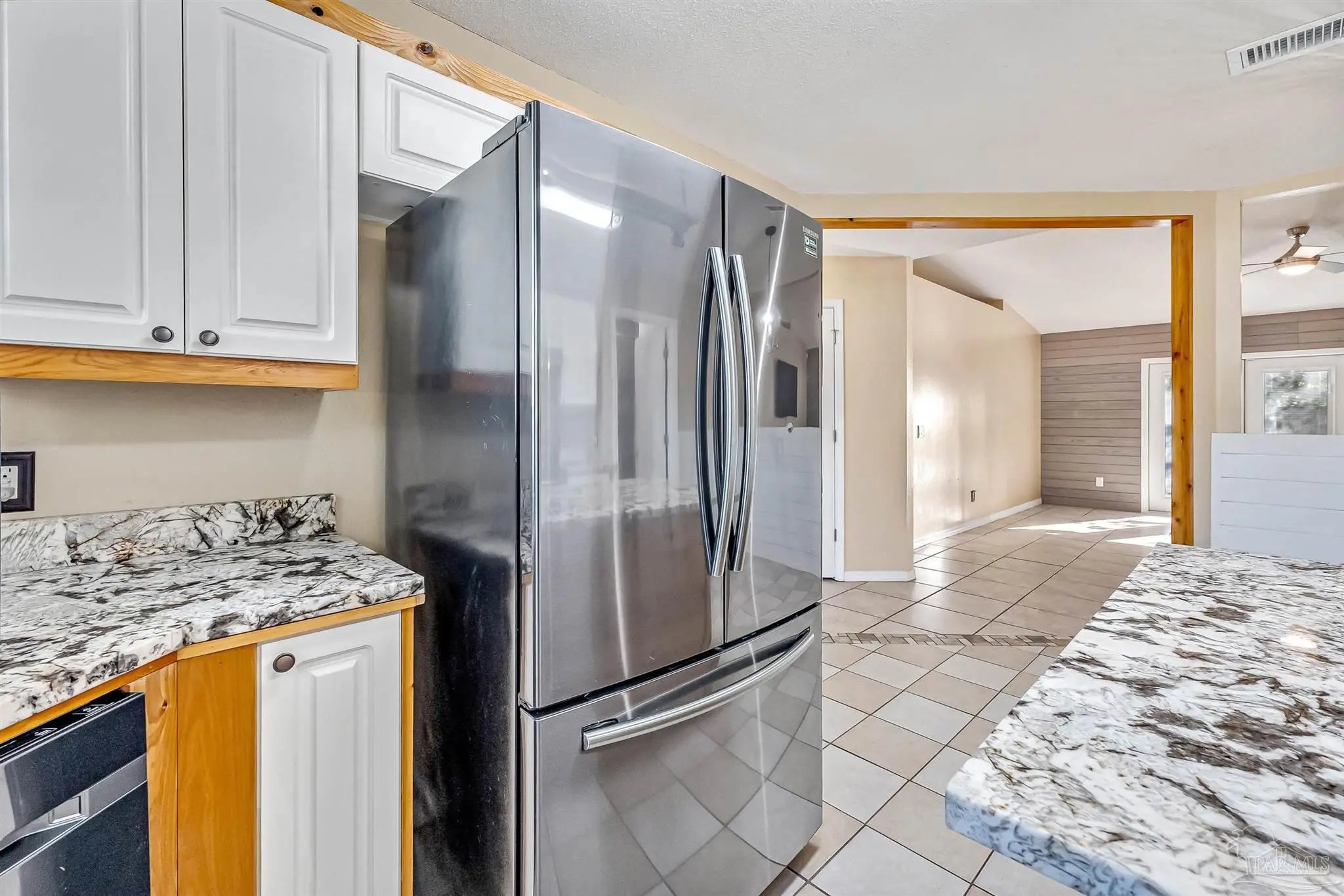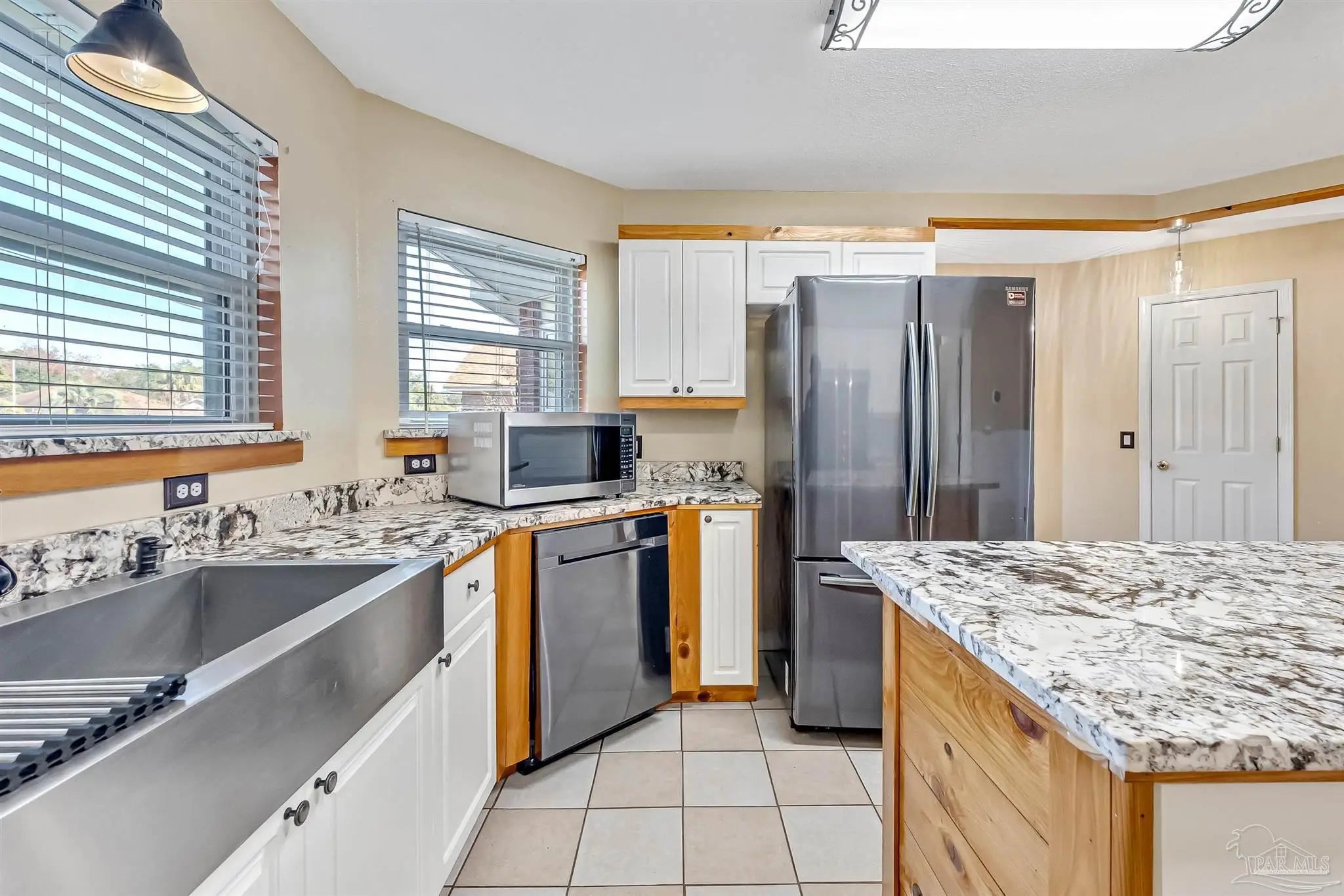 This well-maintained 3-bedroom, 2-bath home in Navarre has no HOA and is located in flood zone X. It features 1,714 sqft of tiled living space and a split-bedroom floor plan that offers privacy and flexible living. The updated kitchen includes granite countertops, black stainless appliances, a farmhouse sink, a large island with storage, and a pantry. The family room features plant ledges and French doors leading to a fully privacy-fenced backyard. A separate dining room or home office with a barn door adds versatility. The primary suite includes two walk-in closets and a bath with a garden tub. Bathrooms feature updated fixtures, with a new vanity in the second bath. Updates include a newer roof (2022) and HVAC (2022). Convenient access to bases and beaches.