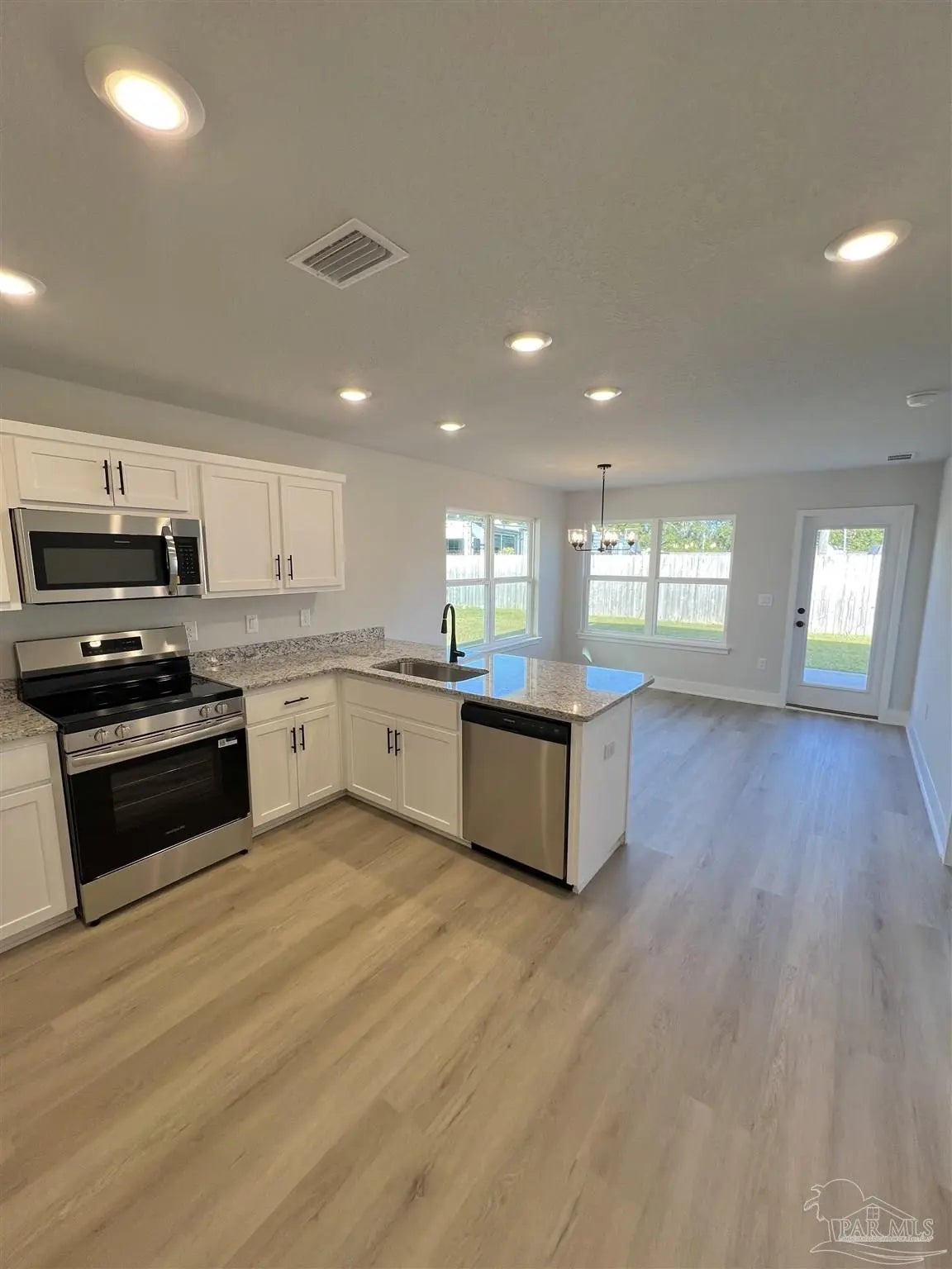 Here you will find the 1317 square foot 3 bedroom 2 bath home. Upon entering the home, you will notice that there is vinyl plank flooring throughout the entire home. The living room is spacious and has a ceiling fan as well as a closet for household items. Exiting from the living room, you enter into the kitchen at the back of the home. Within the kitchen, you have beautiful granite counter tops and stainless steel appliances. There is a counter height bar for additional seating and makes entertaining easy while cooking in the kitchen. The dining area is part of the kitchen and is separated by the counter height bar. In the dining area, you have a single French door that leads onto a patio that is perfect for grilling or star gazing on one of those clear Florida evenings. The master bedroom is off of the dining area with a tray ceiling, ceiling fan and contains a walk-in closet. The master bath has double sinks with granite counter tops and has a walk in shower. The additional two bedrooms are ample size and share a bath within their hall way. The hall bath has a single sink and shower/ tub combo. There is an inside laundry room within the hall and a linen closet for additional storage. The double car garage has a garage door opener and attic access. Projected to be complete in March/April. Sample photos shown.