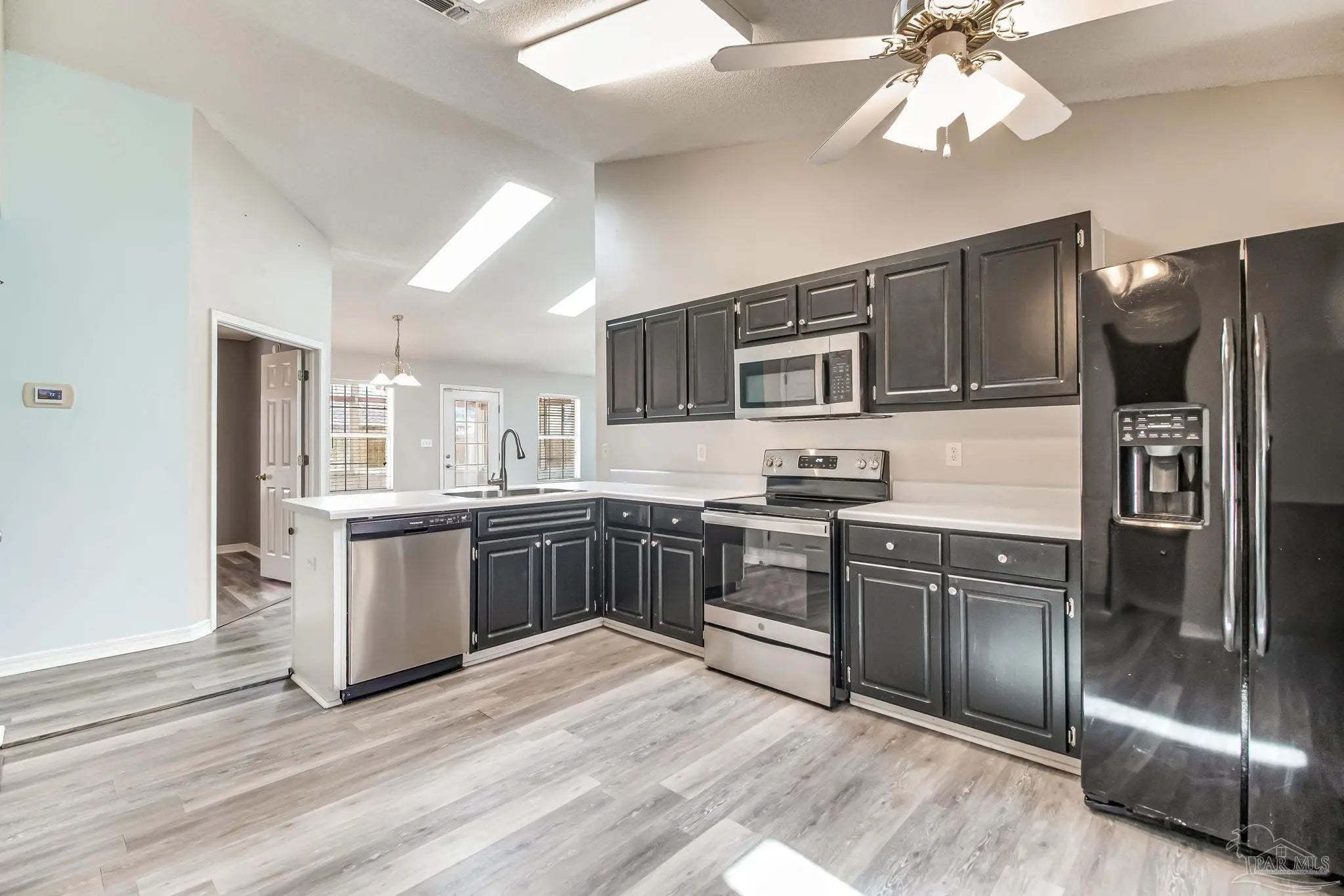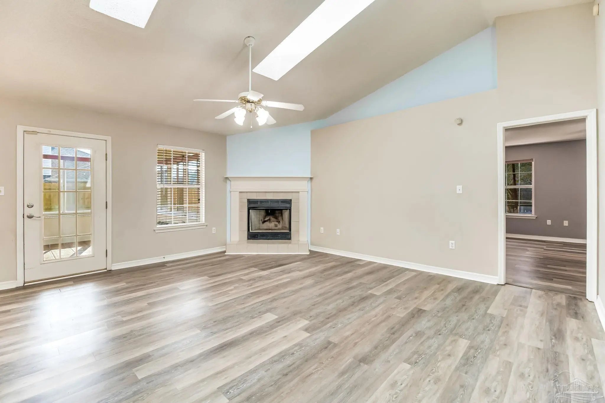 Welcome home! This three bedroom and two bath home offers ample amenities while being close to local attractions such as beaches, shopping and more. Making your way into the private cul-de-sac, you'll note the plantation shutters out front, mature landscaping, and two car garage. Inside, you’ll find a bright, open living area with plenty of natural light and a seamless flow into the dining space and kitchen. The living area provides vaulted ceilings, skylights, and a fireplace with hearth with wood look LVP flooring throughout. The kitchen offers generous counter space, ample cabinetry, and a practical layout ideal for everyday cooking or entertaining. All three bedrooms are comfortably sized, with the primary suite featuring its own private bath and a spacious closet. Out back, you are provided with a large sun room that is perfect for additional entertaining space. The home also features a fully fence yard, storage shed out back, and so much more!