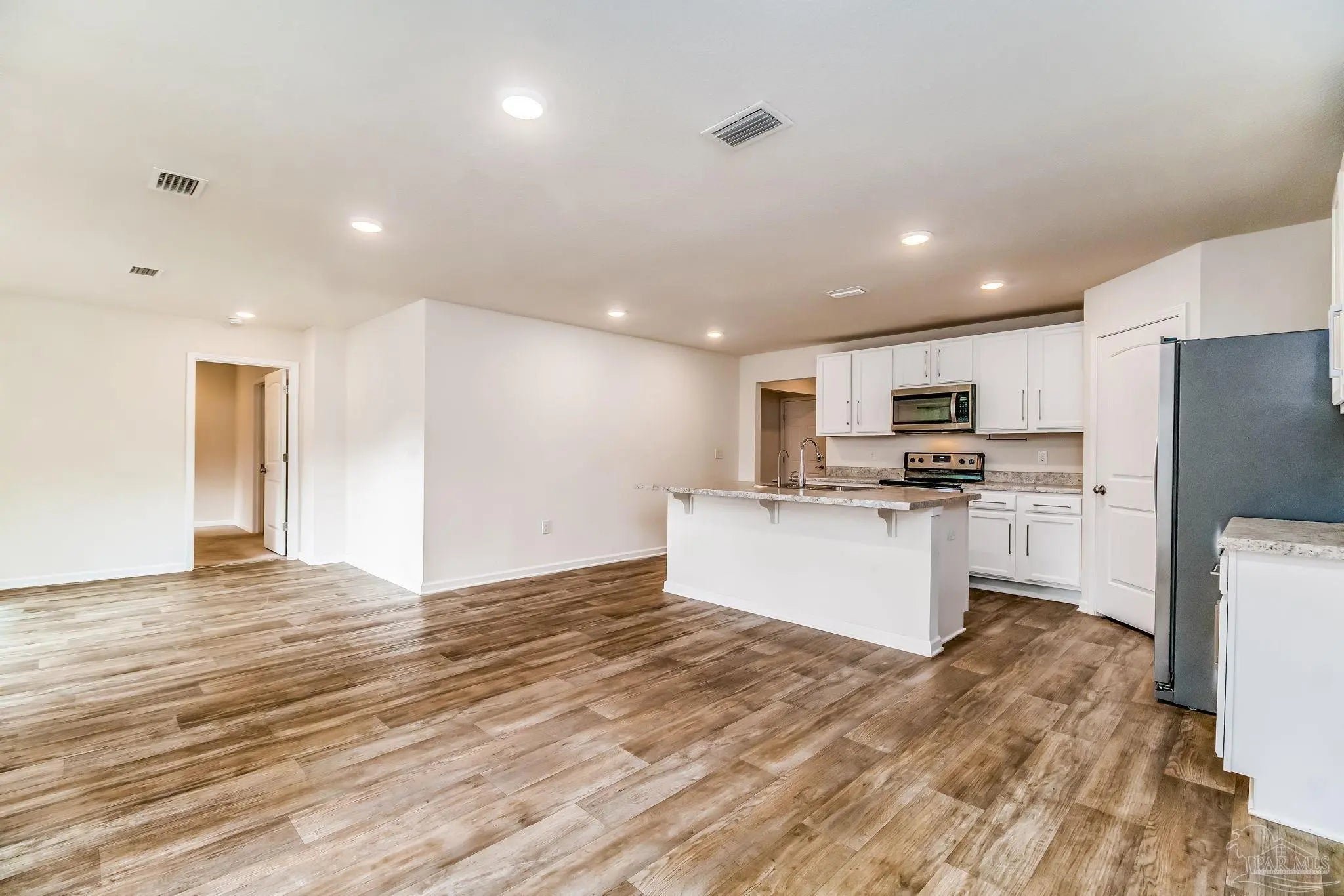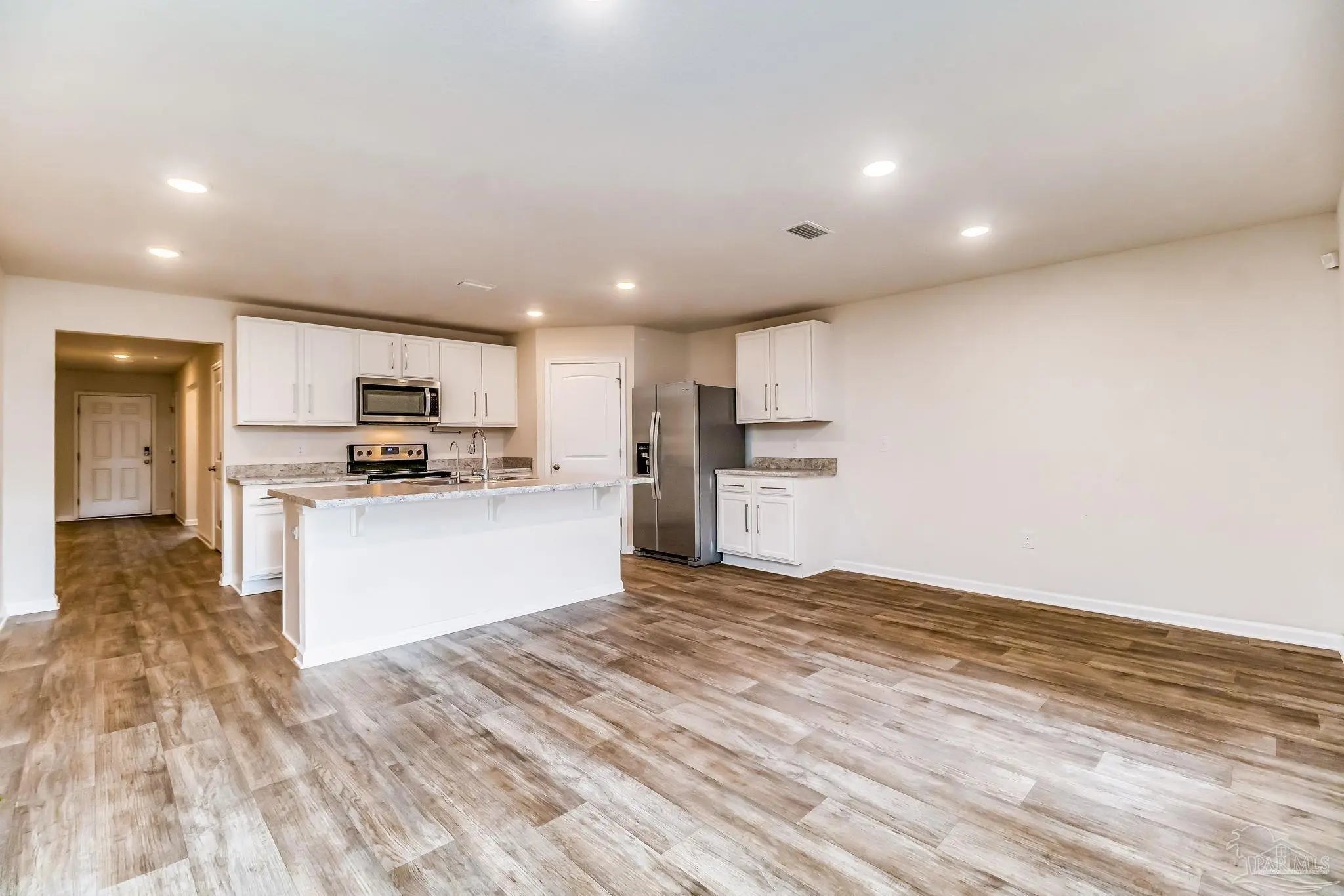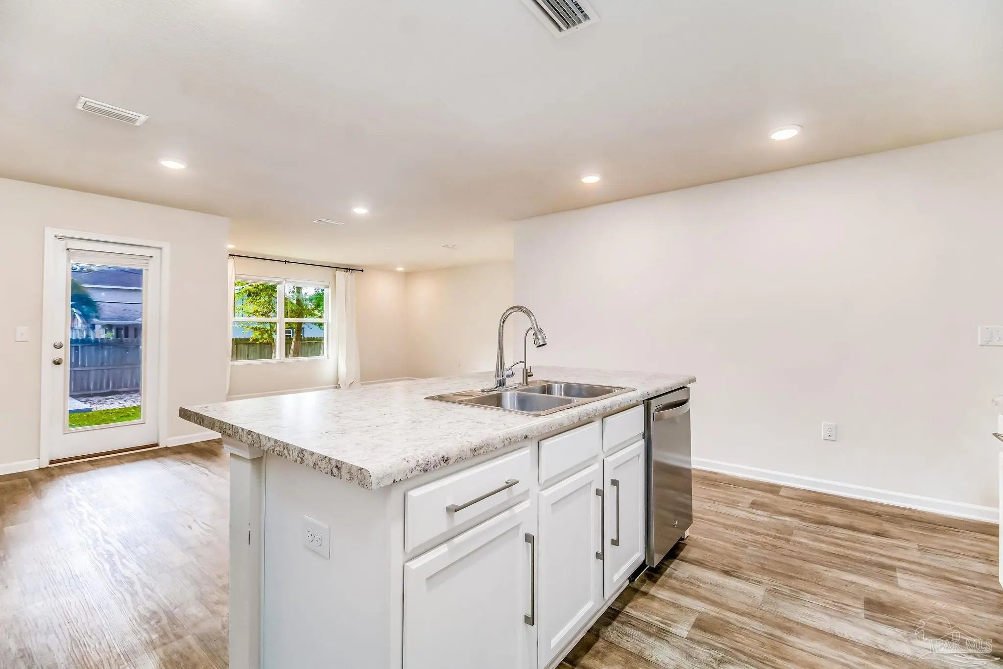 Welcome to this IMMACULATE 4-bedroom, 2-bath floorplan in desirable Ashland Heights! From the moment you step inside, you’ll notice the beautiful wood-look vinyl flooring throughout the main living areas, complemented by plush wall-to-wall carpet in the bedrooms for added comfort. Two generously sized bedrooms are thoughtfully positioned on one side of the home with a full bathroom conveniently located between them. On the opposite side, you’ll find a third bedroom and a dedicated laundry room, offering privacy and functionality for today’s lifestyle. The heart of the home features a bright, open-concept layout where the kitchen seamlessly flows into the dining and living areas—perfect for entertaining or everyday living. The kitchen is sure to impress with white shaker cabinets, stainless steel appliances, abundant cabinet space, a pantry, and a large island ideal for meal prep and gatherings. Tucked just off the living area, the spacious primary suite easily accommodates a king-size bed and additional furniture. The ensuite bath boasts double vanities, a walk-in shower, and a HUGE walk-in closet. Additional highlights include upgraded lighting in the garage, providing enhanced visibility and functionality. This home has been meticulously maintained and is truly move-in ready.