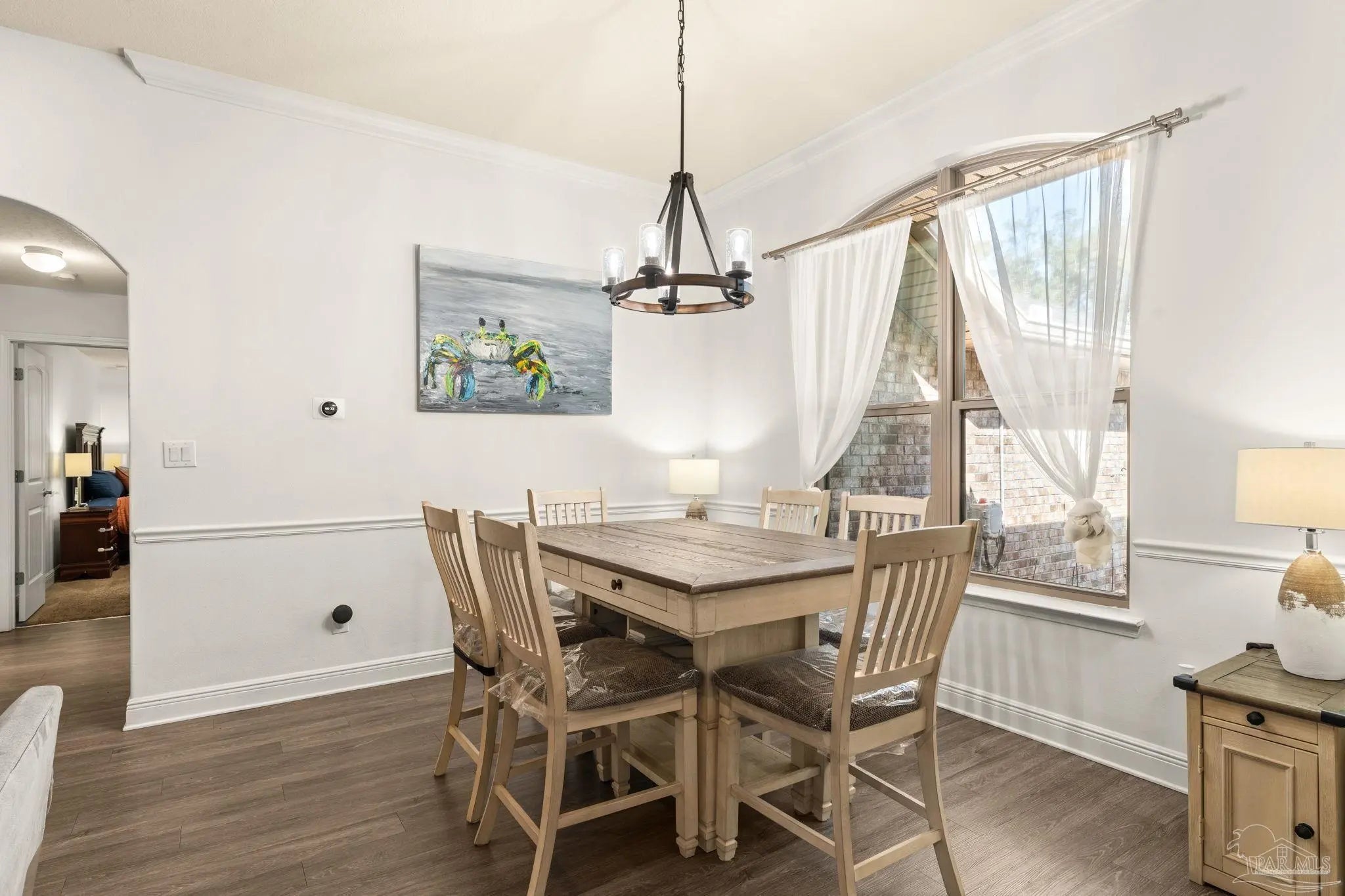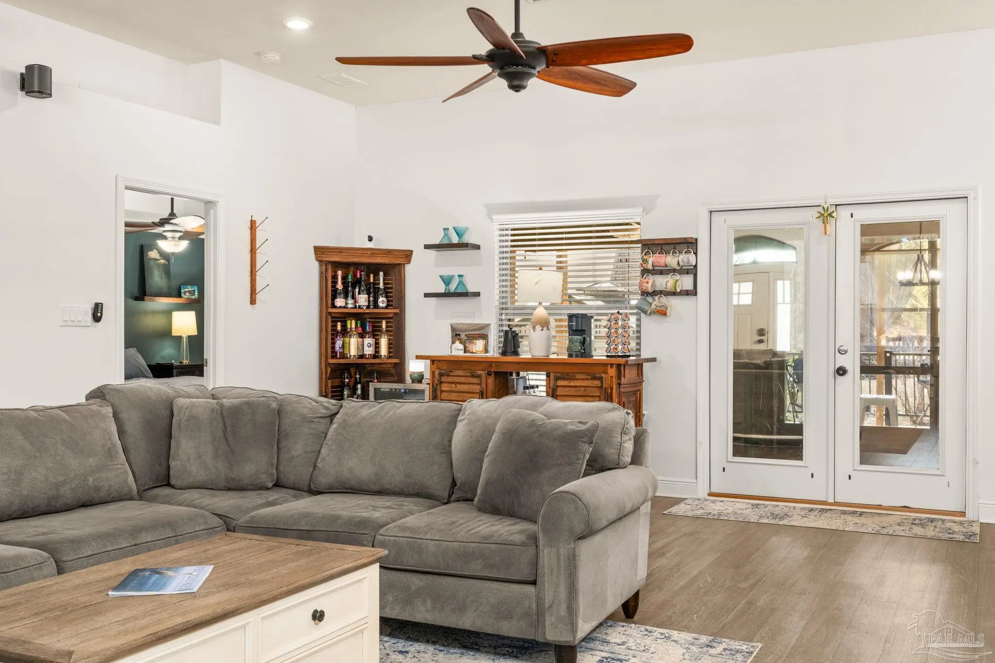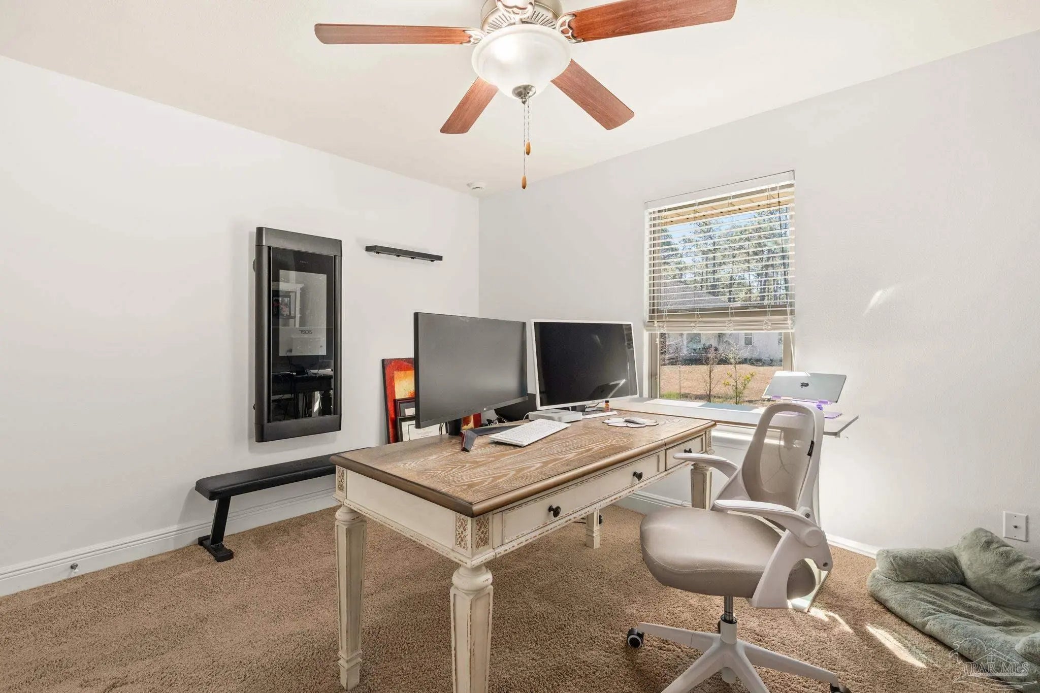 Discover this beautifully maintained all-brick residence situated within the subdivision of Innerarity Island. This inviting home offers a perfect blend of comfort, functionality, and charm, designed for relaxed living and effortless entertaining. Step inside to an open-concept layout featuring a spacious great room and dining area combination, enhanced by a large window that floods the space with natural light. The kitchen is designed with a breakfast bar, newer appliances and a cozy breakfast nook, creating the perfect flow for gatherings or casual mornings. This home boasts four bedrooms and three full bathrooms, plus a hidden bonus/media room cleverly tucked behind a custom built-in bookshelf — an ideal space for movie nights or a quiet retreat. The split floorplan ensures privacy, with the primary suite situated on the east side of the home. This serene retreat features dual closets and a bathroom complete with a double vanity, floor-to-ceiling tiled shower, private water closet, and a large linen closet. On the opposite side of the home, you’ll find two guest bedrooms and a fully remodeled bathroom showcasing a new tub with tiled surround, updated mirrors, and modern lighting. The fourth bedroom is located on the opposite side of the kitchen and offers its own ensuite bathroom, making it perfect for guests, multi-generational living, or a private office. The home also offers a three-car garage providing ample storage and parking- enhanced with a 50 amp plug for an RV and a 30 amp drop for an electric vehicle charger. The property is partially fenced along the front, the yard is equipped with transfer switch for a generator, zoned irrigation, and landscaped accented with fruit trees and hummingbird friendly plants. A charming gazebo provides the perfect spot to unwind by the fire, while the green space behind the property offers additional fruit trees planted and an easy path to your welcoming neighbor.