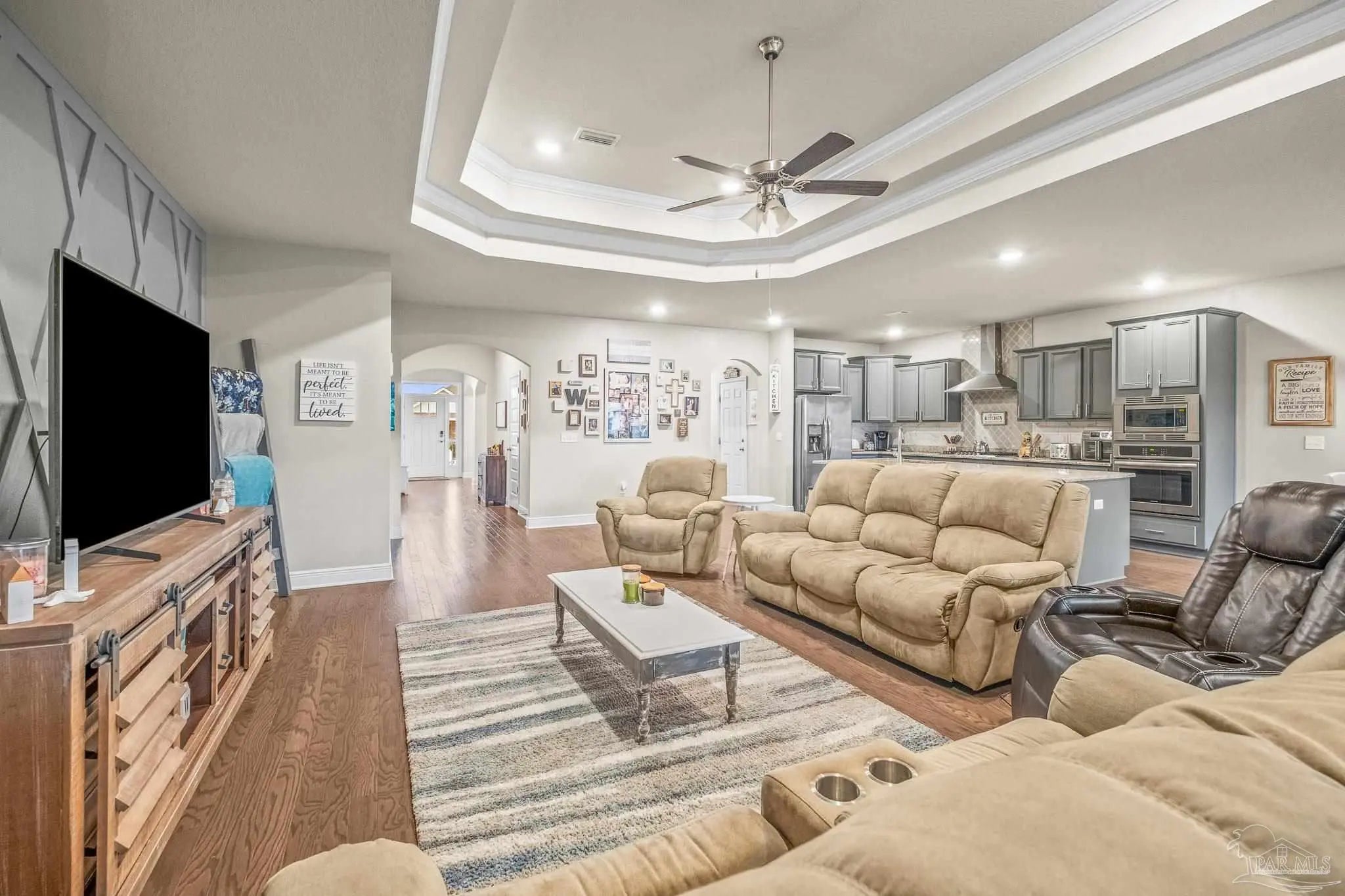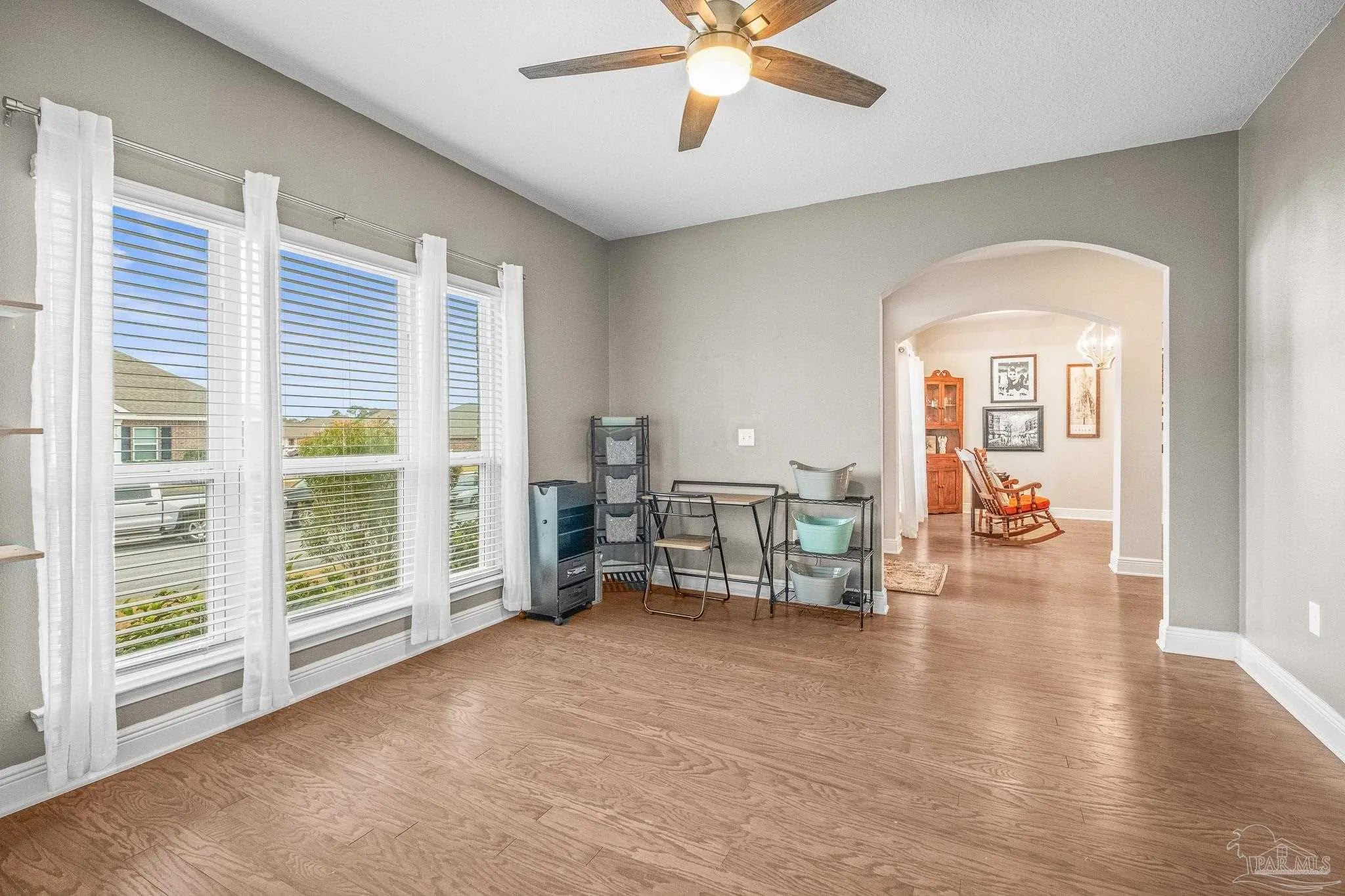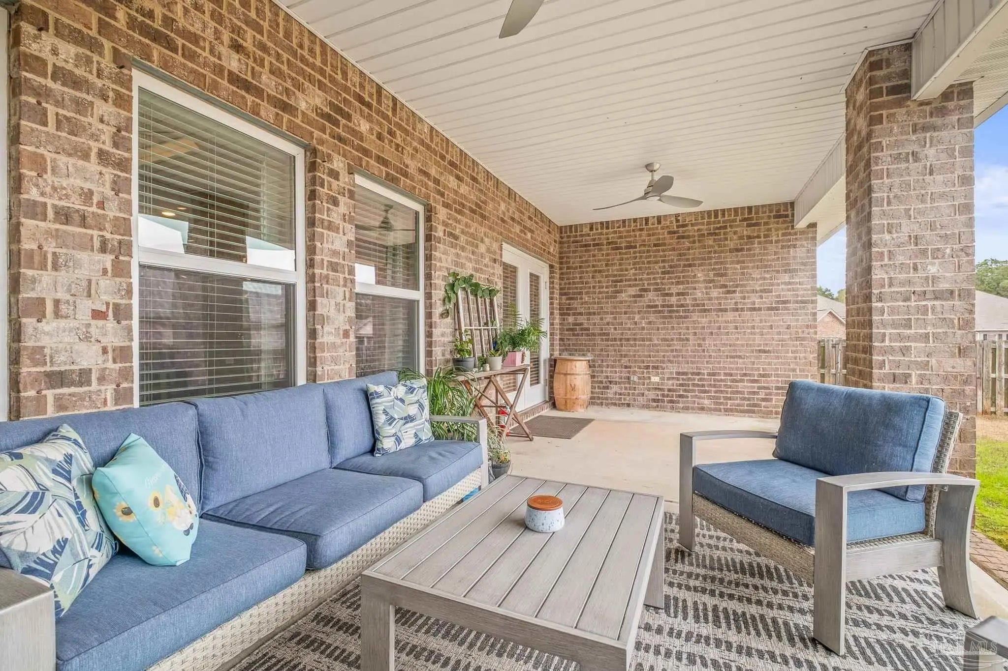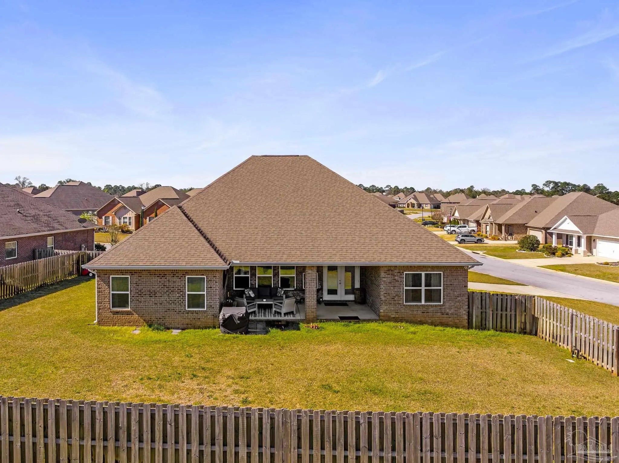 Set in a desirable gated community with secure entrances and a community swimming pool, this McKenzie floor plan offers 5 bedrooms and 3 bathrooms with 9 foot ceilings and a spacious open concept layout. The kitchen, dining, and family room flow seamlessly, accented by crown molding and trey ceilings in the dining room, foyer, and primary suite. The primary suite features a tiled shower with a built in bench, a separate garden tub, and a large walk in closet. Additional bedrooms are positioned in private alcoves, providing flexibility for guest rooms, home offices, or multi generational living. A front facing study with a large window offers an ideal work from home space. Energy efficient features include an electric 50 gallon water heater and HVAC system. The home includes Frigidaire stainless steel appliances, Moen faucets, ceiling fans in the family room and primary bedroom, a garage door opener, granite countertops throughout, and hardwood flooring in the foyer, kitchen, dining, living room, and hallways. An oversized 11x23 covered back porch is perfect for entertaining or relaxing. Conveniently located two miles from the Perdido River Boat Ramp and three miles from Navy Federal Headquarters. Hurricane window protection and a ten year structural warranty provide added peace of mind.