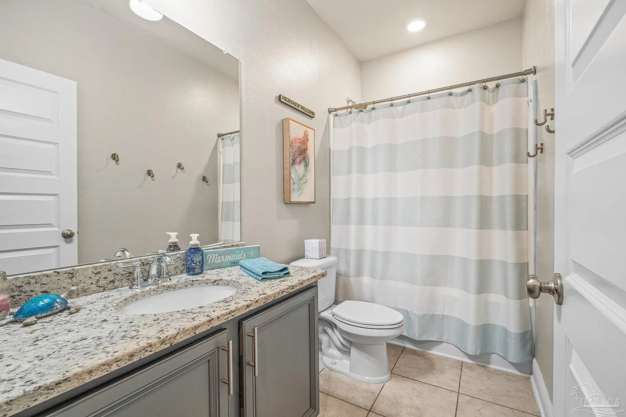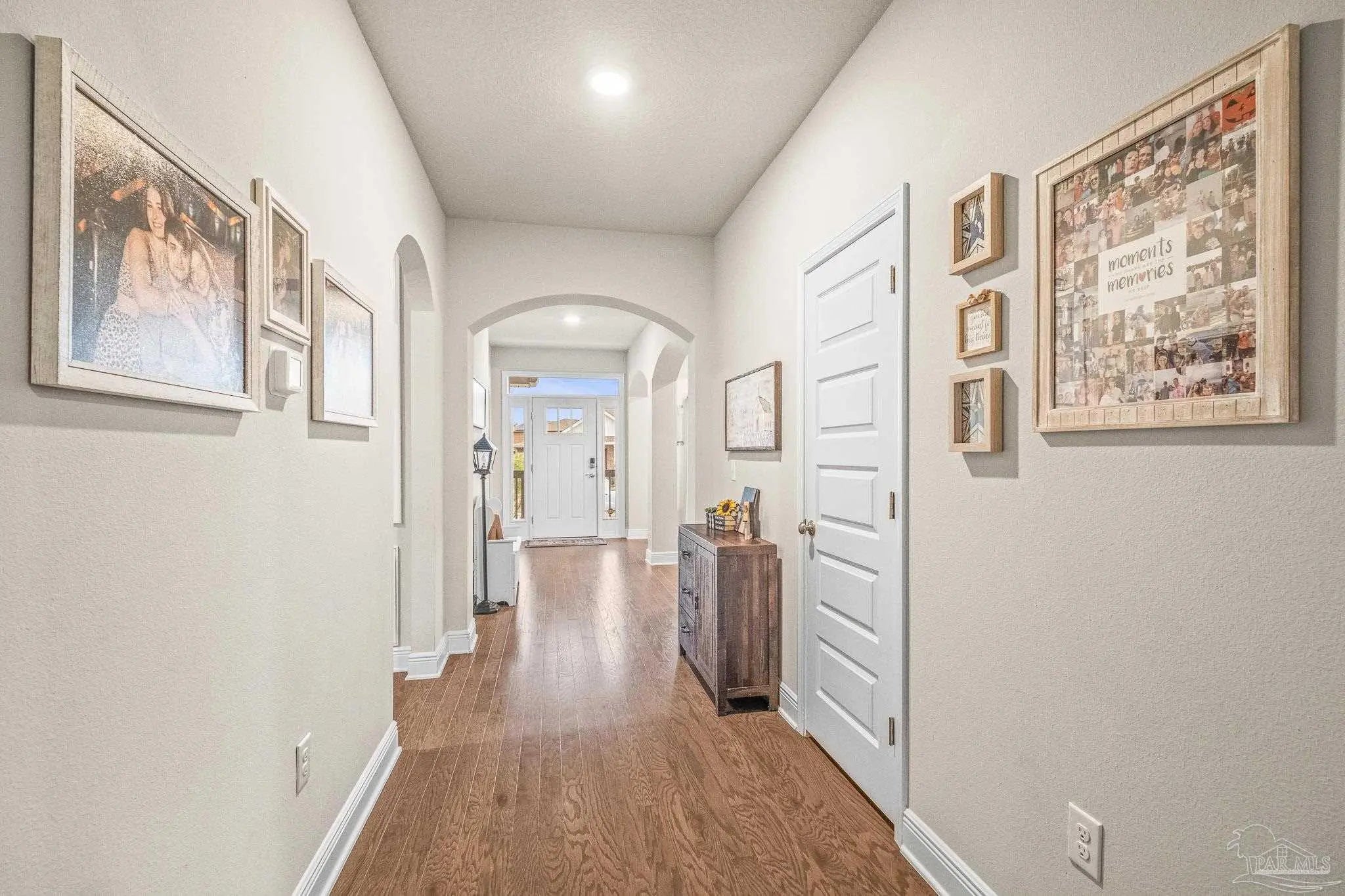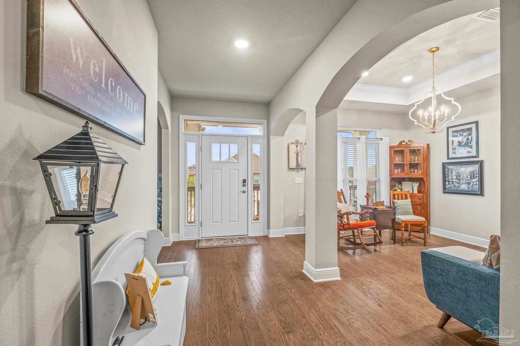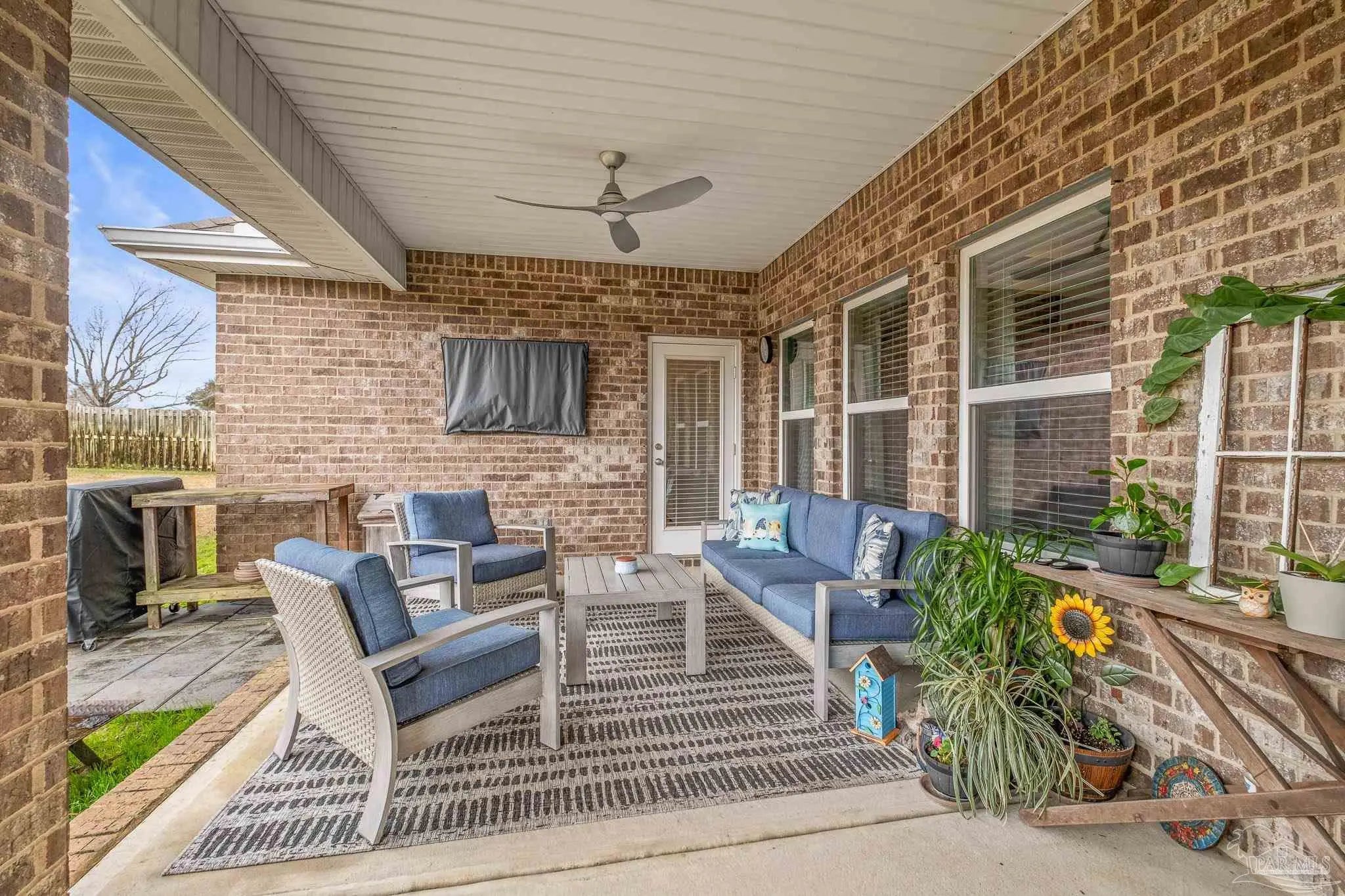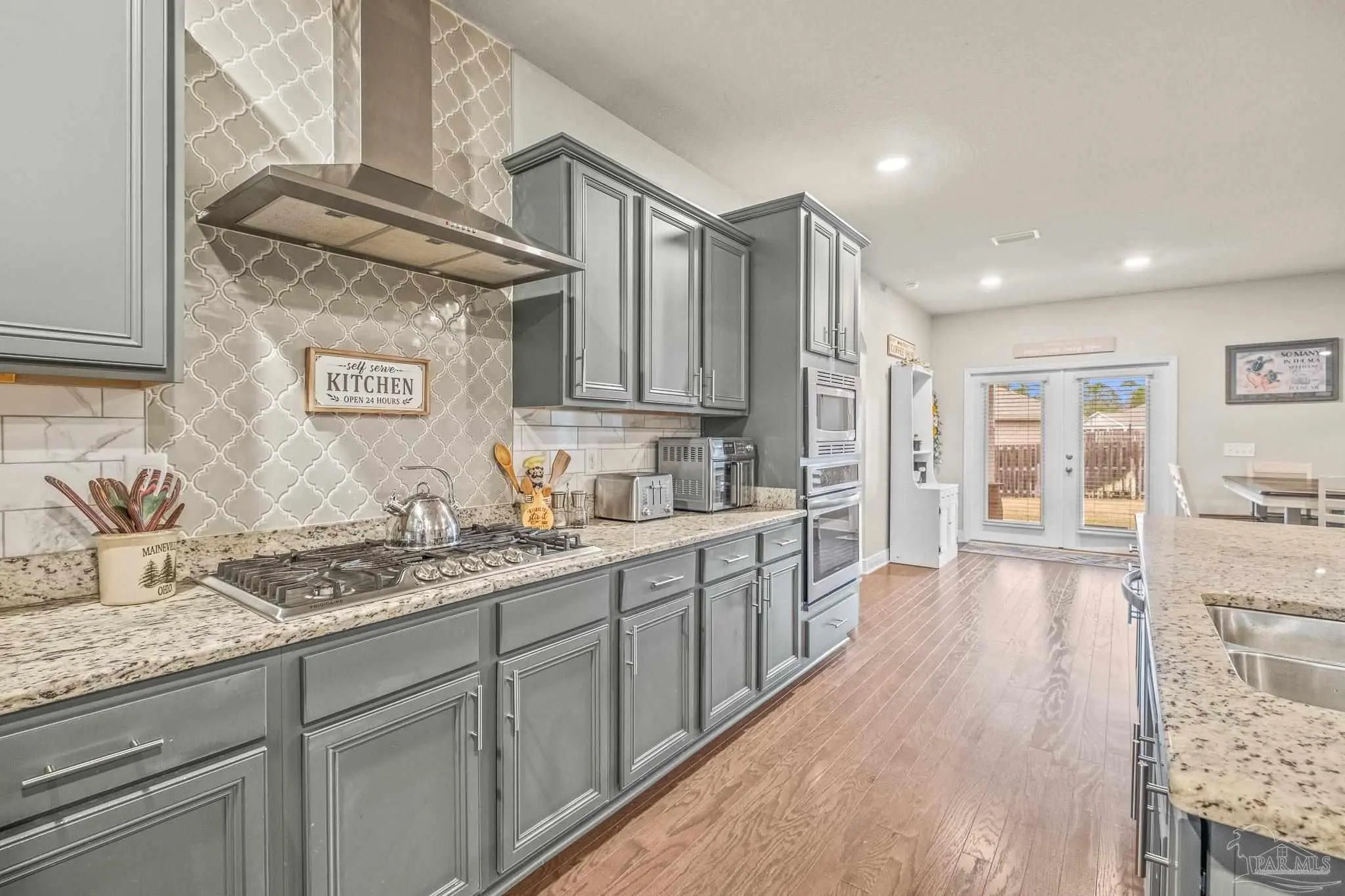 Set in a desirable gated community with secure entrances and a community swimming pool, this McKenzie floor plan offers 5 bedrooms and 3 bathrooms with 9 foot ceilings and a spacious open concept layout. The kitchen, dining, and family room flow seamlessly, accented by crown molding and trey ceilings in the dining room, foyer, and primary suite. The primary suite features a tiled shower with a built in bench, a separate garden tub, and a large walk in closet. Additional bedrooms are positioned in private alcoves, providing flexibility for guest rooms, home offices, or multi generational living. A front facing study with a large window offers an ideal work from home space. Energy efficient features include an electric 50 gallon water heater and HVAC system. The home includes Frigidaire stainless steel appliances, Moen faucets, ceiling fans in the family room and primary bedroom, a garage door opener, granite countertops throughout, and hardwood flooring in the foyer, kitchen, dining, living room, and hallways. An oversized 11x23 covered back porch is perfect for entertaining or relaxing. Conveniently located two miles from the Perdido River Boat Ramp and three miles from Navy Federal Headquarters. Hurricane window protection and a ten year structural warranty provide added peace of mind.