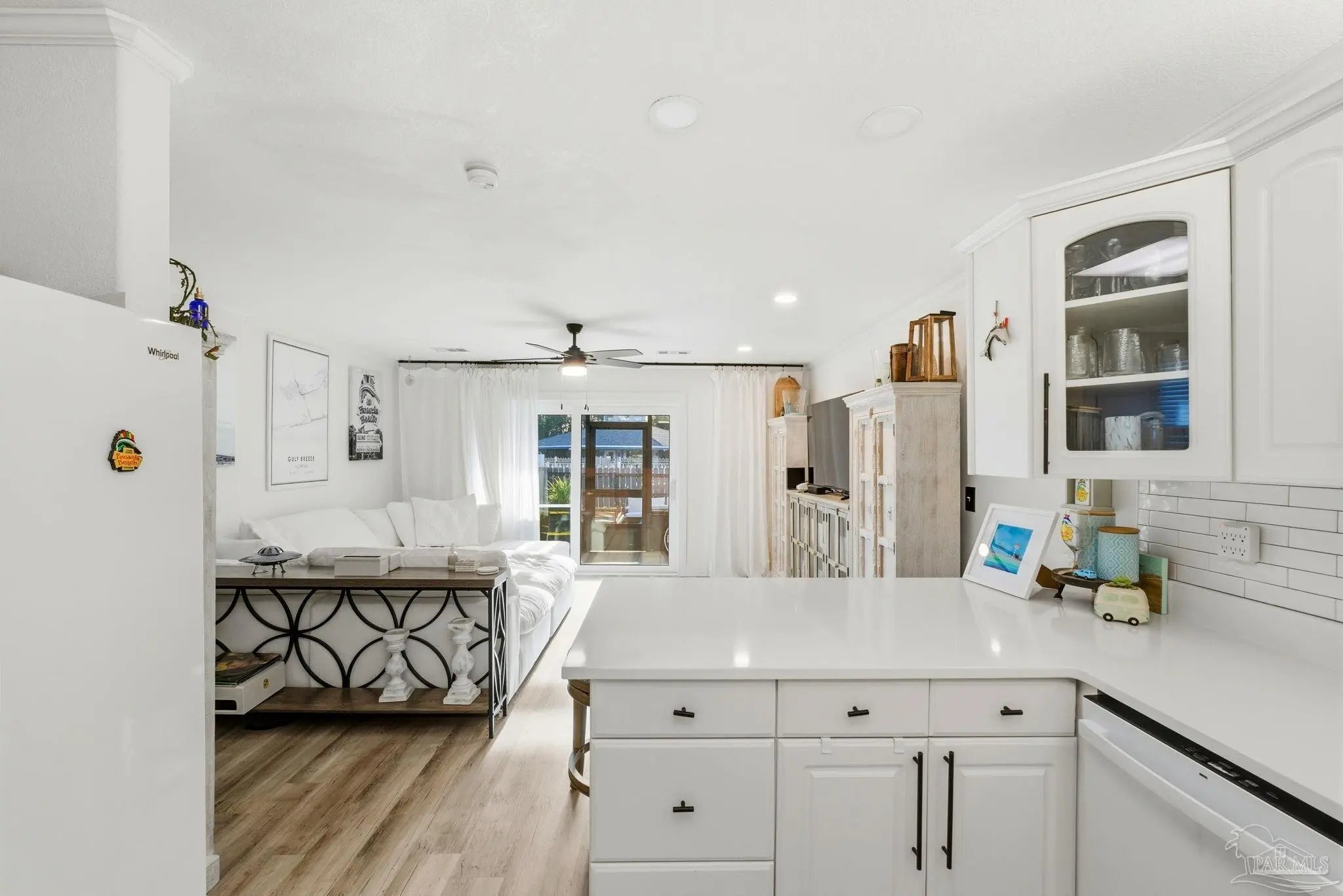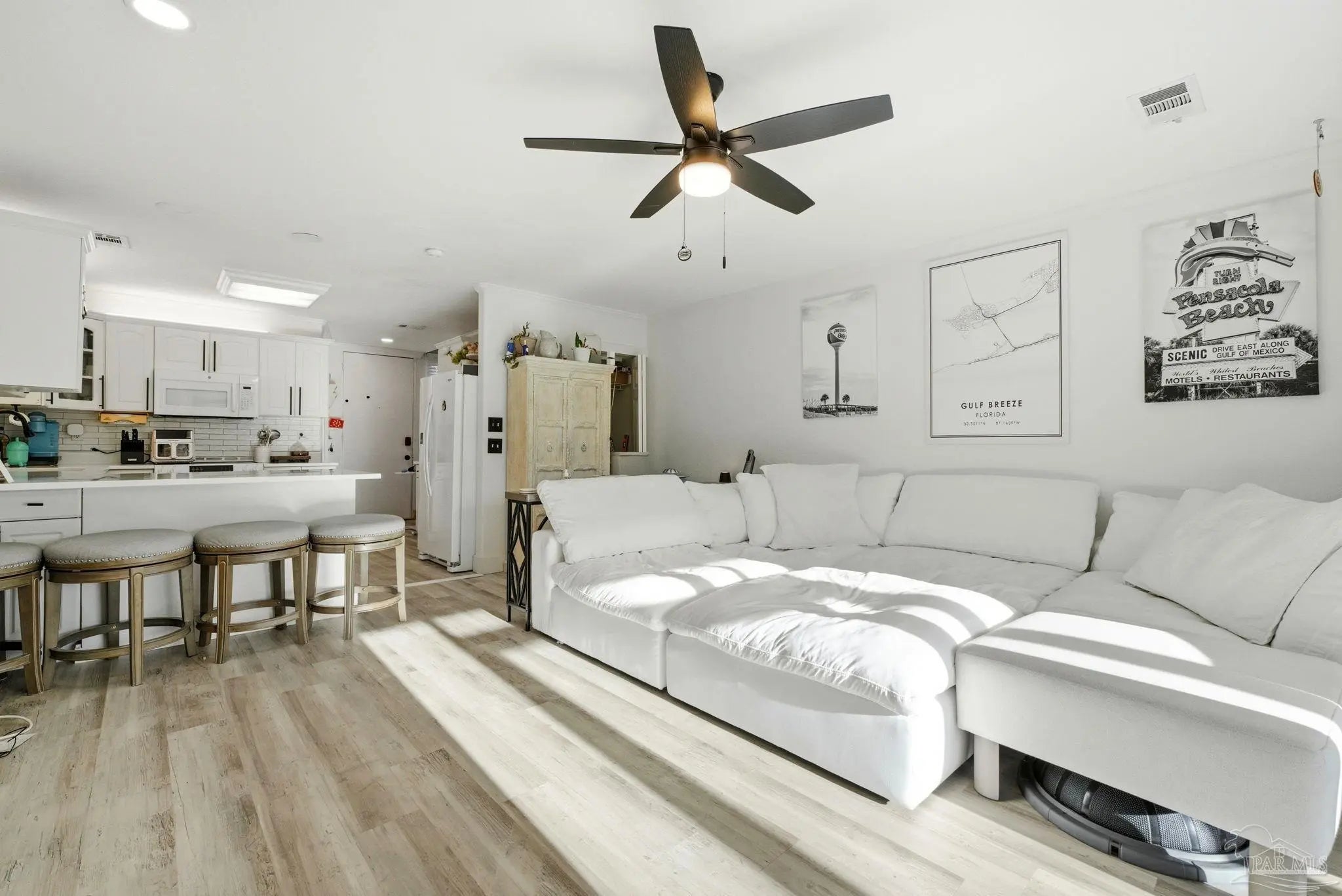You have not seen a Bahama Bay condo like this! From top to bottom, this stunning residence has been thoughtfully remodeled and reimagined to maximize every inch of space. The ceiling has been upgraded from the typical drop style to a finished ceiling featuring recessed lighting and elegant crown molding, immediately elevating the look and feel of the home. The kitchen has been expanded to enhance functionality and flow, showcasing quartz countertops and durable vinyl plank flooring that continues throughout. One of the standout features of this condo is the rare offering of two full bathrooms rather than the traditional one-and-a-half with a new walk-in shower. Upstairs the rooms are spacious and filled with natural light from the new windows. The full bathroom includes dual access, allowing for privacy and flexibility. Ideally located, this unit offers direct back access to the pool and community room and is complete with a screened area and charming paver courtyard, making it the perfect blend of style, function, and location. Pensacola Beach is just over the bridge!