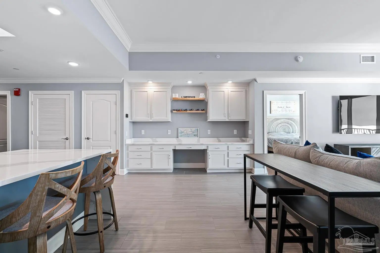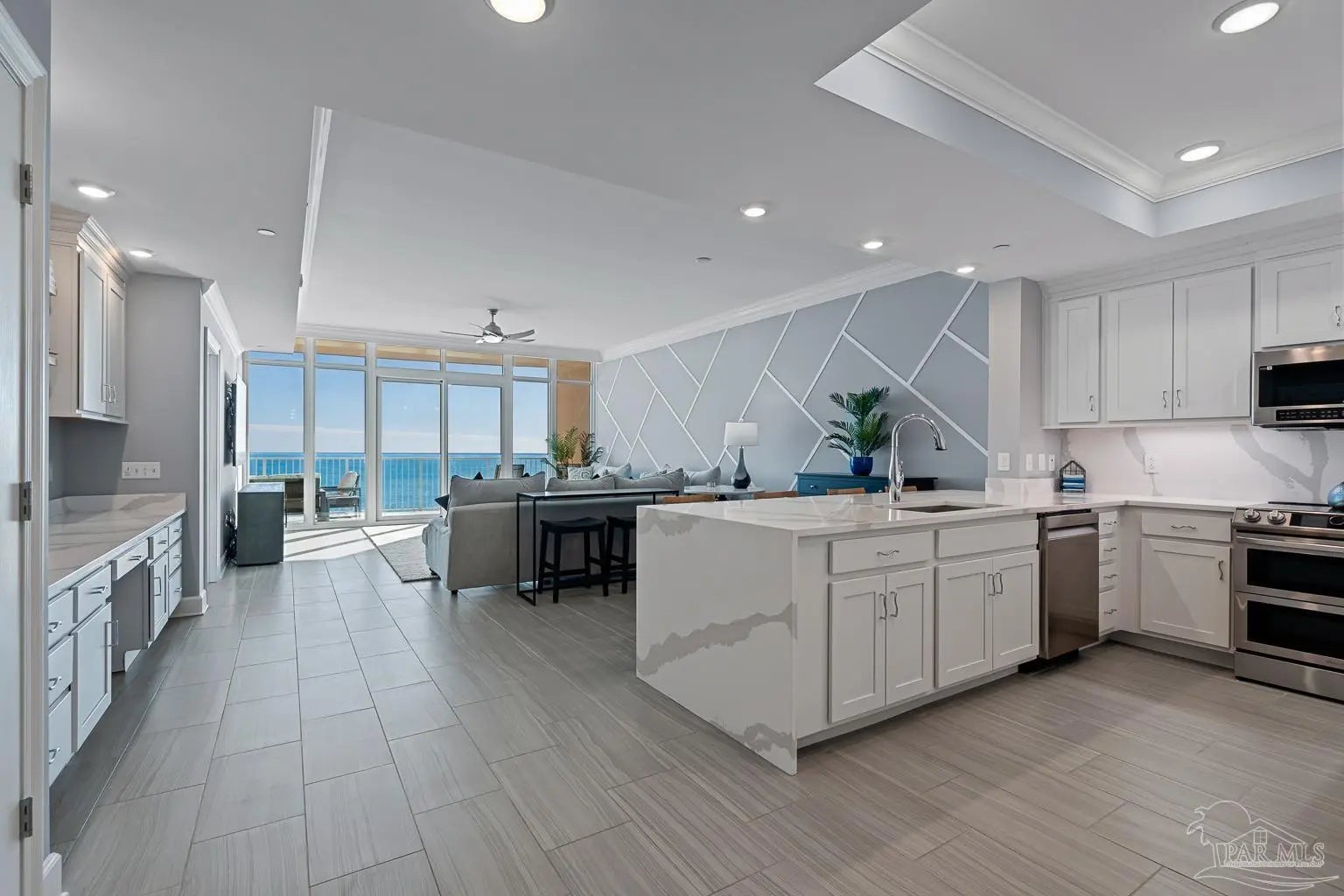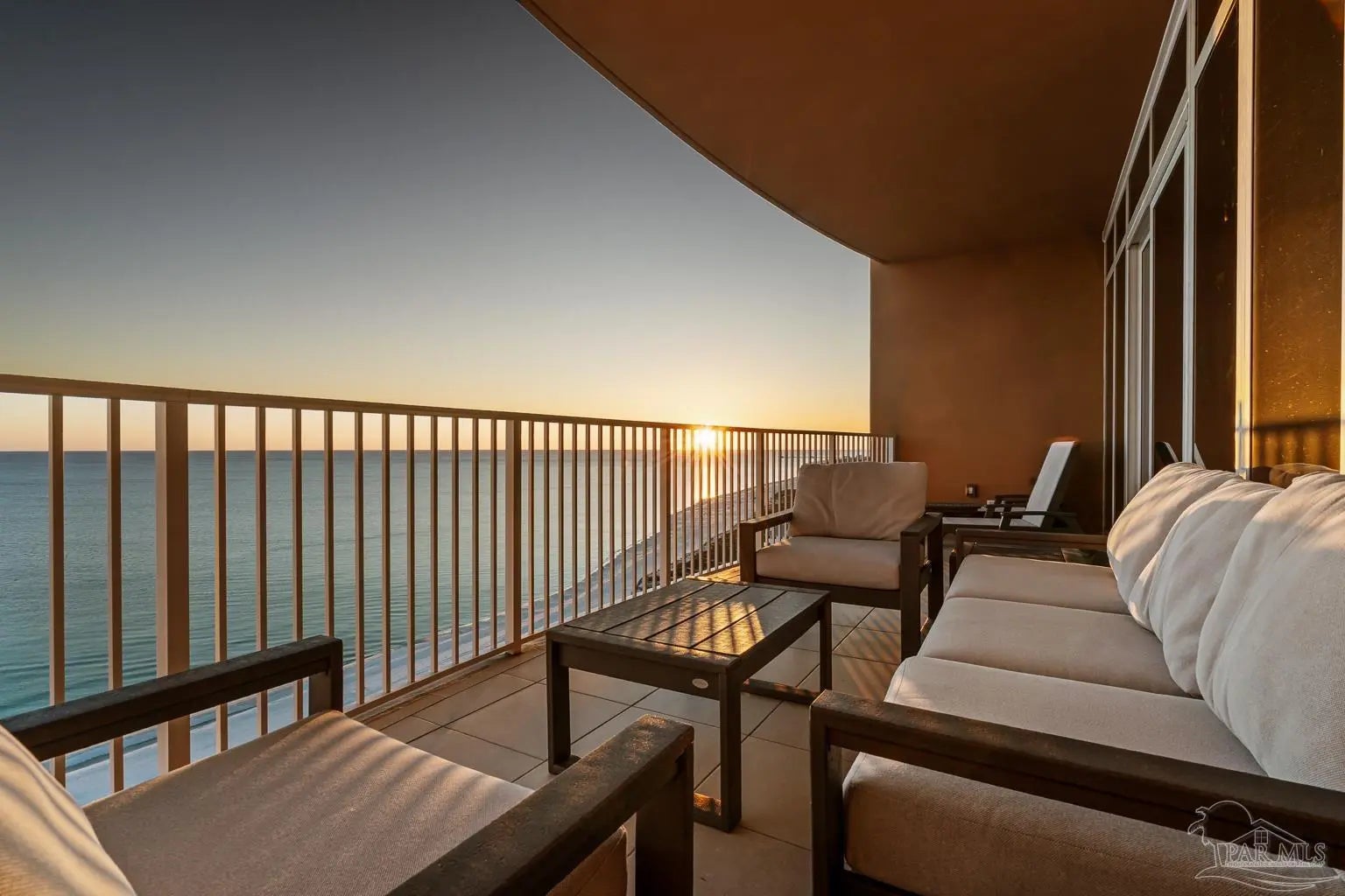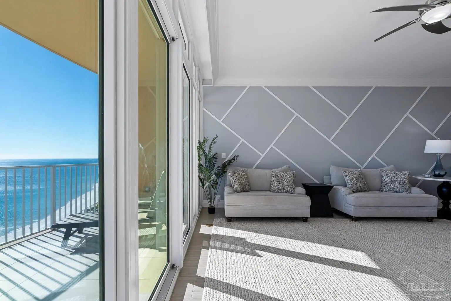 Phoenix Gulf Towers 1803 is a fully reimagined residence that blends thoughtful design and premium finishes with an irreplaceable, unobstructed west-facing sunset view. With over $120K in upgrades at the time of construction in 2023, every inch of this condo has been refined for quality, longevity, and elegance, including a striking geometric accent wall spanning the entire living room, which adds architectural interest and a designer focal point. The spacious floor plan sleeps 8–10, with a king bed in the primary suite, two queens in one guest room, and a full bed plus queen sleeper loveseat in the other guest room, ideal for year-round living or use as a second home or rental investment. Plank porcelain tile flooring throughout is complemented by solid wood doors and soft-close cabinetry. Silestone quartz countertops are found in the kitchen, bathrooms, and the built-in desk, accented by a full-height quartz kitchen backsplash and waterfall edge. The kitchen has smart appliances with induction range, double oven, stainless undermount sink, under-cabinet and recessed lighting, and custom counter-height breakfast bar with hidden supports. Bathrooms feature a redesigned primary layout, custom showers, comfort-height skirted toilets, high-end fixtures, and pocket doors. Additional highlights include an HVAC with built-in dehumidifier, surround sound pre-wiring, ethernet/USB outlets, recessed lighting, premium ceiling fans, and an owner’s closet near the elevators. Impact-resistant floor-to-ceiling doors lead onto the oversized balcony to experience the true differentiator - an unobstructed, unforgettable evening sunset display that cannot be replicated. Luxury amenities include two outdoor pools with lazy rivers and waterslides, two heated indoor pools, hot tubs, two fitness rooms, and ample covered parking. For buyers seeking an upgraded, never-rented Gulf-front condo with refined architectural details and views that truly set it apart - this residence stands alone.