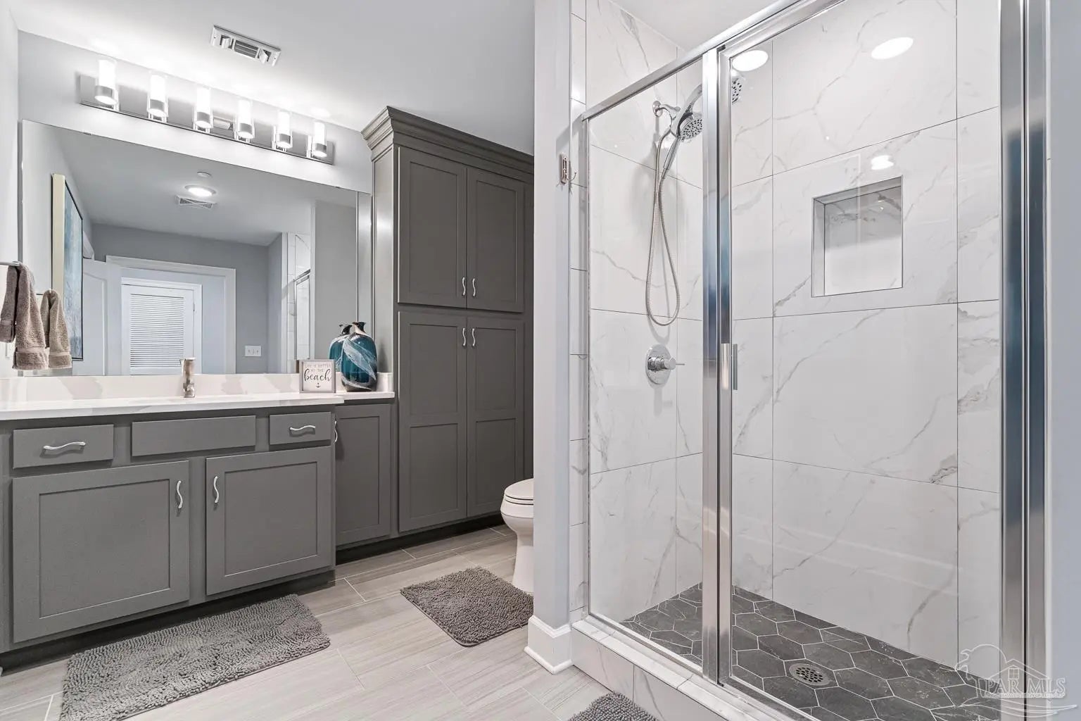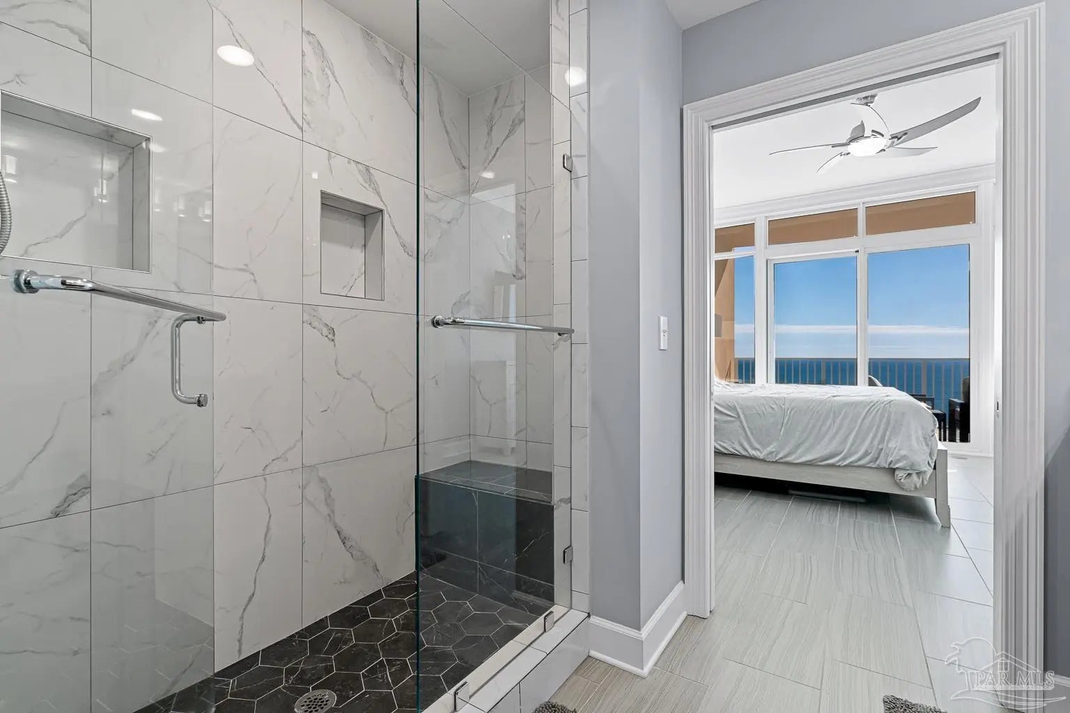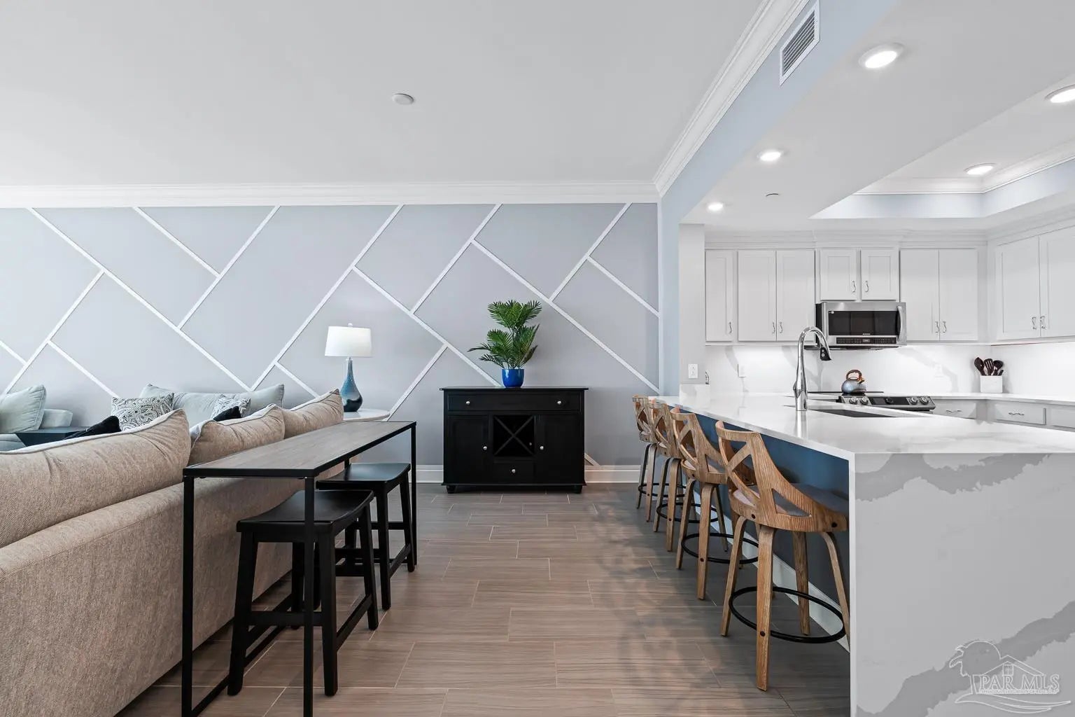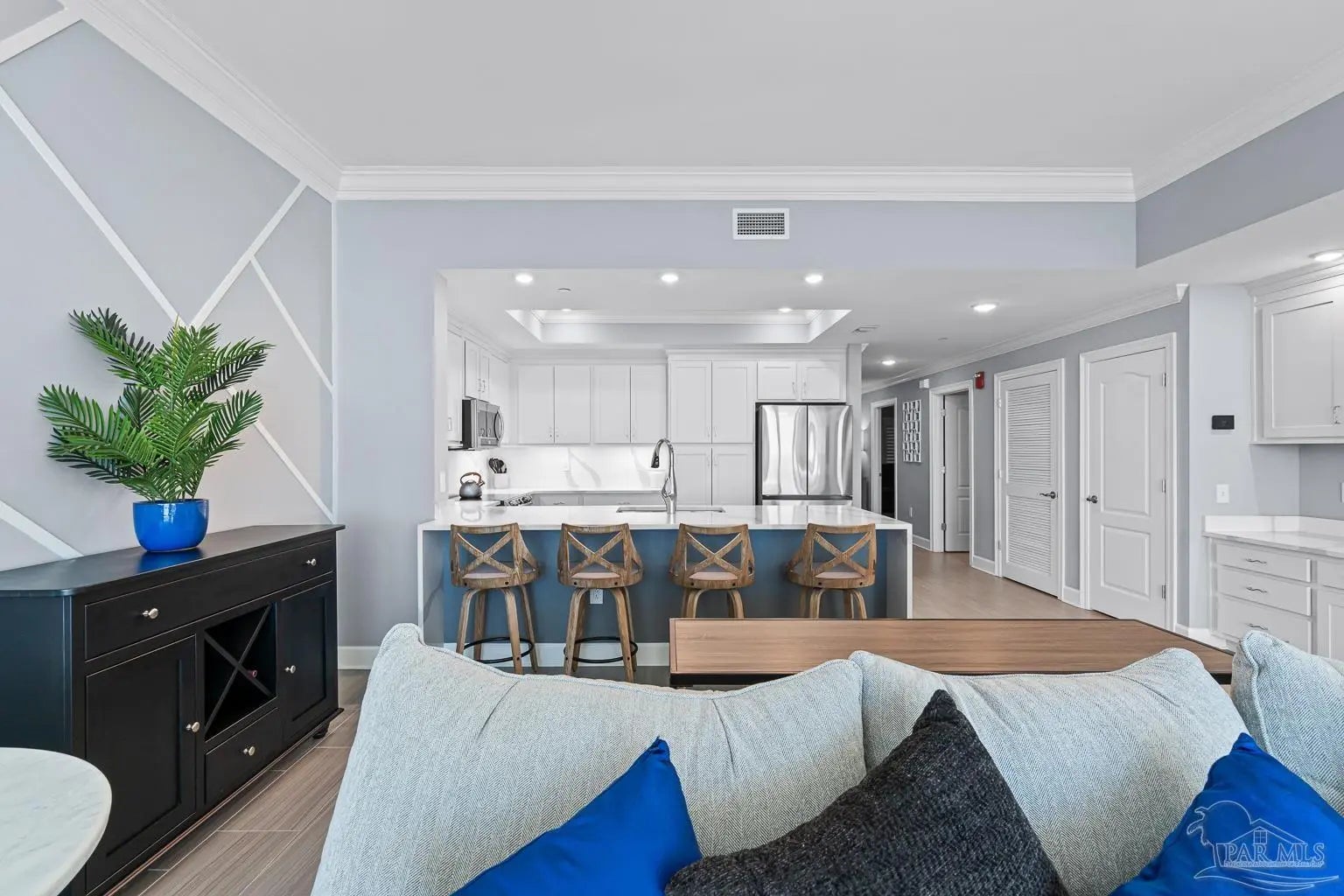Phoenix Gulf Towers 1803 is a fully reimagined residence that blends thoughtful design and premium finishes with an irreplaceable, unobstructed west-facing sunset view. With over $120K in upgrades at the time of construction in 2023, every inch of this condo has been refined for quality, longevity, and elegance, including a striking geometric accent wall spanning the entire living room, which adds architectural interest and a designer focal point. The spacious floor plan sleeps 8–10, with a king bed in the primary suite, two queens in one guest room, and a full bed plus queen sleeper loveseat in the other guest room, ideal for year-round living or use as a second home or rental investment. Plank porcelain tile flooring throughout is complemented by solid wood doors and soft-close cabinetry. Silestone quartz countertops are found in the kitchen, bathrooms, and the built-in desk, accented by a full-height quartz kitchen backsplash and waterfall edge. The kitchen has smart appliances with induction range, double oven, stainless undermount sink, under-cabinet and recessed lighting, and custom counter-height breakfast bar with hidden supports. Bathrooms feature a redesigned primary layout, custom showers, comfort-height skirted toilets, high-end fixtures, and pocket doors. Additional highlights include an HVAC with built-in dehumidifier, surround sound pre-wiring, ethernet/USB outlets, recessed lighting, premium ceiling fans, and an owner’s closet near the elevators. Impact-resistant floor-to-ceiling doors lead onto the oversized balcony to experience the true differentiator - an unobstructed, unforgettable evening sunset display that cannot be replicated. Luxury amenities include two outdoor pools with lazy rivers and waterslides, two heated indoor pools, hot tubs, two fitness rooms, and ample covered parking. For buyers seeking an upgraded, never-rented Gulf-front condo with refined architectural details and views that truly set it apart - this residence stands alone.