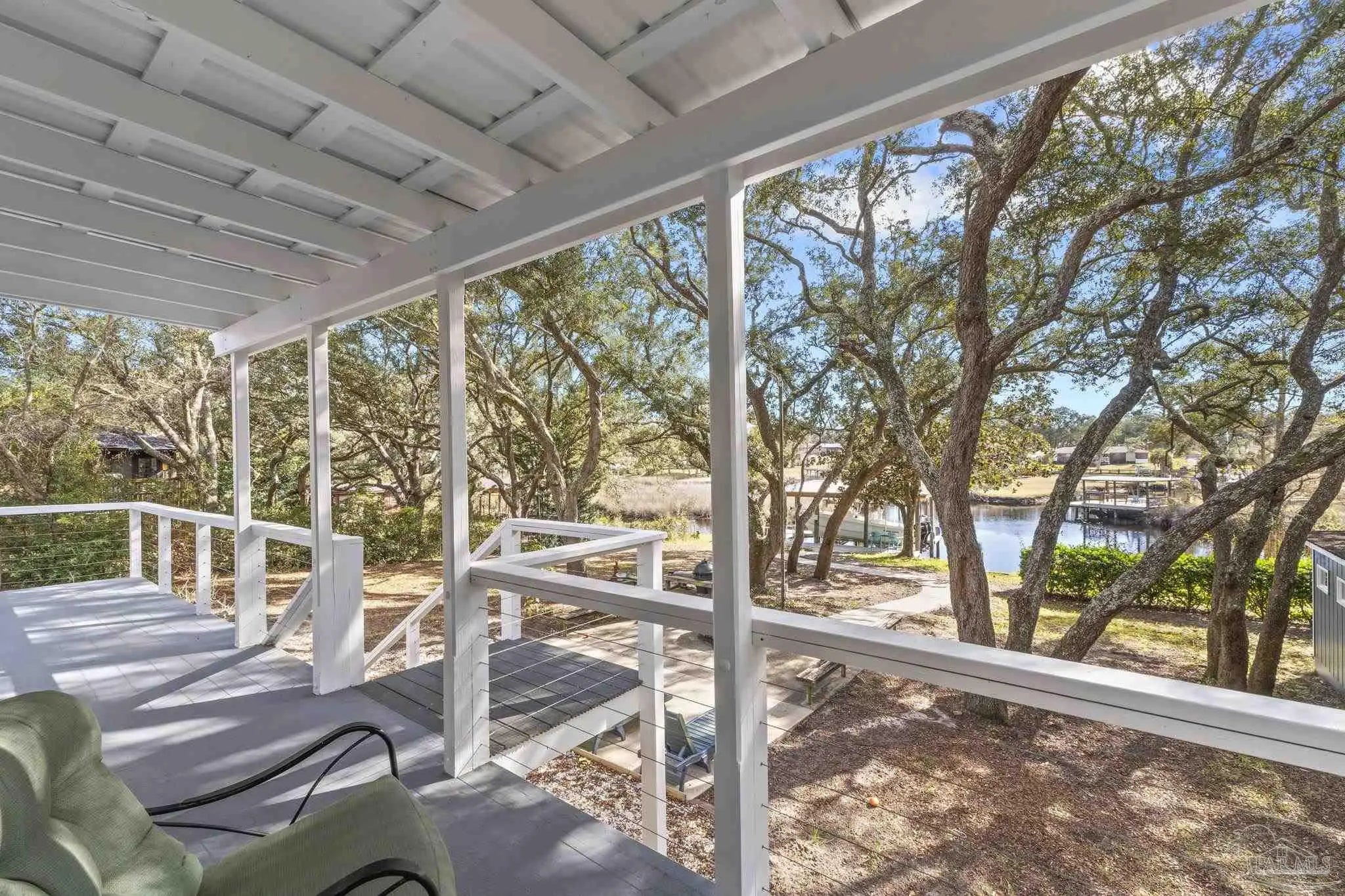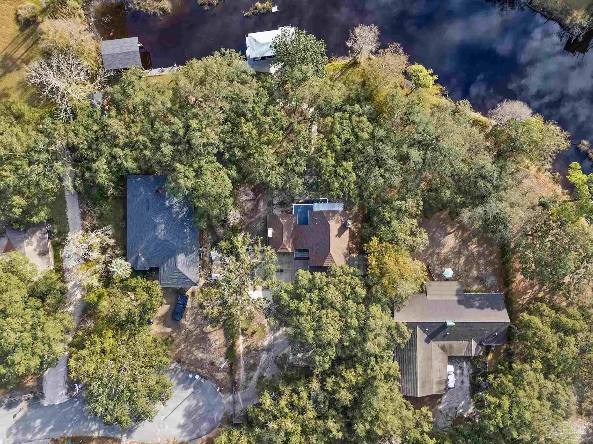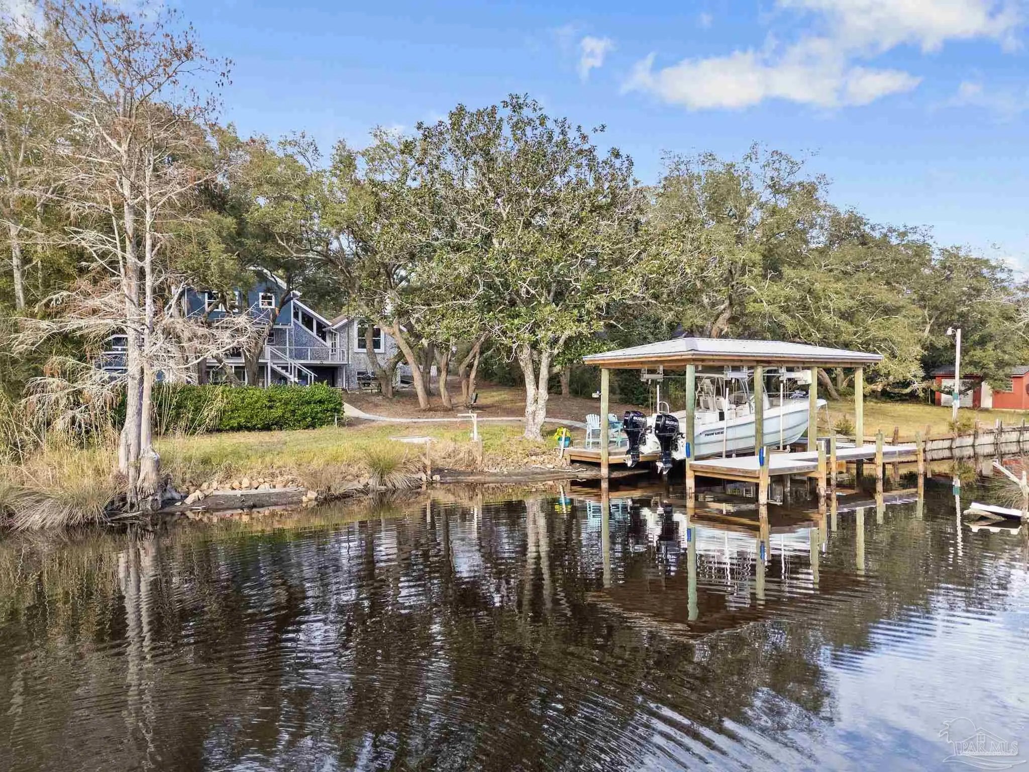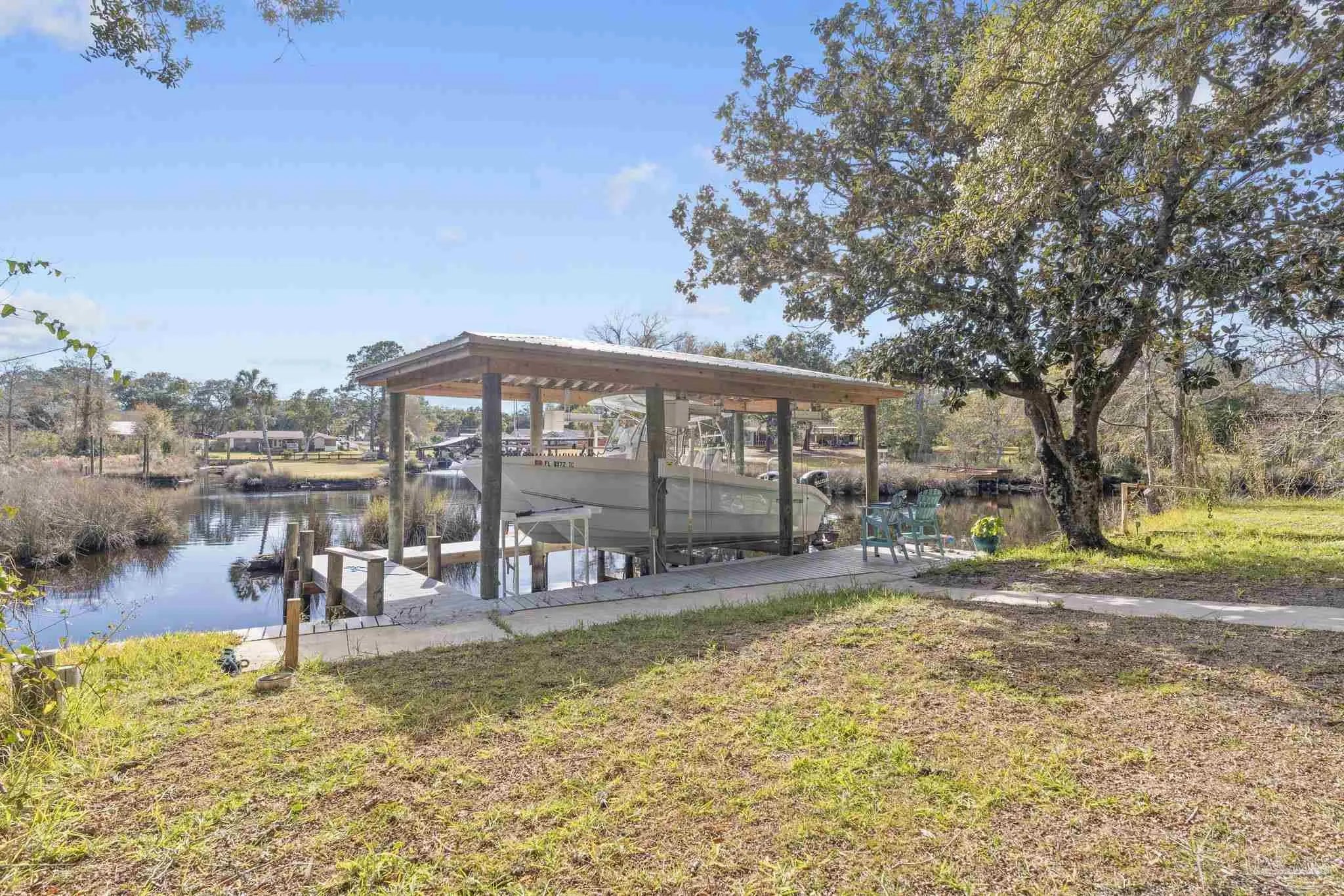 Amazing waterfront home on Weekley Bayou features a boathouse(up to 30’ boat under cover), 13K lb boat lift, jet ski ramp, Sure Step Flow Through Decking, seawall, & fish cleaning station. The gated property’s entryway is to the 2nd floor where you'll find a chef’s kitchen/ dining room combo adorned with custom cabinetry & equipped with large-capacity gas stove, double oven, & center island perfect for meal prep & gatherings with oversized pantry for your storage needs. Breathtaking views of the Bayou from the living room create a serene backdrop for relaxation. This floor also offers a full bath w/walk-in shower plus convenient exterior access & a versatile bonus room-currently a gym-but could be an additional bedroom by adding a closet. On the first floor, you’ll find an expansive guest suite, currently being utilized as a theater room, featuring a luxurious ensuite bath equipped with a tub/shower combo. Adjacent to the guest suite is a versatile bonus room (used as a bedroom). The second kitchen/bar area is a dream for entertainers, featuring a smooth top stove, refrigerator, quartz countertop bar w/sink, & wine fridge. Access to a private entrance makes it an ideal retreat for visitors. The ultimate primary suite is located on the third floor, where luxury meets comfort offering stunning Bayou views. Custom closet w/custom shelving & 4x6 center dressing cabinet. Laundry room conveniently located off the closet. Ensuite bath boasts 2 separate vanities & HUGE walk-in shower w/dual shower heads & rain shower head. This primary suite is designed for relaxation & elegance, making it the perfect sanctuary after a long day. Additional features include: 2025 geo-thermal HVAC system. 2022: impact windows & doors, whole house Generac gas generator, 40’ retaining wall, gutters, 2 mini-splits (first floor), HVAC 3rd floor. 2021: roof, septic tank pumped. Property has 2 capped chimneys & fireplaces walled in. Workshop sold as-is.