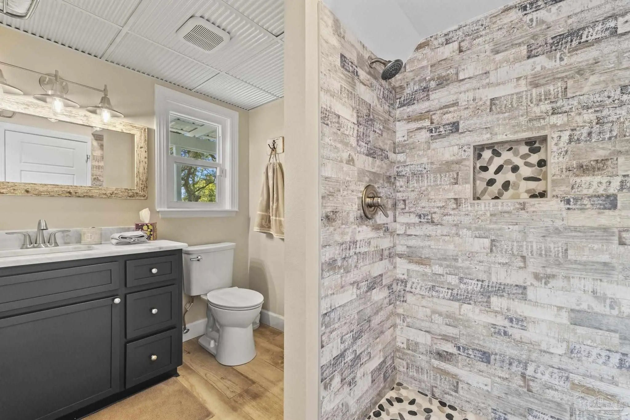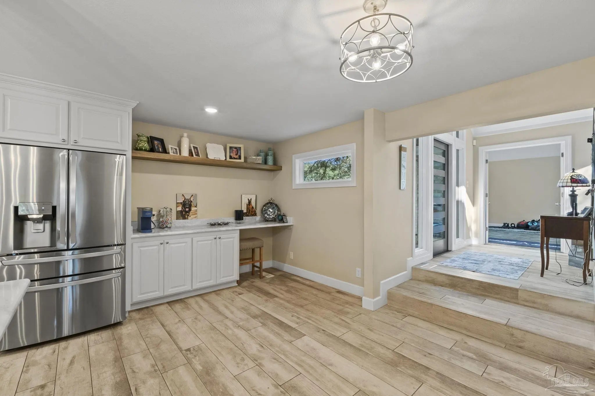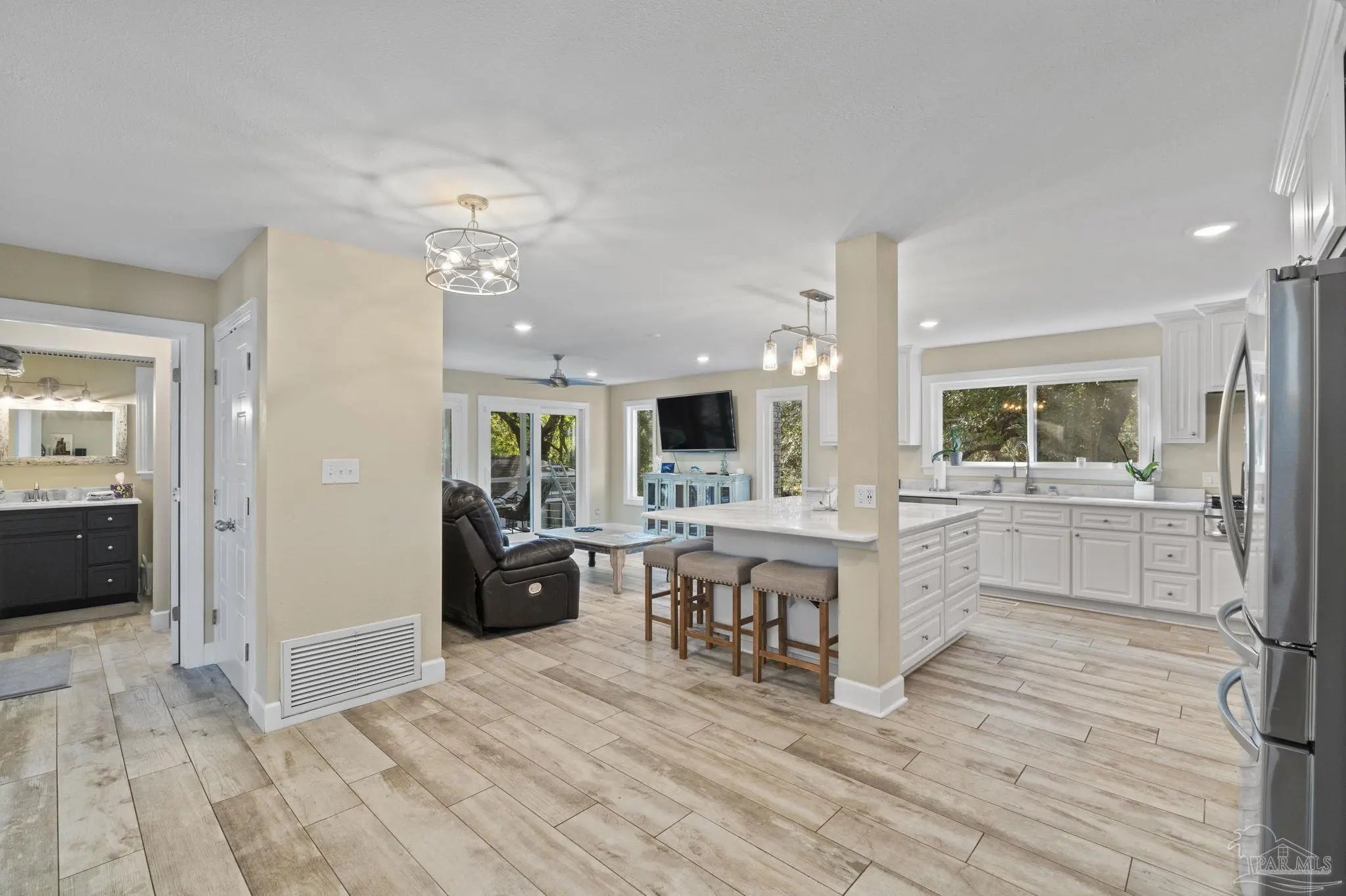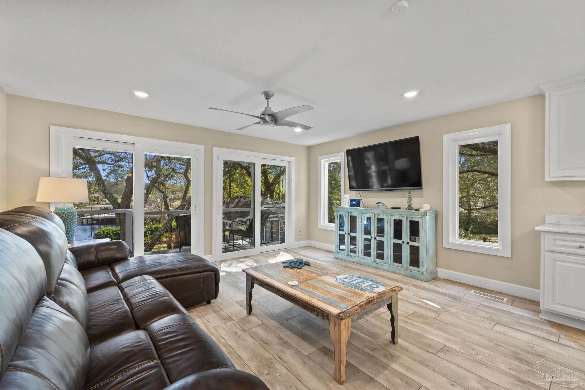 Amazing waterfront home on Weekley Bayou features a boathouse(up to 30’ boat under cover), 13K lb boat lift, jet ski ramp, Sure Step Flow Through Decking, seawall, & fish cleaning station. The gated property’s entryway is to the 2nd floor where you'll find a chef’s kitchen/ dining room combo adorned with custom cabinetry & equipped with large-capacity gas stove, double oven, & center island perfect for meal prep & gatherings with oversized pantry for your storage needs. Breathtaking views of the Bayou from the living room create a serene backdrop for relaxation. This floor also offers a full bath w/walk-in shower plus convenient exterior access & a versatile bonus room-currently a gym-but could be an additional bedroom by adding a closet. On the first floor, you’ll find an expansive guest suite, currently being utilized as a theater room, featuring a luxurious ensuite bath equipped with a tub/shower combo. Adjacent to the guest suite is a versatile bonus room (used as a bedroom). The second kitchen/bar area is a dream for entertainers, featuring a smooth top stove, refrigerator, quartz countertop bar w/sink, & wine fridge. Access to a private entrance makes it an ideal retreat for visitors. The ultimate primary suite is located on the third floor, where luxury meets comfort offering stunning Bayou views. Custom closet w/custom shelving & 4x6 center dressing cabinet. Laundry room conveniently located off the closet. Ensuite bath boasts 2 separate vanities & HUGE walk-in shower w/dual shower heads & rain shower head. This primary suite is designed for relaxation & elegance, making it the perfect sanctuary after a long day. Additional features include: 2025 geo-thermal HVAC system. 2022: impact windows & doors, whole house Generac gas generator, 40’ retaining wall, gutters, 2 mini-splits (first floor), HVAC 3rd floor. 2021: roof, septic tank pumped. Property has 2 capped chimneys & fireplaces walled in. Workshop sold as-is.