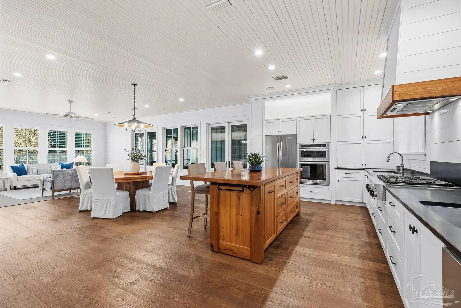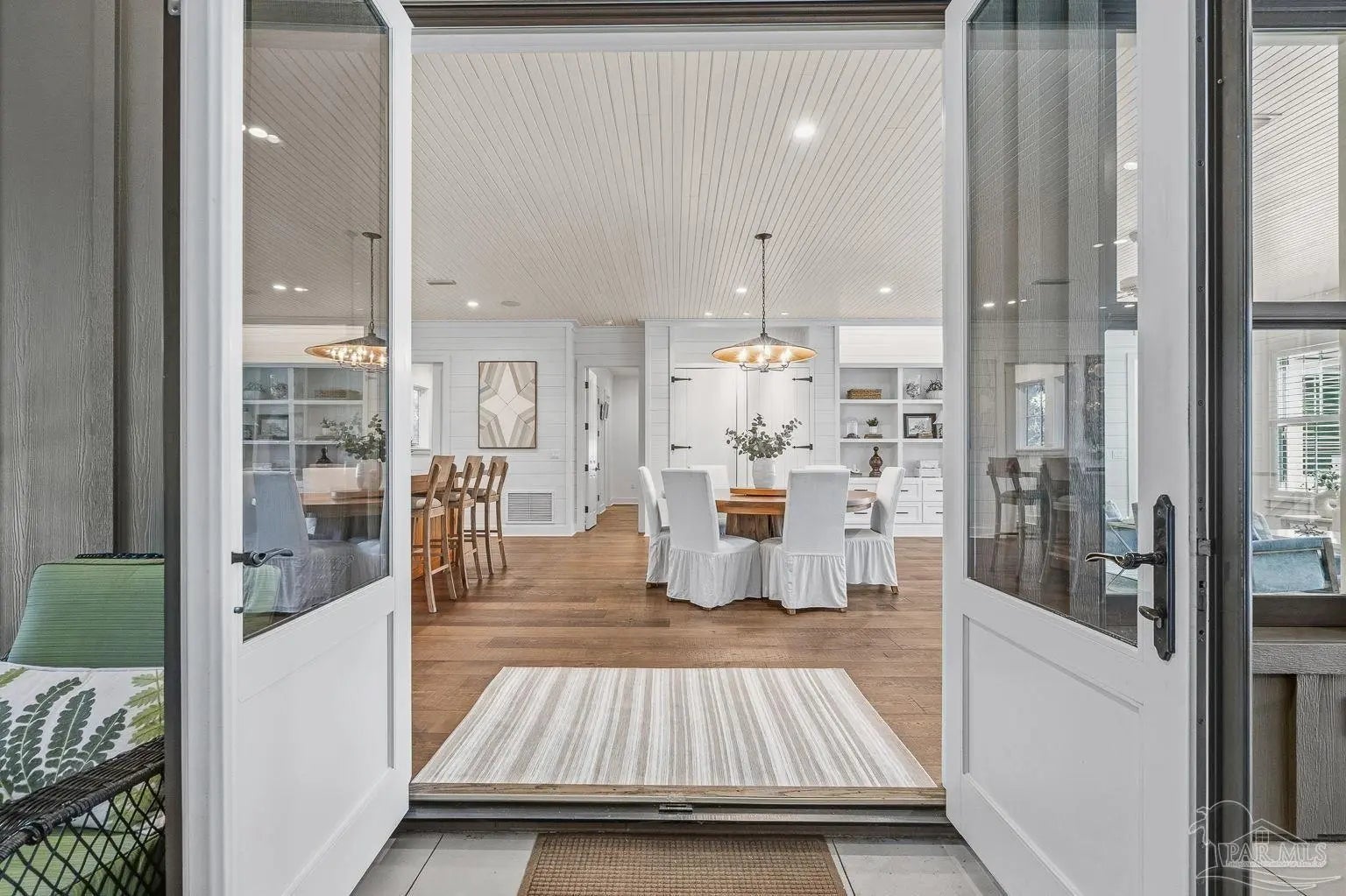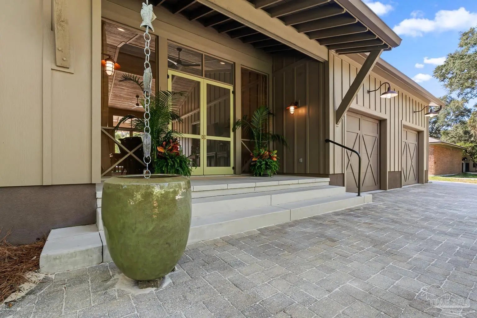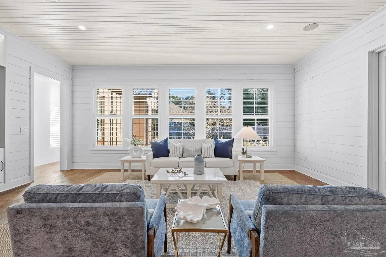 A truly one-of-a-kind luxury custom home, thoughtfully designed with architectural distinction and exceptional craftsmanship, set along a beautifully tree-lined street of Bayshore. This solidly built residence offers three bedrooms, three and a half baths, plus 405 sq ft of versatile bonus flex space, blending timeless design with refined coastal elegance. Rich tongue-and-groove wood details, a striking cypress center island, an oversized pantry, and a custom in-wall double-door dining hutch create a warm yet sophisticated interior. A luxurious screened-in living area serves as a showpiece of indoor-outdoor living, ideal for both entertaining and everyday relaxation. The expansive primary suite features a private sitting area, an expansive closet, and a spa-like bath. A tankless water system provides hot water on demand throughout the home, while a variable-speed air conditioning system delivers quiet, energy-efficient comfort. Additional luxury highlights include a six-burner gas stove, thoughtfully curated finishes, and quality craftsmanship throughout. Outdoors, the beautifully landscaped backyard is lined with blueberry bushes and includes an outdoor shower, with ample room to add a pool if desired. An exceptional opportunity to own a custom-built home where design, comfort, and location come together seamlessly. Please note: An additional document page has been included under the Documents section of this listing due to the extensive number of custom features incorporated throughout the home.