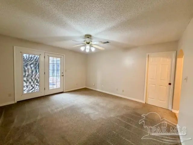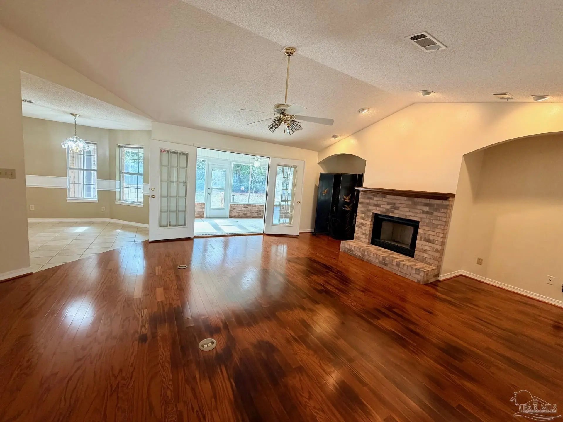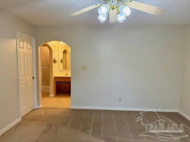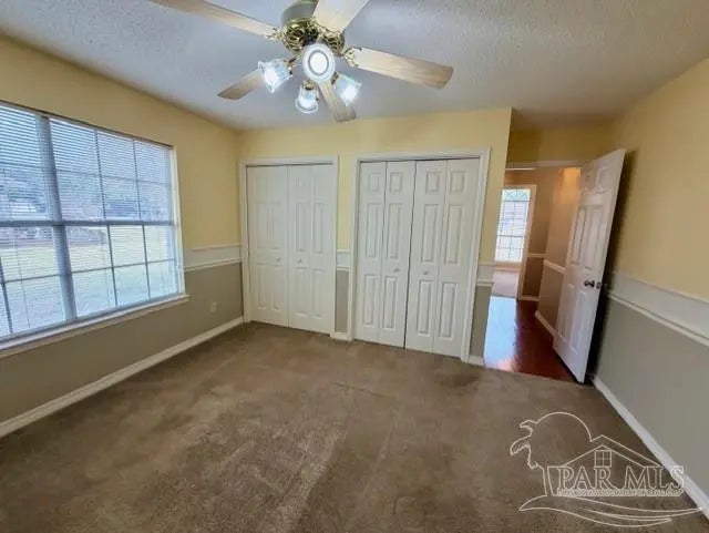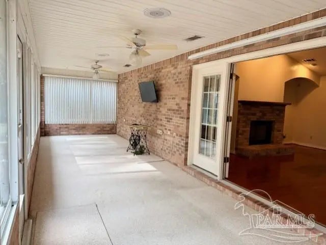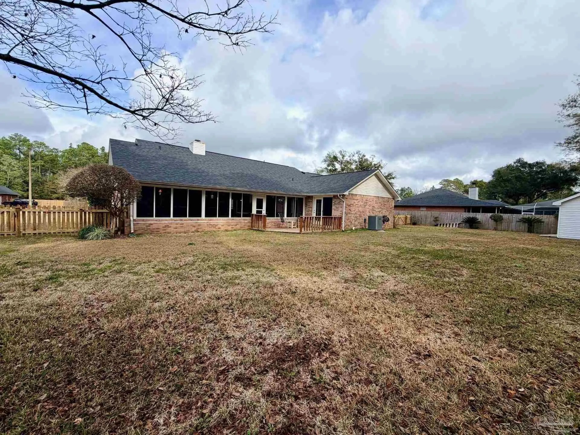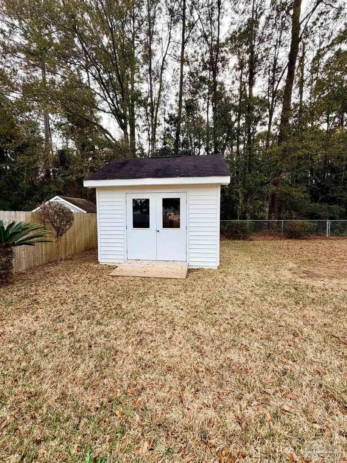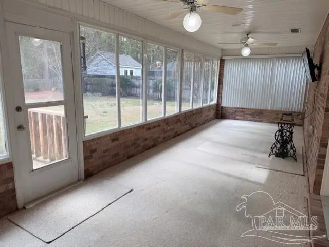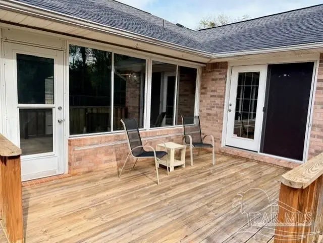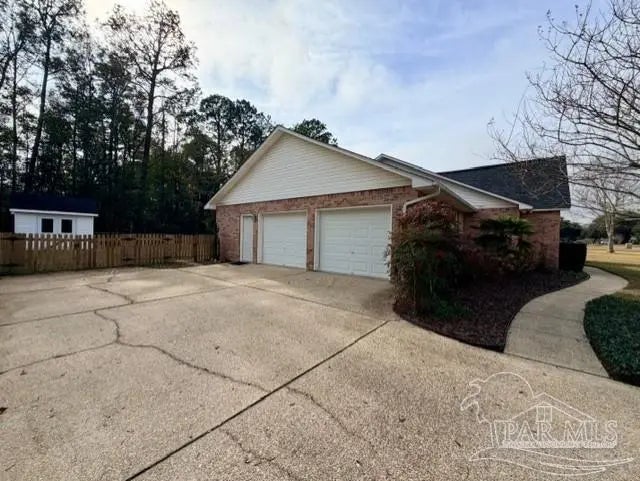 Eye catching architecture is highlighted throughout this well-maintained home with workshop in Pace, Florida. Windsor Forest is a desirable single-entry neighborhood with attractive homes and properties. Attention to detail is seen from front to back in this home. A long concrete driveway welcomes you to the over-sized side entry garage with built-in storage and workshop area. Sunlight filters through the etched glass front door and storm door from the inviting front porch. Characteristic archways immediately confirm the special nature of this home. Soaring ceilings in the Great room are grounded by a centered brick fireplace and hearth flanked by inset storage spaces. Flow naturally into the Breakfast Nook located adjacent to the well-appointed Kitchen. Lots of wood cabinets, breakfast bar, pantry, and an island with prep sink featuring filtered water is perfect for maintaining health. The Main Suite is split from the other bedrooms, and features a large whirlpool tub, separate shower, walk-in closet and French door to back deck. Each bedroom is located in different areas of the home to ensure privacy. Several pocket doors and double chair rail, as well as other accents, are thoughtfully located throughout the home. The Dining Room has a soaring vaulted ceilings with dramatic lighting and a custom arched inset made for an overstated piece of dining room furniture. Two spacious bedrooms have a walk in or double closet and share a bath with tub/shower combo, double vanity and linen closet. Enjoy bird watching in the large back yard and wooded greenbelt beyond the chain link fence. New ROOF(December 2025), HVAC 2016, storm panel hurricane protection, gutters, mature landscaping and sprinkler system. Tour this neighborhood and feel right at home-Call Today!