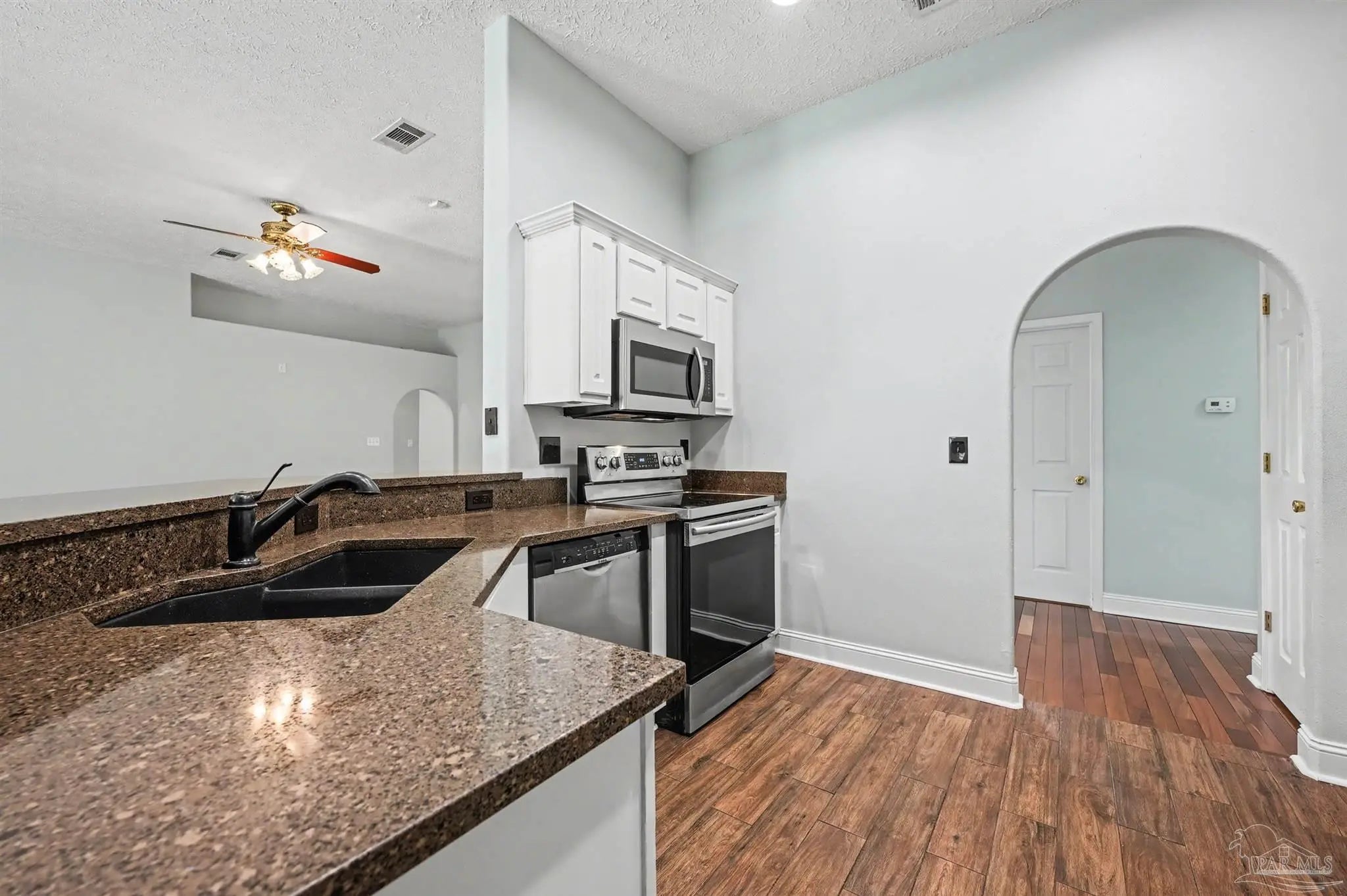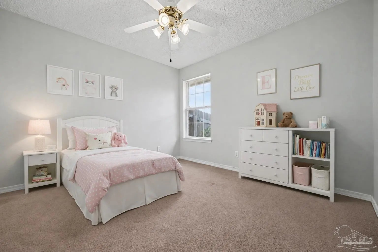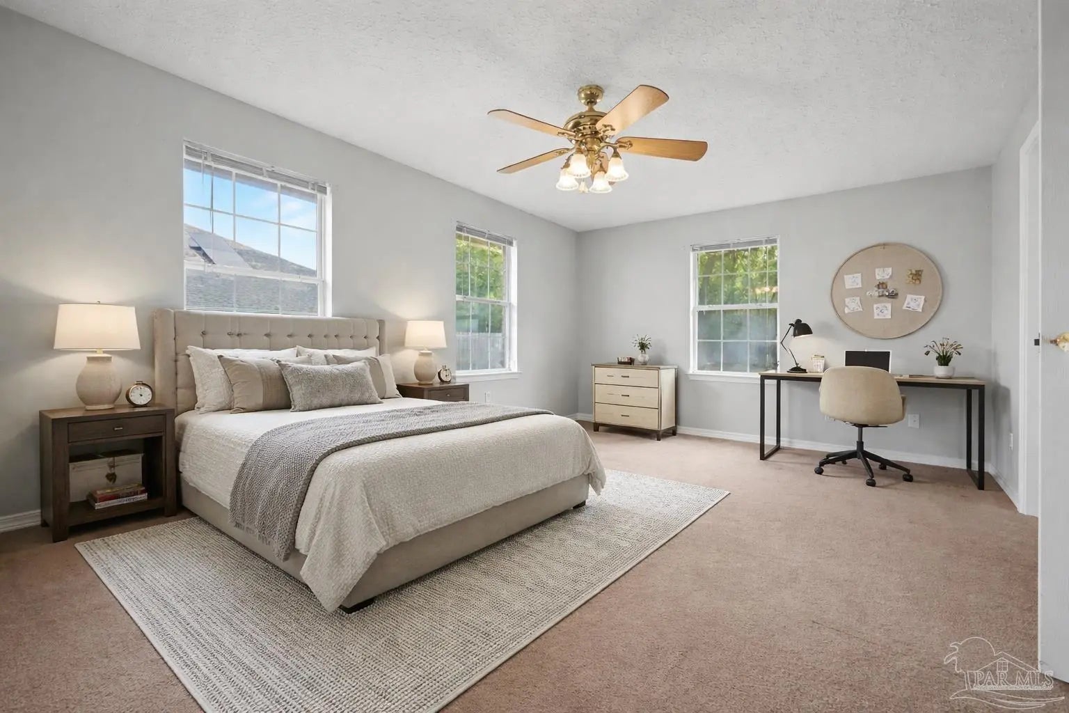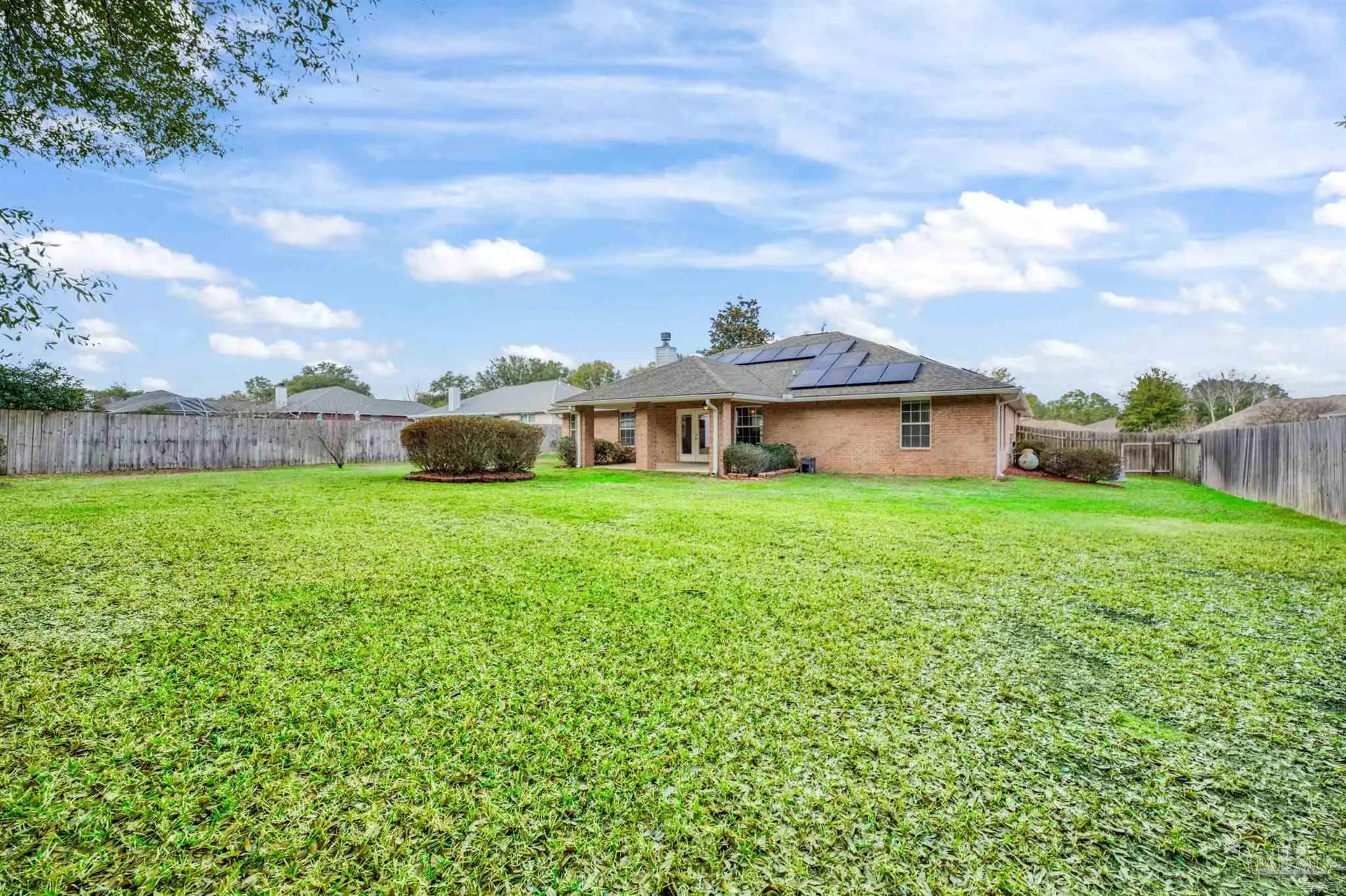 This beautiful brick home is nestled in a clean, well-kept neighborhood and centrally located in Pace, offering a convenient commute to Pensacola. Highlights include a brick exterior, paid-off solar panels, a whole-home propane generator, and a 4 year old roof and water heater! Inside, you’ll find fresh paint throughout and rich Brazilian walnut hardwood flooring in the main living areas. The spacious living room boasts high ceilings and a cozy fireplace, creating a warm and inviting atmosphere. The kitchen is both functional and stylish with quartz countertops, stainless steel appliances, white cabinetry, a breakfast bar for additional seating, a formal dining area accented by a chandelier, and a sunny breakfast nook. The home offers a thoughtful layout with all bedrooms positioned in their own corners for added privacy, including two true primary bedrooms and a dedicated office. The main primary suite is generously sized and features an ensuite bathroom with a Safe Step walk-in tub, a large separate shower, double vanities, and an oversized walk-in closet. All bedrooms are carpeted and equipped with ceiling fans for comfort. Out back, enjoy a serene, fully fenced backyard surrounded by mature trees along the fence line, creating a peaceful and private setting. A storage shed provides additional space for tools or equipment. This move-in-ready home is ideal for families seeking space, comfort, and exceptional value in a prime location!