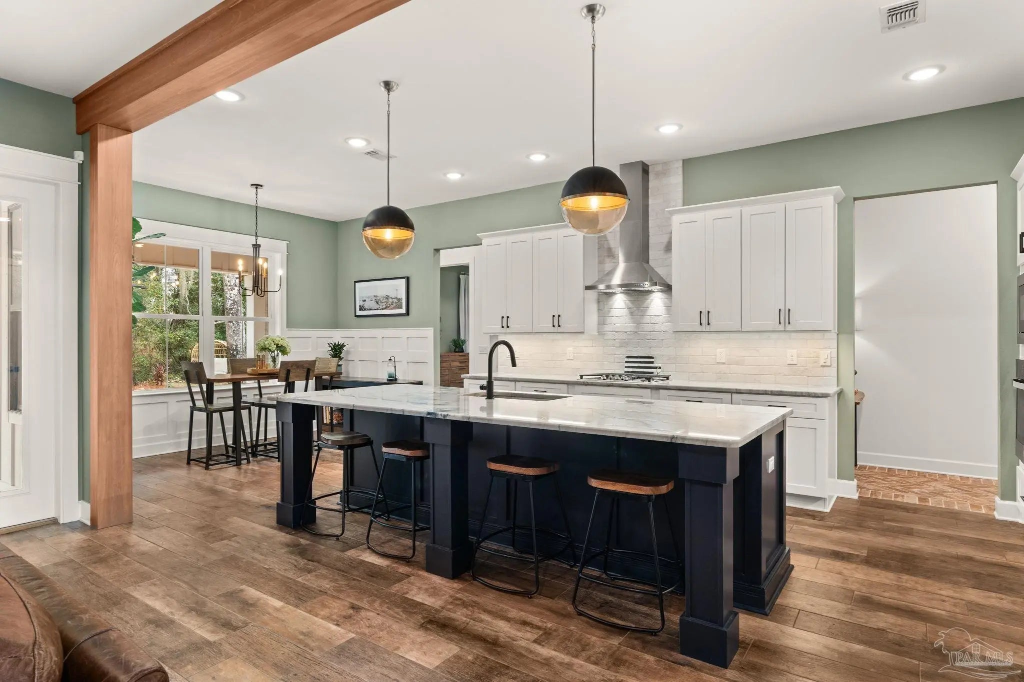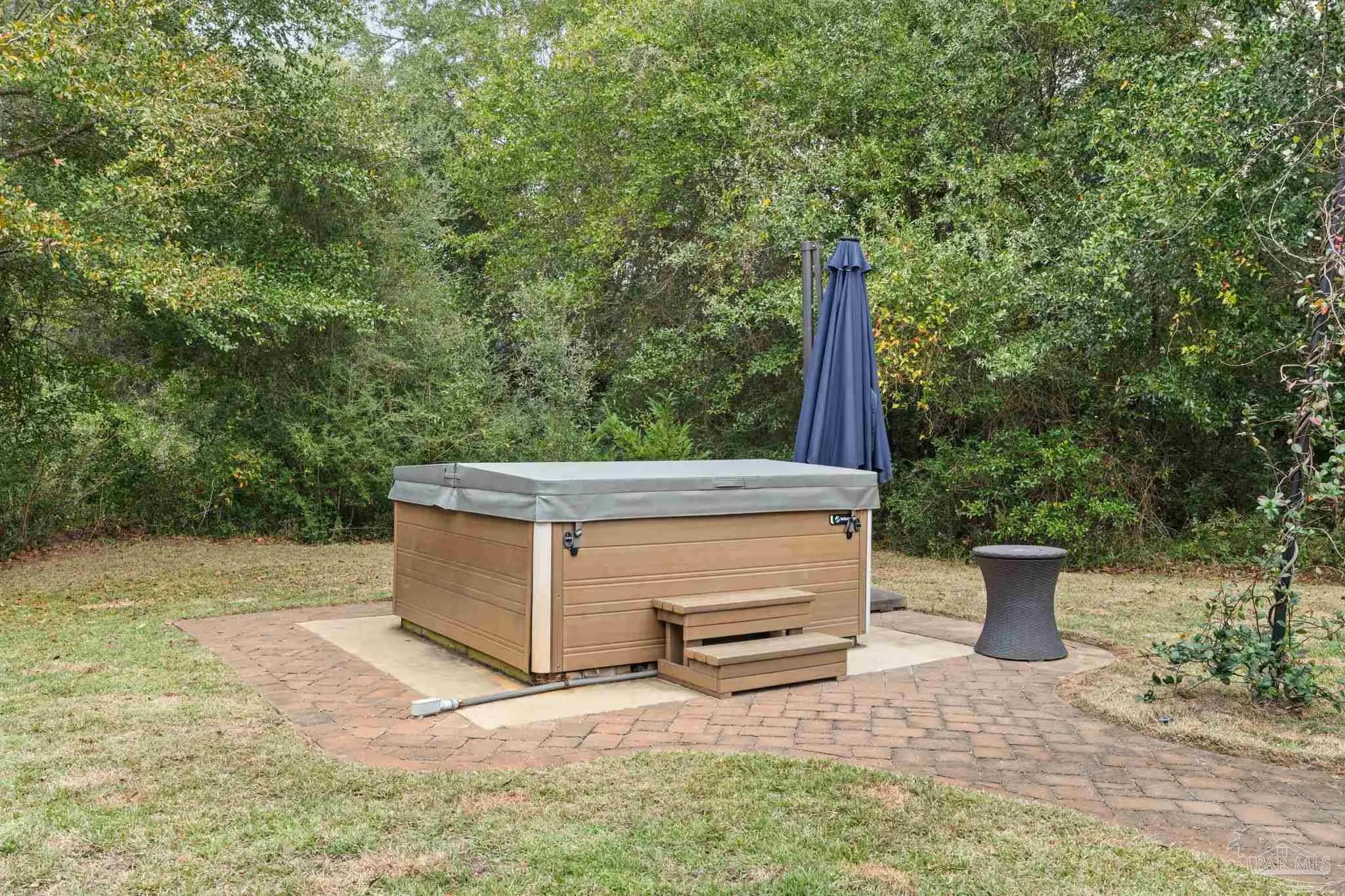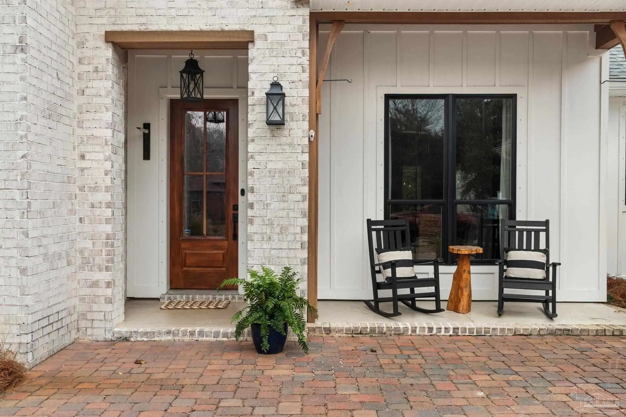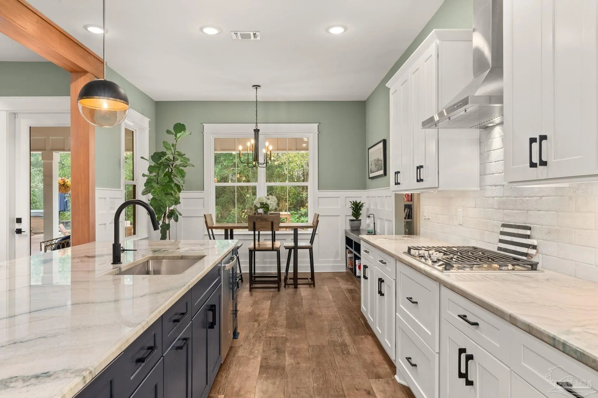 Nestled in one of Gulf Breeze's most pristine and high-demand Emerald Coast communities, this stunning custom Samuel Stevens home (built 2022) offers refined coastal living just moments from the water. Located in a gated neighborhood with public Sound access only one block away, nearby Soundside Preserve Park, and close proximity to a boat ramp, this home perfectly blends luxury, function, and lifestyle. Boasting nearly 3100 square feet, this thoughtfully designed residence features 4 bedrooms, 3 full baths, plus a dedicated office. The curb appeal is immediate with brick exterior with Hardie board and board-and-batten accents, cedar column front porch, metal roof details, upgraded wood-grain garage doors, and an extended paver driveway with double gate access leading to a boat/RV pad tucked discreetly behind the fence. Enjoy a covered back porch with tongue-and-groove pecky wood ceilings, exterior speakers and TV hookup, natural gas BBQ connection, and an extended paver patio with a concrete hot tub pad, complete with a Hot Springs 6-person hot tub (included). The fully irrigated yard features a 7-zone WiFi-enabled irrigation system with private well and iron treatment, plus a Dog Watch invisible fence covering both front and back yards. Inside, durable wood-grain plank tile flooring flows seamlessly throughout the home, complemented by herringbone brick tile in the laundry and back hallway. The heart of the home is the chef's kitchen, featuring an oversized 10-foot quartzite island, matching quartzite countertops throughout, soft-close cabinetry with pull-out trays and spice racks, under-cabinet lighting, wood-shelved pantry with double-sided ladder access, and a 30" natural gas cooktop. 1412 West Shores is a rare opportunity to own a meticulously crafted home where every detail has been thoughtfully curated. Luxury. Location. Lifestyle. This is Gulf Breeze living at its finest.
