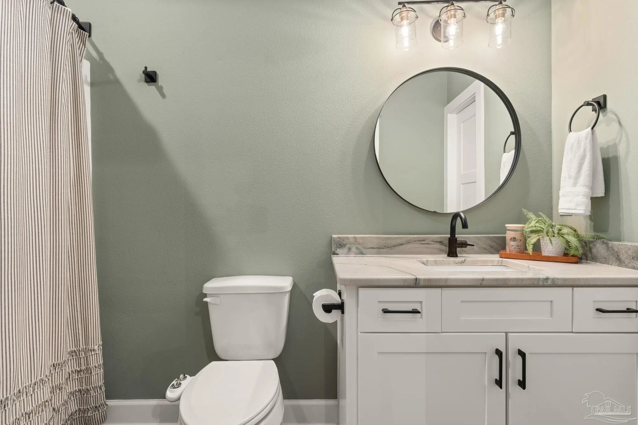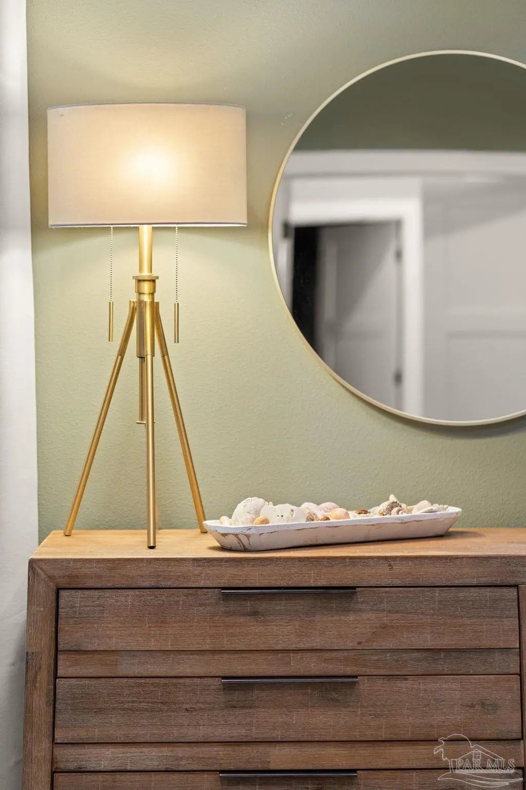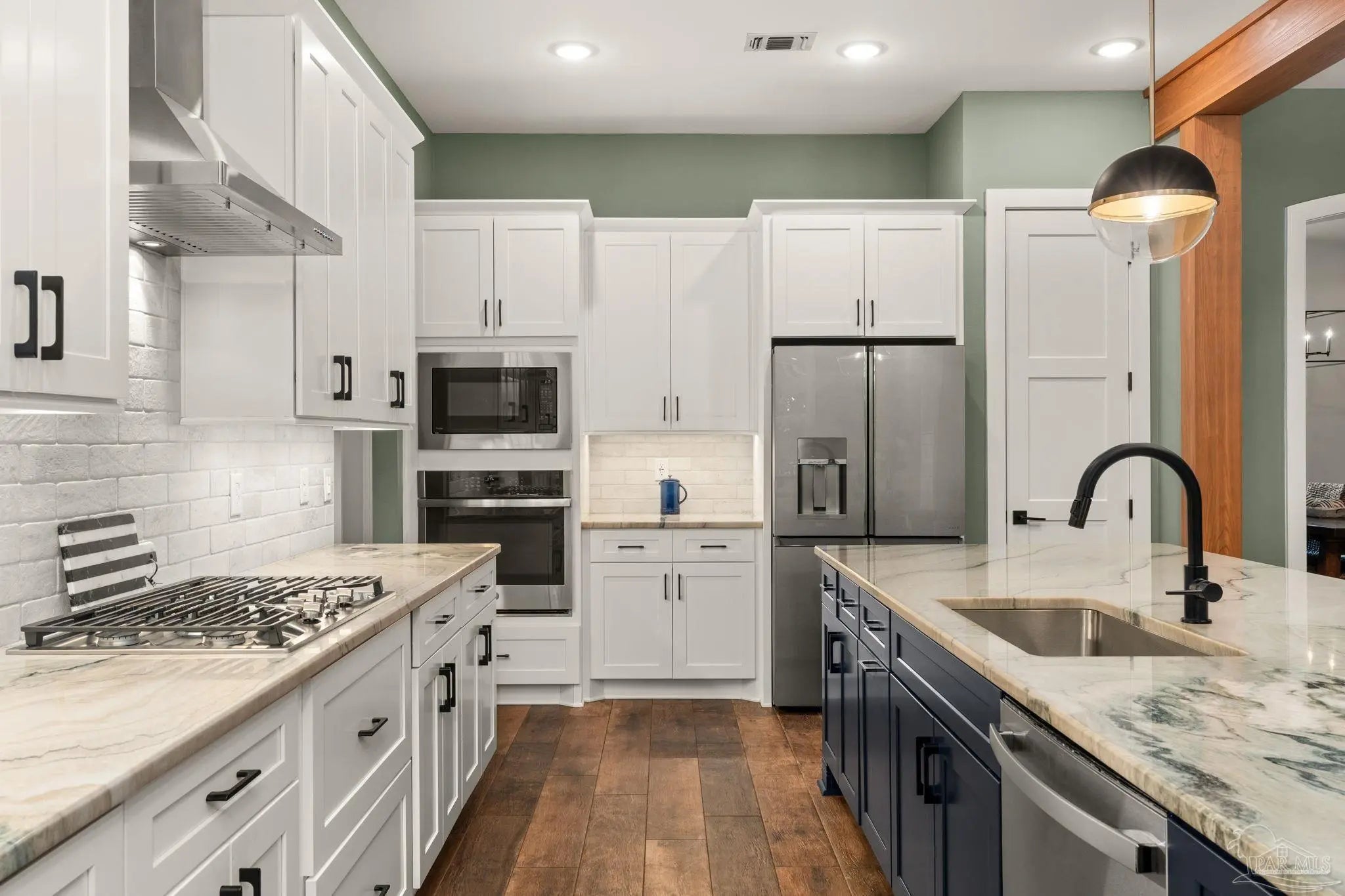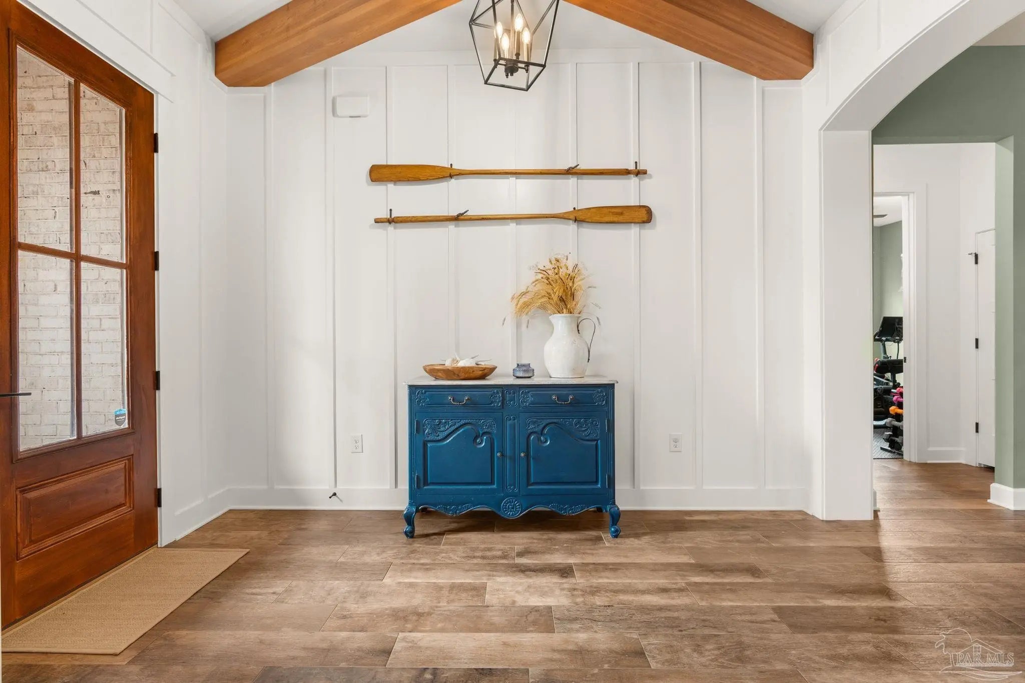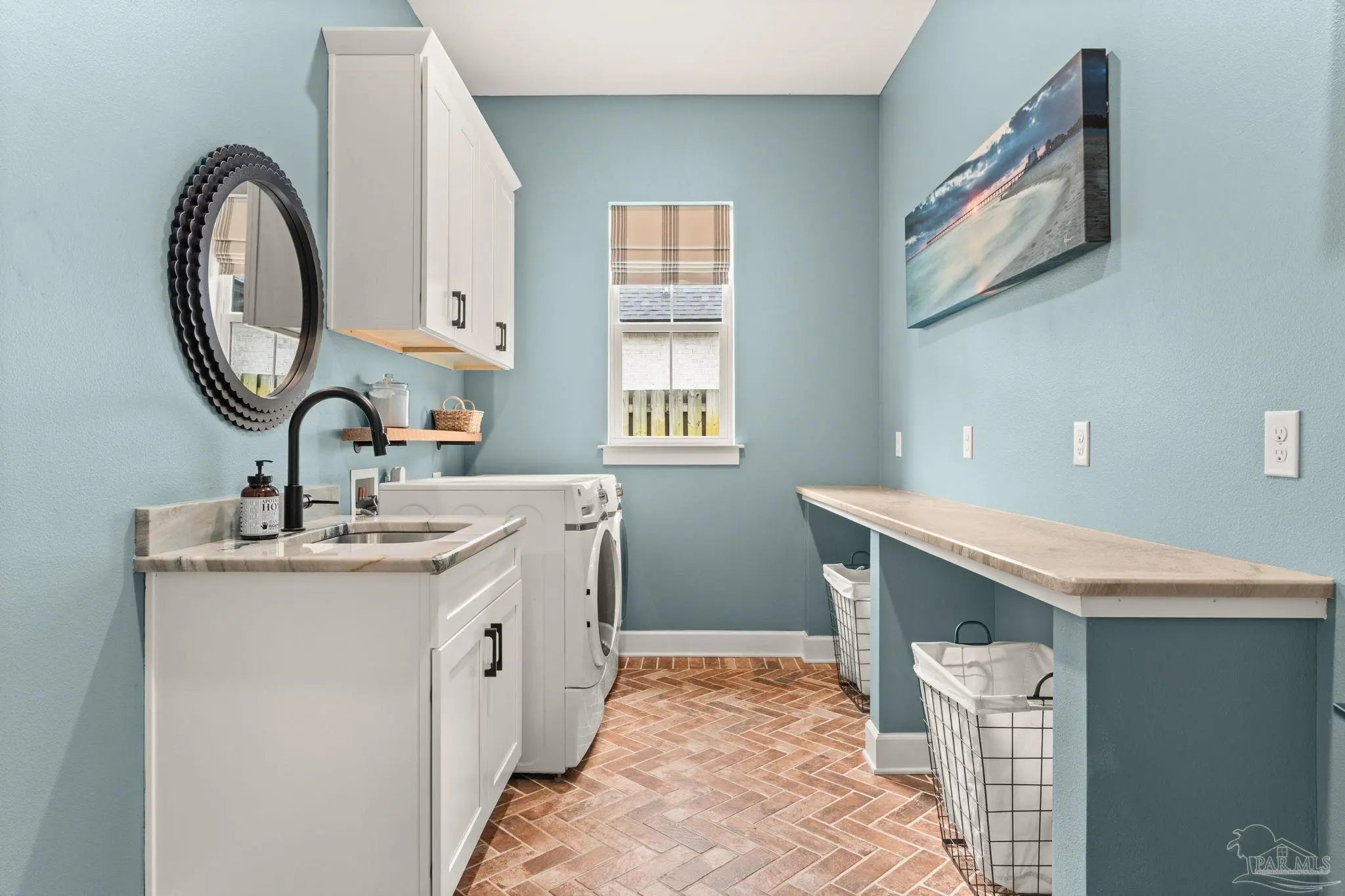 Nestled in one of Gulf Breeze's most pristine and high-demand Emerald Coast communities, this stunning custom Samuel Stevens home (built 2022) offers refined coastal living just moments from the water. Located in a gated neighborhood with public Sound access only one block away, nearby Soundside Preserve Park, and close proximity to a boat ramp, this home perfectly blends luxury, function, and lifestyle. Boasting nearly 3100 square feet, this thoughtfully designed residence features 4 bedrooms, 3 full baths, plus a dedicated office. The curb appeal is immediate with brick exterior with Hardie board and board-and-batten accents, cedar column front porch, metal roof details, upgraded wood-grain garage doors, and an extended paver driveway with double gate access leading to a boat/RV pad tucked discreetly behind the fence. Enjoy a covered back porch with tongue-and-groove pecky wood ceilings, exterior speakers and TV hookup, natural gas BBQ connection, and an extended paver patio with a concrete hot tub pad, complete with a Hot Springs 6-person hot tub (included). The fully irrigated yard features a 7-zone WiFi-enabled irrigation system with private well and iron treatment, plus a Dog Watch invisible fence covering both front and back yards. Inside, durable wood-grain plank tile flooring flows seamlessly throughout the home, complemented by herringbone brick tile in the laundry and back hallway. The heart of the home is the chef's kitchen, featuring an oversized 10-foot quartzite island, matching quartzite countertops throughout, soft-close cabinetry with pull-out trays and spice racks, under-cabinet lighting, wood-shelved pantry with double-sided ladder access, and a 30" natural gas cooktop. 1412 West Shores is a rare opportunity to own a meticulously crafted home where every detail has been thoughtfully curated. Luxury. Location. Lifestyle. This is Gulf Breeze living at its finest.