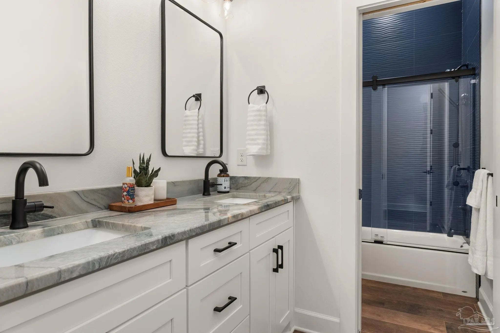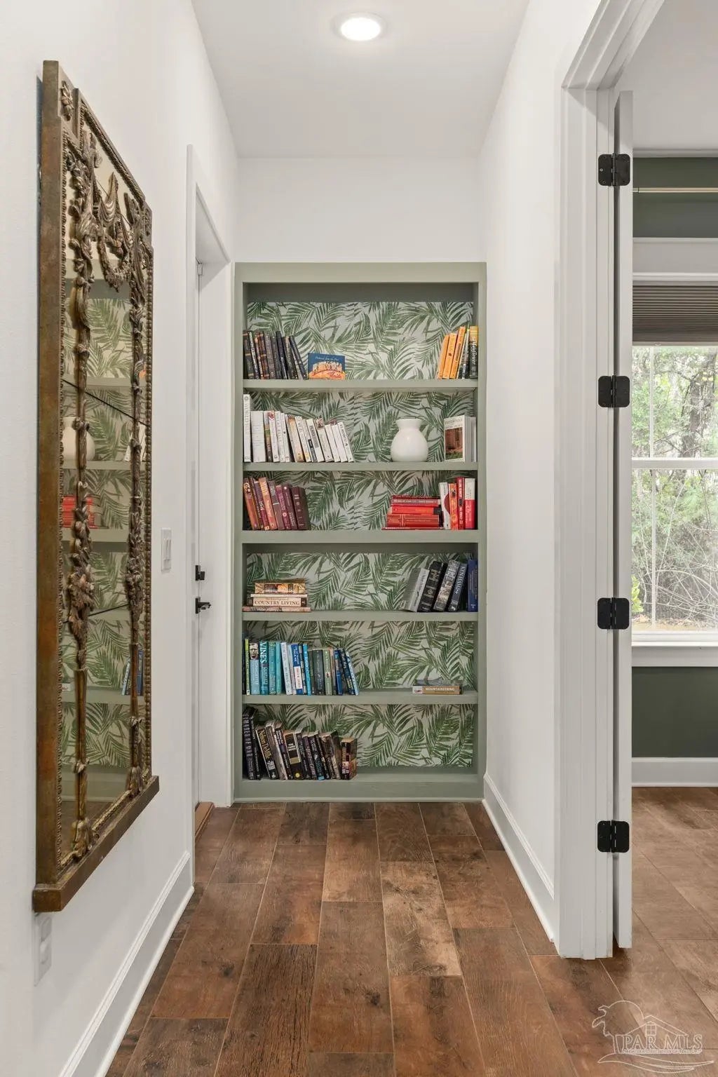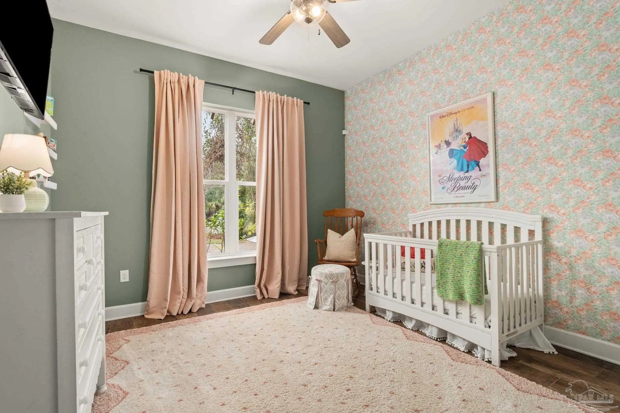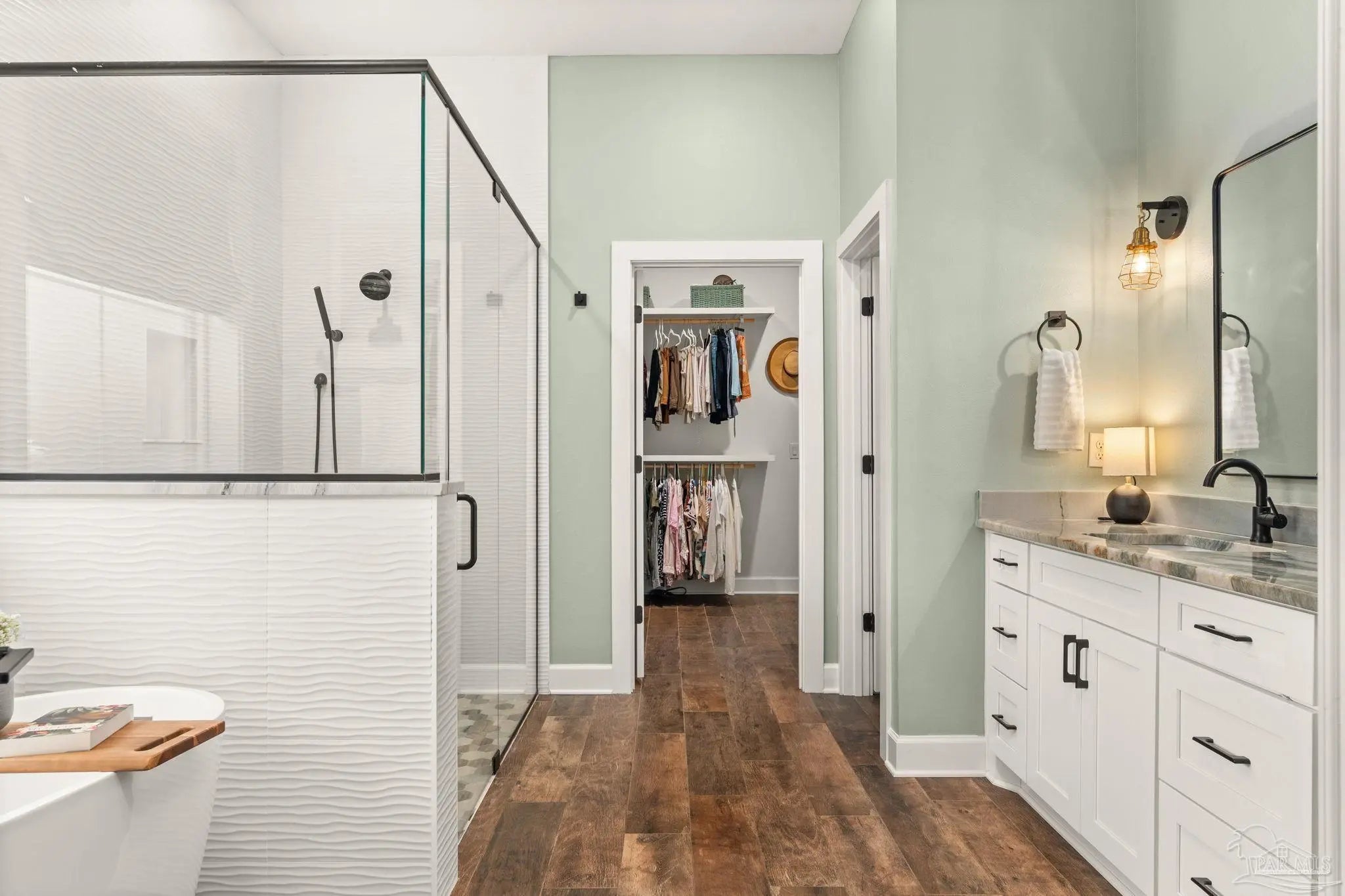 Nestled in one of Gulf Breeze's most pristine and high-demand Emerald Coast communities, this stunning custom Samuel Stevens home (built 2022) offers refined coastal living just moments from the water. Located in a gated neighborhood with public Sound access only one block away, nearby Soundside Preserve Park, and close proximity to a boat ramp, this home perfectly blends luxury, function, and lifestyle. Boasting nearly 3100 square feet, this thoughtfully designed residence features 4 bedrooms, 3 full baths, plus a dedicated office. The curb appeal is immediate with brick exterior with Hardie board and board-and-batten accents, cedar column front porch, metal roof details, upgraded wood-grain garage doors, and an extended paver driveway with double gate access leading to a boat/RV pad tucked discreetly behind the fence. Enjoy a covered back porch with tongue-and-groove pecky wood ceilings, exterior speakers and TV hookup, natural gas BBQ connection, and an extended paver patio with a concrete hot tub pad, complete with a Hot Springs 6-person hot tub (included). The fully irrigated yard features a 7-zone WiFi-enabled irrigation system with private well and iron treatment, plus a Dog Watch invisible fence covering both front and back yards. Inside, durable wood-grain plank tile flooring flows seamlessly throughout the home, complemented by herringbone brick tile in the laundry and back hallway. The heart of the home is the chef's kitchen, featuring an oversized 10-foot quartzite island, matching quartzite countertops throughout, soft-close cabinetry with pull-out trays and spice racks, under-cabinet lighting, wood-shelved pantry with double-sided ladder access, and a 30" natural gas cooktop. 1412 West Shores is a rare opportunity to own a meticulously crafted home where every detail has been thoughtfully curated. Luxury. Location. Lifestyle. This is Gulf Breeze living at its finest.