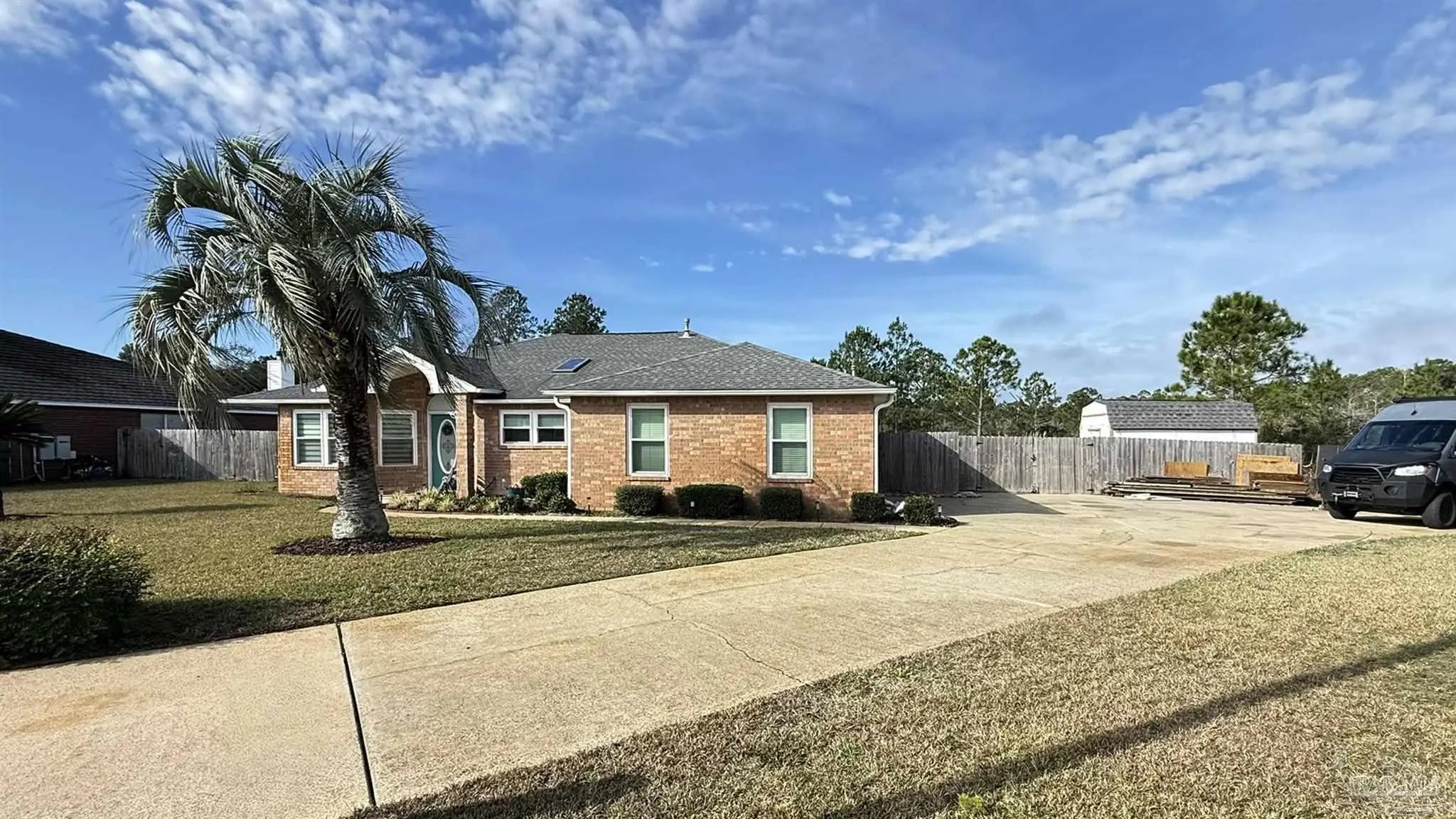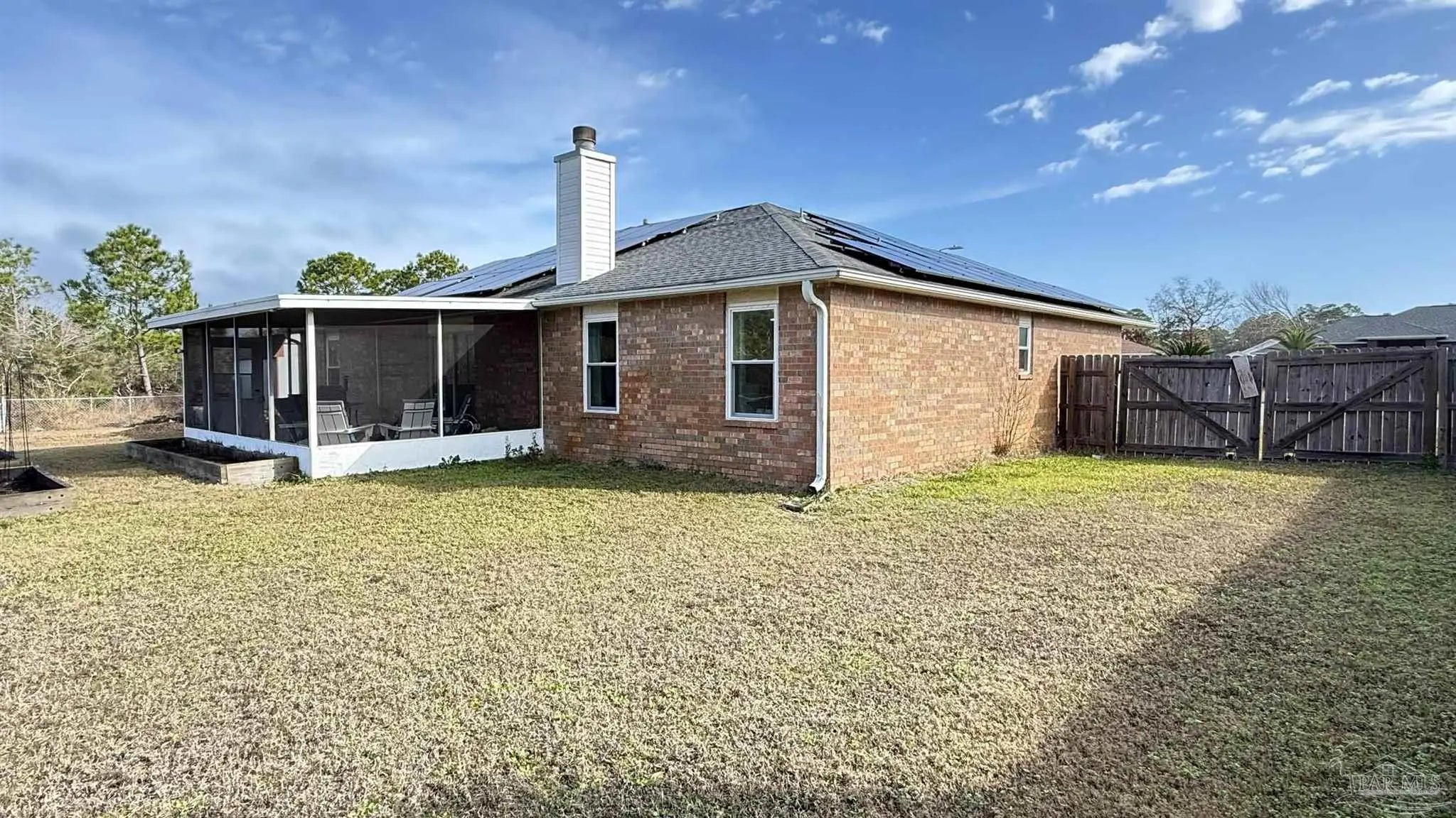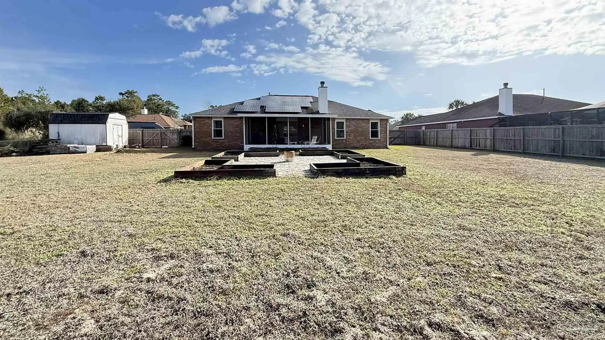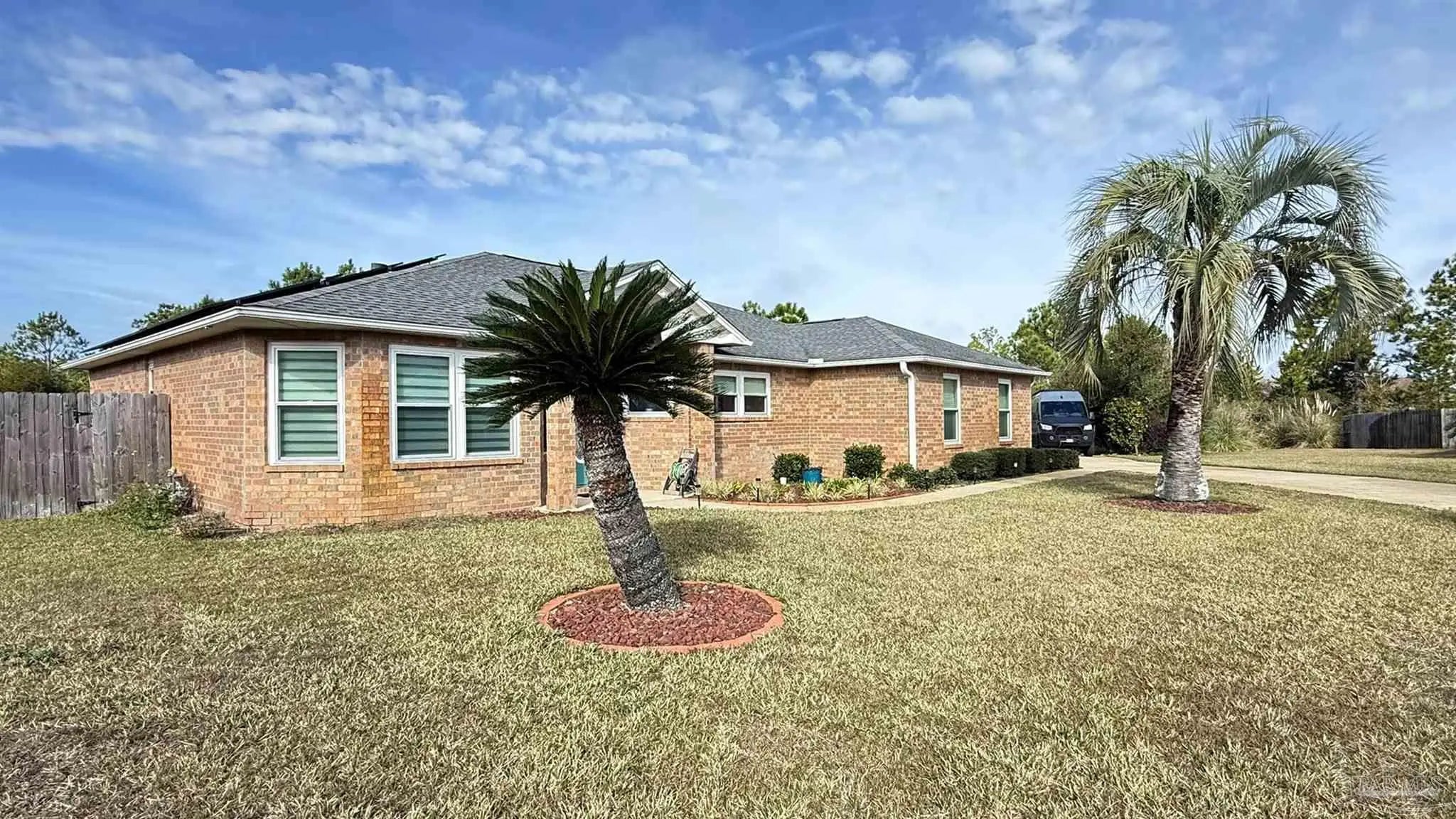 There is a GEM in the Estates at Emerald Shores! BEAUTIFULLY UPDATED 3BR/2/BA BRICK HOME BACKING UP TO PERMANENT GREEN SPACE. This well-maintained 3-bedroom, 2-bath brick home offers thoughtful upgrades and a serene setting with no rear neighbors-backing to protected green space that will never be built upon. Inside, you will find new cork flooring that adds warmth, comfort, and sustainability throughout the main living areas. The home features new storm windows for improved energy efficiency and comfort, along with stylish new light fixtures that enhance each space. The kitchen pantry has been upgraded with new custom shelving for optimal organization, while the laundry room includes convenient built-in storage to maximize functionality. HUGE back yard with raised beds and a shed that conveys. A major highlight is the fully paid for solar panel system, providing long-term energy savings and eco-friendly living with no added cost to the buyer. With solid brick construction, modern updates, and a peaceful natural backdrop, this home offers both comfort and value-perfect for relaxed living and every day convenience located close to the back gate of NAS, Perdido beaches and a short drive to downtown Pensacola.