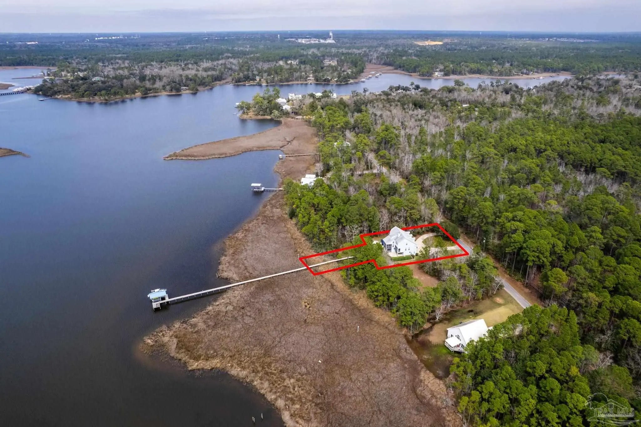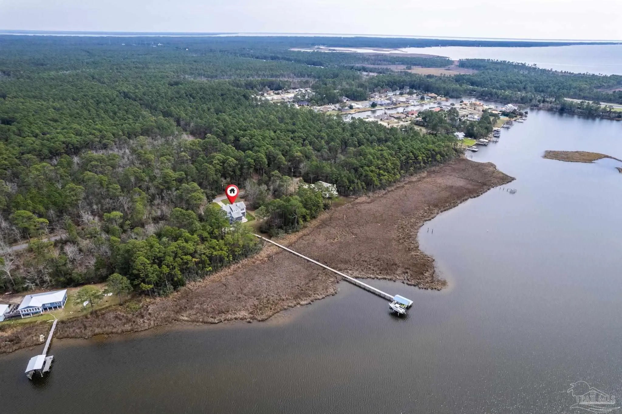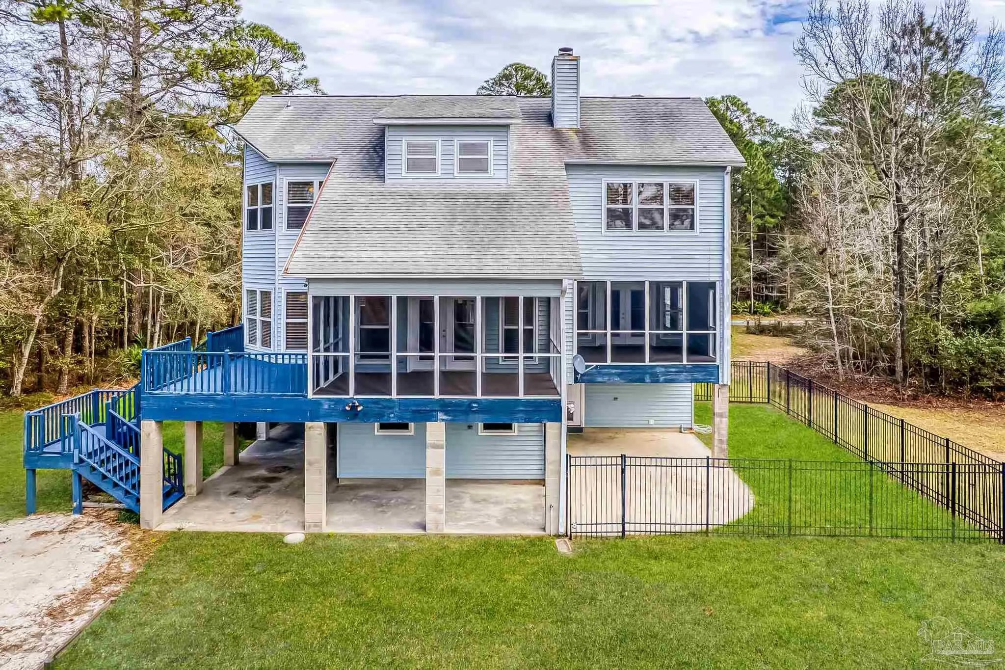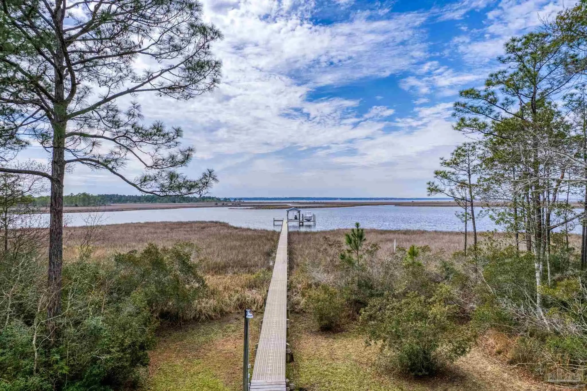 Move into instant equity with endless potential in this exceptional three-story waterfront retreat! This property is tucked away at the end of a quiet dead-end street for maximum privacy! Offering sweeping bay views from nearly every room, this 4-bedroom, 3.5-bath home is perfectly built for both tranquility and convenience. Highlights include a private pier, boat dock, a 32,000-lb boat lift, and a fully automatic dual jet ski lift - all while being just 5 miles from I-10 and 9 miles from Pensacola International Airport. The main level features an open and inviting living area with built-in shelving, a cozy fireplace, and new LVP flooring, all seamlessly connected to a screened-in covered patio equipped with no-see-um screens, ideal for enjoying waterfront breezes year-round. The spacious kitchen provides abundant cabinetry and prep space, complemented by a formal dining room and a sun-filled breakfast nook. Just off the kitchen, a deck offers the perfect setting for outdoor dining with scenic bay views. The primary suite on the main level serves as a private retreat, featuring its own screened patio, a spa-like bathroom with a soaking tub, walk-in shower, dual vanities, a generous walk-in closet, and direct access to the laundry room. Upstairs, three additional bedrooms offer flexible living options, including a secondary suite with its own private bath and double closets, plus two additional bedrooms that share a full bathroom. The oversized two-car garage offers a workshop area, refinished floors, two storage closets, and washer/dryer hookups. Additional highlights include a fenced pet area with doggy-door access from the second floor and a covered two-car carport for extra parking. With easy access to Gulf Breeze and downtown Pensacola, this bayfront sanctuary is the perfect place to relax, entertain, and fully embrace life on the water!
