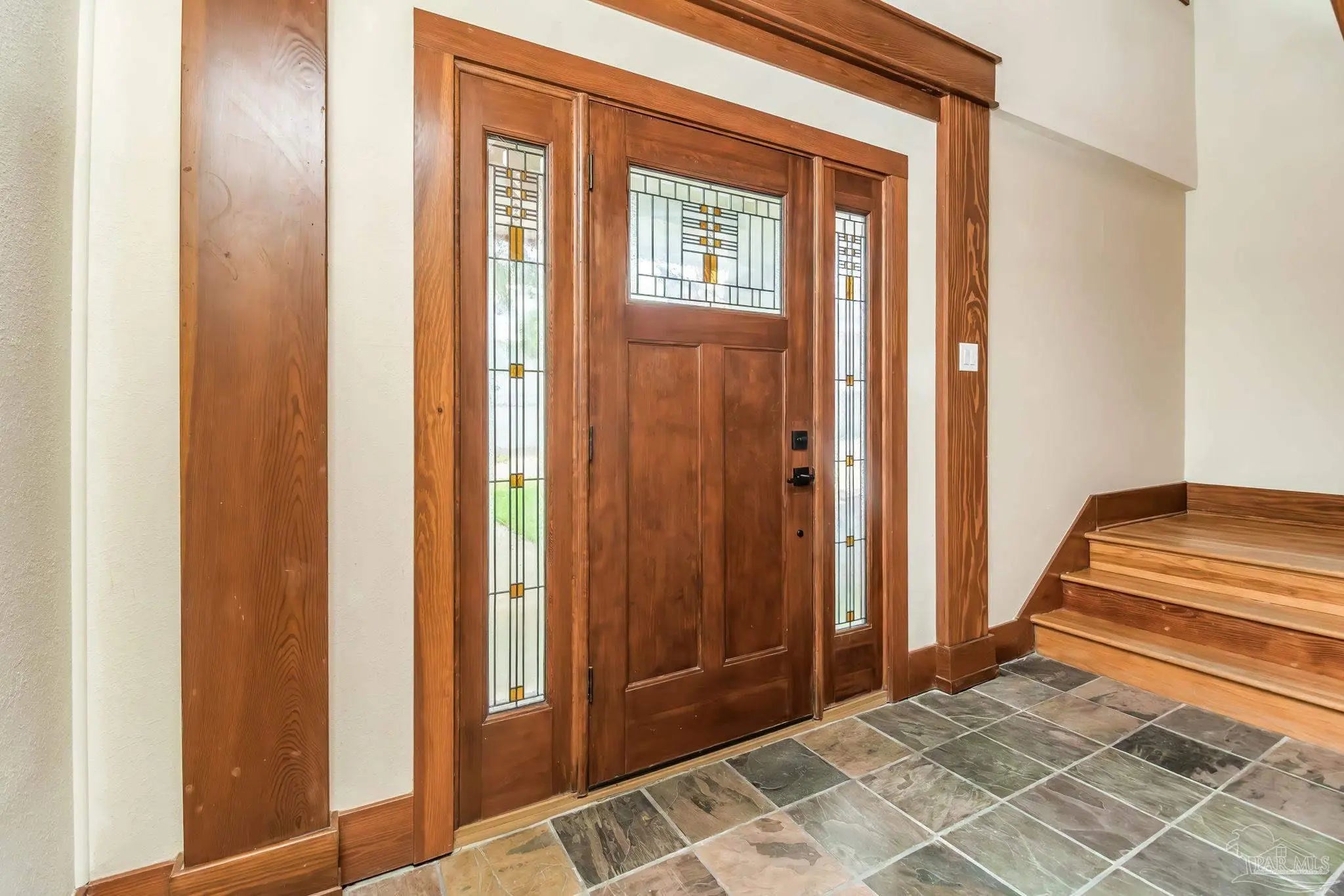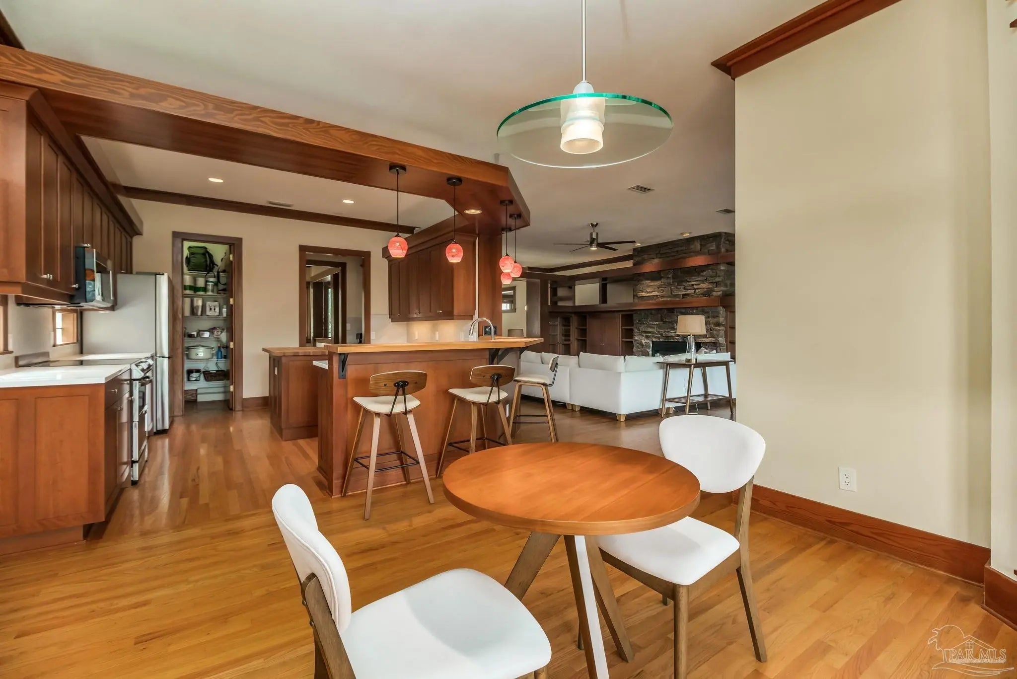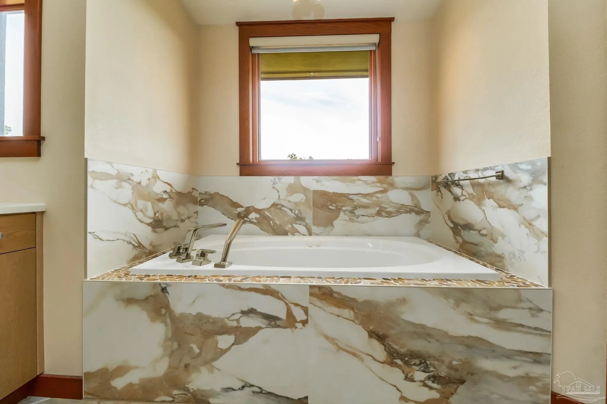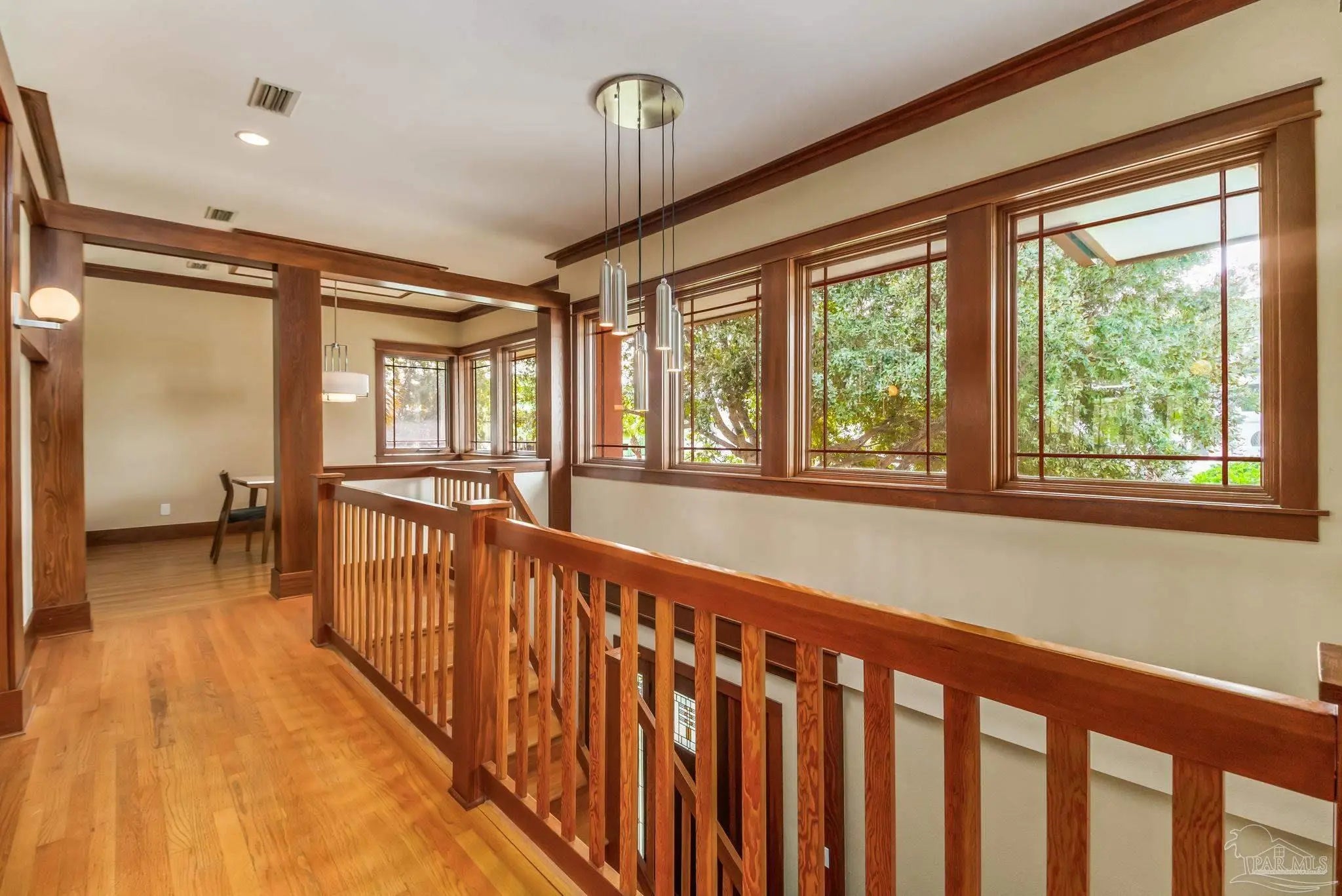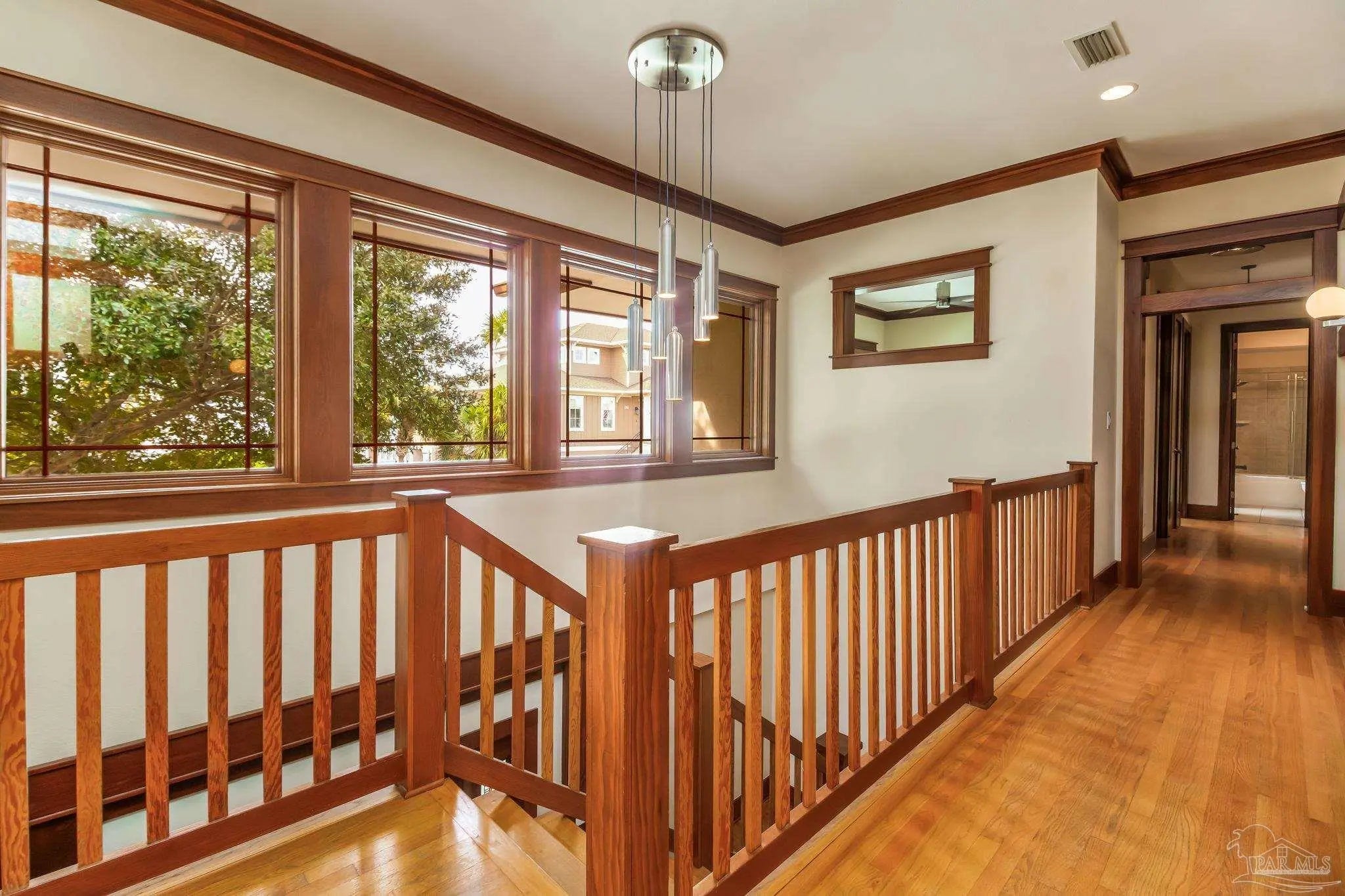 Sensational water-view home located in the gated community of Deer Point Village in Gulf Breeze, just minutes from Pensacola Beach and Downtown. Enjoy sweeping views of the Santa Rosa Sound and peaceful wetlands alive with herons and osprey. Only steps from your door, launch paddleboards and kayaks from the community dock or private beach, making coastal living effortless and immersive. From the moment you enter through the leaded-glass front door, the craftsmanship and warmth of this contemporary Craftsman-style home are immediately apparent. Gorgeous wood details and walls of windows flood both the living areas and bedrooms with natural light, creating an airy, open feel throughout. The main living and dining spaces feature rich hardwood floors, soaring 10-foot ceilings, crown and base molding, recessed lighting, and a striking double-sided gas fireplace with stone surround. Custom built-in shelving and display cabinetry add both function and elegance. The remodeled eat-in kitchen is designed for entertaining and everyday living, featuring stainless-steel smart appliances, quartz and butcher-block countertops, cherry-stained shaker cabinetry with pull-out organizers, a center prep island, and an oversized breakfast bar. A butler’s pantry with a built-in desk and wine refrigerator provides additional storage and convenience, while direct access to the covered deck seamlessly extends the living space outdoors. The primary suite is a true retreat, offering a neutral coastal palette, seating area, walk-in closet, and private access to the covered deck overlooking the tall wetland grasses. Wake to tranquil sunrises and unwind in the evening beneath star-filled skies. The spa-like ensuite bath showcases custom Coastal White cabinetry, dual oversized quartz vanities, a jacuzzi tub with marble tile surround, and an oversized frameless shower with spray tower panel and pebble flooring. Additional bedrooms and baths are equally well-appointed with updated designer finishes.