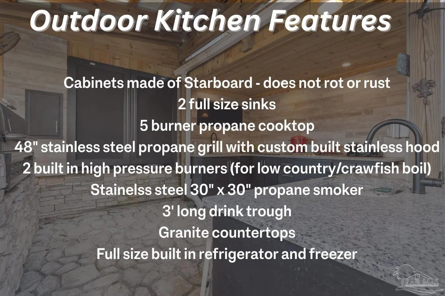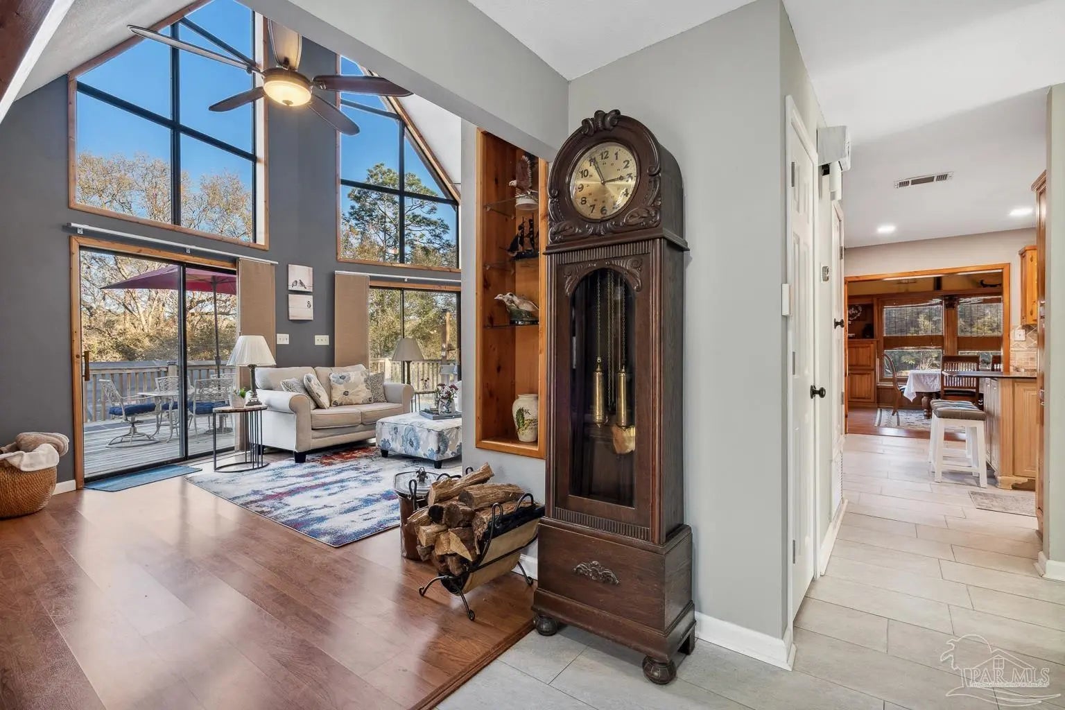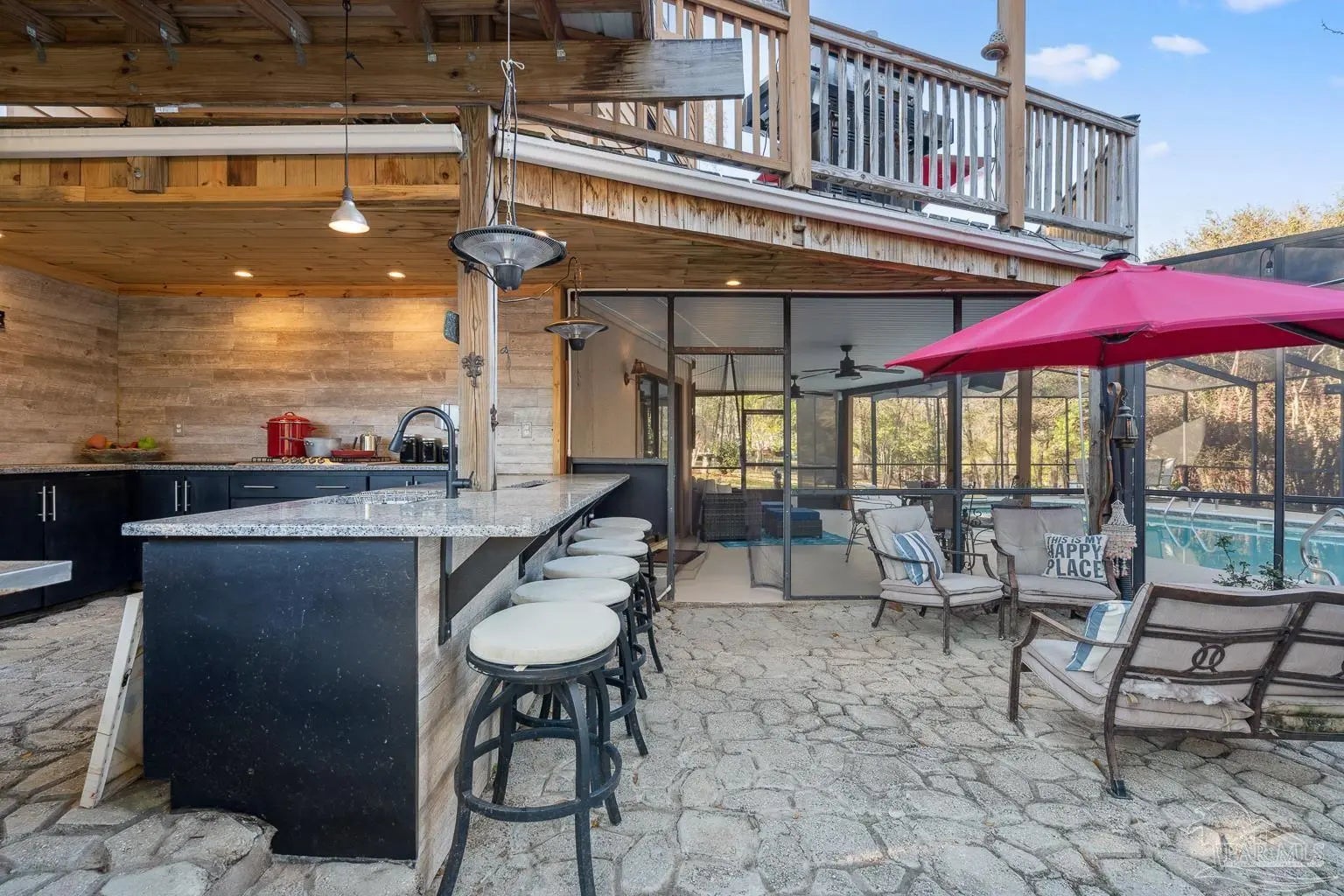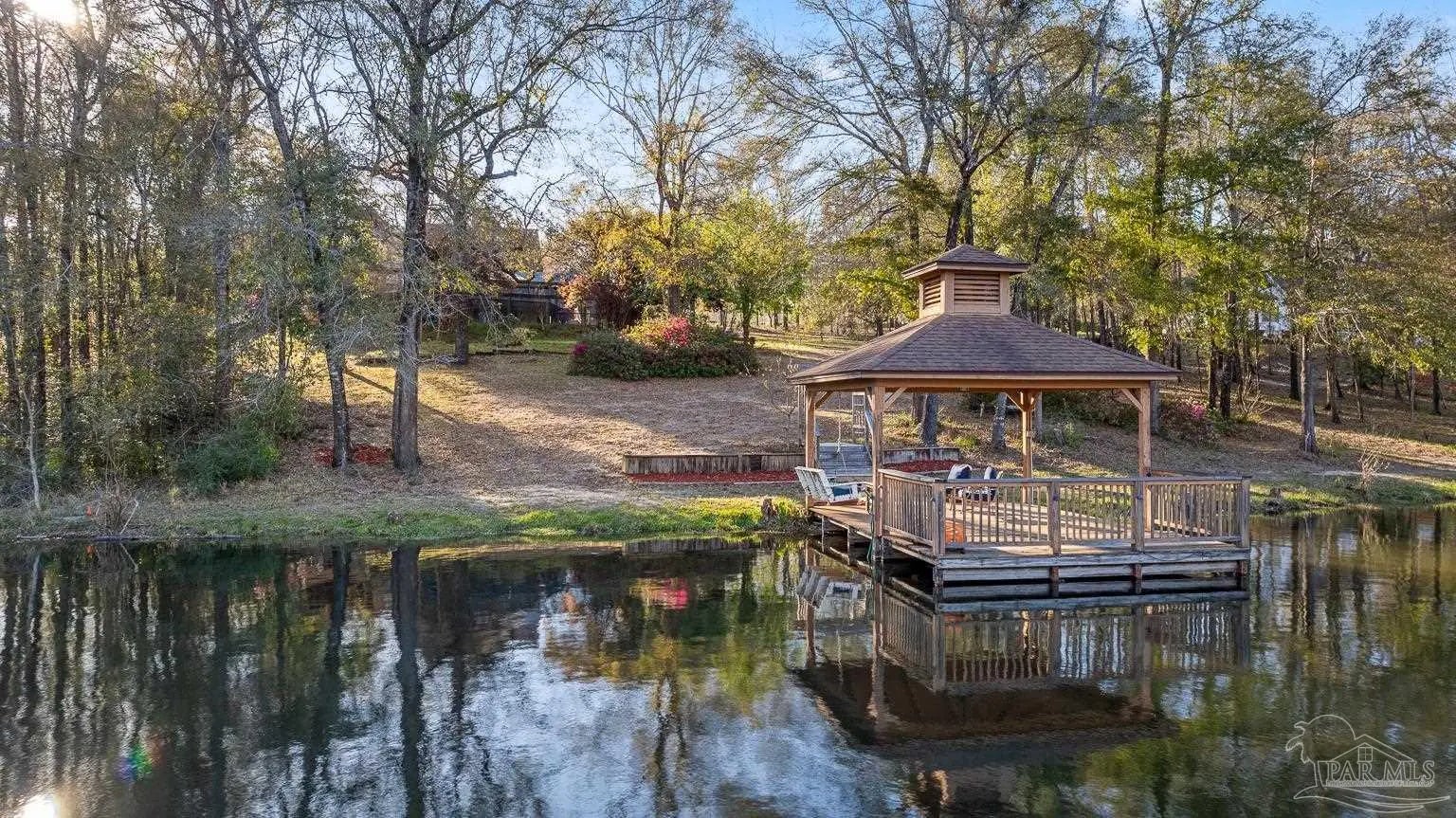 Discover a rare, one-owner lakefront retreat designed as an entertainer’s dream and a place where lasting memories are made. This custom-built home was created as a private escape, offering the feeling of a permanent vacation without ever needing to leave home. Set on a peaceful 1.14-acre waterfront property, the home delivers tranquility, privacy, and room to spread out, all while remaining conveniently close to beautiful beaches and nearby bases. The lifestyle truly begins outdoors. Expansive entertaining spaces unfold from a covered lanai and screened-in pool area, flowing seamlessly into an outdoor kitchen any chef would dream of, complete with large grills, a separate smoker, an industrial-sized outdoor refrigerator, and a wet bar with solid surface counters. Just beyond, a fully enclosed and private hot tub area creates a true outdoor oasis designed for relaxation year-round. All of it overlooks the lake and a gazebo-style private dock, perfect for fishing, reflection, and unforgettable sunrises and sunsets. Inside, the main living level brings together the living room, dining area, kitchen, and primary suite in a way that feels open, welcoming, and effortless. The kitchen has been updated with upgraded countertops, modern lighting, newer appliances, and a double oven, making it ideal for entertaining, while several bathrooms throughout the home feature well-planned upgrades that add comfort and style. A wraparound porch invites slow mornings and long evenings, offering a front-row seat to the surrounding natural beauty. Upstairs, additional bedrooms and a full bath provide comfortable accommodations for family and guests. Downstairs, a solid concrete construction level offers exceptional flexibility, featuring a wet bar, billiards area, and a built-in Murphy bed, 1/2 bath and laundry area making it an ideal bonus area , 4th bedroom, or private suite. This is THE ONE!