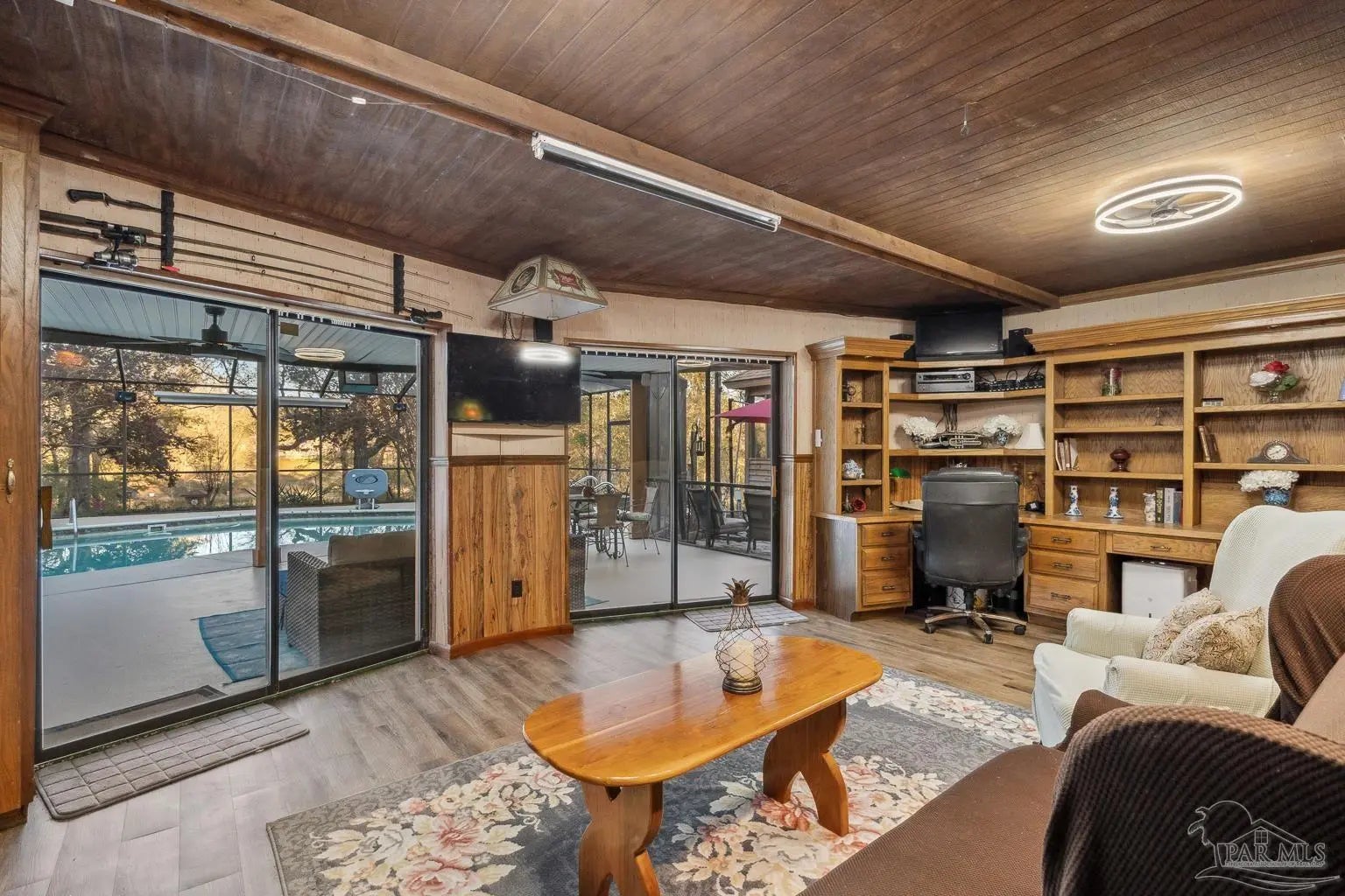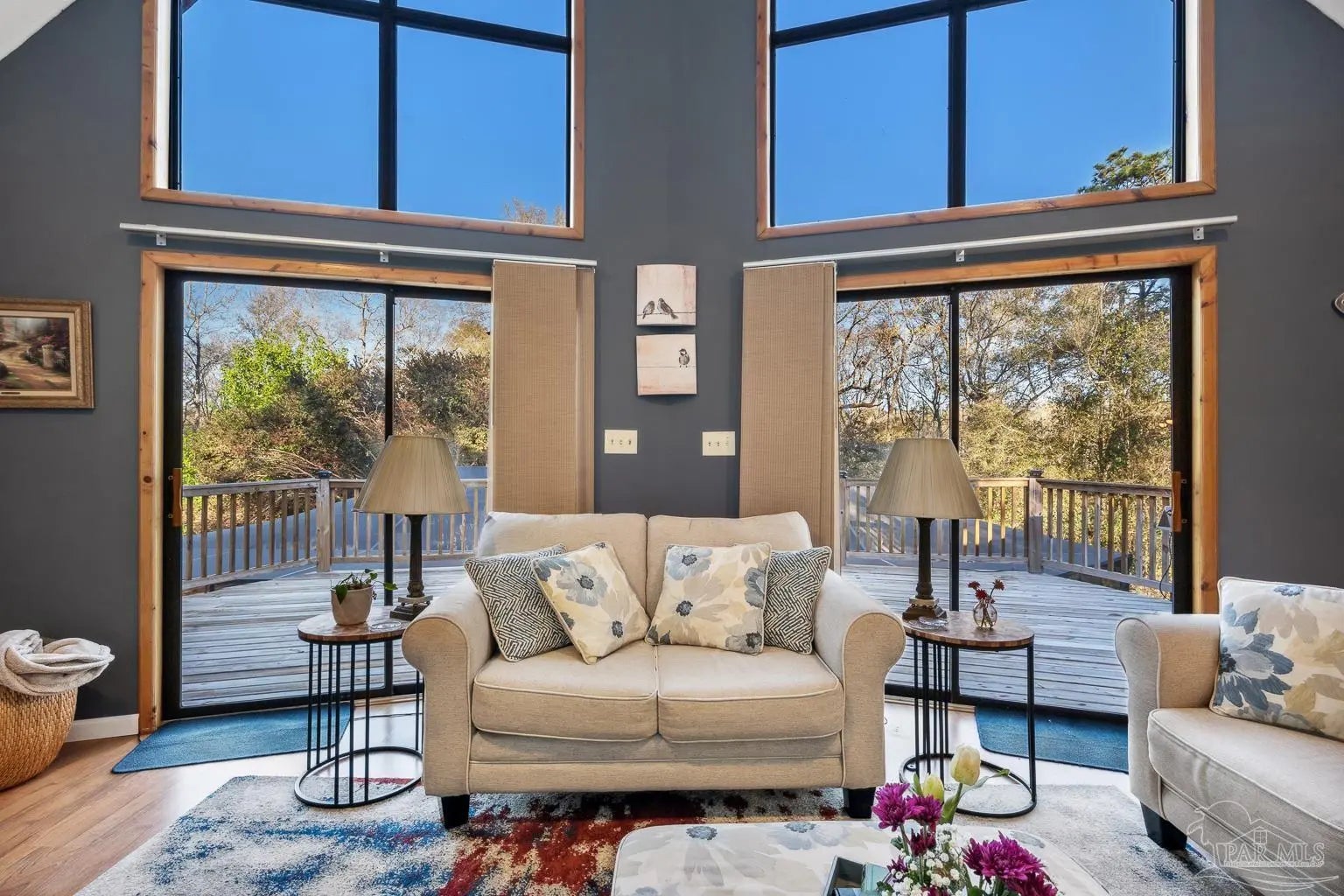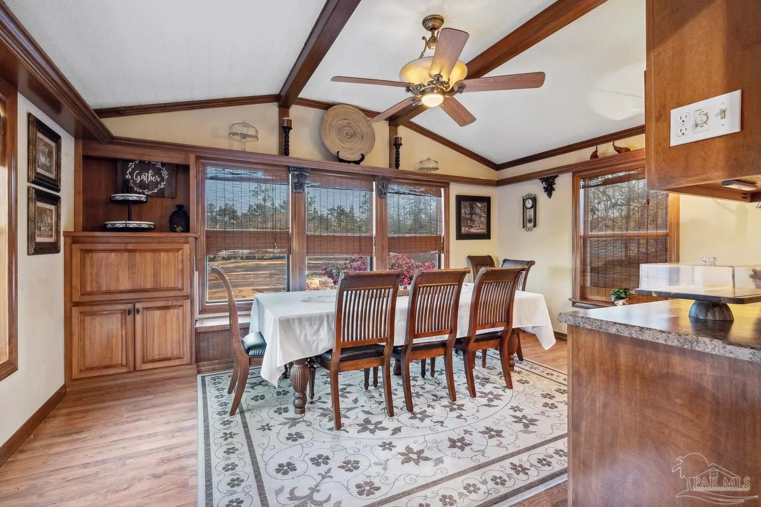 Discover a rare, one-owner lakefront retreat designed as an entertainer’s dream and a place where lasting memories are made. This custom-built home was created as a private escape, offering the feeling of a permanent vacation without ever needing to leave home. Set on a peaceful 1.14-acre waterfront property, the home delivers tranquility, privacy, and room to spread out, all while remaining conveniently close to beautiful beaches and nearby bases. The lifestyle truly begins outdoors. Expansive entertaining spaces unfold from a covered lanai and screened-in pool area, flowing seamlessly into an outdoor kitchen any chef would dream of, complete with large grills, a separate smoker, an industrial-sized outdoor refrigerator, and a wet bar with solid surface counters. Just beyond, a fully enclosed and private hot tub area creates a true outdoor oasis designed for relaxation year-round. All of it overlooks the lake and a gazebo-style private dock, perfect for fishing, reflection, and unforgettable sunrises and sunsets. Inside, the main living level brings together the living room, dining area, kitchen, and primary suite in a way that feels open, welcoming, and effortless. The kitchen has been updated with upgraded countertops, modern lighting, newer appliances, and a double oven, making it ideal for entertaining, while several bathrooms throughout the home feature well-planned upgrades that add comfort and style. A wraparound porch invites slow mornings and long evenings, offering a front-row seat to the surrounding natural beauty. Upstairs, additional bedrooms and a full bath provide comfortable accommodations for family and guests. Downstairs, a solid concrete construction level offers exceptional flexibility, featuring a wet bar, billiards area, and a built-in Murphy bed, 1/2 bath and laundry area making it an ideal bonus area , 4th bedroom, or private suite. This is THE ONE!