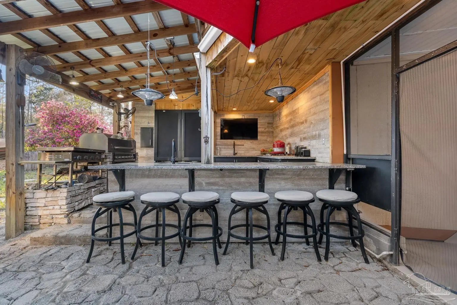 Discover a rare, one-owner lakefront retreat designed as an entertainer’s dream and a place where lasting memories are made. This custom-built home was thoughtfully created as a private escape, offering the feeling of a permanent vacation without ever needing to leave home. Set on a peaceful 1.14-acre waterfront property, the home delivers tranquility, privacy, and room to spread out, all while remaining conveniently close to beautiful beaches and nearby military bases. Once home, the lifestyle truly begins outdoors. Expansive entertaining spaces unfold from a covered lanai and screened-in pool area, flowing seamlessly into an outdoor kitchen any chef would dream of, complete with built-in flat top and smoker grills, a separate smoker, an industrial-sized outdoor refrigerator, and a wet bar with solid surface counters. Just beyond, a fully enclosed and completely private hot tub and spa area creates a true outdoor oasis designed for relaxation year-round. All of it overlooks the lake and a gazebo-style private dock, perfect for fishing, reflection, and unforgettable sunrises and sunsets. Inside, the main living level brings together the living room, dining area, kitchen, and primary suite in a way that feels open, welcoming, and effortless. The kitchen has been updated with upgraded countertops, modern lighting, newer appliances, and a double oven, making it ideal for entertaining, while several bathrooms throughout the home feature well-planned upgrades that add comfort and style. A wraparound porch invites slow mornings and long evenings, offering a front-row seat to the surrounding natural beauty. Upstairs, additional bedrooms and a full bath provide comfortable accommodations for family and guests. Downstairs, a solid concrete construction level offers exceptional flexibility, featuring a wet bar, billiards area, and a built-in Murphy bed, 1/2 bath and laundry area making it an ideal bonus area , 4th bedroom, or private suite. This is THE ONE! Schedule a tour!