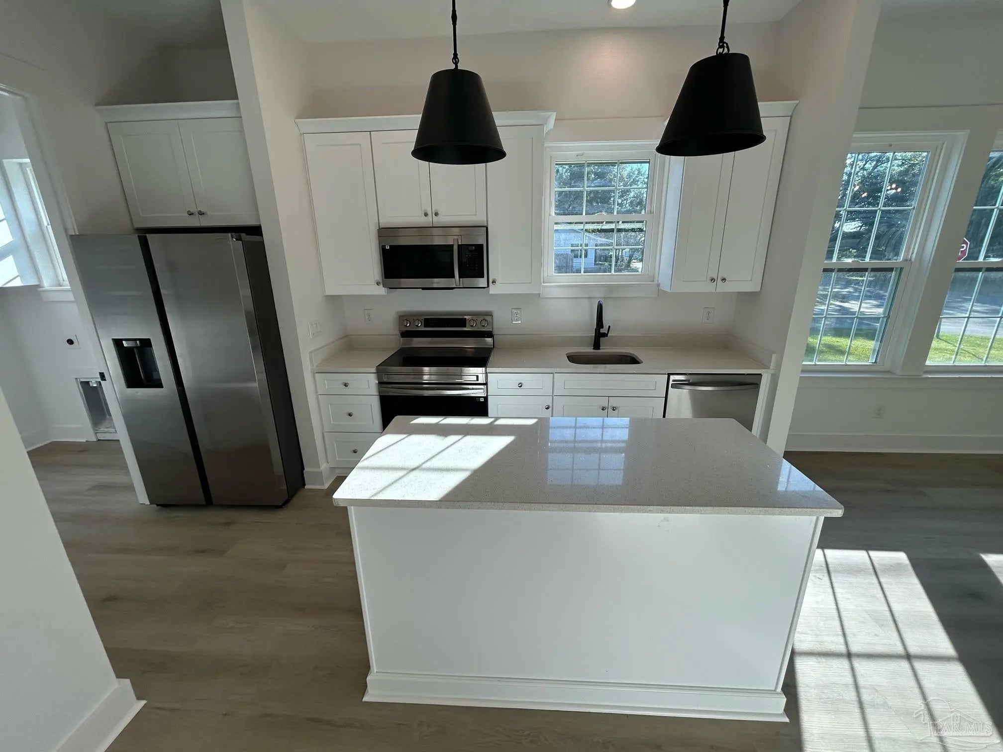 Welcome home to this brand-new 3-bedroom, 2-bath residence offering modern design and an affordable path to homeownership. This thoughtfully designed open-concept floor plan features a spacious living and dining area that flows seamlessly into a beautiful kitchen complete with stainless steel appliances, quartz countertops, and ample cabinetry—perfect for everyday living and entertaining. The light-filled interior showcases luxury vinyl plank flooring throughout in a soft, neutral palette. The primary suite includes a private en-suite bathroom, while the second bedroom features convenient direct access to the hall bath, making it ideal for guests or shared living. A third bedroom provides flexible space perfect for a home office, playroom, or guest room. Ideally located convenient to downtown Pensacola. This newly constructed home was built through a Community Land Trust program in partnership with Habitat for Humanity and the Home Builders Association, offering down payment assistance for qualified buyers and an exceptional opportunity for affordable homeownership. Owner occupancy is required; rental use is not permitted. Buyers must meet specific program guidelines and approval requirements.