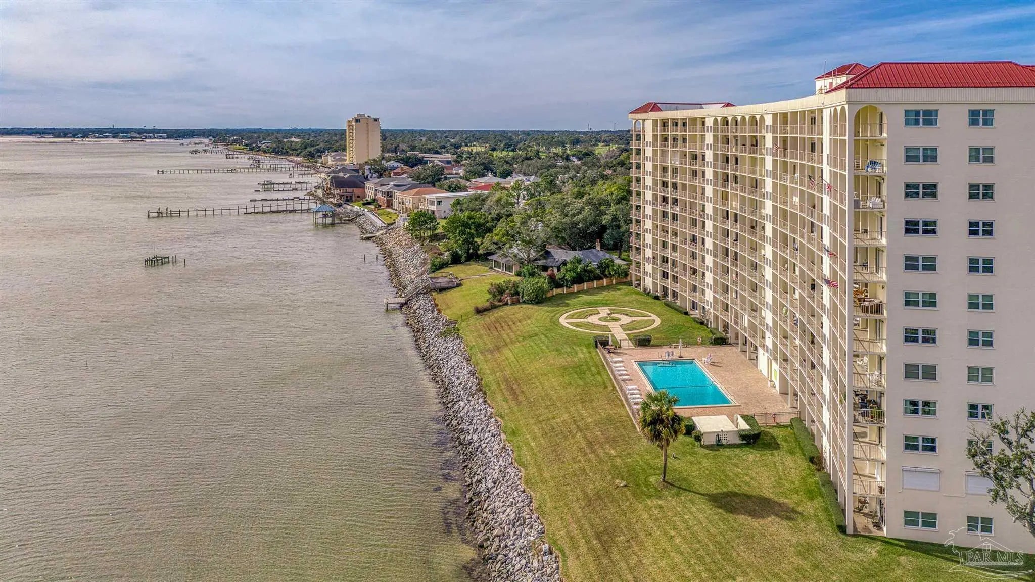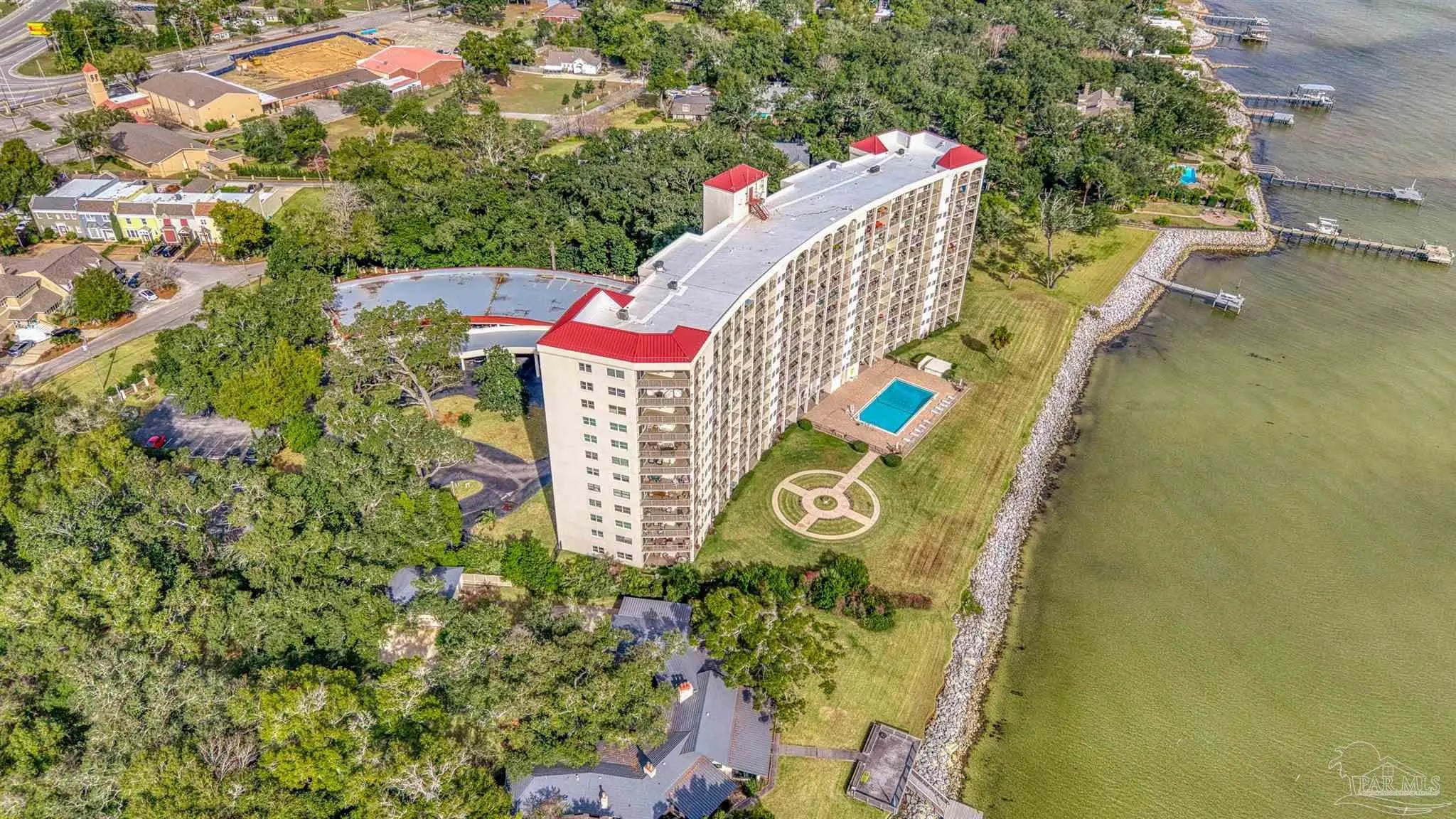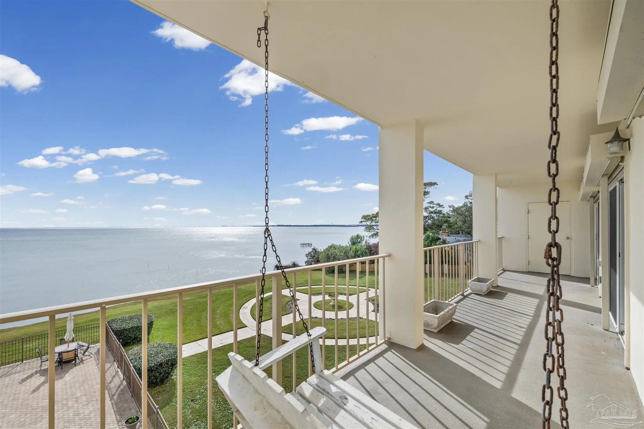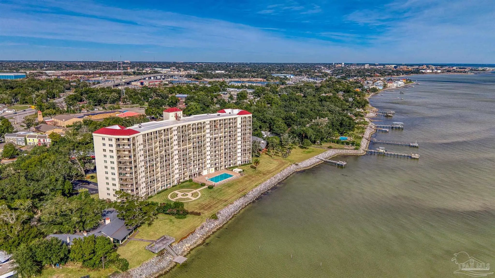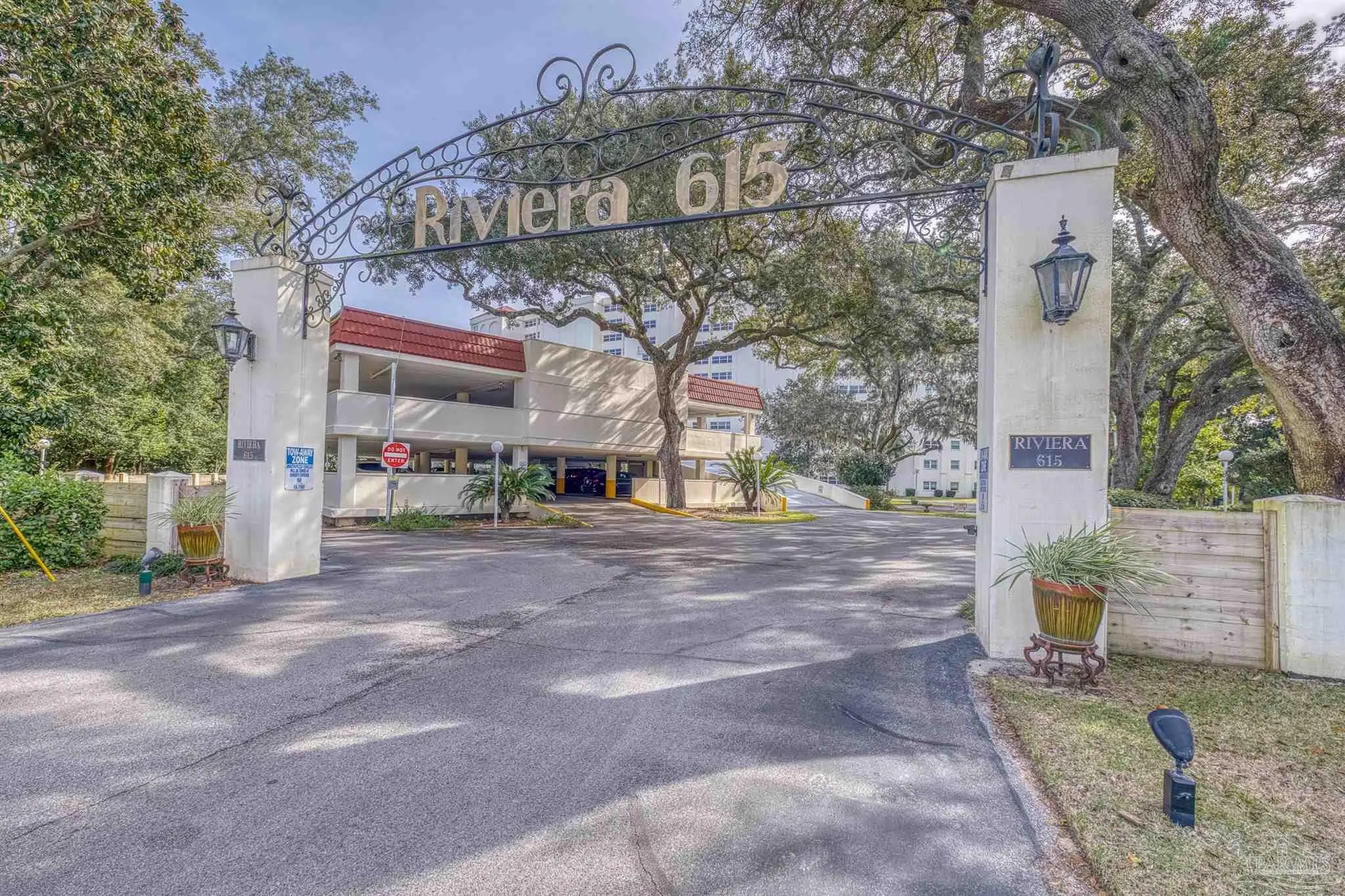 Beautiful 3rd floor Waterfront Riviera condominium with amazing views of Pensacola Bay. Enjoy the beautiful sunsets and the majestic Blue Angels practice from the 35-foot balcony with storage closet, or from the master bedroom, living room or den. The Riviera offers carefree living with 24/7 security, garage parking, car wash area, beautifully maintained grounds, and a lobby with a doorman to welcome you home. The first floor of the building includes a community room with a grand piano, library, and sitting areas. Riviera’s beautiful patio and pool overlook Pensacola Bay. This spacious unit is being sold fully furnished. The floor plan offers beautiful views from the living/dining room, bedroom, and den, each with hurricane-rated sliding glass doors and electric storm shutters. The HVAC system is less than 2 years old. The eat-in kitchen has a ceiling fan, generous cabinet storage with built-in wine rack, new dishwasher and disposal, a table, chairs, and a large pantry. The master bath has a brand-new walk-in shower and vanity sink. The master bedroom closet is very spacious and the owner used it as a combination small office/closet. The master bedroom features a ceiling fan and includes a sitting area. The seller modified the original second bedroom and created a den with a beautiful built-in bookshelf and a ceiling fan. If desired, the den can easily be converted back to a second bedroom. Just off the den is the guest bath and a hall closet set up for clothing or storage. The guest bath has a brand-new vanity and tub/shower. Also included is a large, lockable storage room across the hall from the unit. Each floor of the building has its own dedicated washers and dryers. The seller is offering a generous credit so the buyer can select new paint and flooring to match their tastes. Located minutes from the Pensacola Country Club, the Pensacola Yacht Club, downtown, shopping and our local beaches.