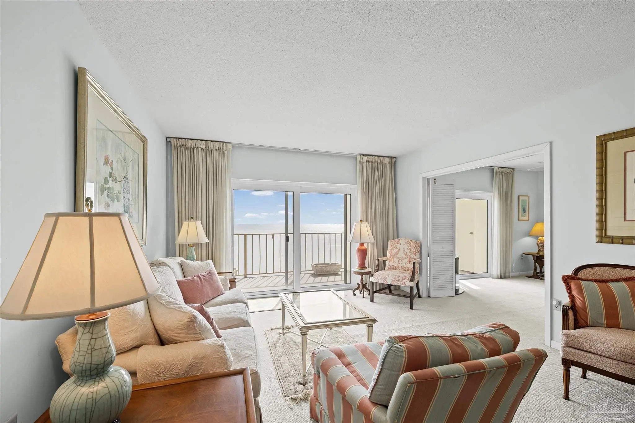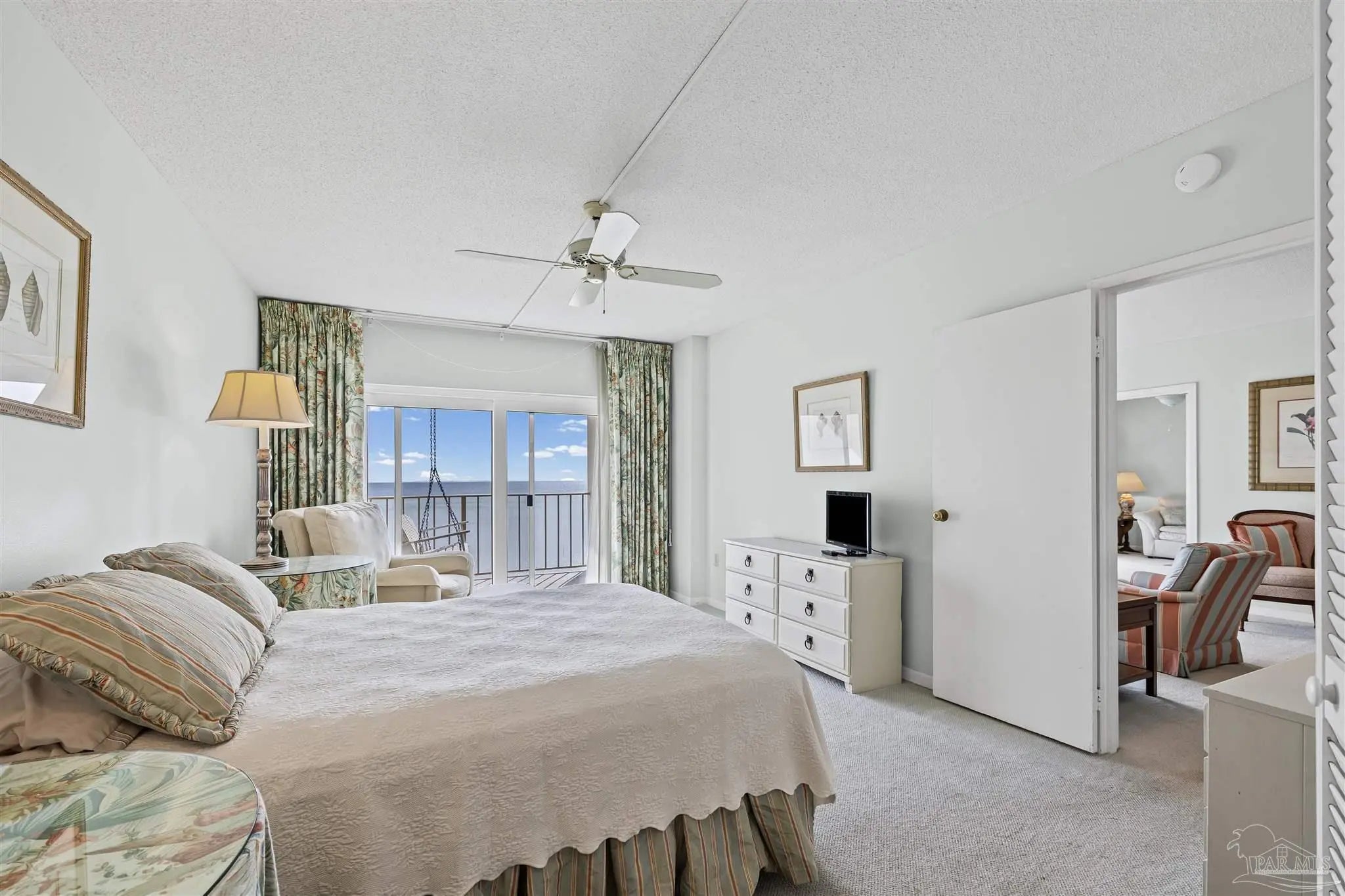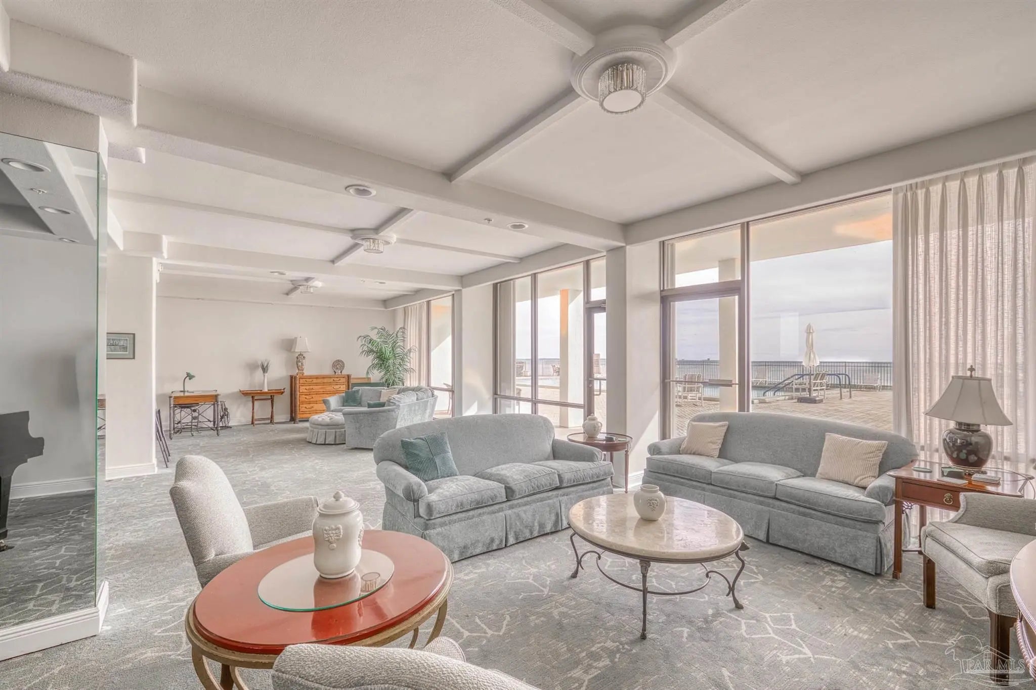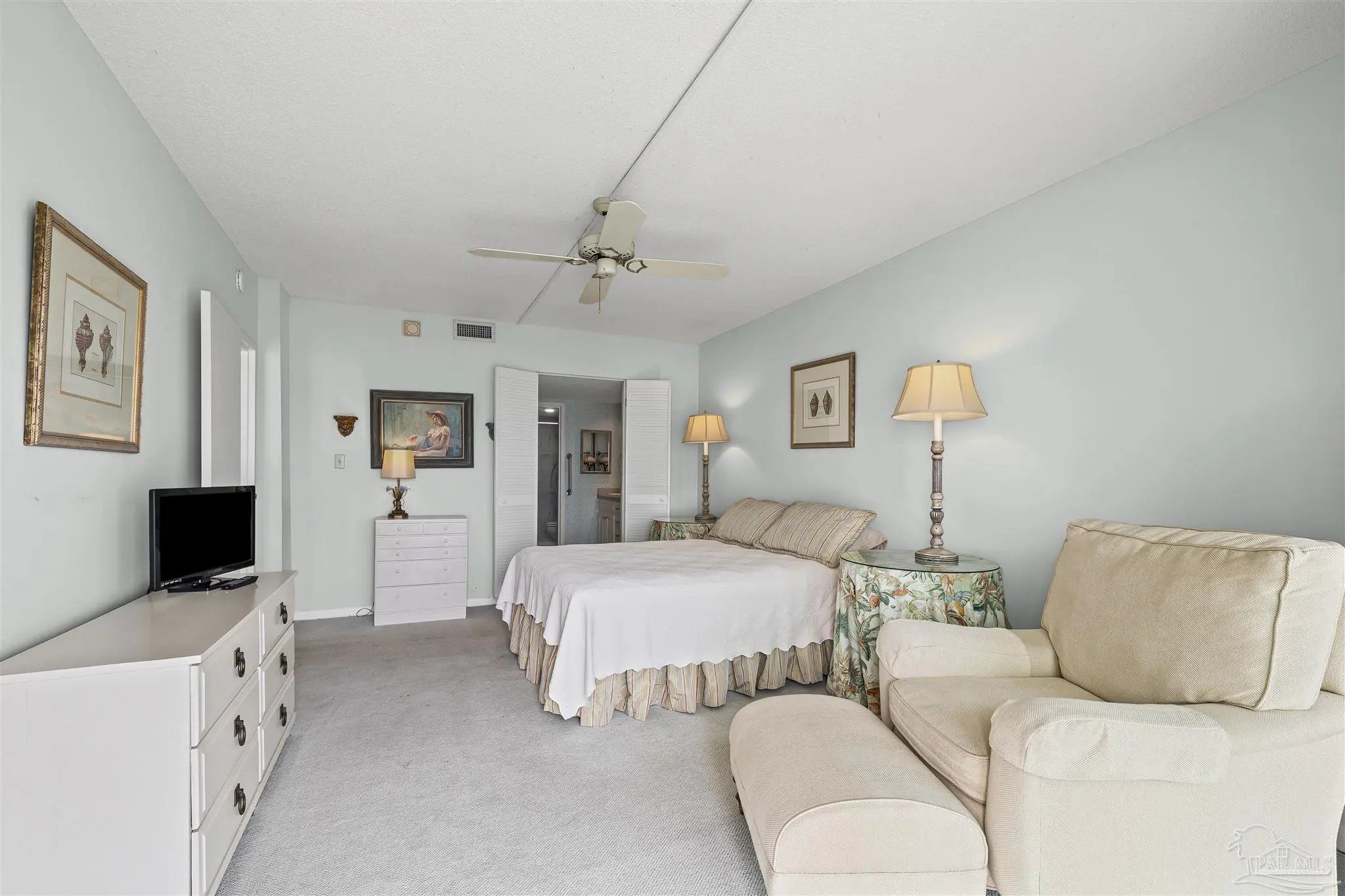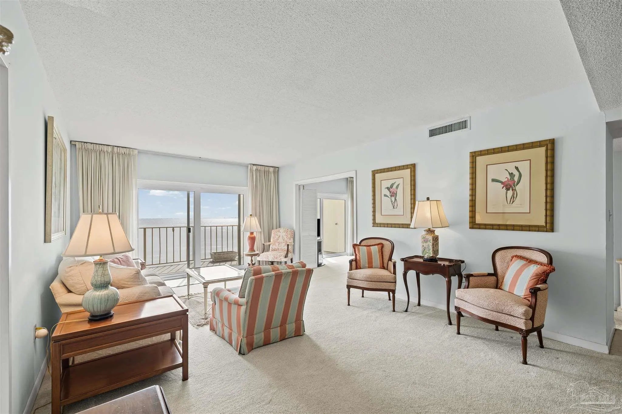 Beautiful 3rd floor Waterfront Riviera condominium with amazing views of Pensacola Bay. Enjoy the beautiful sunsets and the majestic Blue Angels practice from the 35-foot balcony with storage closet, or from the master bedroom, living room or den. The Riviera offers carefree living with 24/7 security, garage parking, car wash area, beautifully maintained grounds, and a lobby with a doorman to welcome you home. The first floor of the building includes a community room with a grand piano, library, and sitting areas. Riviera’s beautiful patio and pool overlook Pensacola Bay. This spacious unit is being sold fully furnished. The floor plan offers beautiful views from the living/dining room, bedroom, and den, each with hurricane-rated sliding glass doors and electric storm shutters. The HVAC system is less than 2 years old. The eat-in kitchen has a ceiling fan, generous cabinet storage with built-in wine rack, new dishwasher and disposal, a table, chairs, and a large pantry. The master bath has a brand-new walk-in shower and vanity sink. The master bedroom closet is very spacious and the owner used it as a combination small office/closet. The master bedroom features a ceiling fan and includes a sitting area. The seller modified the original second bedroom and created a den with a beautiful built-in bookshelf and a ceiling fan. If desired, the den can easily be converted back to a second bedroom. Just off the den is the guest bath and a hall closet set up for clothing or storage. The guest bath has a brand-new vanity and tub/shower. Also included is a large, lockable storage room across the hall from the unit. Each floor of the building has its own dedicated washers and dryers. The seller is offering a generous credit so the buyer can select new paint and flooring to match their tastes. Located minutes from the Pensacola Country Club, the Pensacola Yacht Club, downtown, shopping and our local beaches.