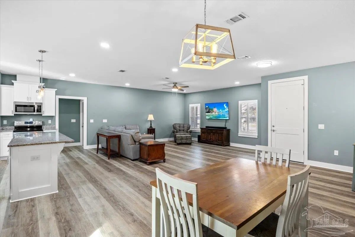 Welcome home to this spacious 4 bedroom home, 2 bath residence featuring a desirable split floor plan and a 2 car garage, perfectly designed for comfort and privacy. The open concept layout showcases granite countertops, stainless steel appliances, all wood cabinetry, and a pantry, complemented by luxury vinyl plank flooring throughout - no carpet anywhere for easy maintenance. The primary suite offers a relaxing retreat with an extra large walk-in closet. The additional bedrooms are generally sized. Enjoy outdoor living with both a large covered front porch and a covered back porch, ideal for morning coffee. Backyard is fenced in with woods behind the fence. Located in Holley By The Sea HOA community, residents enjoy exceptional amenities including a recreation center, tennis courts, fully equipped gym, basketball court, swimming pool, sauna, and a scenic waterfront park, along with many additional features for an active lifestyle. This home combines space, style, and resort-style living - an excellent opportunity you won't want to miss.