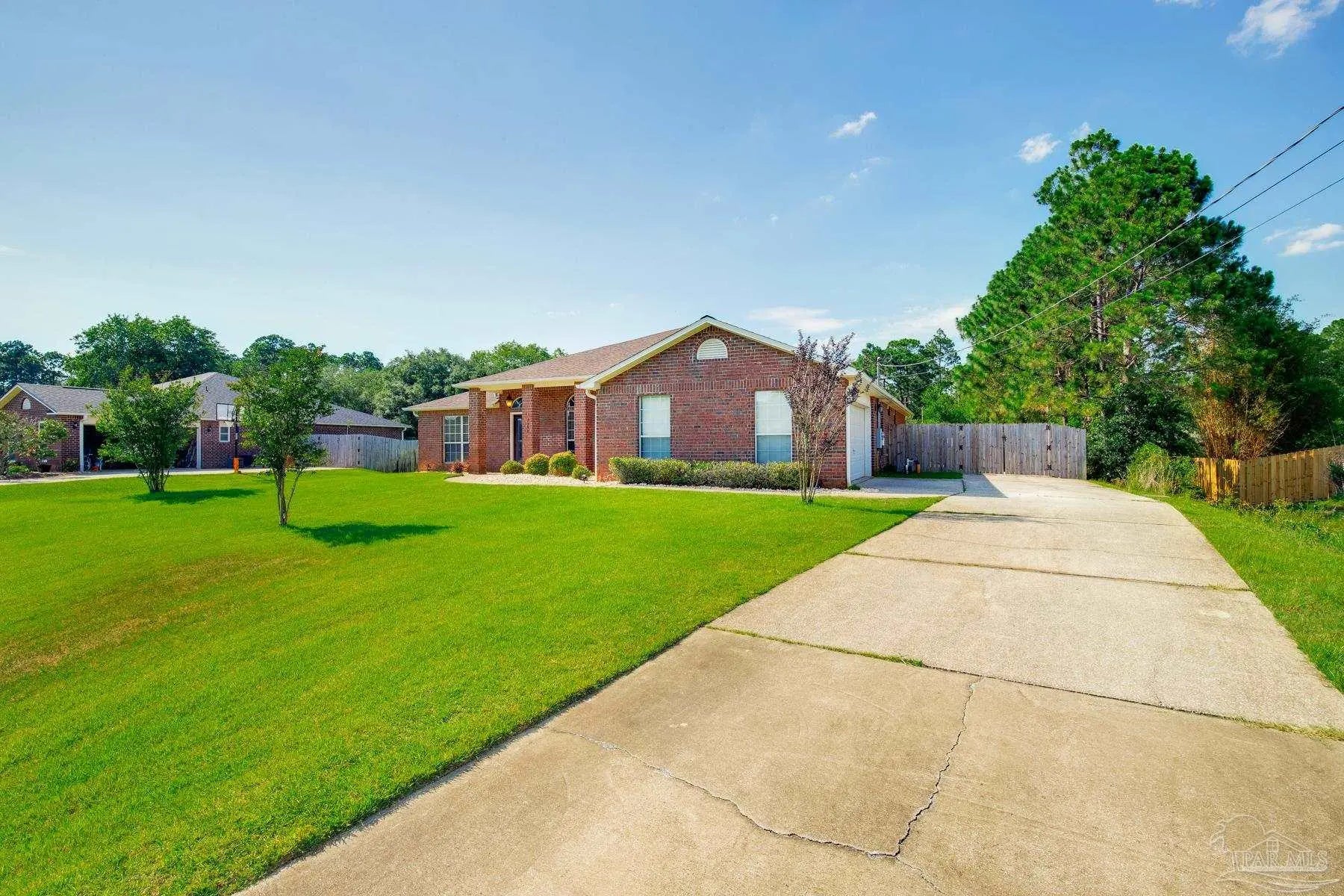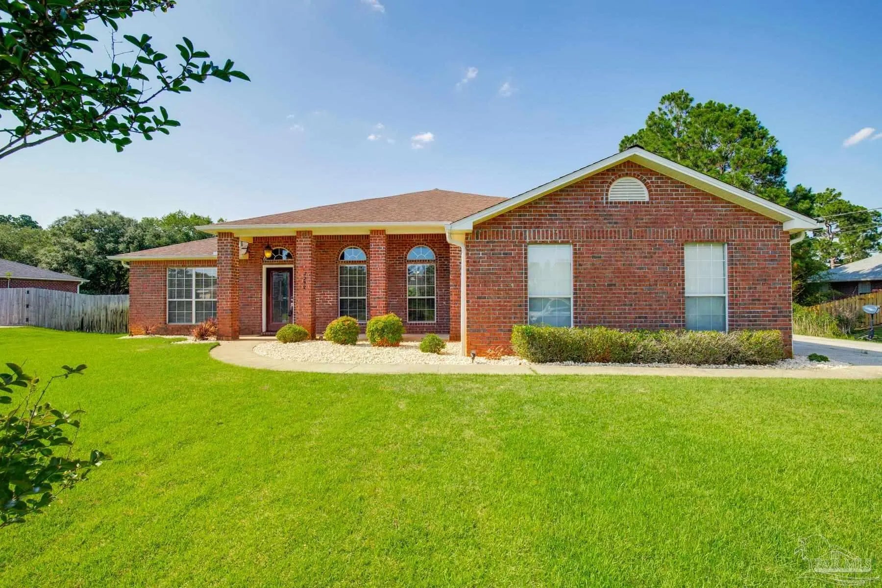 Welcome to this meticulously maintained brick home in Navarre's Holley By The Sea neighborhood! This spacious property boasts 4 bedrooms, 3 full bathrooms, an office space or bonus room, and a formal dining space. Situated on a 0.453 acre lot with a generous sized fenced in backyard and an extended concrete pad from the side entrance garage and driveway - PERFECT for additional parking or storing your boat or RV behind the gate. Inside this split floor plan home, you'll find gorgeous wood-look waterproof flooring throughout the kitchen, dining, and main living spaces. The eat-in kitchen is a chef's DREAM- with stainless steel appliances, breakfast bar, plenty of cabinet and counter space, pantry, and kitchen island. Looking over the breakfast bar into the living room, you'll see the fireplace and the slider doors that lead to the covered, tiled patio in the beautifully landscaped backyard. Ready for your outdoor entertaining! The primary bedroom has its own wing of the house - just off the living room.Featuring a spa-like ensuite with double vanity, soaking tub, separate walk-in shower, water closet, and a fantastic oversized closet! On the other side of the house, you'll find the additional bathroom, 3 additional bedrooms - 2 of which share a Jack & Jill bathroom - and the laundry room. Roof replaced in 2014. Brand new HVAC system in 2022, and new water heater in 2021.Outside fence and gates were replaced in 2023. The property also has a garden box, Lawn Pump/Sprinklers, a shed out back for extra storage, and no neighbors behind you. Another perk - enjoy access to all of Holley By The Sea's amenities with your HOA membership - including a boat ramp, 8 clay tennis courts, a community event hall, 3 different pools, exercise room, and more!Schedule your showing today and make this house your HOME!