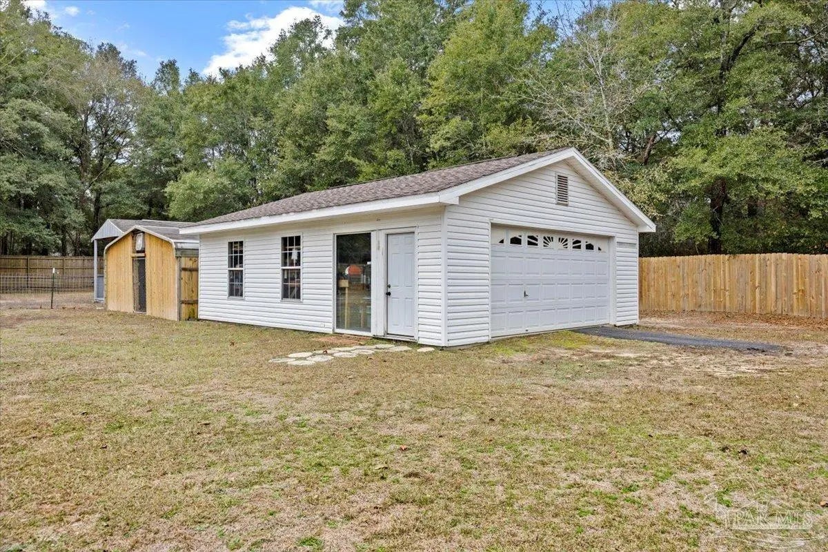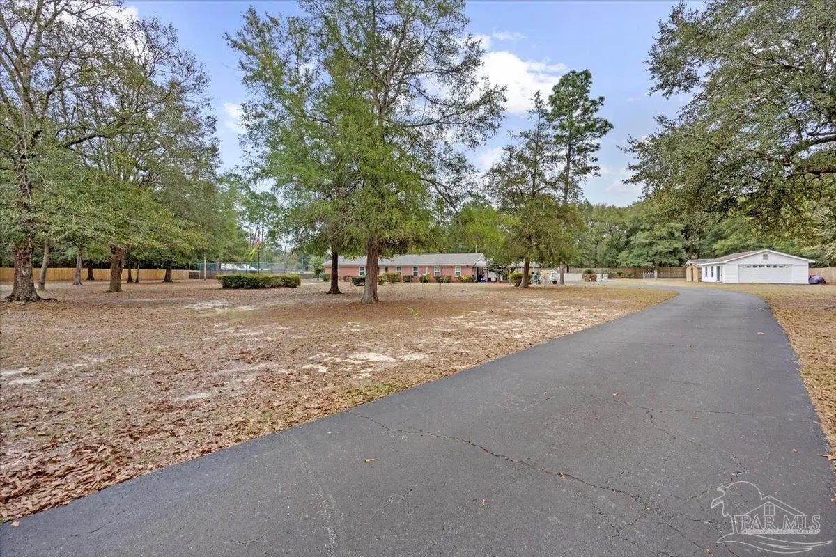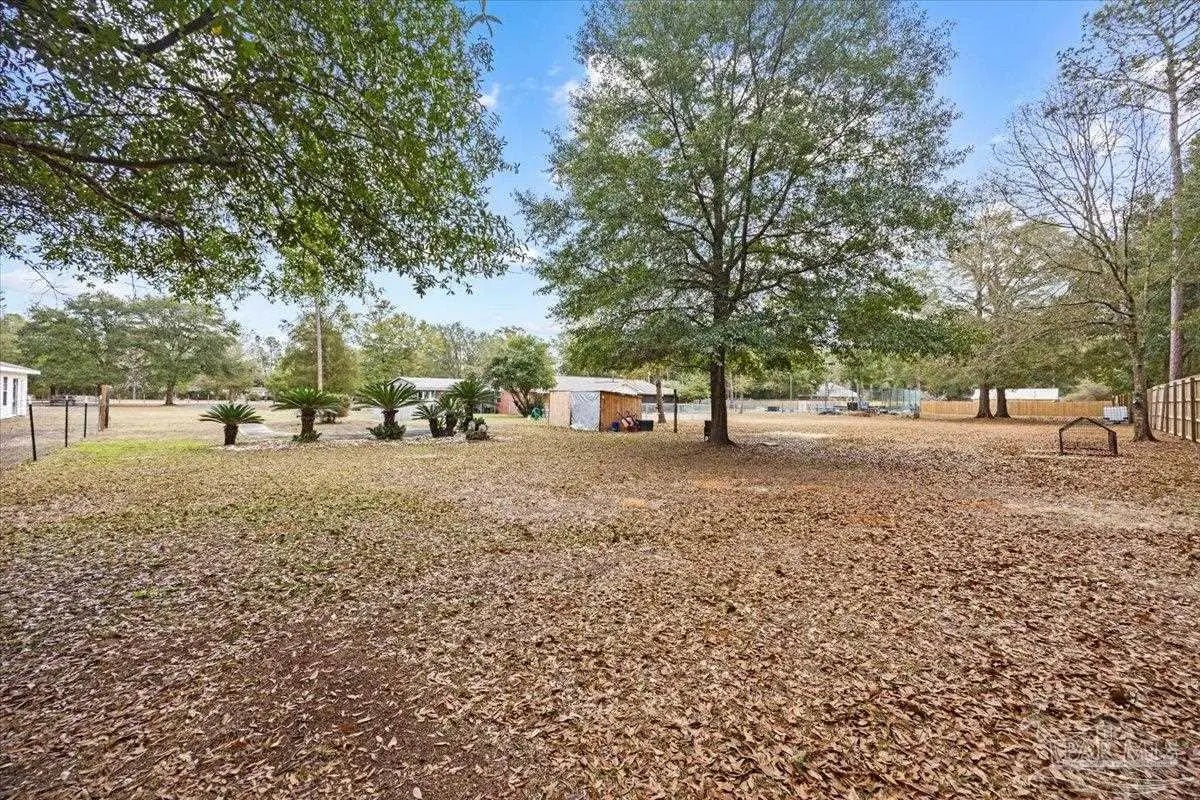 Welcome to 5637 Camellia Ave in Milton — a true homesteader’s paradise set on 2.5 fully usable acres with space, flexibility, and upgrades that are hard to find. This 3-bedroom, 3-bath home offers 2,633 square feet of living space with wood laminate flooring throughout the main areas and tile in all bathrooms. A fully fenced property with an electric gated entry provides privacy and security, while mature fruit trees, open land, and multiple outbuildings create endless possibilities for hobby farming, animals, storage, or future expansion. The kitchen has been completely renovated and is the heart of the home, featuring new blue cabinetry, granite countertops, stainless steel appliances, a farm sink, and a center island. A formal dining room and spacious living room offer comfortable gathering spaces, complemented by updated light fixtures throughout. The primary bedroom includes an ensuite bath with granite counters and private doors leading directly to the screened porch. One secondary bedroom features built-in shelving, while another offers an oversized layout ideal for flexible use. A converted two-car garage adds exceptional functionality, offering a full bathroom, wood laminate flooring, a mini-split AC unit, and a full laundry room with extra storage — perfect for a bonus living area, home office, or guest space. Additional highlights include a sunroom with AC, a huge screened porch, a new above-ground pool, tennis court, carport, chain-link dog run, and two barns or animal-ready outbuildings with pens for chickens, goats, or other livestock. Major systems are already in place with a Generac whole-house generator, HVAC less than four years old, and a roof replaced in 2019. A detached two-car garage provides even more storage or the potential to convert into a guest house. This property delivers space, versatility, and self-sufficiency in a peaceful Milton setting — a rare opportunity for buyers looking to live, work, and grow on their own land.