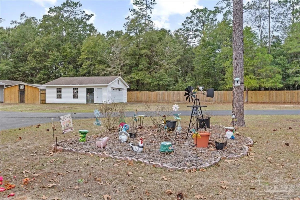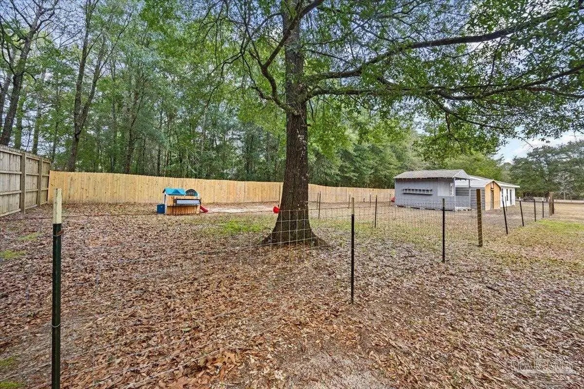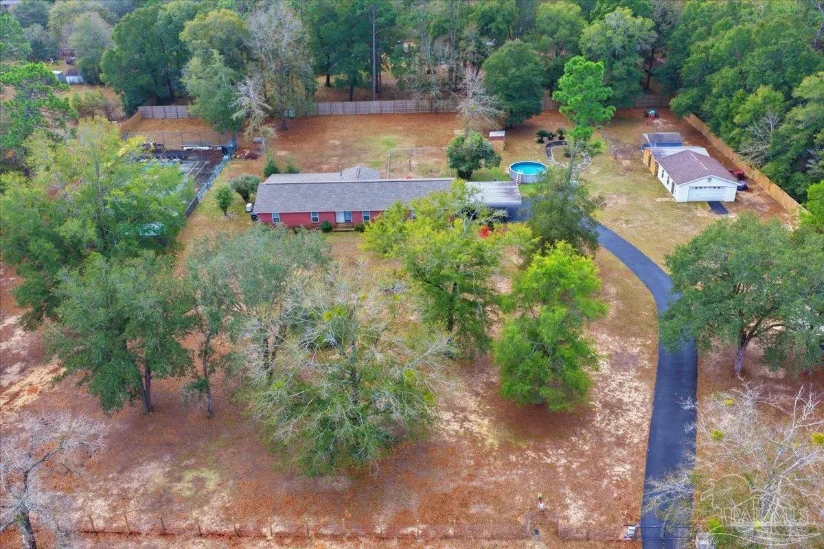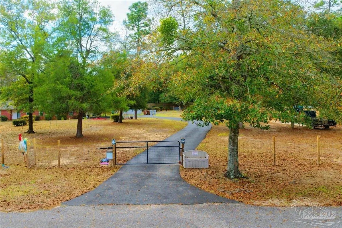 Welcome to 5637 Camellia Ave in Milton — a true homesteader’s paradise set on 2.5 fully usable acres with space, flexibility, and upgrades that are hard to find. This 3-bedroom, 3-bath home offers 2,633 square feet of living space with wood laminate flooring throughout the main areas and tile in all bathrooms. A fully fenced property with an electric gated entry provides privacy and security, while mature fruit trees, open land, and multiple outbuildings create endless possibilities for hobby farming, animals, storage, or future expansion. The kitchen has been completely renovated and is the heart of the home, featuring new blue cabinetry, granite countertops, stainless steel appliances, a farm sink, and a center island. A formal dining room and spacious living room offer comfortable gathering spaces, complemented by updated light fixtures throughout. The primary bedroom includes an ensuite bath with granite counters and private doors leading directly to the screened porch. One secondary bedroom features built-in shelving, while another offers an oversized layout ideal for flexible use. A converted two-car garage adds exceptional functionality, offering a full bathroom, wood laminate flooring, a mini-split AC unit, and a full laundry room with extra storage — perfect for a bonus living area, home office, or guest space. Additional highlights include a sunroom with AC, a huge screened porch, a new above-ground pool, tennis court, carport, chain-link dog run, and two barns or animal-ready outbuildings with pens for chickens, goats, or other livestock. Major systems are already in place with a Generac whole-house generator, HVAC less than four years old, and a roof replaced in 2019. A detached two-car garage provides even more storage or the potential to convert into a guest house. This property delivers space, versatility, and self-sufficiency in a peaceful Milton setting — a rare opportunity for buyers looking to live, work, and grow on their own land.