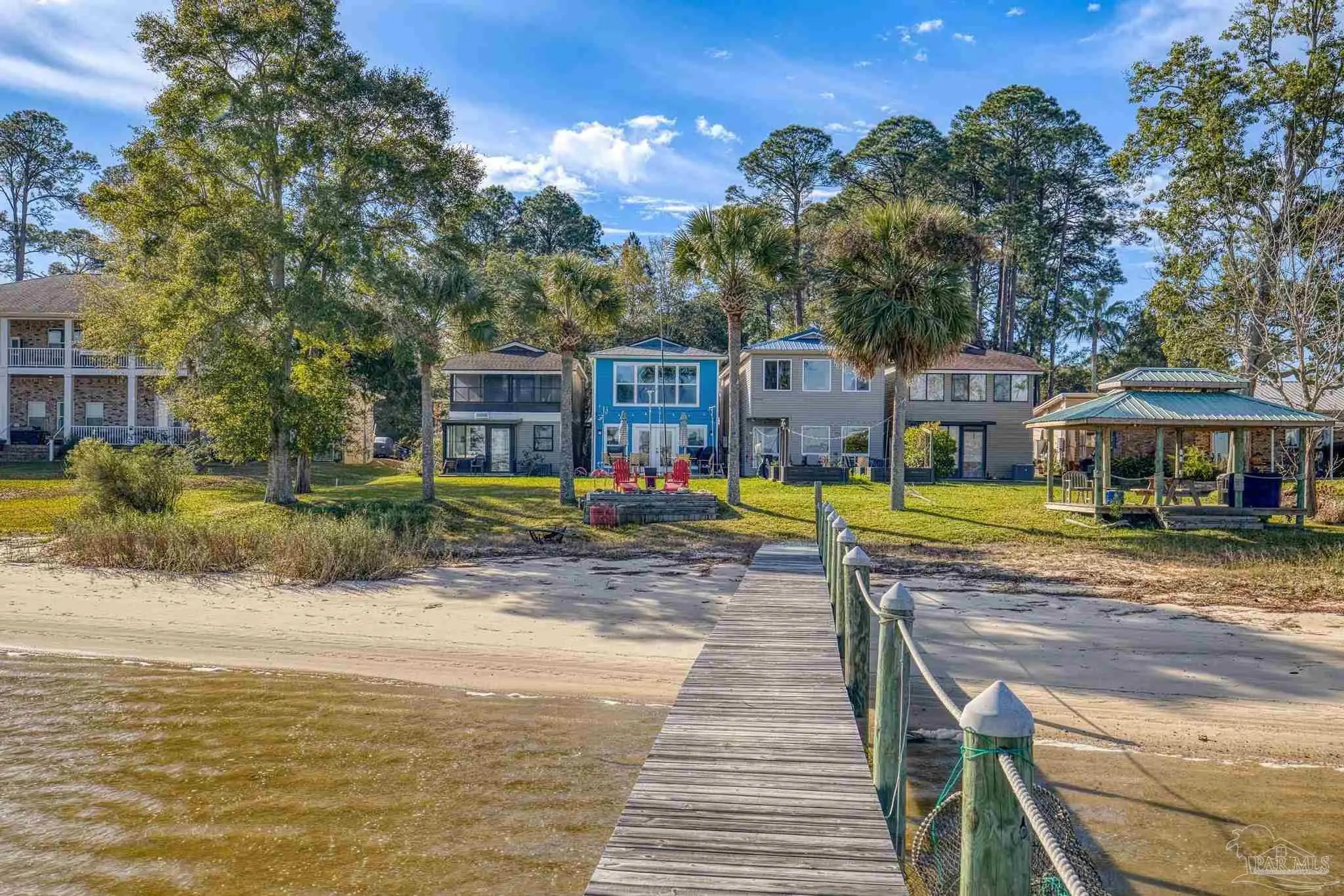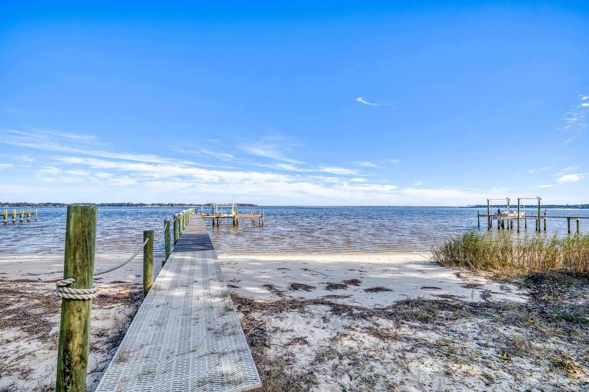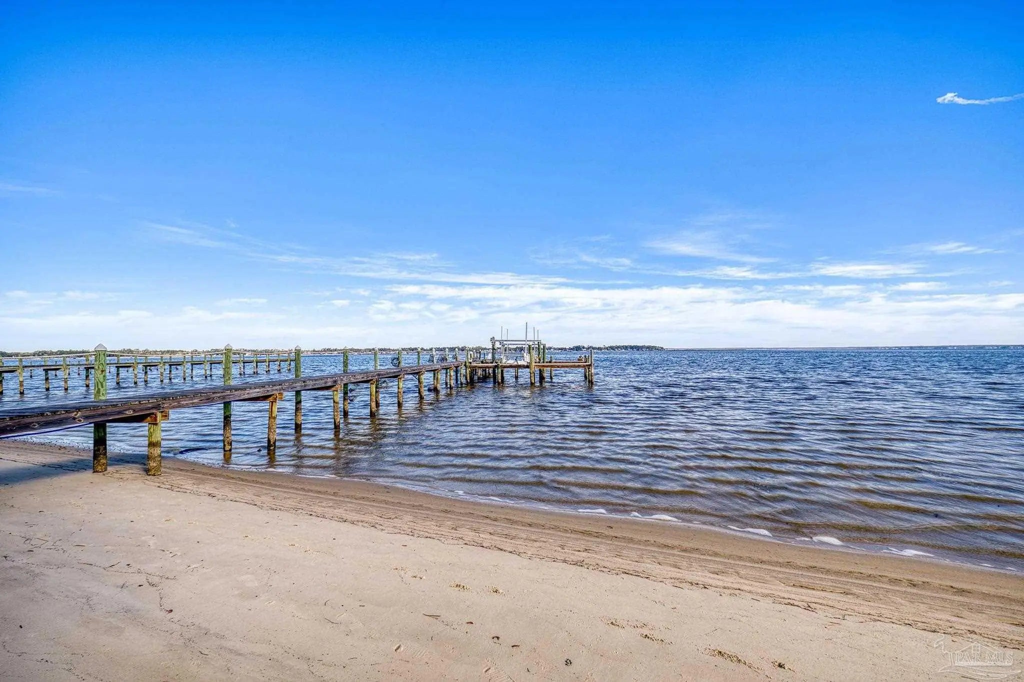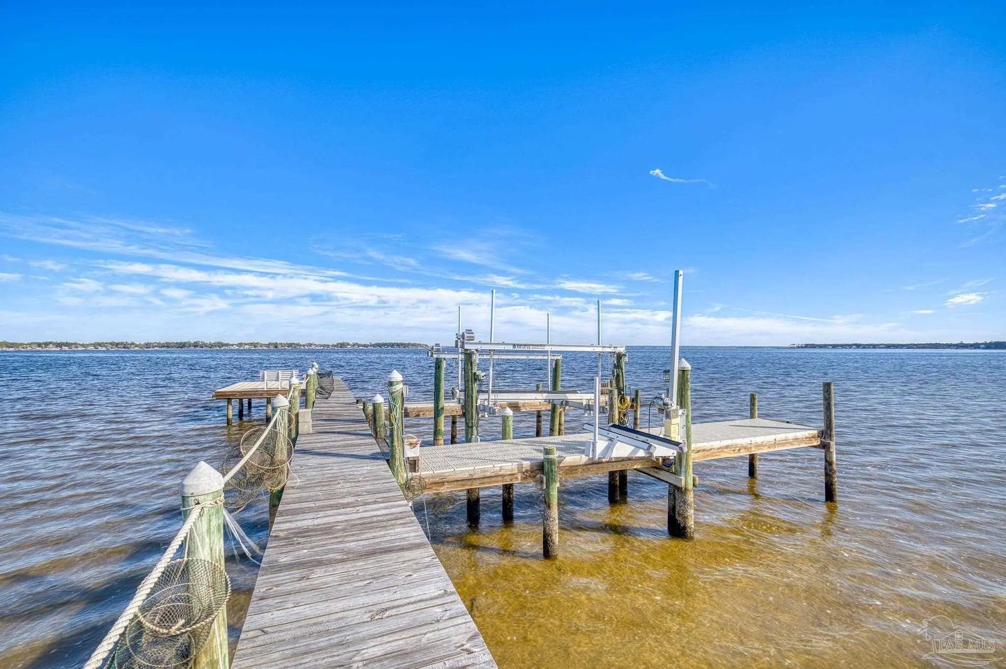 Wake up to sunshine, salt air, and sweeping views of Perdido Bay in this exceptional waterfront retreat, where coastal living meets everyday comfort. Enjoy peaceful mornings watching the water, afternoons on the bay, and evenings cooled by gentle breezes—all at a price point rarely found for this setting. The open-concept main living area is thoughtfully designed for both relaxation and entertaining, featuring a spacious family room ideal for taking in bay views and vibrant sunsets. The kitchen is well appointed with custom mocha cabinetry, granite countertops, stainless steel appliances, and a breakfast bar, while the adjoining dining area offers a scenic waterfront backdrop. French doors off the main living space open to an inviting patio, extending your living area outdoors. A full bathroom is located on the main level, with two generously sized bedrooms and two full bathrooms upstairs. The oversized primary suite offers flexible space for a home office, reading nook, or sitting area, all complemented by calming water views and unforgettable sunsets. The secondary bedroom is equally spacious and includes ample closet storage. Outdoor and waterfront amenities truly set this property apart, with access to a gazebo and an impressive 165-foot pier featuring a privately owned boat lift, ski lift, and viewing area—perfect for boating, fishing, or simply enjoying the bay. Storage is abundant, including a large storage unit nearly the size of a one-car garage and an additional shed ideal for water toys and outdoor gear. Well-maintained landscaping enhances both the front and rear outdoor spaces. Conveniently located near NAS, the Naval Hospital, and approximately 15 minutes from downtown Pensacola, shopping, and dining, this home offers a rare blend of waterfront lifestyle, convenience, and value in one remarkable opportunity.