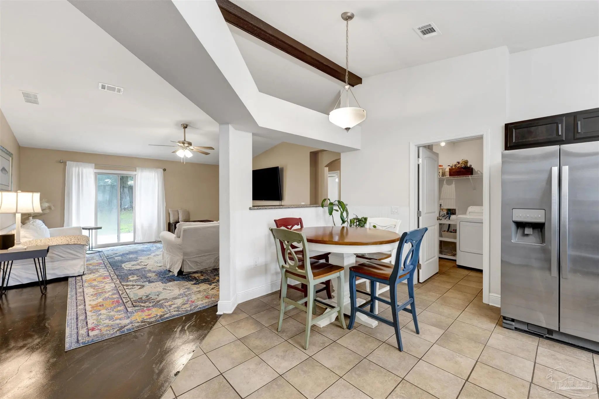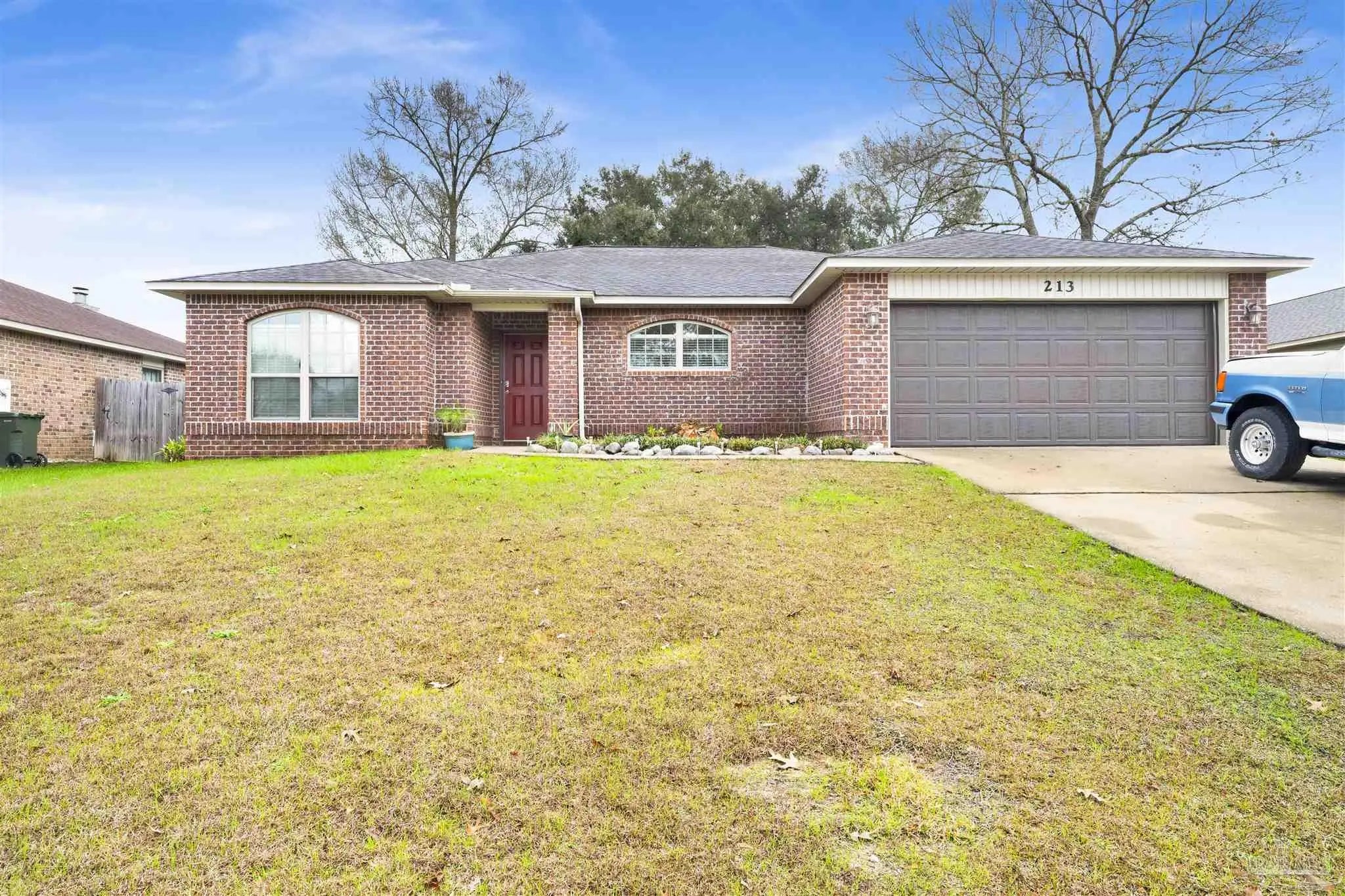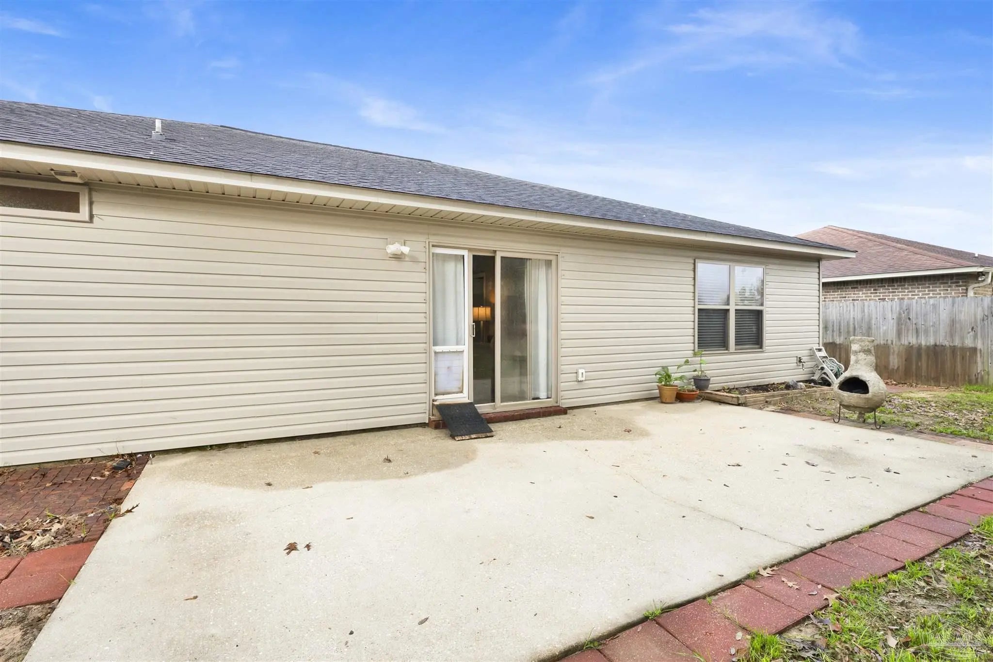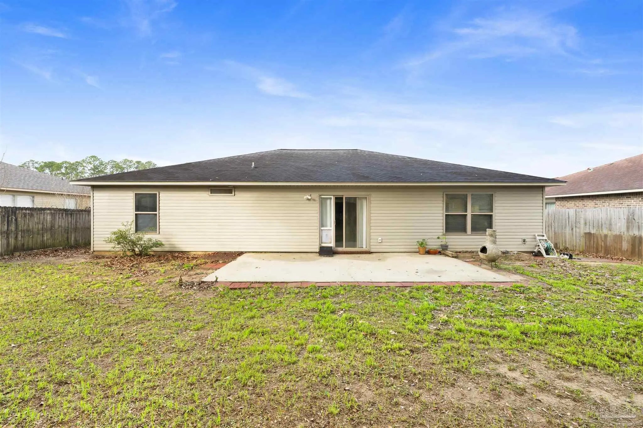 This well-designed 4-bedroom, 2-bath home offers a great floor plan and an inviting open living concept perfect for everyday living and entertaining. From the tiled foyer, you step into a spacious great room highlighted by beautiful stained concrete flooring, a soaring cathedral ceiling with a decorative beam, and a sliding glass door that opens to the backyard. The large eat-in kitchen features tile flooring, a center island, granite countertops, a pantry, and stainless steel appliances, providing both style and functionality. The split-bedroom floor plan ensures privacy for the primary suite, which includes a generous bedroom with stained concrete flooring. The ensuite bath offers tile flooring, double vanities, his-and-her walk-in closets, a relaxing garden tub, and a separate walk-in shower. Additional bedrooms are nicely sized with ample closet space, while the secondary full bath includes a single vanity and a tub/shower combination. The laundry room is conveniently located off the kitchen and provides access to the two-car garage. Outside, the privacy-fenced backyard features an open patio—ideal for outdoor entertaining or simply enjoying your own private space.