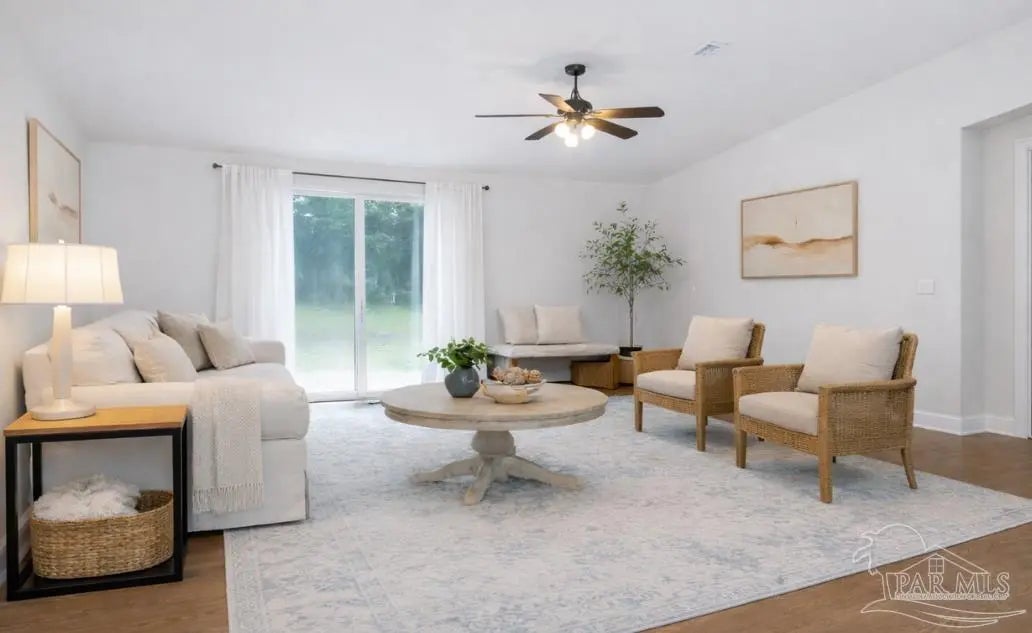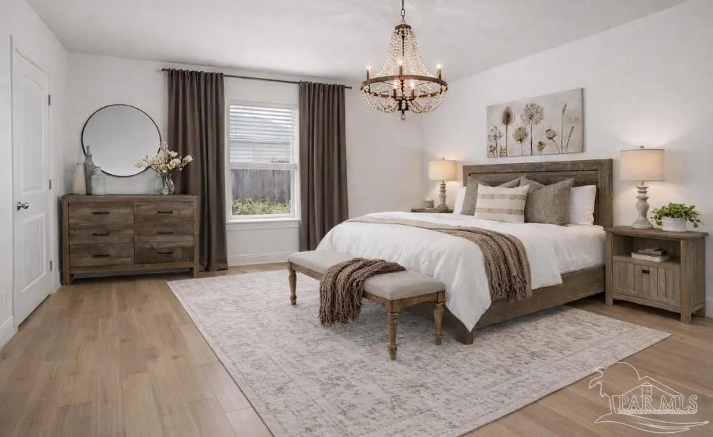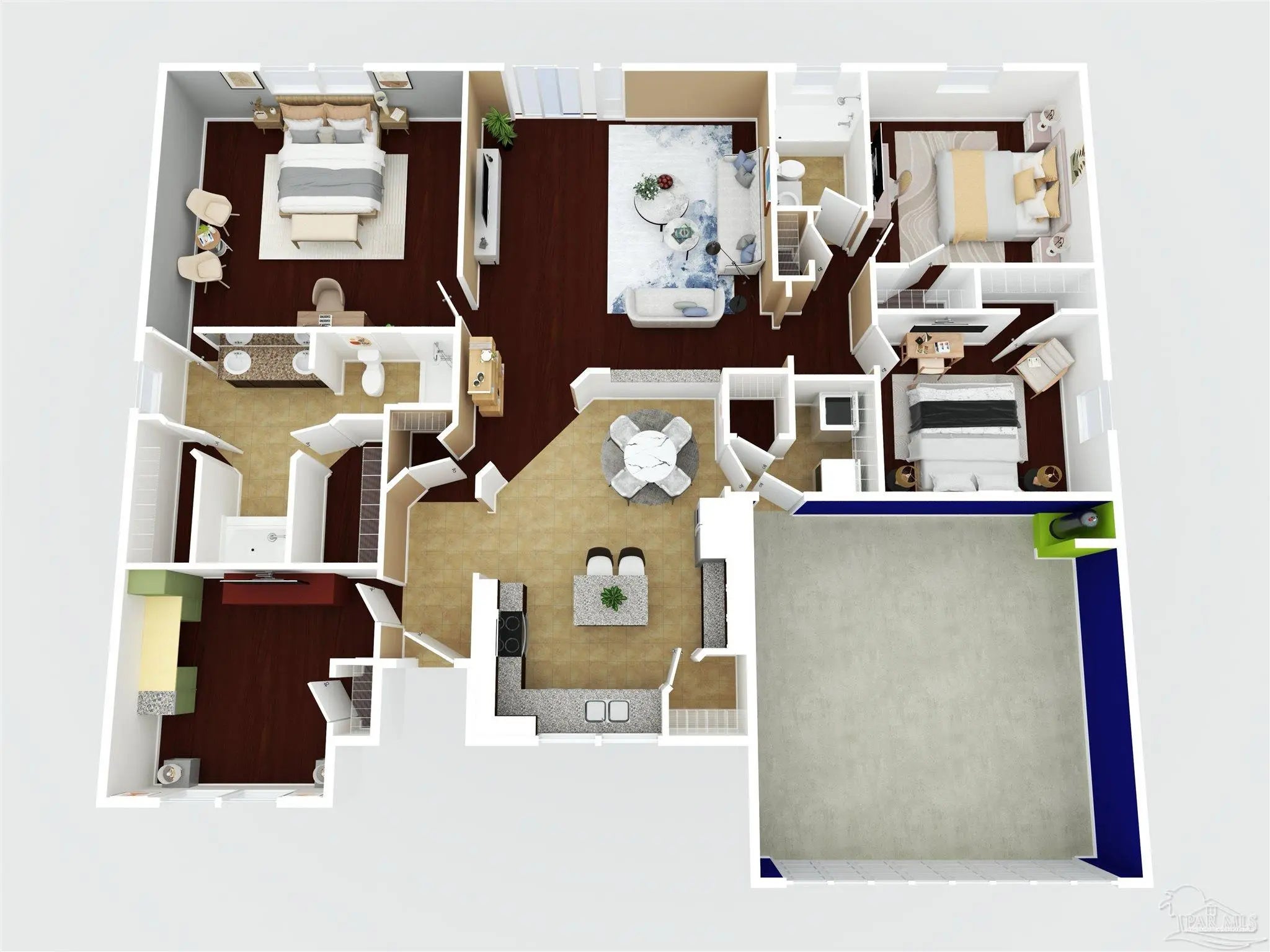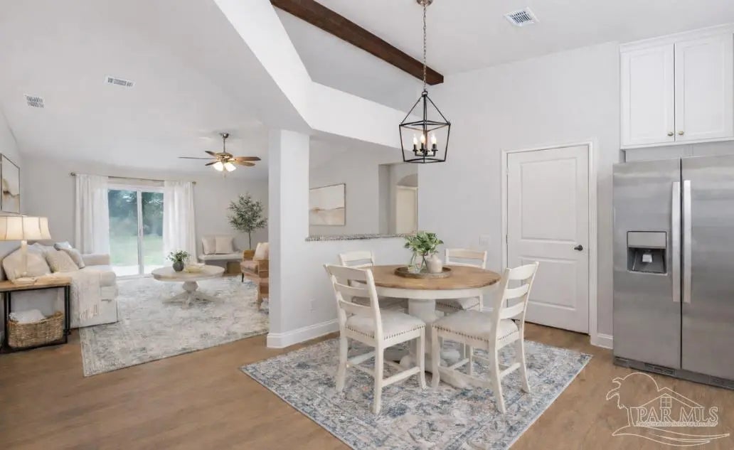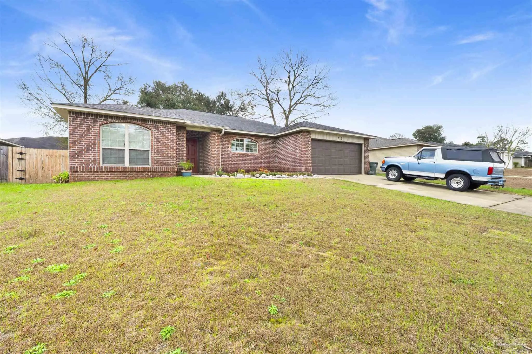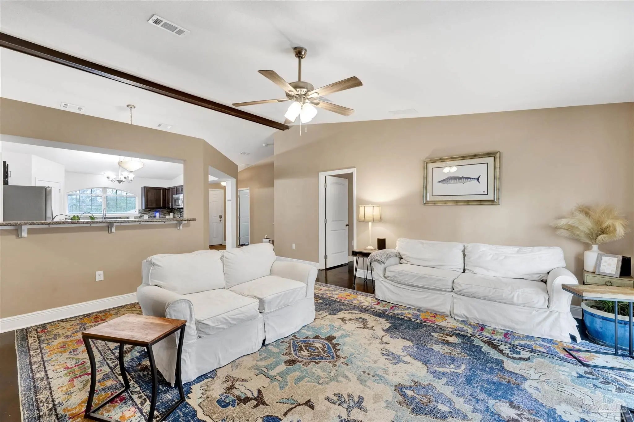 This well-designed 4-bedroom, 2-bath home offers a great floor plan and an inviting open living concept perfect for everyday living and entertaining. From the tiled foyer, you step into a spacious great room highlighted by beautiful stained concrete flooring, a soaring cathedral ceiling with a decorative beam, and a sliding glass door that opens to the backyard. The large eat-in kitchen features tile flooring, a center island, granite countertops, a pantry, and stainless steel appliances, providing both style and functionality. The split-bedroom floor plan ensures privacy for the primary suite, which includes a generous bedroom with stained concrete flooring. The ensuite bath offers tile flooring, double vanities, his-and-her walk-in closets, a relaxing garden tub, and a separate walk-in shower. Additional bedrooms are nicely sized with ample closet space, while the secondary full bath includes a single vanity and a tub/shower combination. The laundry room is conveniently located off the kitchen and provides access to the two-car garage. Outside, the privacy-fenced backyard features an open patio—ideal for outdoor entertaining or simply enjoying your own private space.