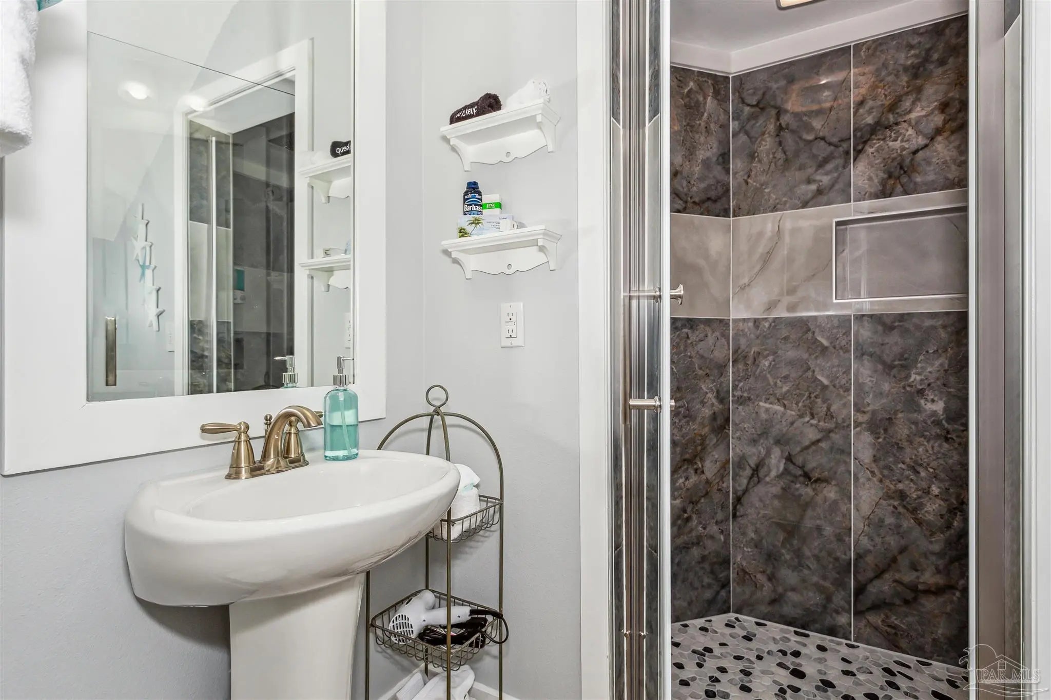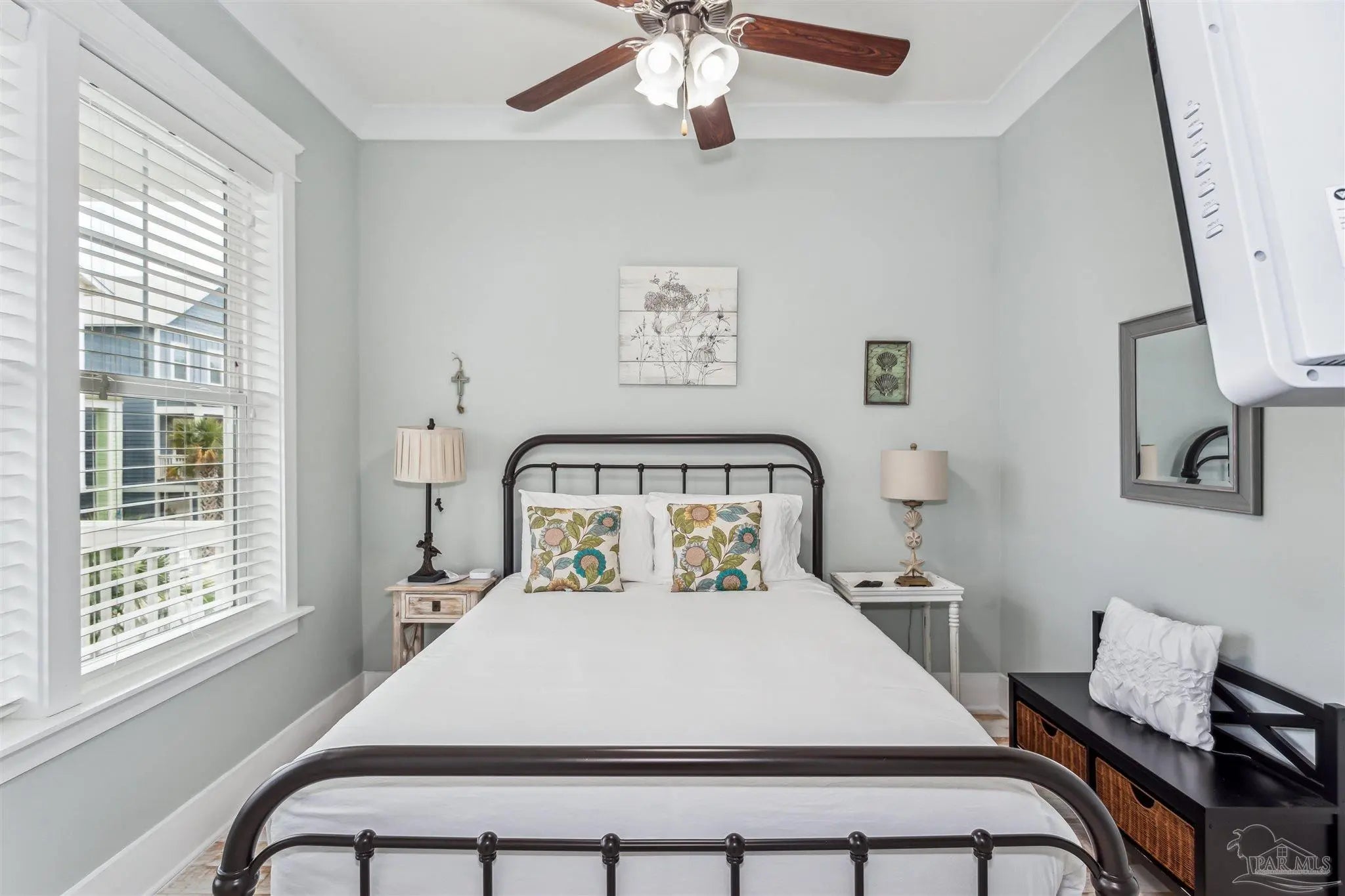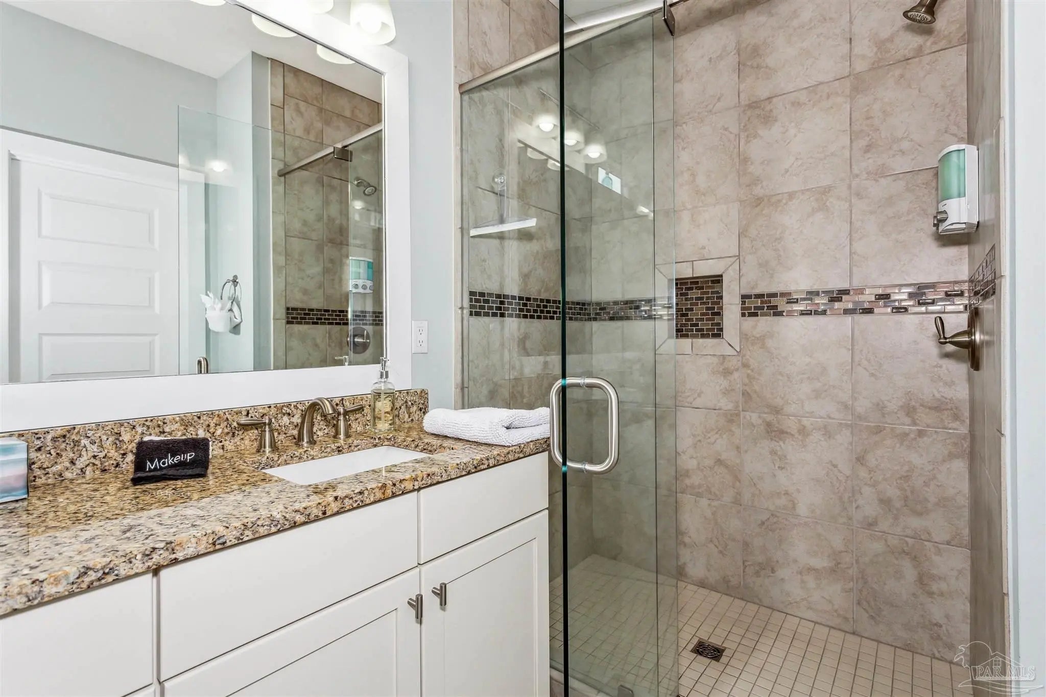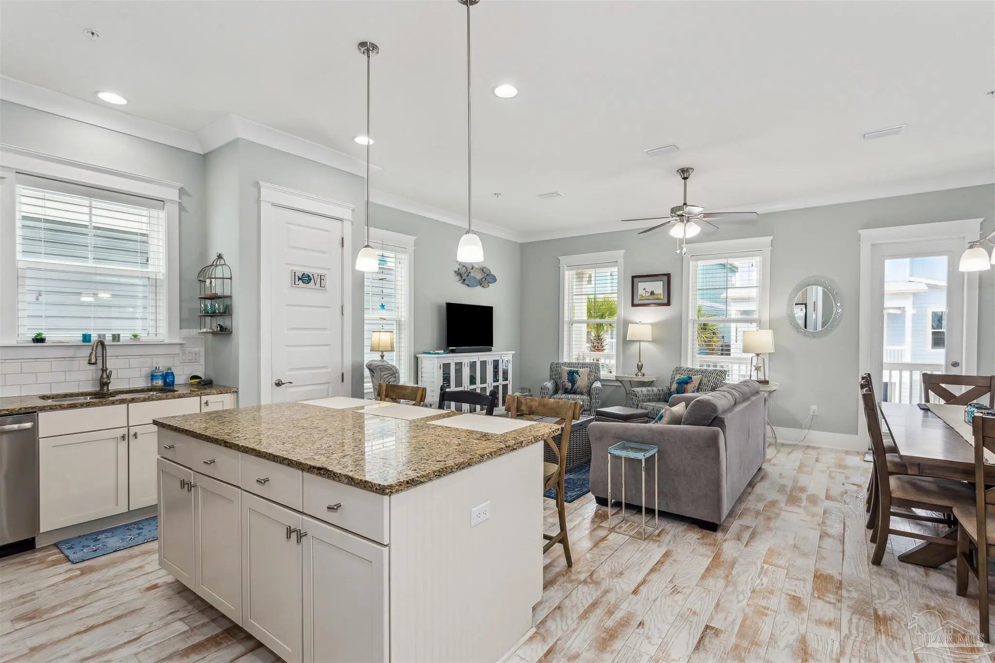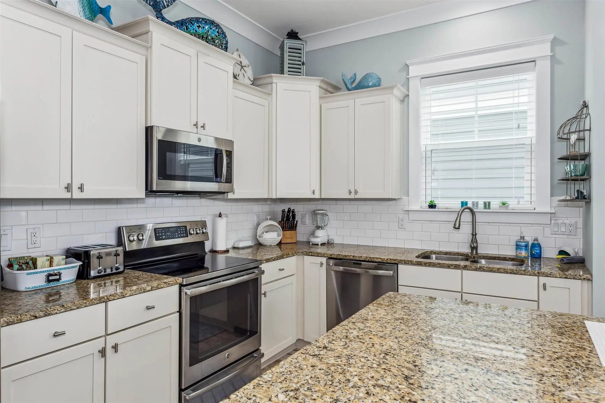 Experience the ultimate in coastal living in this gated waterfront community featuring a pool and a private beach on the Santa Rosa Sound (Intracoastal)—perfect for swimming, fishing, kayaking, and paddleboarding. This beautifully furnished “Seaside Cottage” offers 4 bedrooms and 3 baths, showcasing thoughtful design and elegant finishes throughout. The main living area features white-washed wood flooring, square-edge custom cottage trim, tall framed windows, designer paint, heavy crown molding, eight-foot doors, and soaring 9- to 10-foot ceilings. The open-concept kitchen is a dream for any cook, complete with tall solid-wood soft-close cabinetry, granite countertops, a tiled backsplash, stainless steel appliances, a pantry, and a large island with seating. The kitchen flows seamlessly into the great room and dining area, opening onto a wide balcony where you can relax and enjoy refreshing coastal breezes. The first living level includes a guest bedroom with a queen bed and a full bath conveniently located near the main living spaces. Upstairs, you’ll find two additional guest bedrooms—one with a queen bed and another with a twin-over-full bunk bed—along with a guest bath featuring a granite-top vanity and tiled tub. The spacious primary suite offers a king bed, walk-in closet, and a luxurious bath with a floor-to-ceiling tiled shower. A washer and dryer are conveniently located on the second level. Outdoor living is easy with a first-level patio, newly painted interior and exterior, Polywood outdoor furniture, new sofa and chairs, and impact windows. The home comfortably sleeps 8–10 guests, making it ideal as a vacation rental investment, second home, or primary residence. Ample driveway parking is available on both sides of the home. Just a short walk to the community pool and Sound beach, or minutes from walkovers leading to the Gulf, this home truly offers the best in coastal living. Welcome home!