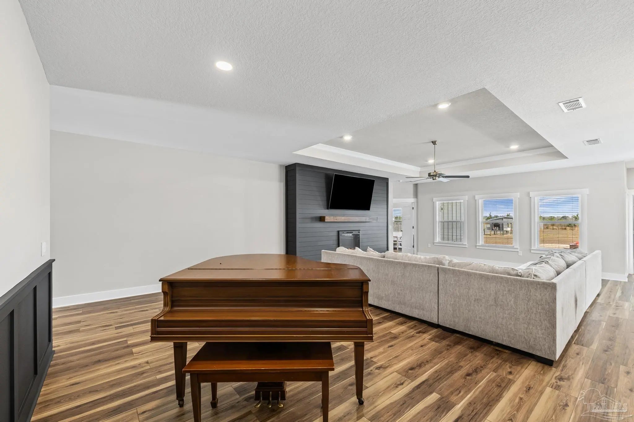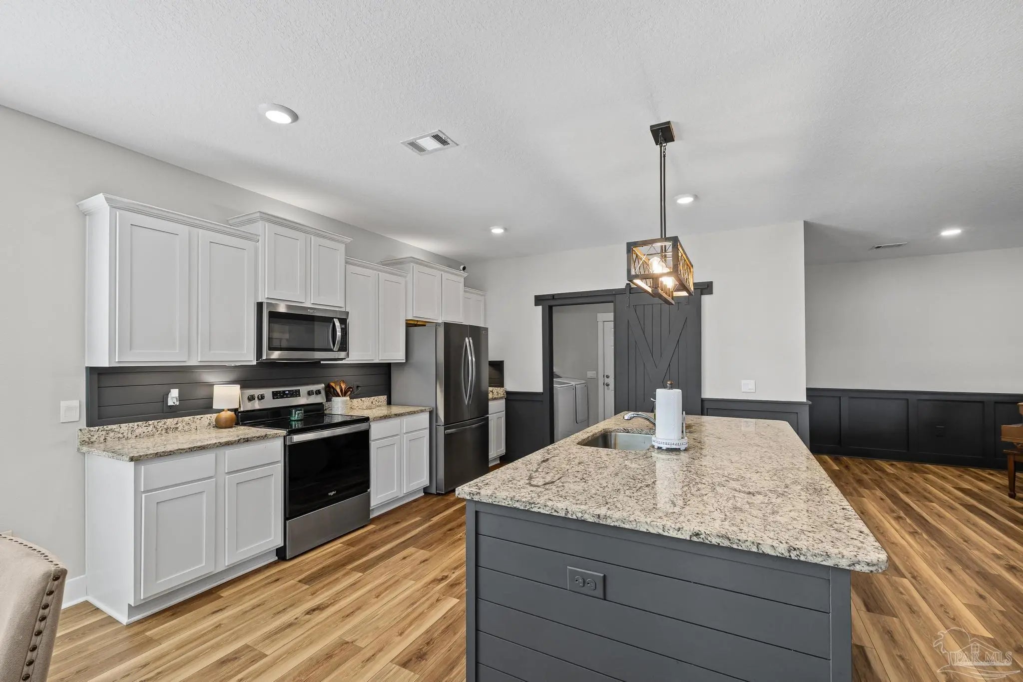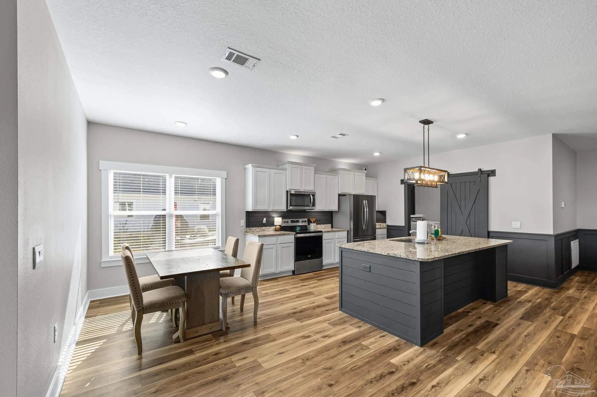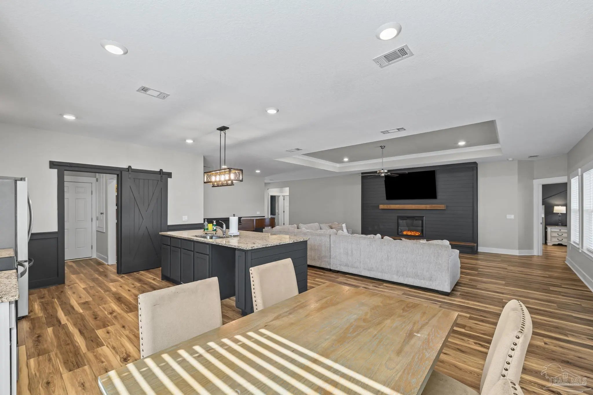 This stunning Destin floor plan offers 4 bedrooms, 3 bathrooms, & an oversized three-car garage, all situated on a full one-acre lot in the sought-after Chase Farms neighborhood. Move-in ready & thoughtfully designed, this single-story home features over 2,300 square feet of living space that blends modern style with everyday comfort. The open-concept layout creates an inviting atmosphere, with a spacious great room that flows seamlessly into the dining area & kitchen, complete with a cozy breakfast nook. The great room showcases a striking accent wall & a beautiful fireplace—perfect for relaxing and enjoying warm, comfortable evenings at home. The kitchen is designed for both function & style, featuring sleek countertops, staggered cabinetry, & a convenient breakfast area ideal for casual meals. Two bedrooms at the front of the home share a full bathroom, offering an ideal setup for guests or family members. The private primary suite is tucked away at the back of the home, providing a quiet retreat. It includes a large walk-in closet, a private water closet, & a primary bathroom accessed through a stylish barn door, combining comfort with thoughtful design. The flooring throughout the home has been upgraded to top of the line LVP, 22 mil thickness, definitely not builder grade —no carpet at all—along with tray ceilings and a barn door entry to the spacious laundry room. Generously sized closets, a walk-in pantry, and the oversized three-car garage provide abundant storage for tools, water toys, and more. Modern convenience is enhanced by a Smart Home package that includes a Kwikset lock, SkyBell doorbell, digital thermostat, Qolsys IQ touch panel, & Echo Dot integration. Step outside to enjoy the covered patio overlooking a fully fenced backyard, perfect for pets, play, or outdoor entertaining. With no HOA, you have the freedom to truly make this property your own. With room to grow both inside & out, this beautiful property is the perfect place to call home.