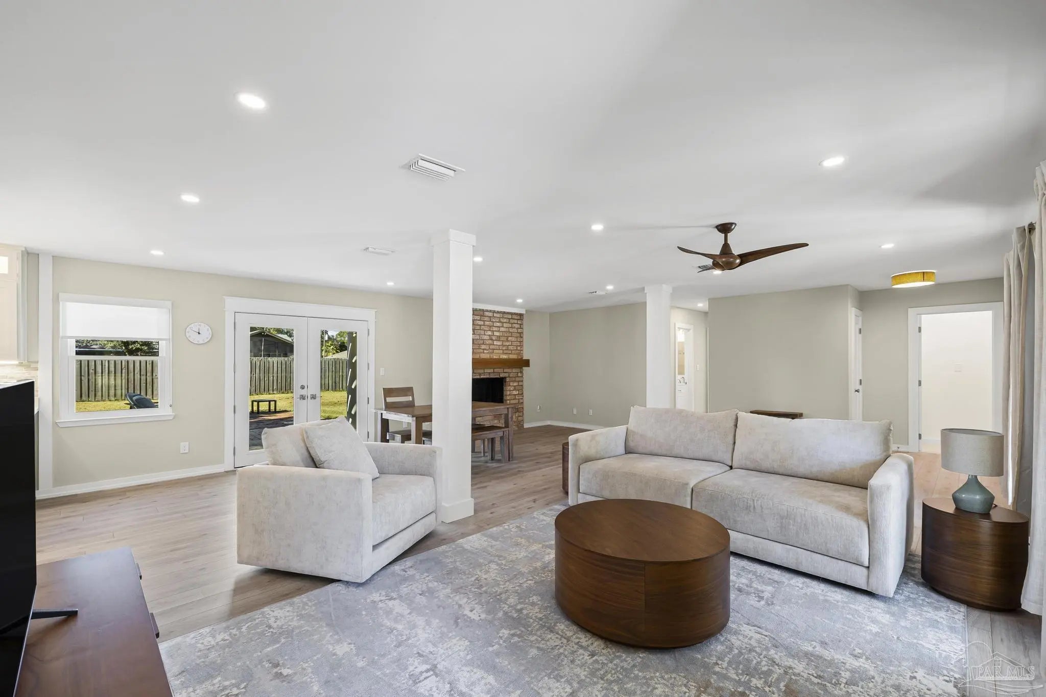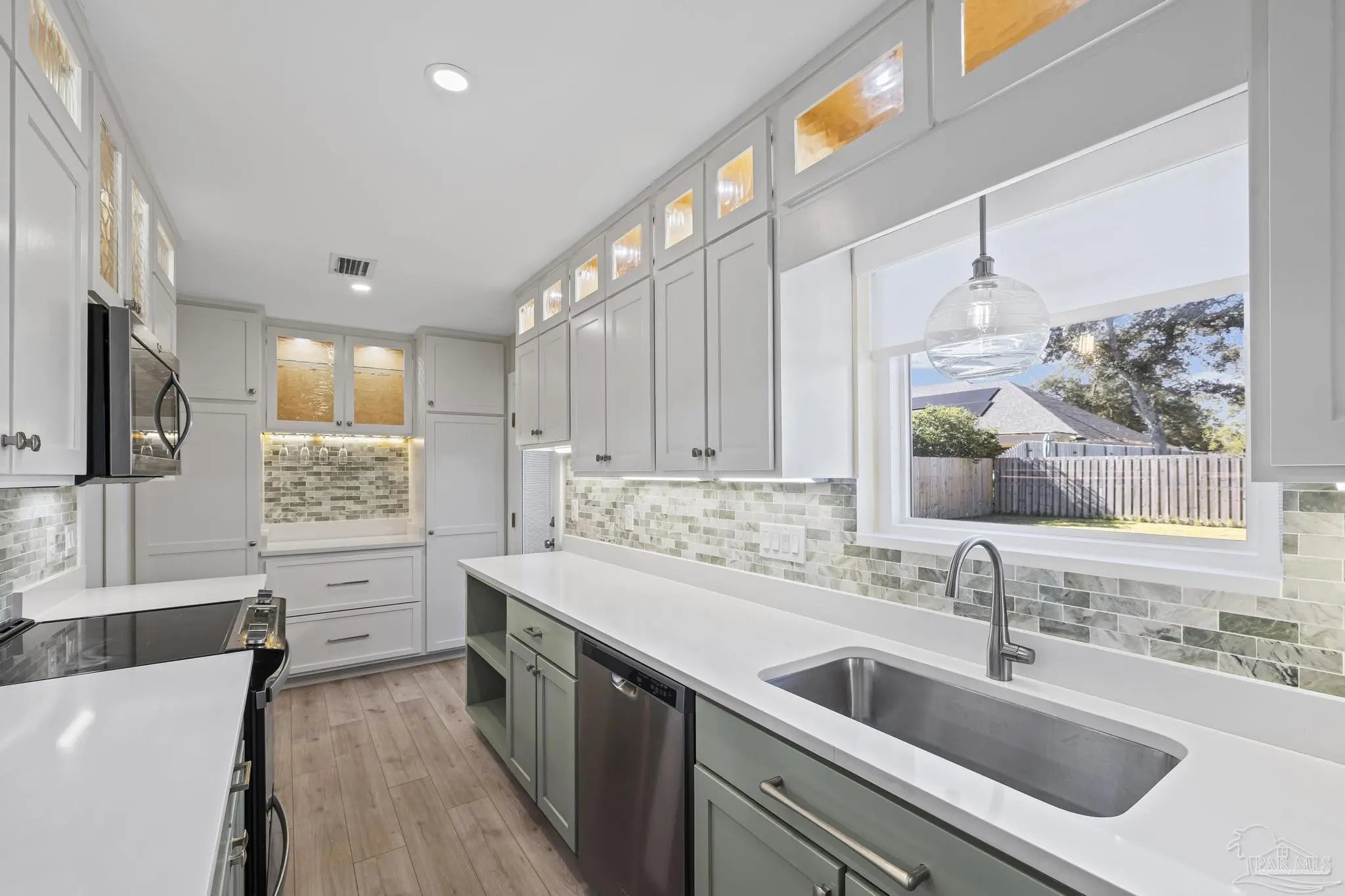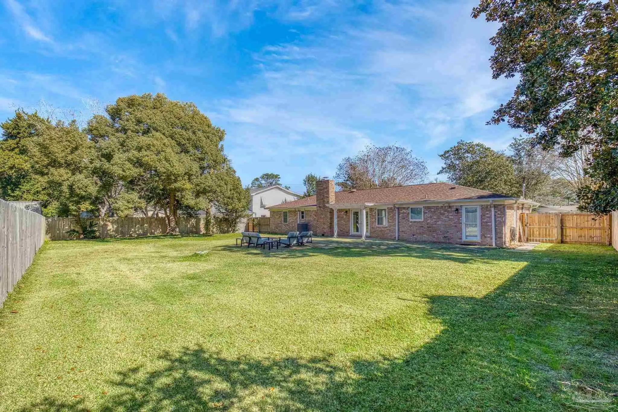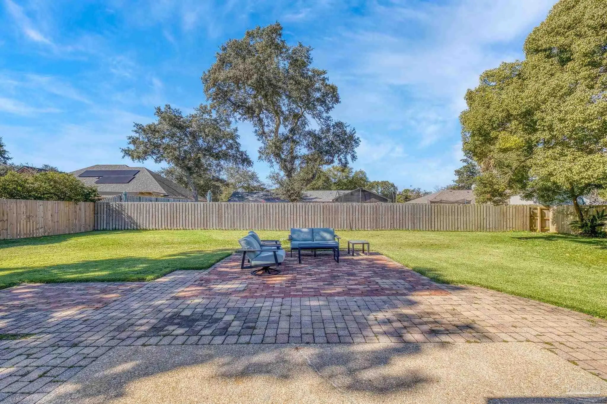 Conveniently located in Gulf Breeze Proper this home offers an immaculate, bright,and neutral interior that is truly move-in ready. Enjoy the welcoming open living and dining room with a fireplace just off the entry, perfect for both everyday living and entertaining. All bathrooms renovated, all closets have customs shelving, new driveway and walkway, new fencing, new carpet and LVP flooring throughout, new garage door, new doors and trim, new refrigerator and oven, new backsplash, counters in kitchen, recessed lighting throughout, and all NEW WINDOWS IMPACT RATED. ROOF 2021, HVAC 2021, WATER HEATER 2020.The custom kitchen features abundant solid wood cabinetry, quartz countertops, a classic tile backsplash, dimmable lighting, and stainless steel appliances, offering both functionality and timeless appeal. The primary suite, located near the front of the home, easily accommodates a king-sized bed with plenty of space to move comfortably. The en-suite bathroom includes a remodeled shower and a generous walk-in closet, creating a relaxing private retreat. Additional bedrooms and a full bathroom are situated down their own dedicated hallway, providing privacy and comfortable accommodations. All custom designed closets. The entire interior has been refreshed with a fresh coat of paint, including the front door and shutters, enhancing the home’s clean, well-maintained feel. Outdoors, the spacious backyard features an open brick patio and plenty of room for a pool, playhouse, garden, or yard building.This home is convenient to top-rated Gulf Breeze schools, Shoreline Park boat ramp and dog park, Pensacola Beach, local restaurants and shopping, and the Gulf Breeze Sports Complex and Community Center, which offers parks, playgrounds, and tennis and pickleball courts.All major systems are newer and well within insurance guidelines, providing peace of mind.This home delivers an ideal blend of location, lifestyle, and livability in one of Gulf Breeze’s most desirable areas.