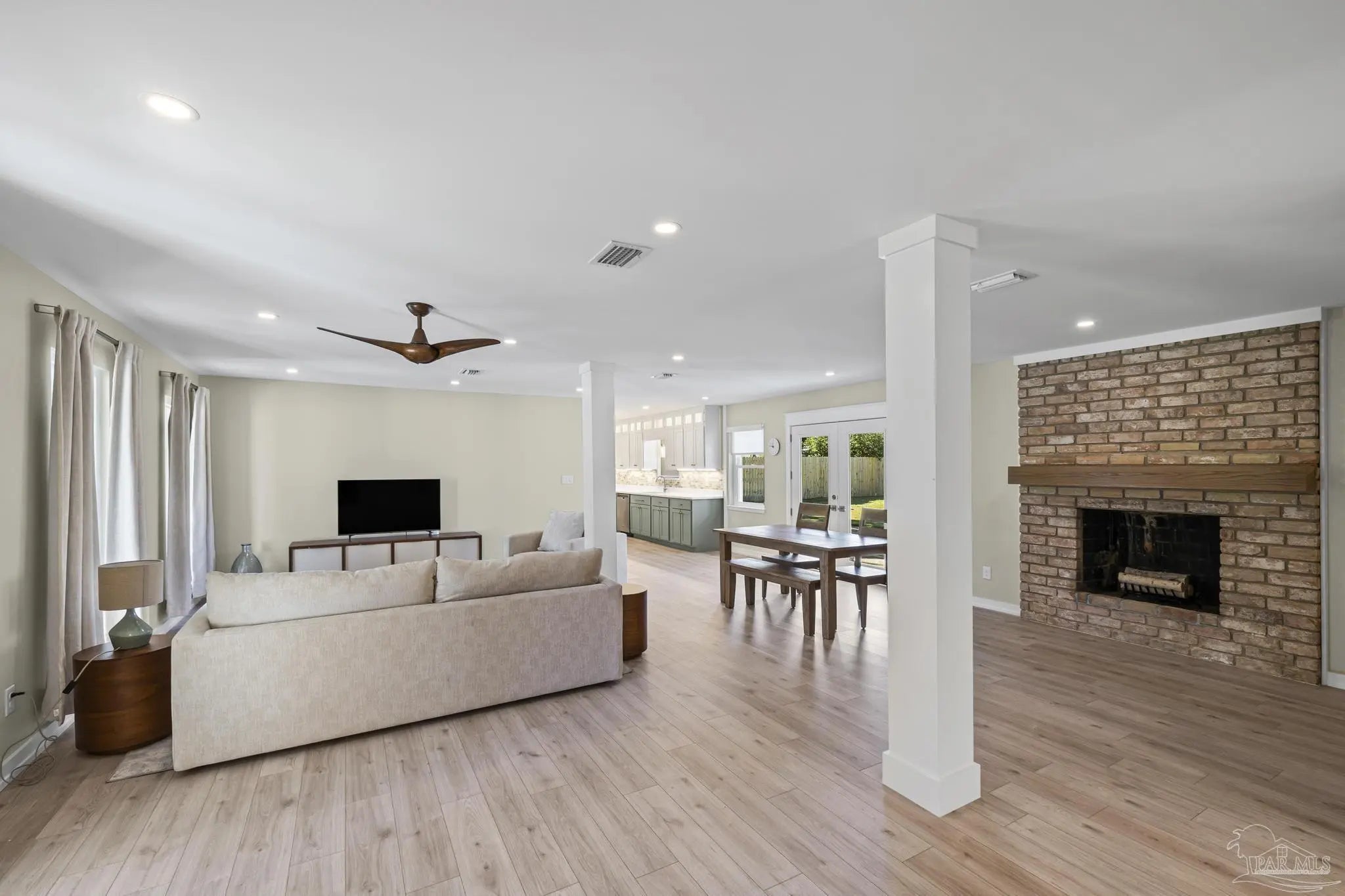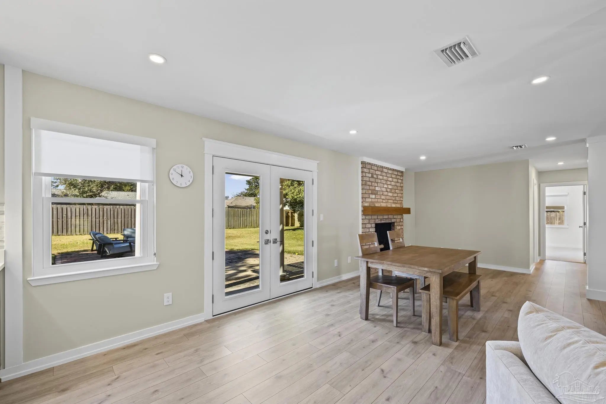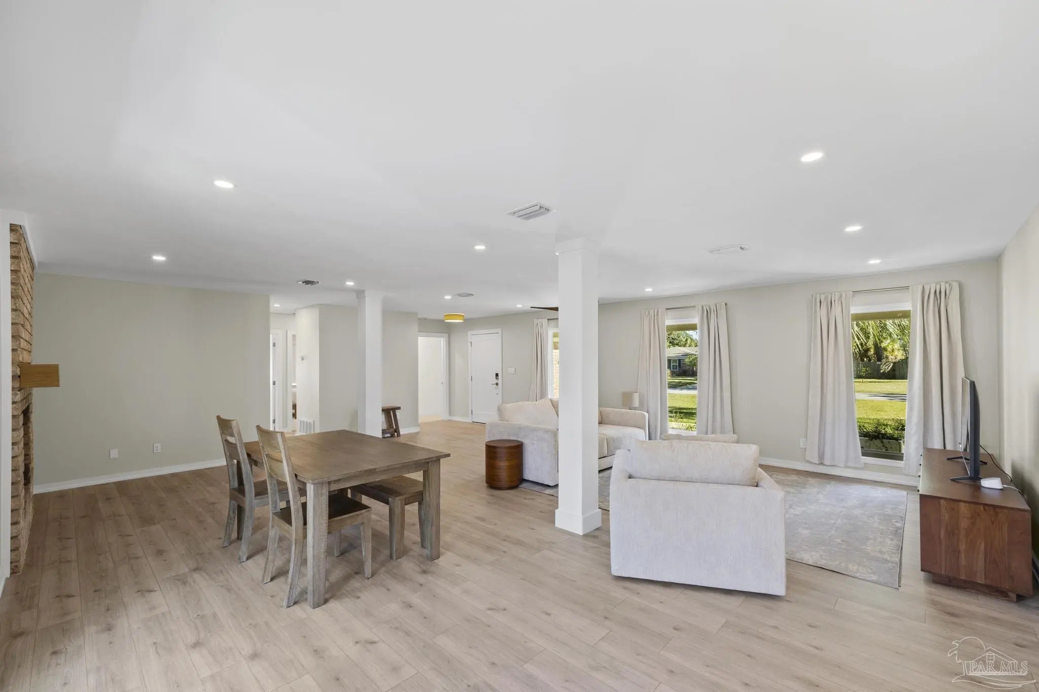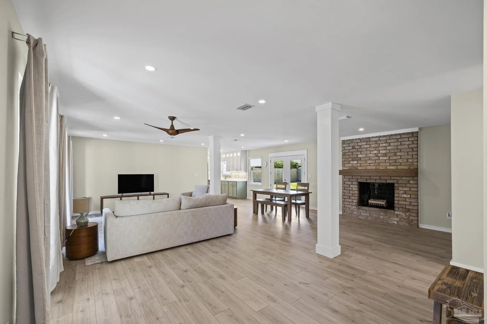 Conveniently located in Gulf Breeze Proper this home offers an immaculate, bright,and neutral interior that is truly move-in ready. Enjoy the welcoming open living and dining room with a fireplace just off the entry, perfect for both everyday living and entertaining. All bathrooms renovated, all closets have customs shelving, new driveway and walkway, new fencing, new carpet and LVP flooring throughout, new garage door, new doors and trim, new refrigerator and oven, new backsplash, counters in kitchen, recessed lighting throughout, and all NEW WINDOWS IMPACT RATED. ROOF 2021, HVAC 2021, WATER HEATER 2020.The custom kitchen features abundant solid wood cabinetry, quartz countertops, a classic tile backsplash, dimmable lighting, and stainless steel appliances, offering both functionality and timeless appeal. The primary suite, located near the front of the home, easily accommodates a king-sized bed with plenty of space to move comfortably. The en-suite bathroom includes a remodeled shower and a generous walk-in closet, creating a relaxing private retreat. Additional bedrooms and a full bathroom are situated down their own dedicated hallway, providing privacy and comfortable accommodations. All custom designed closets. The entire interior has been refreshed with a fresh coat of paint, including the front door and shutters, enhancing the home’s clean, well-maintained feel. Outdoors, the spacious backyard features an open brick patio and plenty of room for a pool, playhouse, garden, or yard building.This home is convenient to top-rated Gulf Breeze schools, Shoreline Park boat ramp and dog park, Pensacola Beach, local restaurants and shopping, and the Gulf Breeze Sports Complex and Community Center, which offers parks, playgrounds, and tennis and pickleball courts.All major systems are newer and well within insurance guidelines, providing peace of mind.This home delivers an ideal blend of location, lifestyle, and livability in one of Gulf Breeze’s most desirable areas.