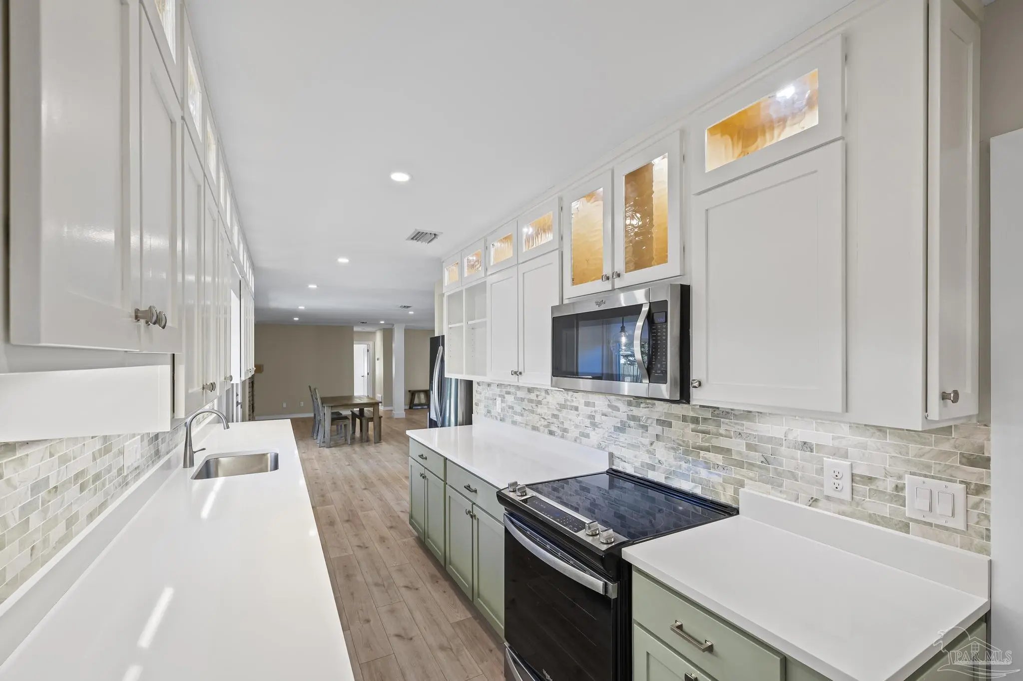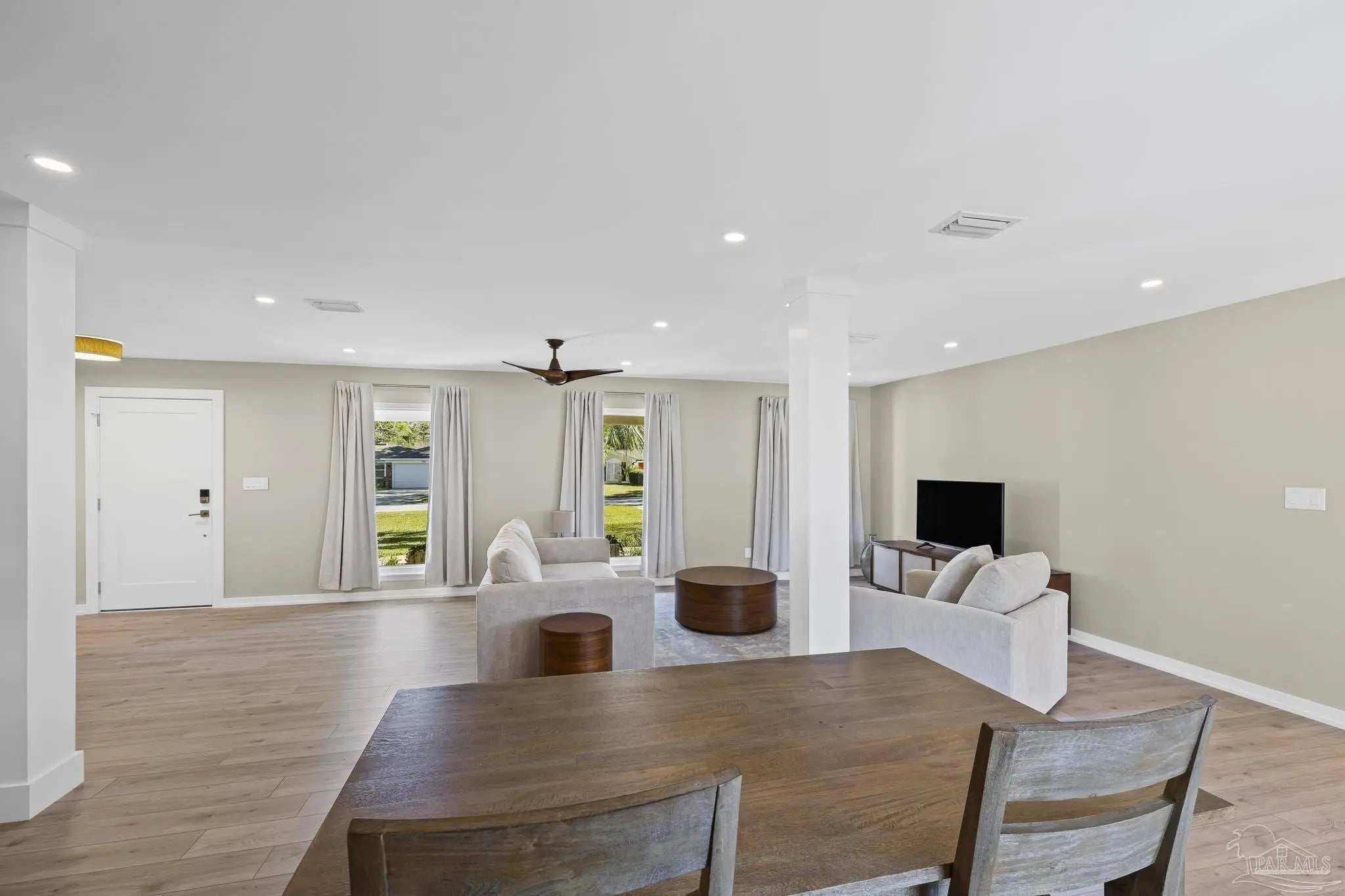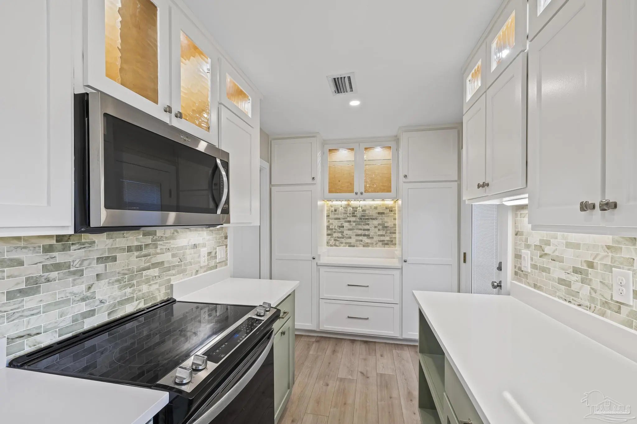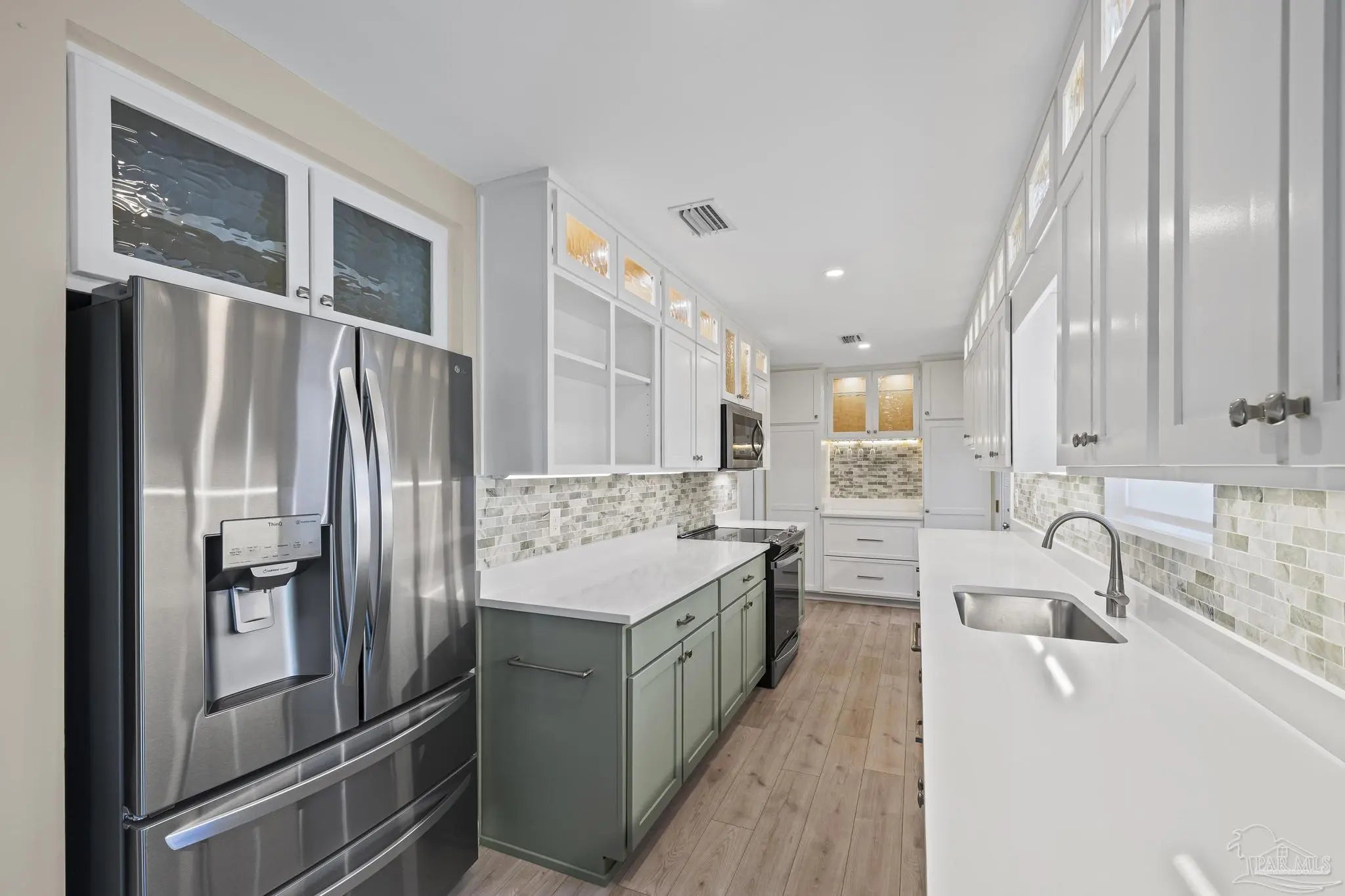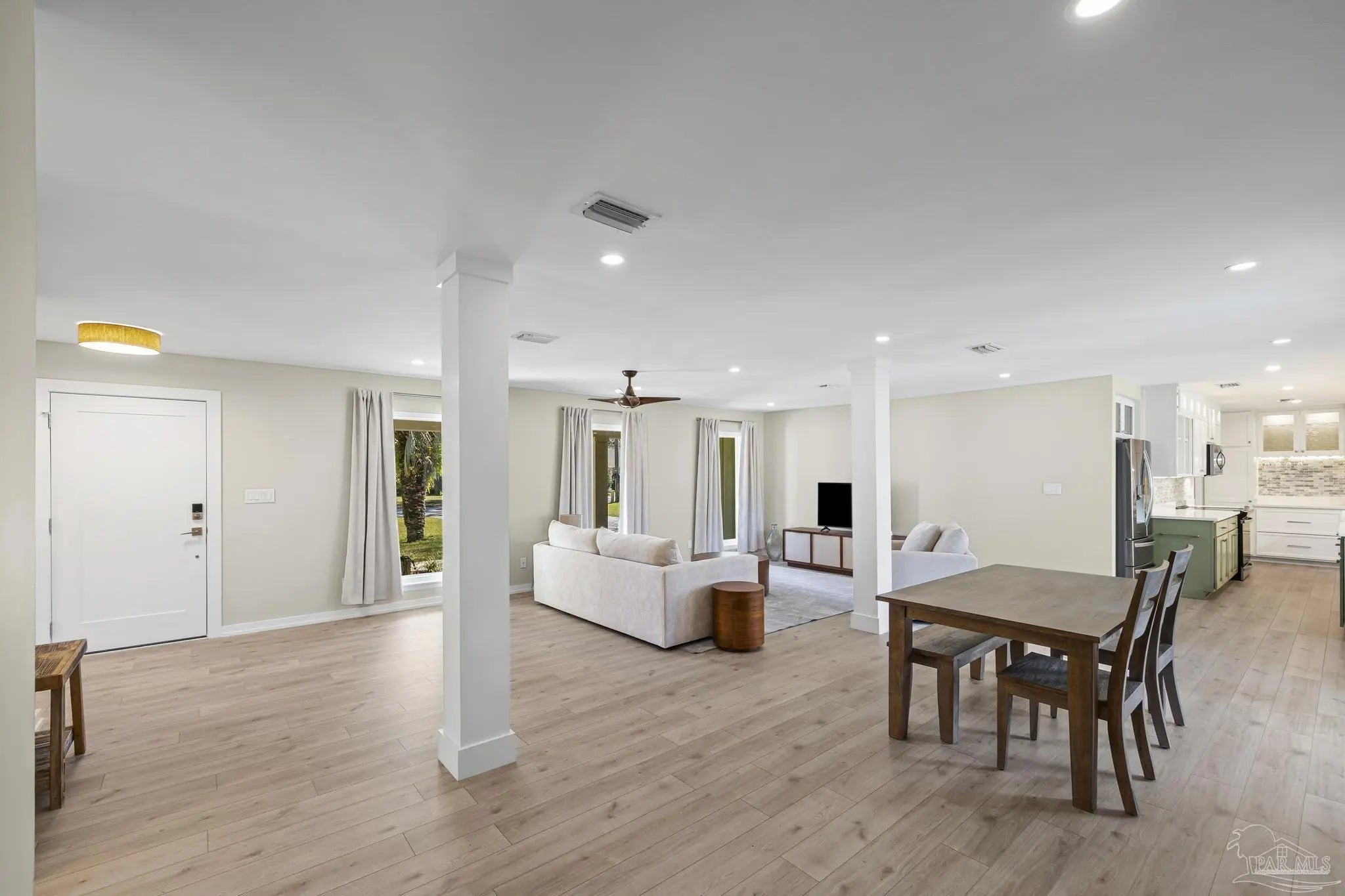 Conveniently located in Gulf Breeze Proper this home offers an immaculate, bright,and neutral interior that is truly move-in ready. Enjoy the welcoming open living and dining room with a fireplace just off the entry, perfect for both everyday living and entertaining. All bathrooms renovated, all closets have customs shelving, new driveway and walkway, new fencing, new carpet and LVP flooring throughout, new garage door, new doors and trim, new refrigerator and oven, new backsplash, counters in kitchen, recessed lighting throughout, and all NEW WINDOWS IMPACT RATED. ROOF 2021, HVAC 2021, WATER HEATER 2020.The custom kitchen features abundant solid wood cabinetry, quartz countertops, a classic tile backsplash, dimmable lighting, and stainless steel appliances, offering both functionality and timeless appeal. The primary suite, located near the front of the home, easily accommodates a king-sized bed with plenty of space to move comfortably. The en-suite bathroom includes a remodeled shower and a generous walk-in closet, creating a relaxing private retreat. Additional bedrooms and a full bathroom are situated down their own dedicated hallway, providing privacy and comfortable accommodations. All custom designed closets. The entire interior has been refreshed with a fresh coat of paint, including the front door and shutters, enhancing the home’s clean, well-maintained feel. Outdoors, the spacious backyard features an open brick patio and plenty of room for a pool, playhouse, garden, or yard building.This home is convenient to top-rated Gulf Breeze schools, Shoreline Park boat ramp and dog park, Pensacola Beach, local restaurants and shopping, and the Gulf Breeze Sports Complex and Community Center, which offers parks, playgrounds, and tennis and pickleball courts.All major systems are newer and well within insurance guidelines, providing peace of mind.This home delivers an ideal blend of location, lifestyle, and livability in one of Gulf Breeze’s most desirable areas.