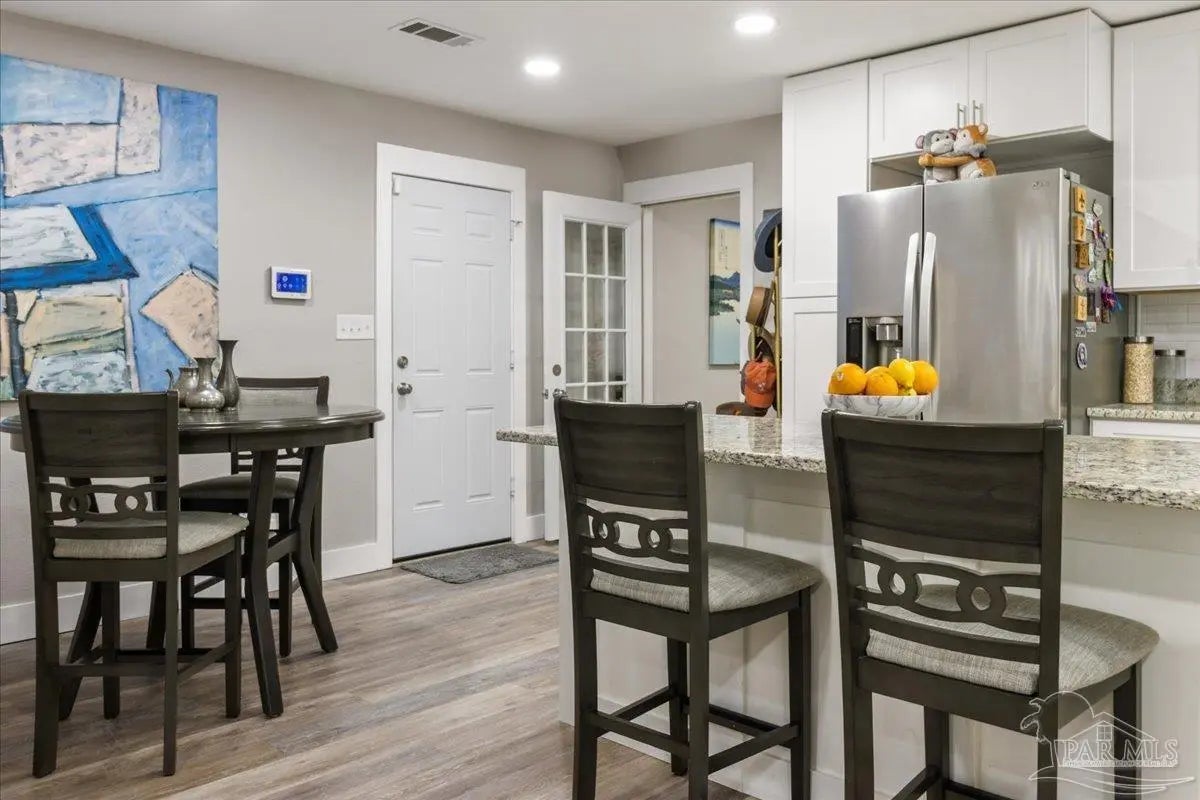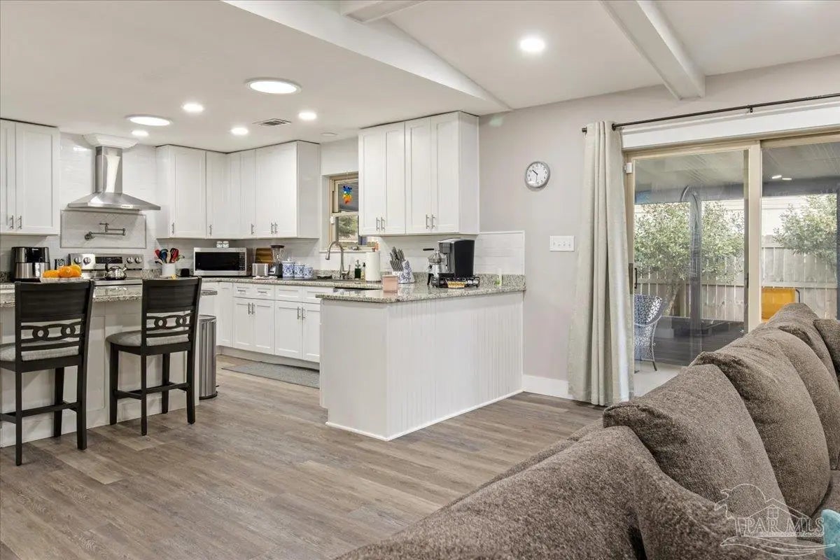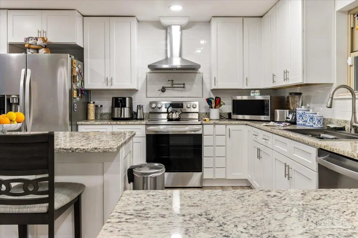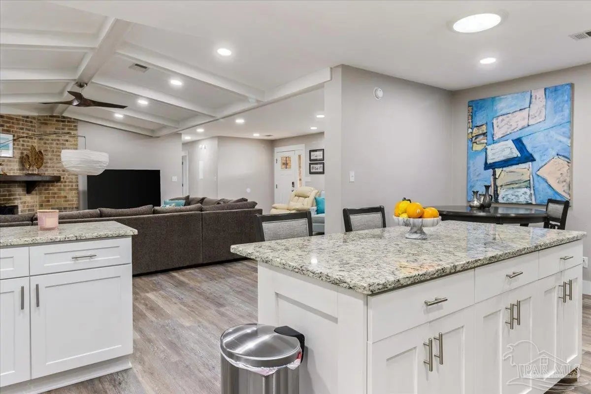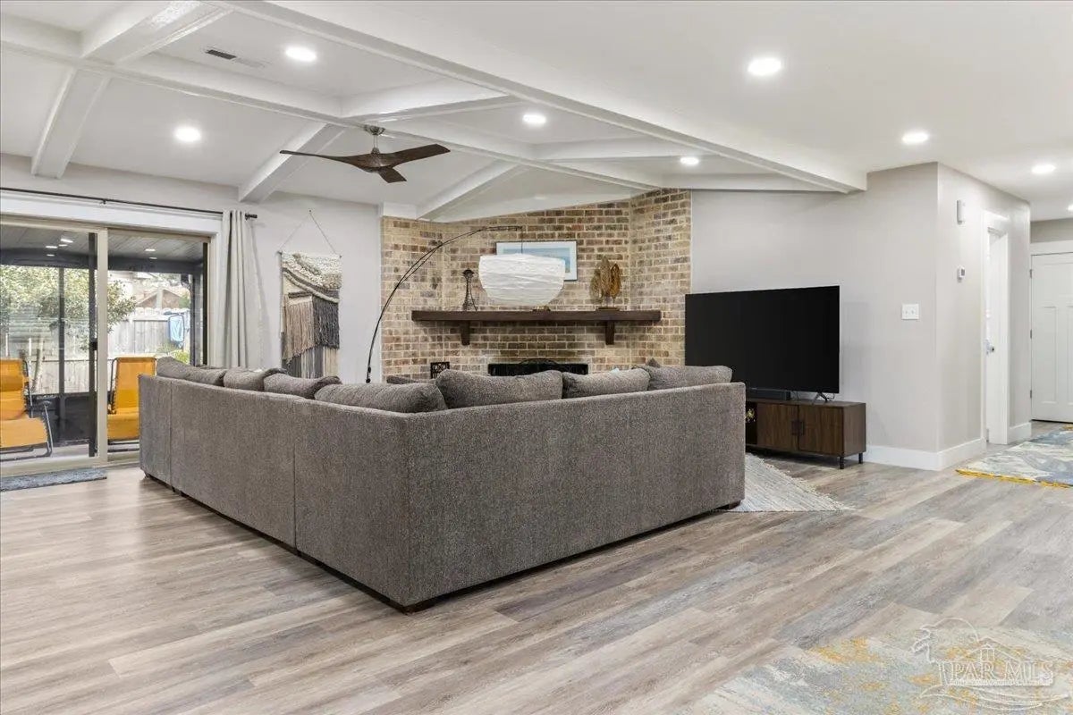 Don’t miss this stunning, beautifully maintained 4-bedroom, 2-bath corner-lot home that perfectly blends comfort, style, and functionality. A circular pebbled driveway creates an inviting entrance, while the oversized garage—complete with its own separate driveway—adds exceptional convenience. Inside, this thoughtfully decorated home features timeless neutral tones and luxury vinyl plank flooring throughout. The extra-large living room is warm and inviting, highlighted by a wood-burning fireplace, and flows seamlessly into the gourmet kitchen. Three oversized skylight tubes flood the space with natural light, complemented by abundant LED recessed lighting. The kitchen is equipped with stainless steel appliances, including a stove, French-door refrigerator, and dishwasher. Granite countertops, classic subway tile backsplash, and a sleek stainless steel range hood complete the space, while soft-close cabinetry extends through both the kitchen and bathrooms. Ceiling fans and LED recessed lighting are featured throughout the home. The spacious owner’s suite offers a walk-in closet and a spa-like bath with a large tiled shower, stone flooring, and elegant glass tile accents. The second full bath features a tiled tub/shower combination with coordinating glass tile details. All bedrooms include double-door closets, and the versatile fourth bedroom may be used as a bedroom, dining room, or bonus room. Step outside to an oversized screened porch overlooking the beautifully landscaped yard and in-ground saltwater pool, complete with a Polaris automatic cleaning system—ideal for entertaining or relaxing. The property also includes a full sprinkler system to maintain the lush landscaping with ease. Additional features include an ADT alarm system, a new roof (January 2021), HVAC system (June 2024), pool pump (Summer 2025) This exceptional home is move-in ready and offers comfort, quality upgrades, and outstanding outdoor living—an a