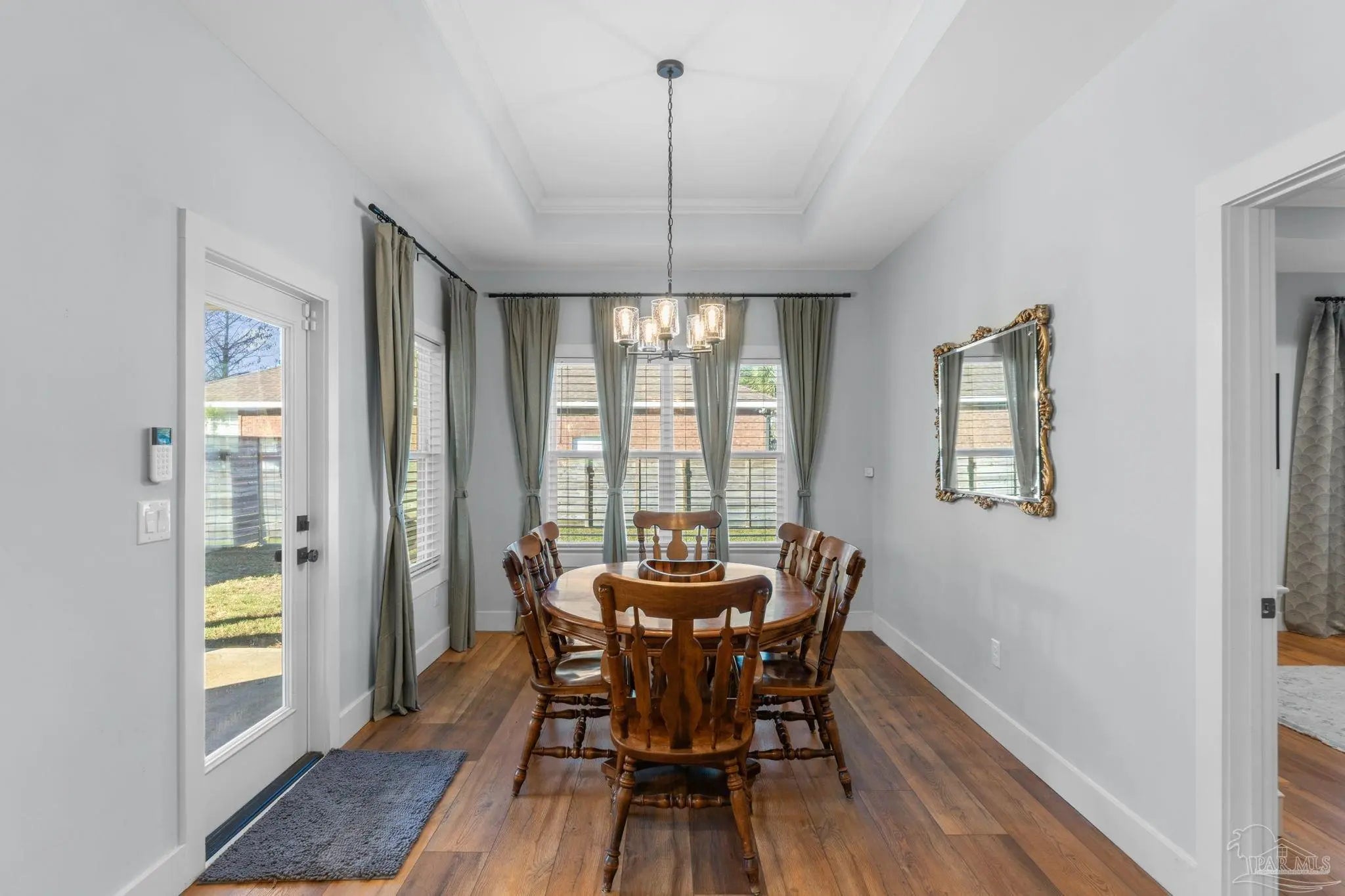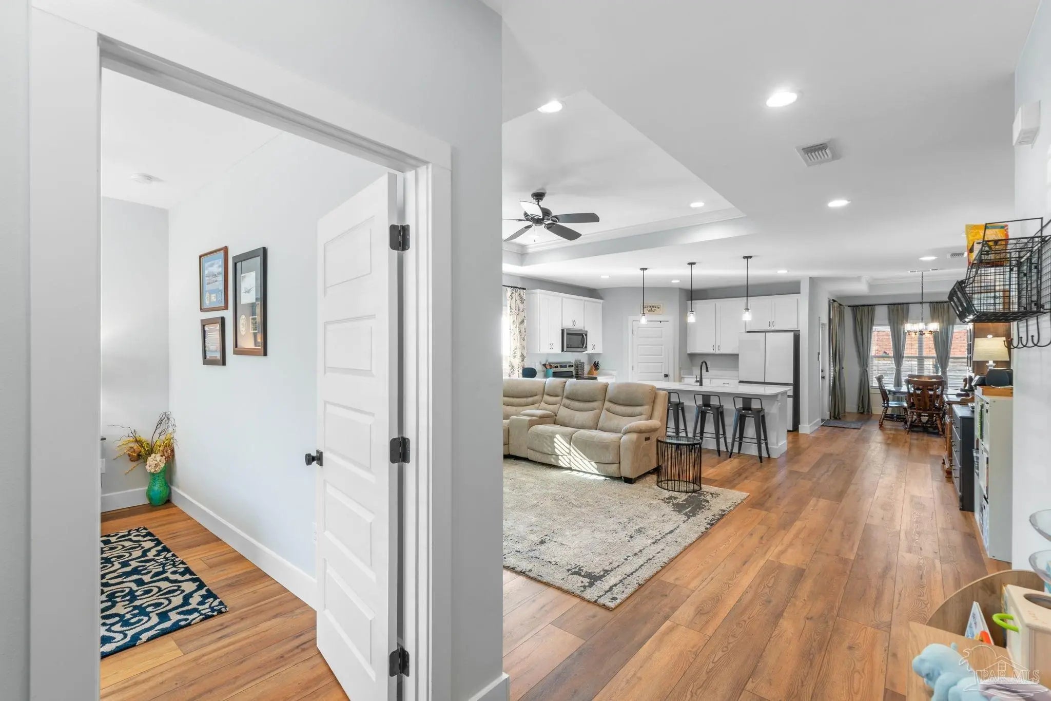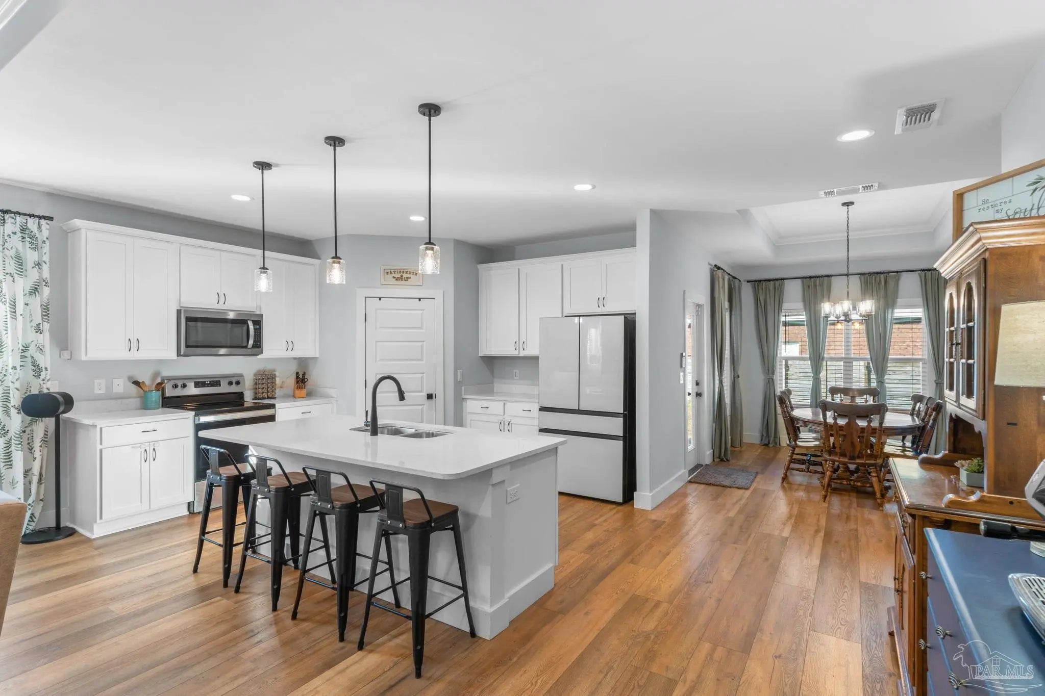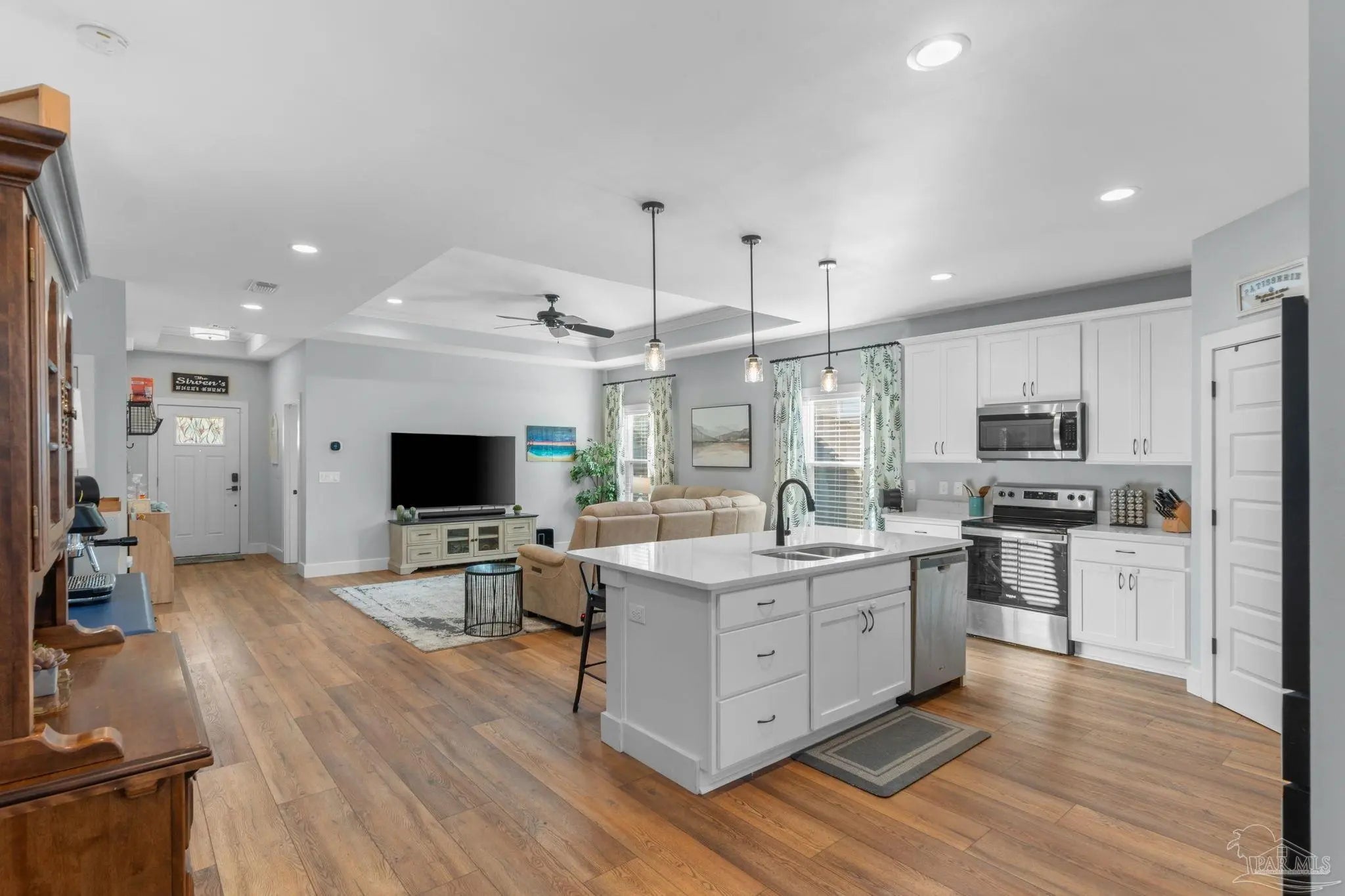 Experience modern luxury in this stunning 4-bedroom, 2-bathroom residence built in 2022, situated on a spacious corner lot in the heart of Midway/Gulf Breeze. Offering maximum flexibility with NO HOA and no rental restrictions, this home is perfect for primary residence or investment. The open-concept interior impresses with 9’ ceilings, 10’ tray accents, and durable luxury vinyl plank flooring throughout—no carpet! The chef-inspired kitchen features white shaker-style soft-close cabinetry, premium quartz countertops, a massive island with pendant lighting, and Whirlpool stainless appliance suite. Retreat to the primary suite featuring a spa-like ensuite with a large tiled shower, double quartz vanity, and a generous walk-in closet. Step outside to a covered back porch with a coffered ceiling, overlooking a fully fenced backyard equipped with a sprinkler system and private well. Notable upgrades include a finished garage with epoxy floors, Fabric Shield hurricane protection, a Sentricon termite system, and gutters around the entire home. Conveniently located near the upcoming Soundside high school and walking distance to a local county park, with easy access to both Navarre and Pensacola beaches. Schedule your private tour today!